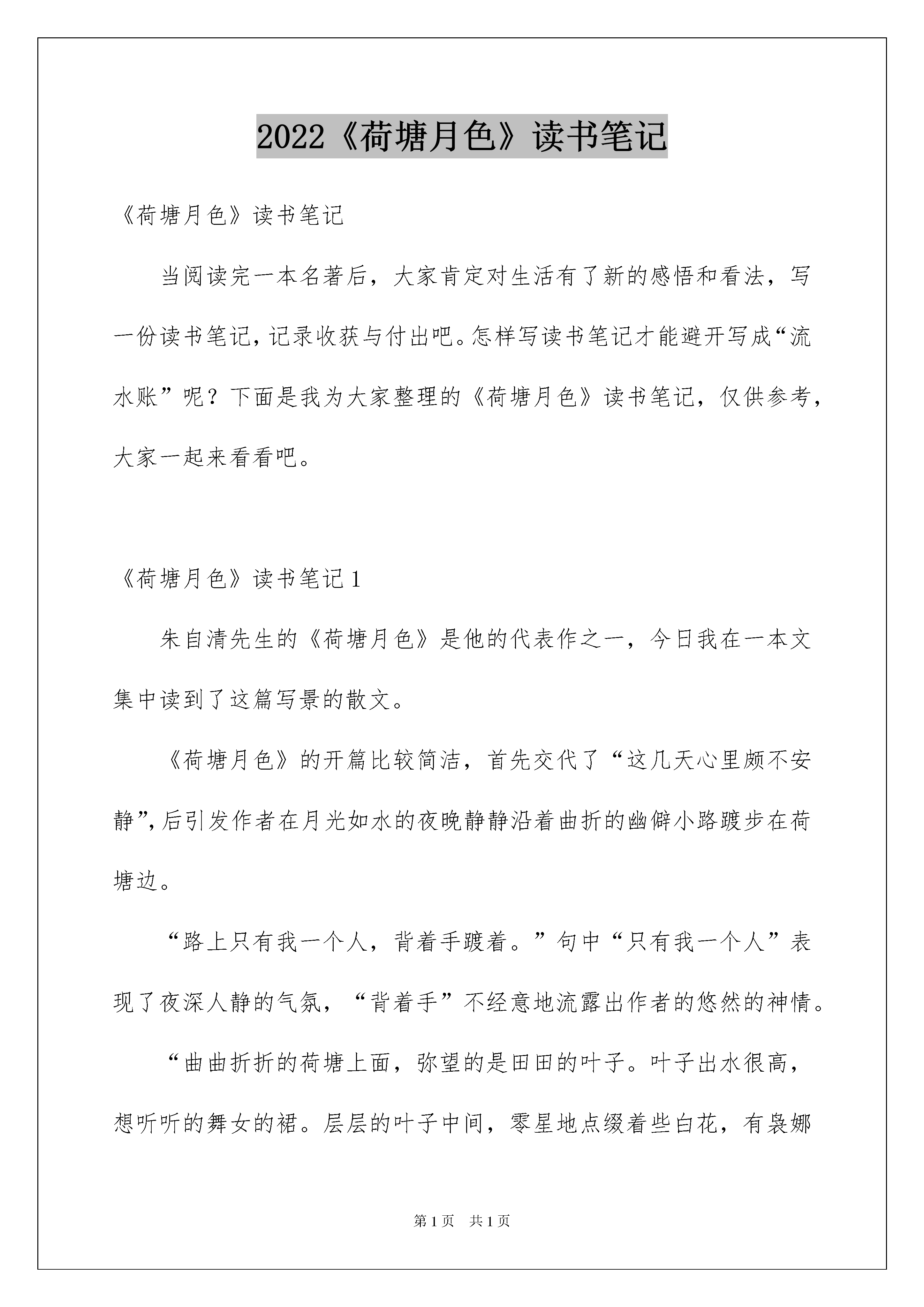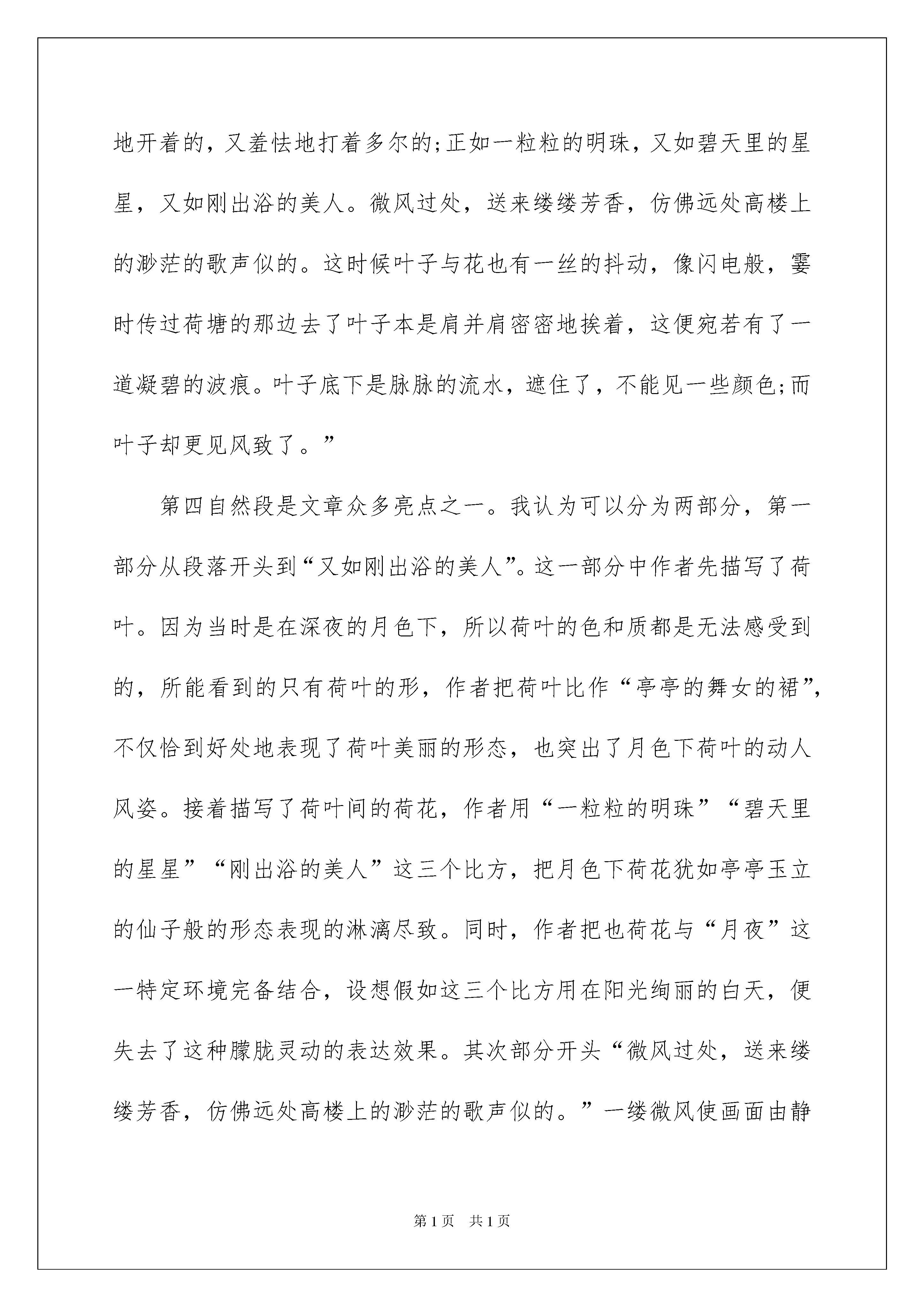 2022《荷塘月色》读书笔记《荷塘月色》读书笔记当阅读完一本名著后,大家肯定对生活有了新的感悟和看法,写一份读书笔记,记录收获与付出吧。怎样写读书笔记才能避开写成“流水账”呢?下面是我为大家整理的《荷塘月色》读书笔记,仅供参考,大家一起来看看吧。《荷塘月色》读书笔记1朱自清先生的《荷塘月色》是他的代表作之一,今日我在一本文集中读到了这篇写景的散文。《荷塘月色》的开篇比较简洁,首先交代了“这几天心里颇不安静”,后引发作者在月光如水的夜晚静静沿着曲折的幽僻小路踱步在荷塘边。“路上只有我一个人,背着手踱着。”句中“只有我一个人”表现了夜深人静的气氛,“背着手”不经意地流露出作者的悠然的神情。“曲曲折折的荷塘上面,弥望的是田田的叶子。叶子出水很高,想听听的舞女的裙。层层的叶子中间,零星地点缀着些白花,有袅娜地开着的,又羞怯地打着多尔的;正如一粒粒的明珠,又如碧天里的星星,又如刚出浴的美人。微风过处,送来缕缕芳香,仿佛远处高楼上的渺茫的歌声似的。这时候叶子与花也有一丝的抖动,像闪电般,霎时传过荷塘的那边去了叶子本是肩并肩密密地挨着,这便宛若有了一道凝碧的波痕。叶子底下是脉脉的流水,遮住了,不能见一些颜色;而叶子却更见风致了。”第四自然段是文章众多亮点之一。我认为可以分为两部分,第一部分从段落开头到“又如刚出浴的美人”。这一部分中作者先描写了荷叶。因为当时是在深夜的月色下,所以荷叶的色和质都是无法感受到的,所能看到的只有荷叶的形,作者把荷叶比作“亭亭的舞女的裙”,不仅恰到好处地表现了荷叶美丽的形态,也突出了月色下荷叶的动人风姿。接着描写了荷叶间的荷花,作者用“一粒粒的明珠”“碧天里的星星”“刚出浴的美人”这三个比方,把月色下荷花犹如亭亭玉立的仙子般的形态表现的淋漓尽致。同时,作者把也荷花与“月夜”这一特定环境完备结合,设想假如这三个比方用在阳光绚丽的白天,便失去了这种朦胧灵动的表达效果。其次部分开头“微风过处,送来缕缕芳香,仿佛远处高楼上的渺茫的歌声似的。”一缕微风使画面由静转动,忽然充溢动感,“如渺茫的歌声”奇妙地写出了荷花传来的似有若无的淡淡芳香,近一步渲染了月色下荷塘飘渺朦胧的美感。假如把第四自然段的内容概括为“月色下的荷塘”,那么第五自然段作者笔墨的着重点在于“荷塘中的月色”。“月光如流水一般,静静地泻在这一片叶子和花上。薄薄的轻雾浮起在荷塘里。叶子和花仿佛在牛乳中洗过一样;又像笼着轻纱的梦。”“静静地泻”表现出月色缓缓流淌,充满在荷叶间。“浮起在荷塘里”中“浮”字突出了雾的轻快,给人一种朦胧美。“月光是隔了树照过来的,高出丛生的灌木,落下参差的斑驳的黑影,峭楞楞如鬼一般,弯弯的杨柳的稀疏的倩影,却又像是画在荷叶上。塘中的月色并不匀称,但光与影有着和谐的旋律,如梵婀玲上奏着的名曲。”安静的月夜,作者通过写影“黑影”和“倩影”来表达自己微妙的感受,“画在荷叶上”中“画”奇妙的表达出作者犹如身在图画中的悠闲,也使读者仿佛身临其境,与作者一同享受月下夜游。通过“月色不匀称,光与影有着和谐的旋律”可见作者的视察细致入微,并且看出作者站在月色下的荷塘边已经如痴如醉。《荷塘月色》读书笔记2刚刚走过朱自清的《春》,迎面我又迈进了他的《荷塘月色》。在朱自清的笔下,一切都变得那么美,美得让人屏住呼吸,美得让人沉醉不已。朱自清笔下的荷塘是属于他自我的!想象着,这一片天地属于他自我,那是多么的自由!是的,一个人在苍茫的月下,什么都能够想,什么都能够不想,完完全全是一个自由的人!这就是作者心底的呼声——抛开对现实的不满和无奈,抛开一切苦恼,尽情享受“这无边的荷香月色”!假如我有一方这样的风景,属于我自我,我想象不出自我会是多么的雀跃,多么的富有!朱自清把月光下的荷塘描述地淋漓尽致,活灵活现。我在他的笔下尽情地赏花观月,痴迷着,沉醉着……看着看着,突然优美的月光消逝了,四周都是树,树间透着光,可是光是那样的无精打采,这时的主角变成了喧闹的蝉和蛙,可是他却什么也没有,什么也没有。这时的他是多么的无奈和彷徨,我的心从刚刚的满意中不知不觉随着他回到了最初的不安静,好像心底深处被轻轻拨动了一下,空了。朱自清的景色中渗透着心境,他从去荷塘的途中,走过曲径、树木,看到淡淡的月光,产生了淡淡的哀愁;在注视荷叶、荷花,闻着缕缕荷香,看着如流水一般的月光时,产生了淡淡的喜悦。这种心境,伴随着我渐渐品读,渐渐体会。那“出淤泥而不染”的荷花,不正是象征着他的明哲保身吗?那高寒孤洁的明月,不正是他憧憬完备新生活的心境的写照吗?朱自清在文章的末尾写到了采莲,这时的他起先惦记自我的江南家乡了。《采莲赋》、《西洲曲》在他的口中吟诵