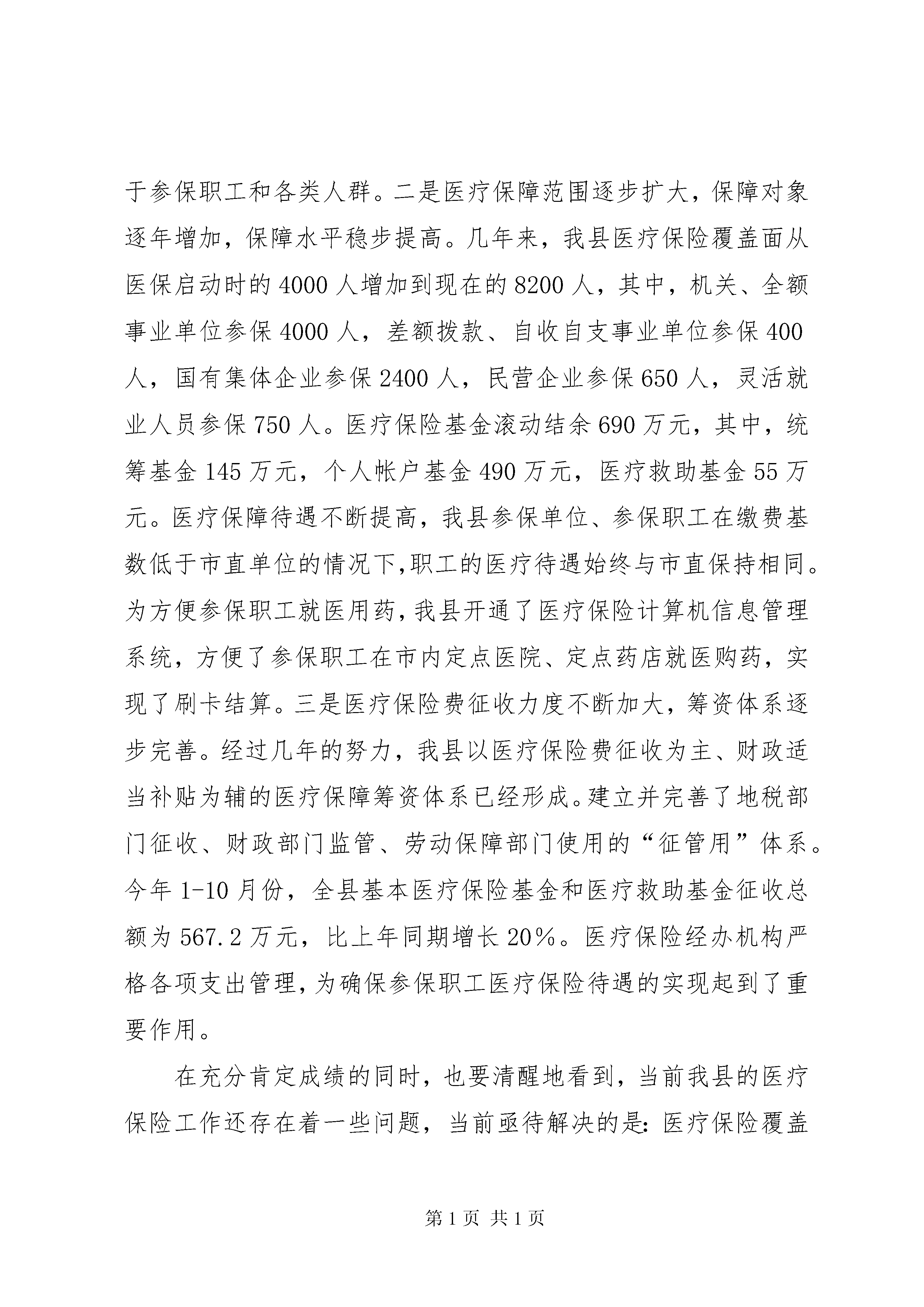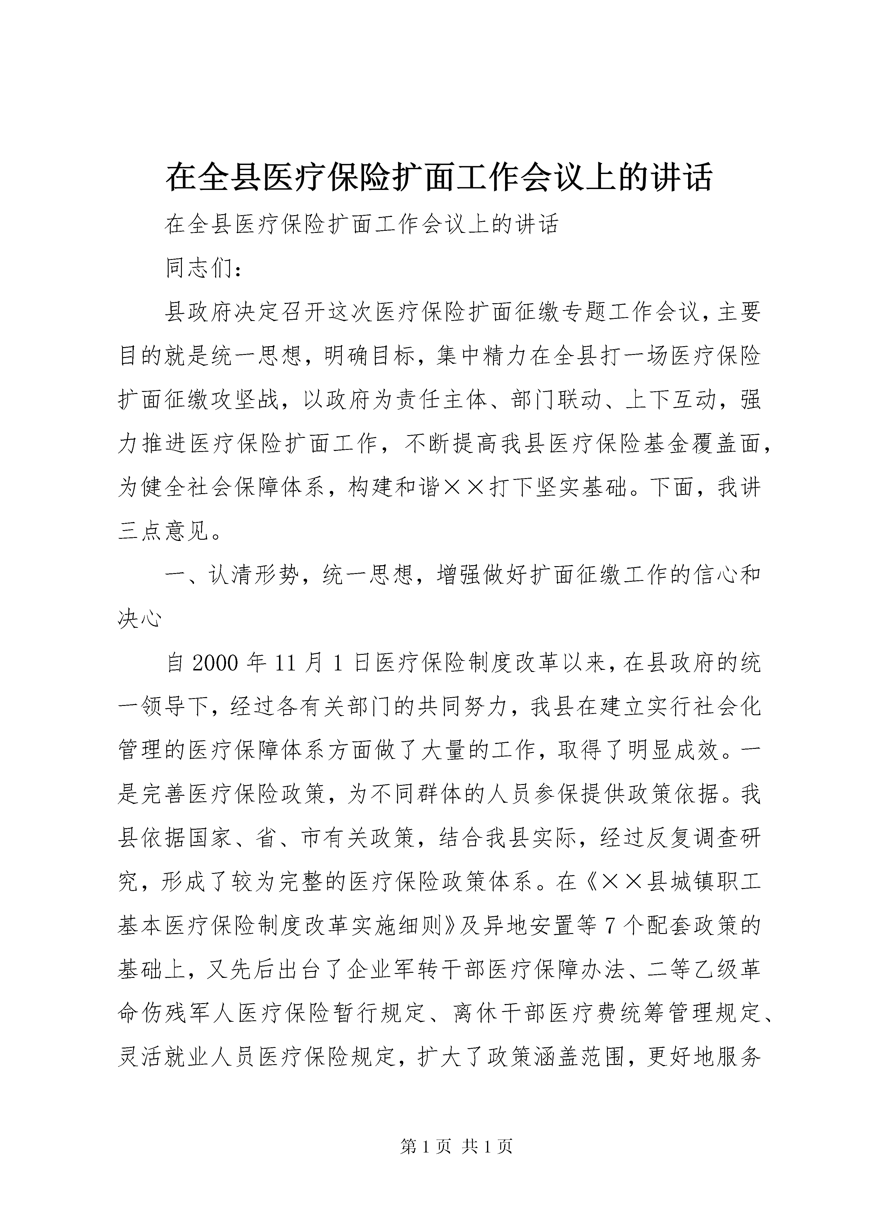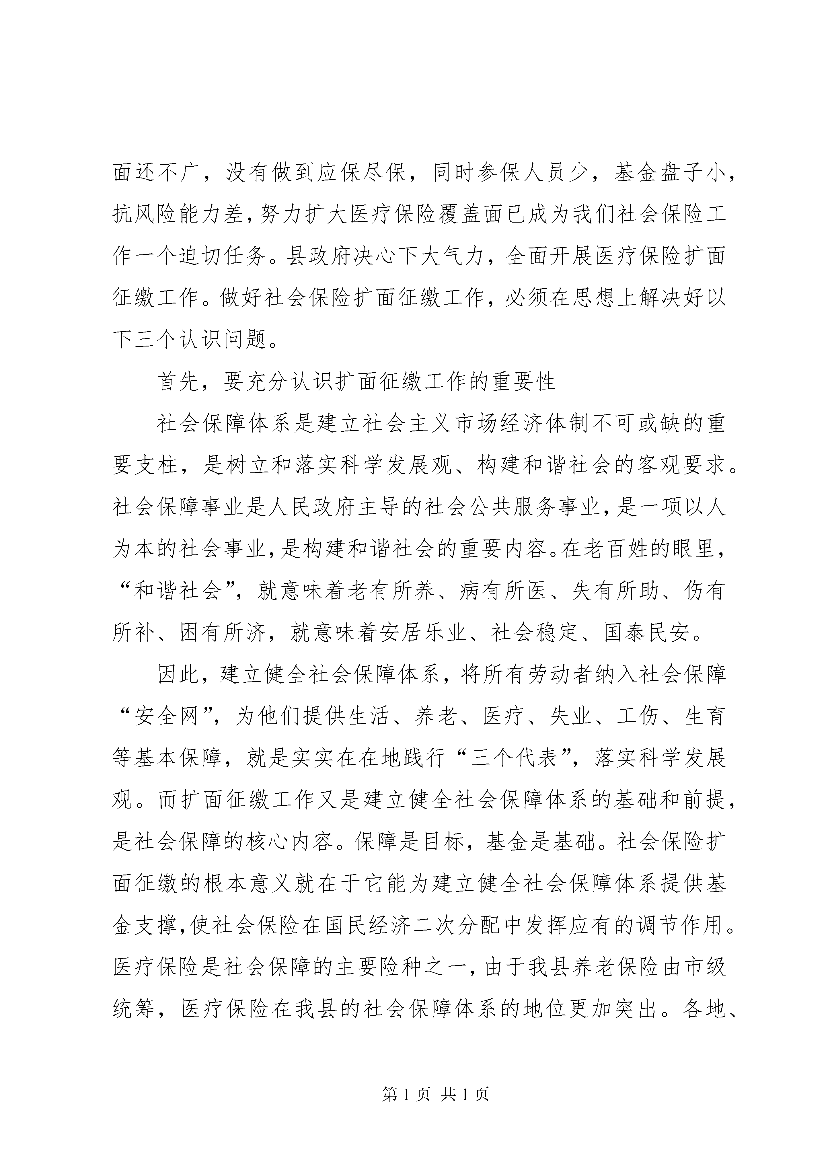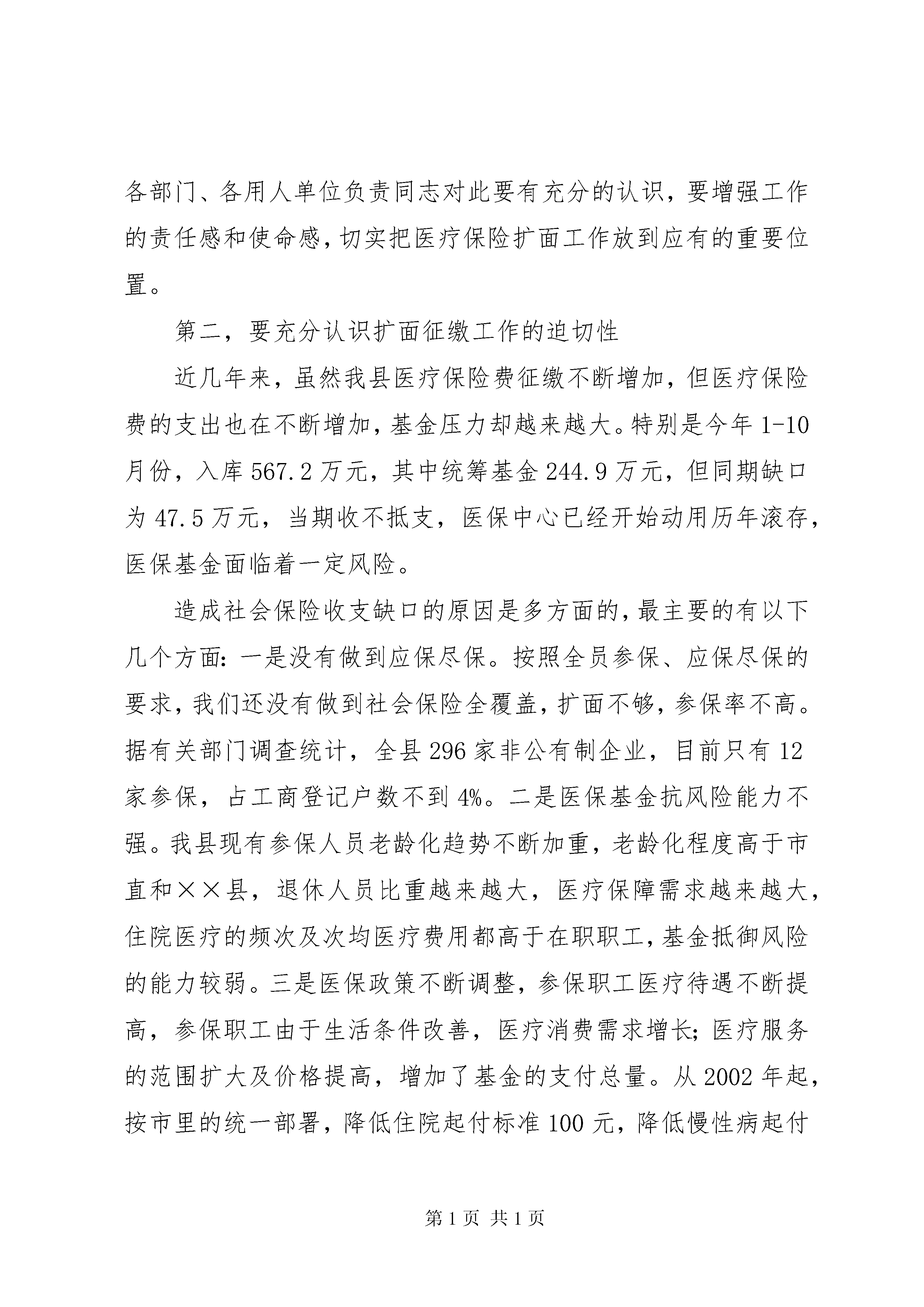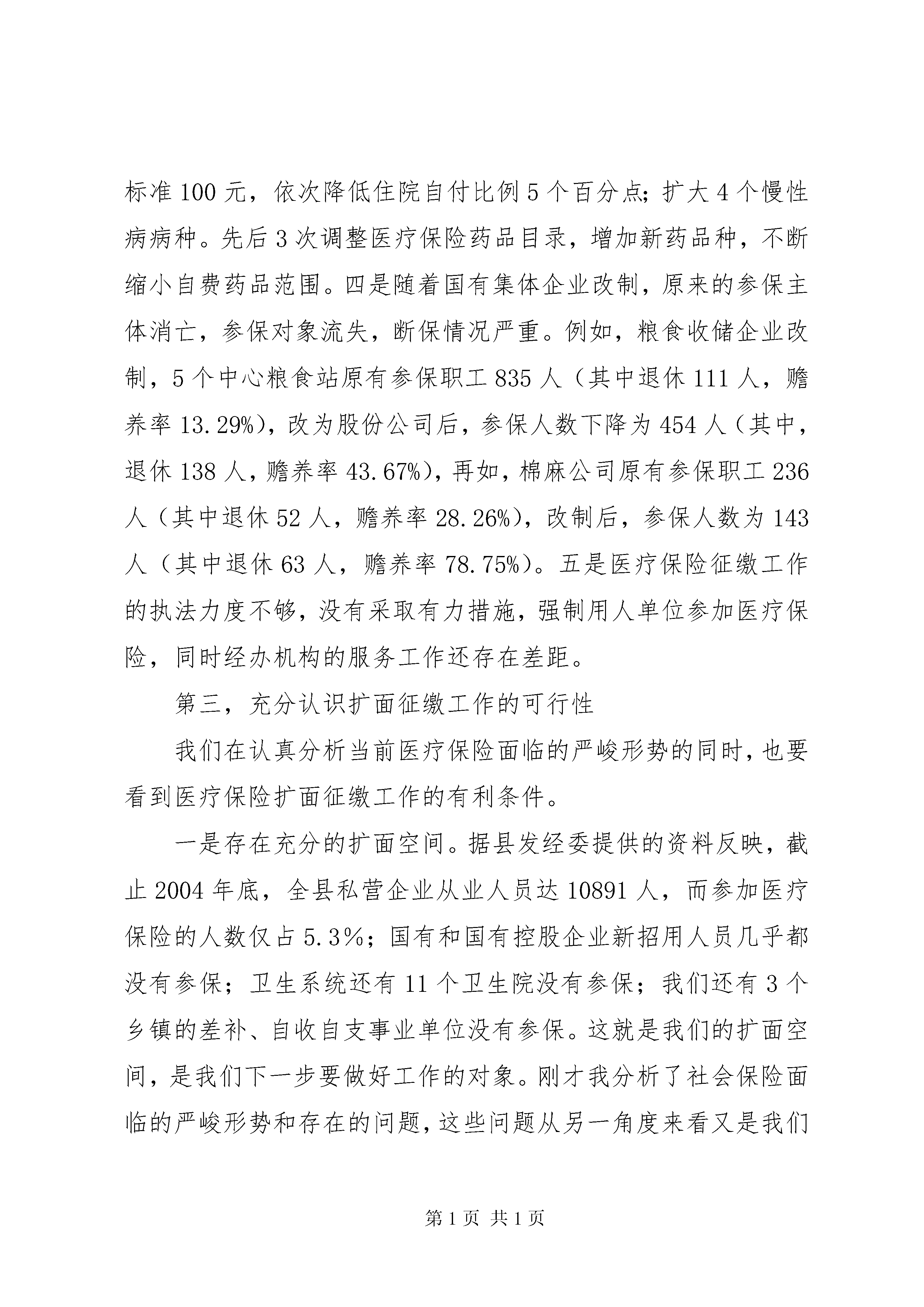 在全县医疗保险扩面工作会议上的讲话在全县医疗保险扩面工作会议上的讲话同志们:县政府决定召开这次医疗保险扩面征缴专题工作会议,主要目的就是统一思想,明确目标,集中精力在全县打一场医疗保险扩面征缴攻坚战,以政府为责任主体、部门联动、上下互动,强力推进医疗保险扩面工作,不断提高我县医疗保险基金覆盖面,为健全社会保障体系,构建和谐××打下坚实基础。下面,我讲三点意见。一、认清形势,统一思想,增强做好扩面征缴工作的信心和决心自2000年11月1日医疗保险制度改革以来,在县政府的统一领导下,经过各有关部门的共同努力,我县在建立实行社会化管理的医疗保障体系方面做了大量的工作,取得了明显成效。一是完善医疗保险政策,为不同群体的人员参保提供政策依据。我县依据国家、省、市有关政策,结合我县实际,经过反复调查研究,形成了较为完整的医疗保险政策体系。在《××县城镇职工基本医疗保险制度改革实施细则》及异地安置等7个配套政策的基础上,又先后出台了企业军转干部医疗保障办法、二等乙级革命伤残军人医疗保险暂行规定、离休干部医疗费统筹管理规定、灵活就业人员医疗保险规定,扩大了政策涵盖范围,更好地服务于参保职工和各类人群。二是医疗保障范围逐步扩大,保障对象逐年增加,保障水平稳步提高。几年来,我县医疗保险覆盖面从医保启动时的4000人增加到现在的8200人,其中,机关、全额事业单位参保4000人,差额拨款、自收自支事业单位参保400人,国有集体企业参保2400人,民营企业参保650人,灵活就业人员参保750人。医疗保险基金滚动结余690万元,其中,统筹基金145万元,个人帐户基金490万元,医疗救助基金55万元。医疗保障待遇不断提高,我县参保单位、参保职工在缴费基数低于市直单位的情况下,职工的医疗待遇始终与市直保持相同。为方便参保职工就医用药,我县开通了医疗保险计算机信息管理系统,方便了参保职工在市内定点医院、定点药店就医购药,实现了刷卡结算。三是医疗保险费征收力度不断加大,筹资体系逐步完善。经过几年的努力,我县以医疗保险费征收为主、财政适当补贴为辅的医疗保障筹资体系已经形成。建立并完善了地税部门征收、财政部门监管、劳动保障部门使用的“征管用”体系。今年1-10月份,全县基本医疗保险基金和医疗救助基金征收总额为567.2万元,比上年同期增长20%。医疗保险经办机构严格各项支出管理,为确保参保职工医疗保险待遇的实现起到了重要作用。在充分肯定成绩的同时,也要清醒地看到,当前我县的医疗保险工作还存在着一些问题,当前亟待解决的是:医疗保险覆盖面还不广,没有做到应保尽保,同时参保人员少,基金盘子小,抗风险能力差,努力扩大医疗保险覆盖面已成为我们社会保险工作一个迫切任务。县政府决心下大气力,全面开展医疗保险扩面征缴工作。做好社会保险扩面征缴工作,必须在思想上解决好以下三个认识问题。首先,要充分认识扩面征缴工作的重要性社会保障体系是建立社会主义市场经济体制不可或缺的重要支柱,是树立和落实科学发展观、构建和谐社会的客观要求。社会保障事业是人民政府主导的社会公共服务事业,是一项以人为本的社会事业,是构建和谐社会的重要内容。在老百姓的眼里,“和谐社会”,就意味着老有所养、病有所医、失有所助、伤有所补、困有所济,就意味着安居乐业、社会稳定、国泰民安。因此,建立健全社会保障体系,将所有劳动者纳入社会保障“安全网”,为他们提供生活、养老、医疗、失业、工伤、生育等基本保障,就是实实在在地践行“三个代表”,落实科学发展观。而扩面征缴工作又是建立健全社会保障体系的基础和前提,是社会保障的核心内容。保障是目标,基金是基础。社会保险扩面征缴的根本意义就在于它能为建立健全社会保障体系提供基金支撑,使社会保险在国民经济二次分配中发挥应有的调节作用。医疗保险是社会保障的主要险种之一,由于我县养老保险由市级统筹,医疗保险在我县的社会保障体系的地位更加突出。各地、各部门、各用人单位负责同志对此要有充分的认识,要增强工作的责任感和使命感,切实把医疗保险扩面工作放到应有的重要位置。第二,要充分认识扩面征缴工作的迫切性近几年来,虽然我县医疗保险费征缴不断增加,但医疗保险费的支出也在不断增加,基金压力却越来越大。特别是今年1-10月份,入库567.2万元,其中统筹基金244.9万元,但同期缺口为47.5万元,当期收不抵支,医保中心已经开始动用历年滚存,医保基金面临着一定风险。造成社会保险收支缺口的原因是多方面的,最主要的有以下几个方面:一是没有做到应保尽保。按照全员参保、应保尽保的要求,我们还没有做到社会保险全覆盖,扩面不够,参保率不高。据有关部门调查统计,全县296家非公有制企业,目前只有12家参保,占工商登记户数不到4%。二是医保基金抗风险能力不强。我县现有参保人员老龄化趋势不断加重,老龄