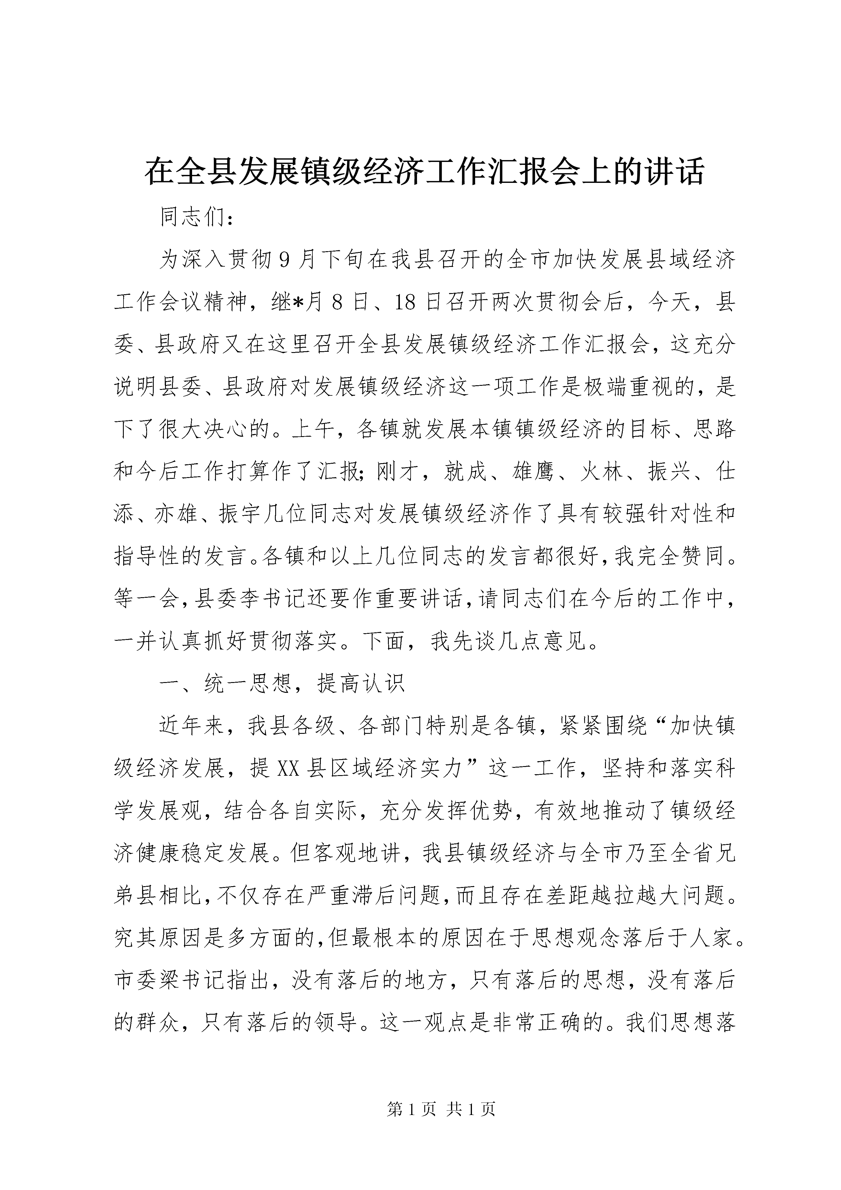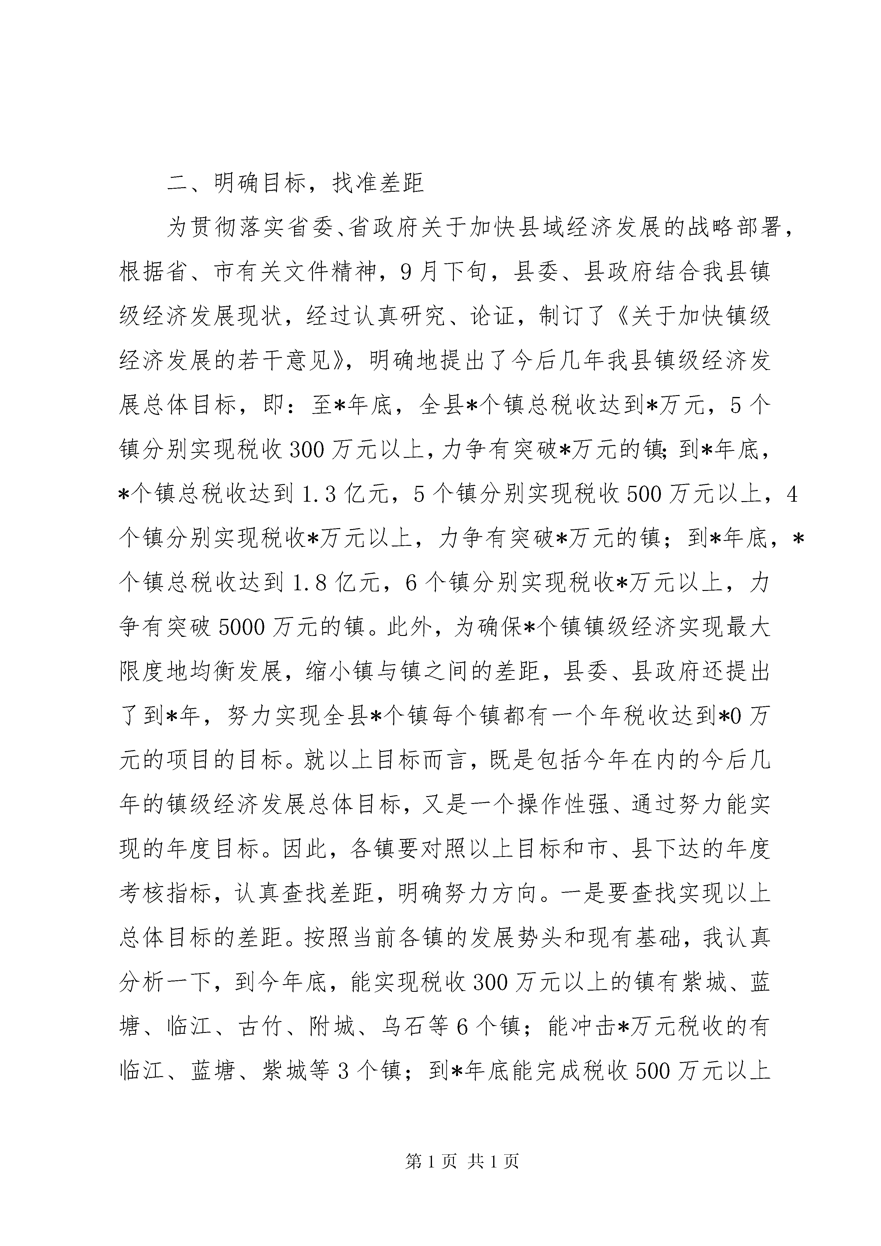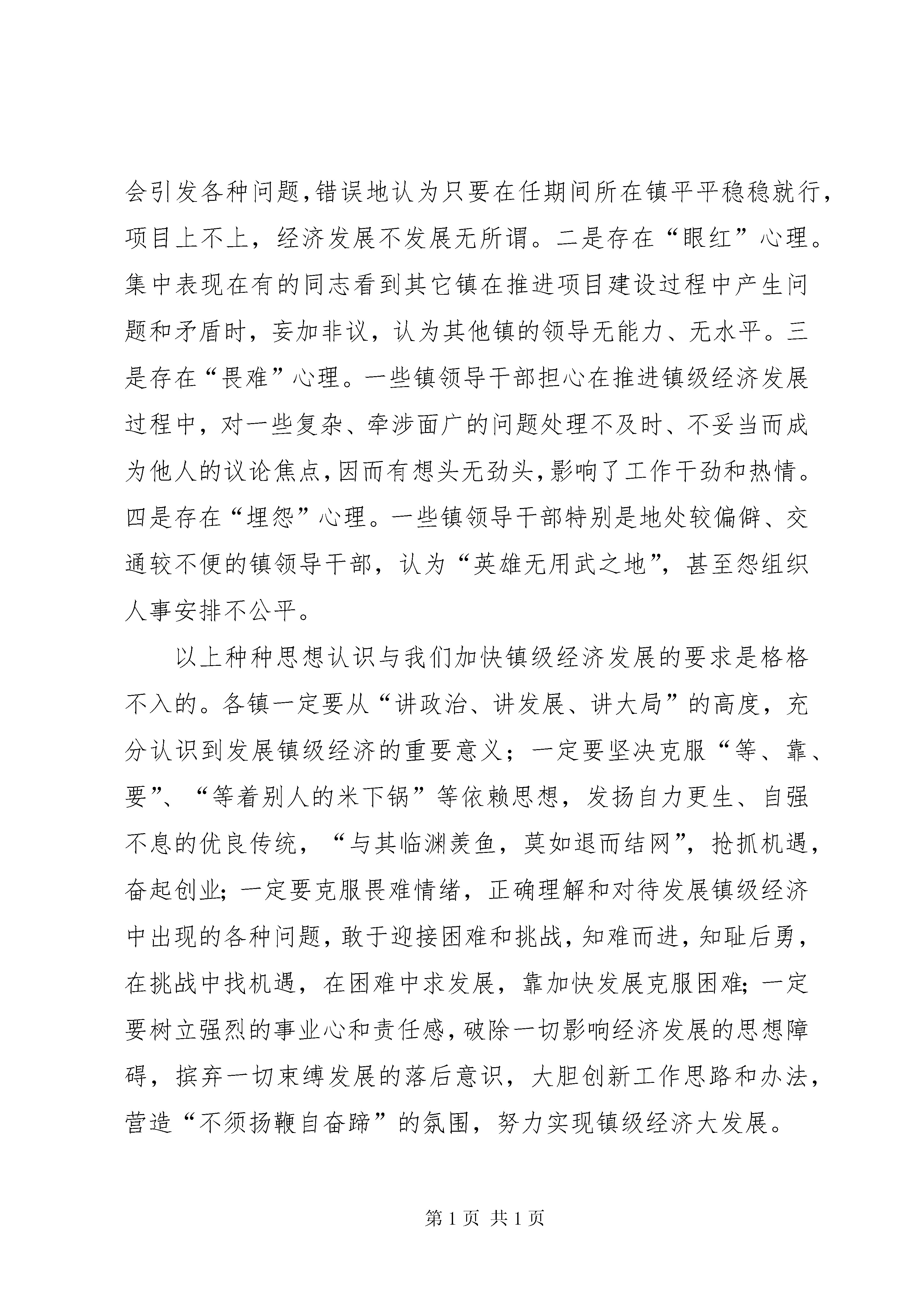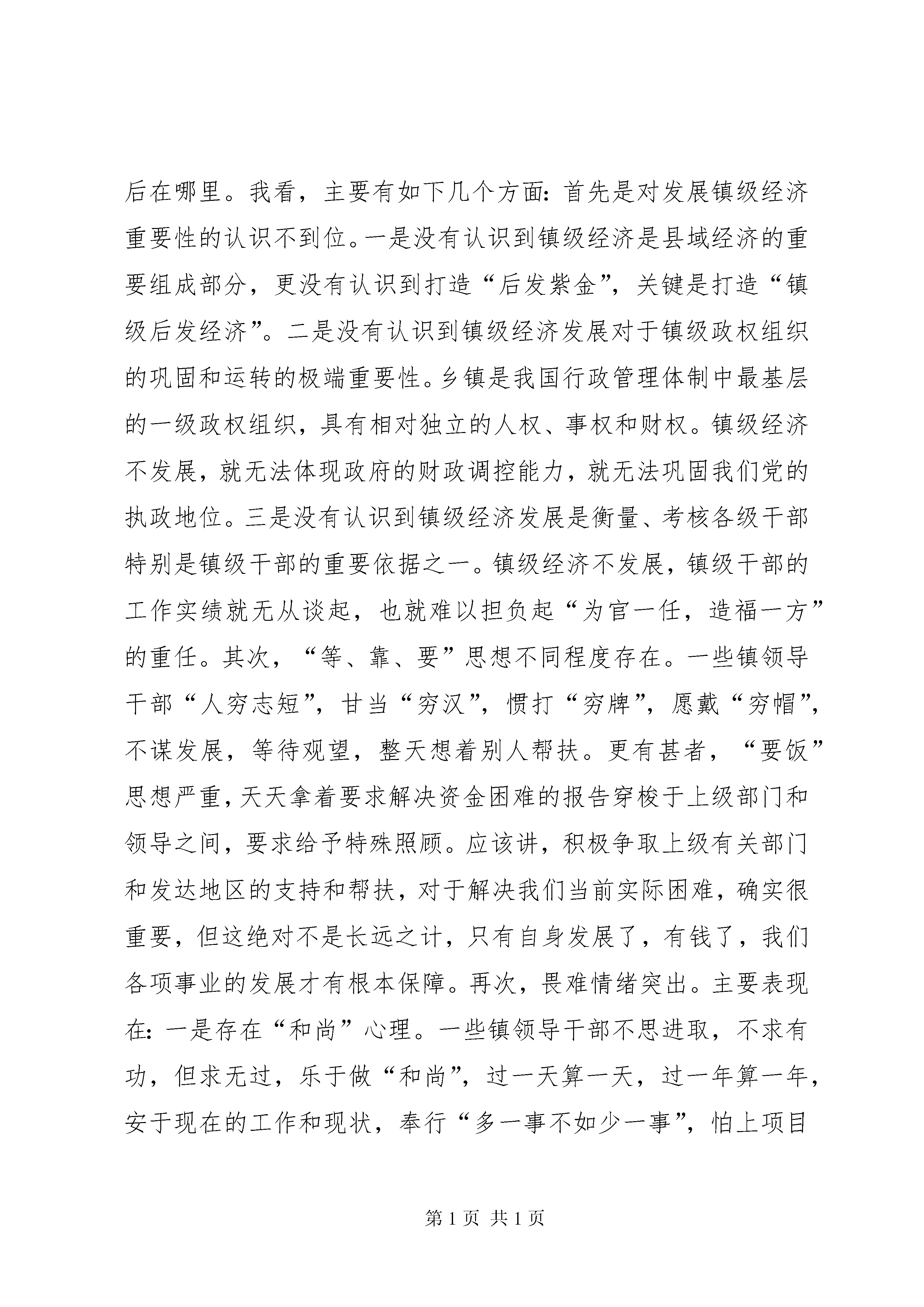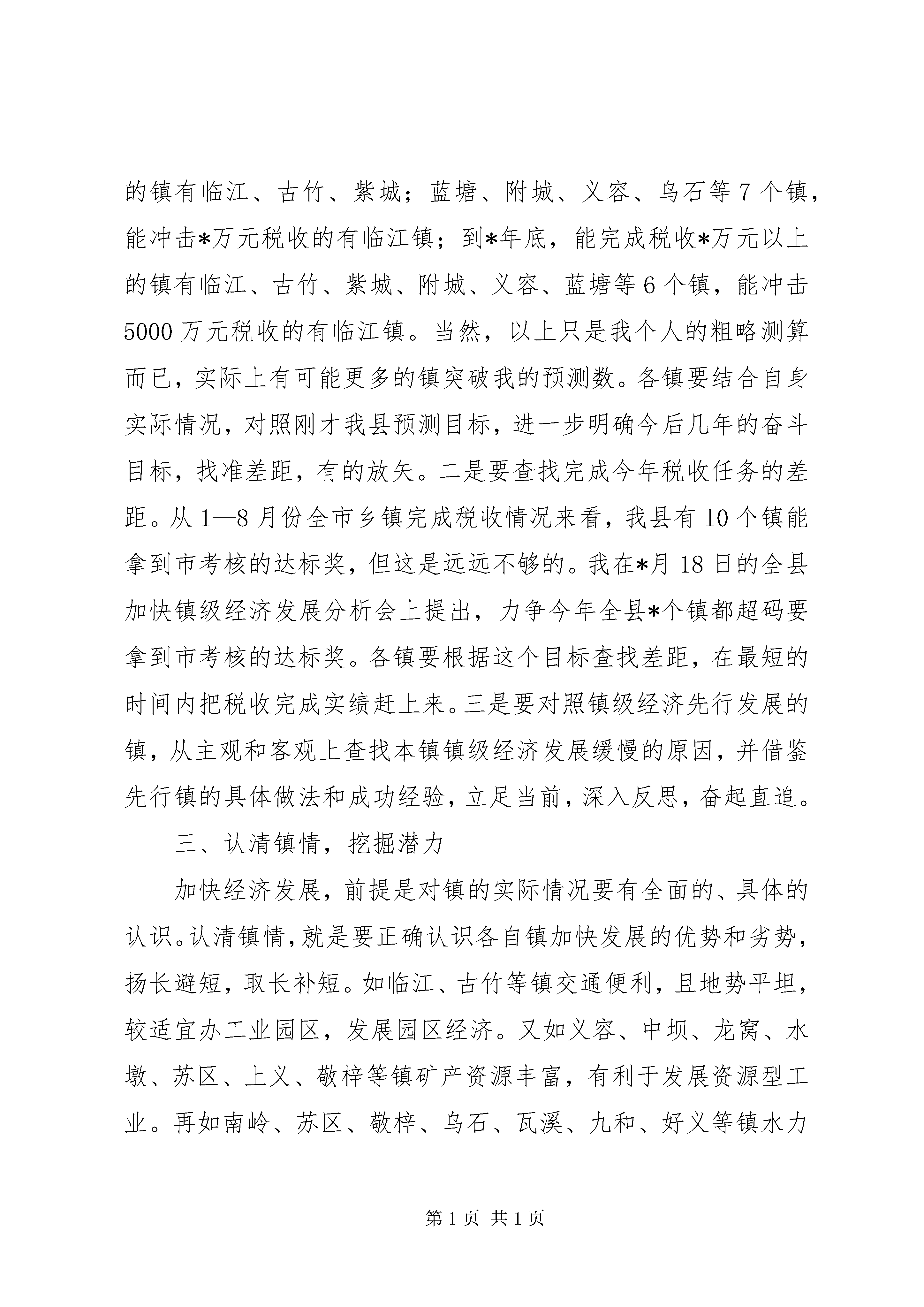 在全县发展镇级经济工作汇报会上的讲话同志们:为深入贯彻9月下旬在我县召开的全市加快发展县域经济工作会议精神,继*月8日、18日召开两次贯彻会后,今天,县委、县政府又在这里召开全县发展镇级经济工作汇报会,这充分说明县委、县政府对发展镇级经济这一项工作是极端重视的,是下了很大决心的。上午,各镇就发展本镇镇级经济的目标、思路和今后工作打算作了汇报;刚才,就成、雄鹰、火林、振兴、仕添、亦雄、振宇几位同志对发展镇级经济作了具有较强针对性和指导性的发言。各镇和以上几位同志的发言都很好,我完全赞同。等一会,县委李书记还要作重要讲话,请同志们在今后的工作中,一并认真抓好贯彻落实。下面,我先谈几点意见。一、统一思想,提高认识近年来,我县各级、各部门特别是各镇,紧紧围绕“加快镇级经济发展,提XX县区域经济实力”这一工作,坚持和落实科学发展观,结合各自实际,充分发挥优势,有效地推动了镇级经济健康稳定发展。但客观地讲,我县镇级经济与全市乃至全省兄弟县相比,不仅存在严重滞后问题,而且存在差距越拉越大问题。究其原因是多方面的,但最根本的原因在于思想观念落后于人家。市委梁书记指出,没有落后的地方,只有落后的思想,没有落后的群众,只有落后的领导。这一观点是非常正确的。我们思想落后在哪里。我看,主要有如下几个方面:首先是对发展镇级经济重要性的认识不到位。一是没有认识到镇级经济是县域经济的重要组成部分,更没有认识到打造“后发紫金”,关键是打造“镇级后发经济”。二是没有认识到镇级经济发展对于镇级政权组织的巩固和运转的极端重要性。乡镇是我国行政管理体制中最基层的一级政权组织,具有相对独立的人权、事权和财权。镇级经济不发展,就无法体现政府的财政调控能力,就无法巩固我们党的执政地位。三是没有认识到镇级经济发展是衡量、考核各级干部特别是镇级干部的重要依据之一。镇级经济不发展,镇级干部的工作实绩就无从谈起,也就难以担负起“为官一任,造福一方”的重任。其次,“等、靠、要”思想不同程度存在。一些镇领导干部“人穷志短”,甘当“穷汉”,惯打“穷牌”,愿戴“穷帽”,不谋发展,等待观望,整天想着别人帮扶。更有甚者,“要饭”思想严重,天天拿着要求解决资金困难的报告穿梭于上级部门和领导之间,要求给予特殊照顾。应该讲,积极争取上级有关部门和发达地区的支持和帮扶,对于解决我们当前实际困难,确实很重要,但这绝对不是长远之计,只有自身发展了,有钱了,我们各项事业的发展才有根本保障。再次,畏难情绪突出。主要表现在:一是存在“和尚”心理。一些镇领导干部不思进取,不求有功,但求无过,乐于做“和尚”,过一天算一天,过一年算一年,安于现在的工作和现状,奉行“多一事不如少一事”,怕上项目会引发各种问题,错误地认为只要在任期间所在镇平平稳稳就行,项目上不上,经济发展不发展无所谓。二是存在“眼红”心理。集中表现在有的同志看到其它镇在推进项目建设过程中产生问题和矛盾时,妄加非议,认为其他镇的领导无能力、无水平。三是存在“畏难”心理。一些镇领导干部担心在推进镇级经济发展过程中,对一些复杂、牵涉面广的问题处理不及时、不妥当而成为他人的议论焦点,因而有想头无劲头,影响了工作干劲和热情。四是存在“埋怨”心理。一些镇领导干部特别是地处较偏僻、交通较不便的镇领导干部,认为“英雄无用武之地”,甚至怨组织人事安排不公平。以上种种思想认识与我们加快镇级经济发展的要求是格格不入的。各镇一定要从“讲政治、讲发展、讲大局”的高度,充分认识到发展镇级经济的重要意义;一定要坚决克服“等、靠、要”、“等着别人的米下锅”等依赖思想,发扬自力更生、自强不息的优良传统,“与其临渊羡鱼,莫如退而结网”,抢抓机遇,奋起创业;一定要克服畏难情绪,正确理解和对待发展镇级经济中出现的各种问题,敢于迎接困难和挑战,知难而进,知耻后勇,在挑战中找机遇,在困难中求发展,靠加快发展克服困难;一定要树立强烈的事业心和责任感,破除一切影响经济发展的思想障碍,摈弃一切束缚发展的落后意识,大胆创新工作思路和办法,营造“不须扬鞭自奋蹄”的氛围,努力实现镇级经济大发展。二、明确目标,找准差距为贯彻落实省委、省政府关于加快县域经济发展的战略部署,根据省、市有关文件精神,9月下旬,县委、县政府结合我县镇级经济发展现状,经过认真研究、论证,制订了《关于加快镇级经济发展的若干意见》,明确地提出了今后几年我县镇级经济发展总体目标,即:至*年底,全县*个镇总税收达到*万元,5个镇分别实现税收300万元以上,力争有突破*万元的镇;到*年底,*个镇总税收达到1.3亿元,5个镇分别实现税收500万元以上,4个镇分别实现税收*万元以上,力争有突破*万元的镇;到*年底,*个镇总税收达到1.8亿元,6个镇分别实现税收*万元以上,力争有突破5000万元的镇。此外,为确保*个镇镇级