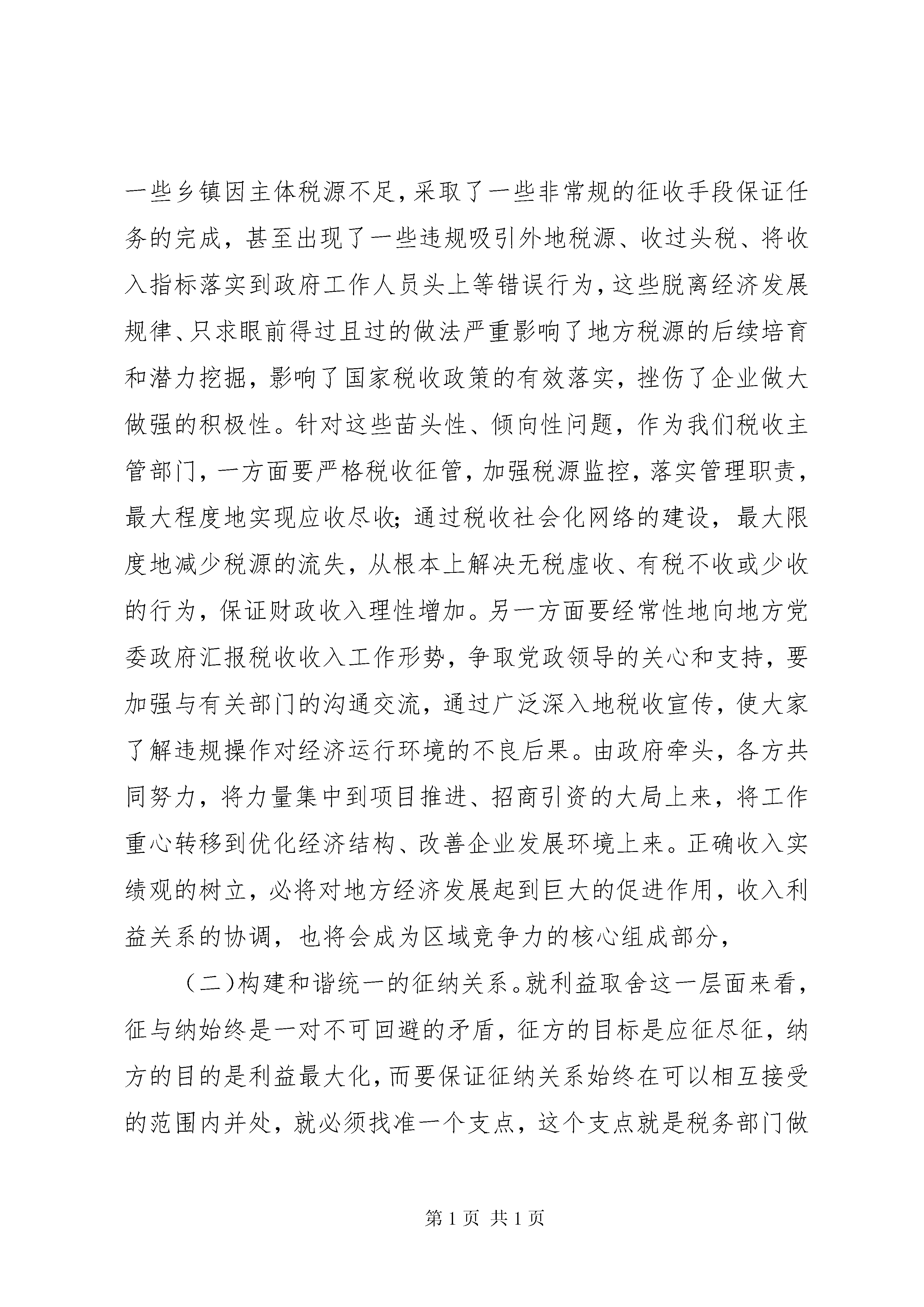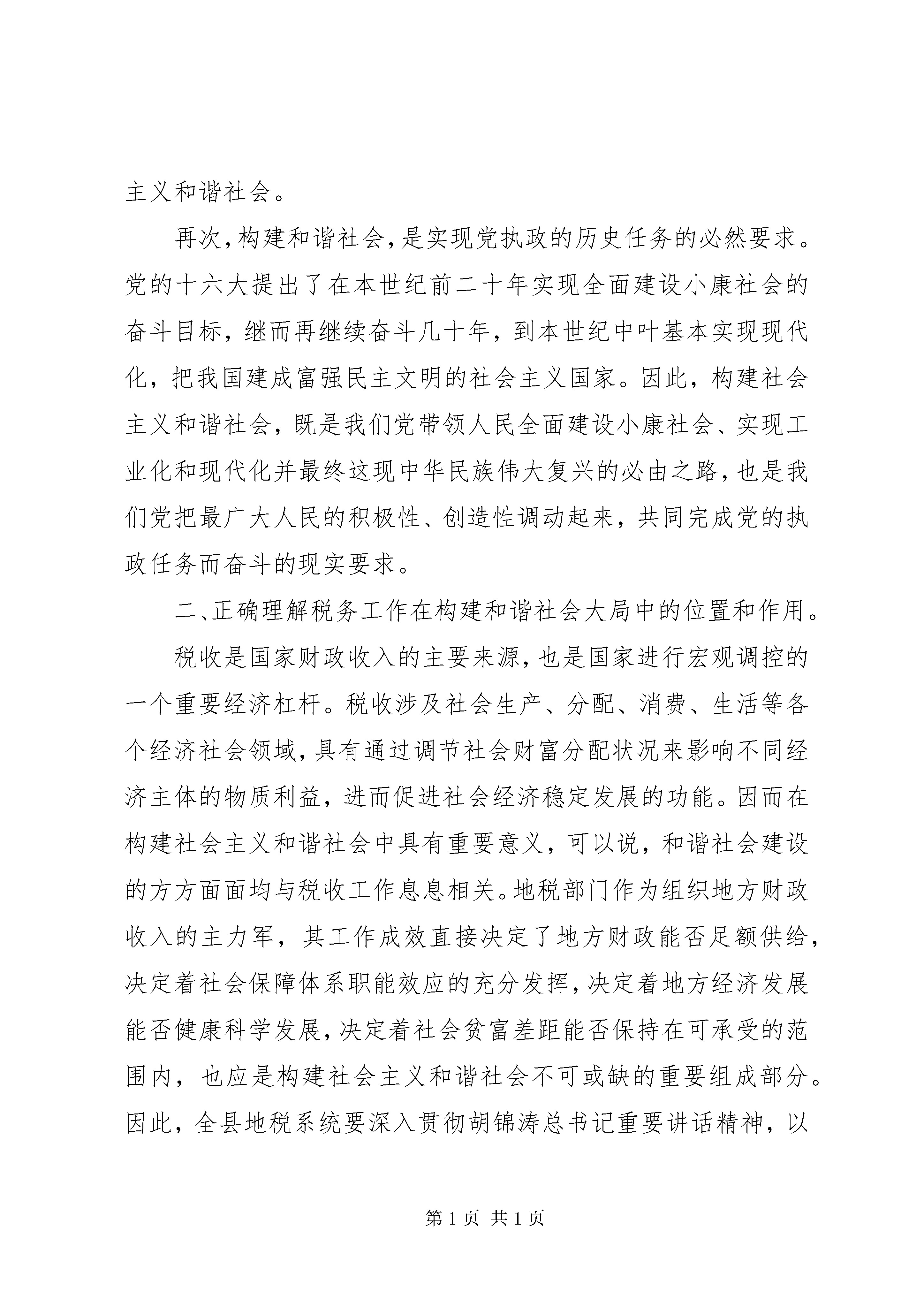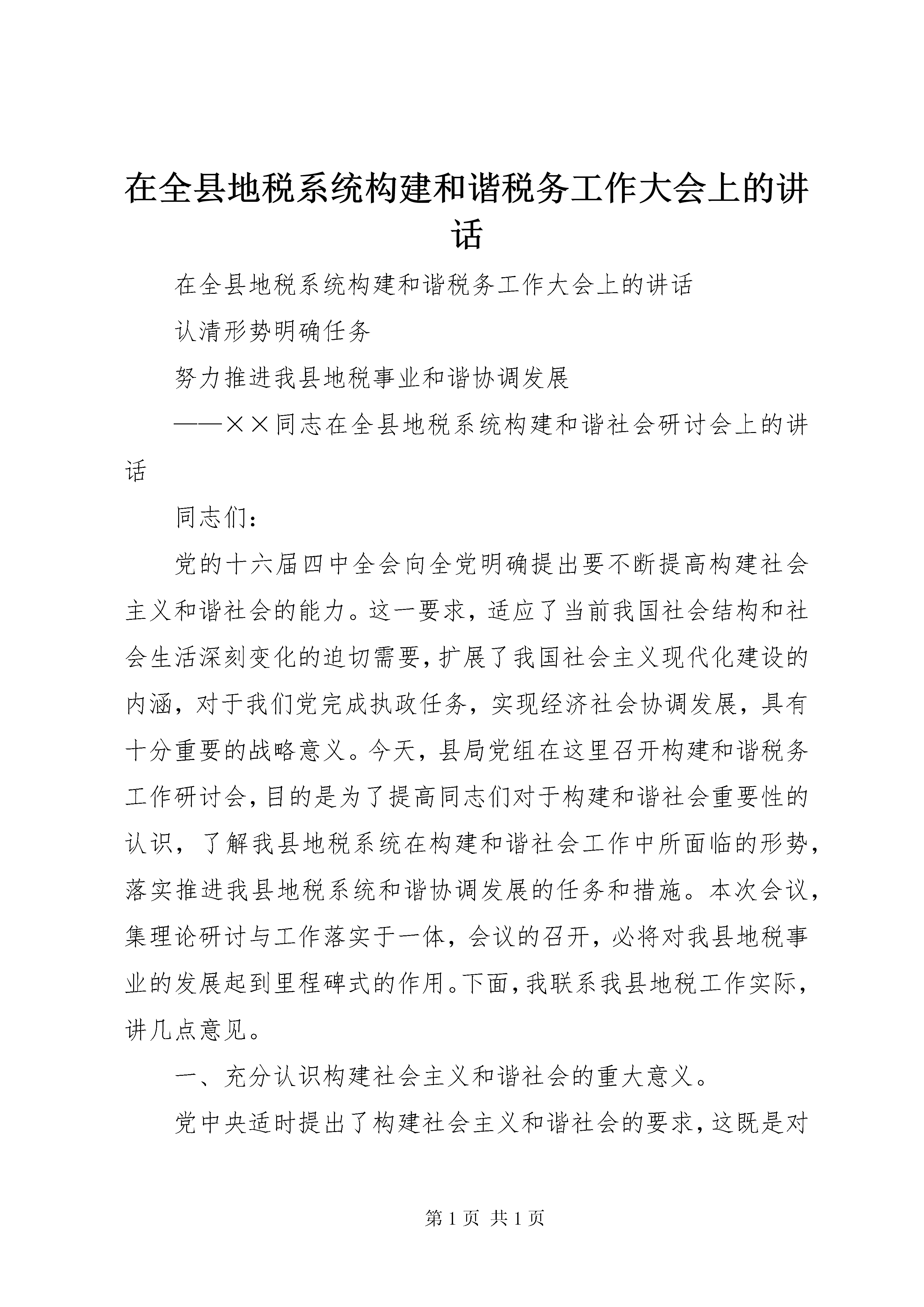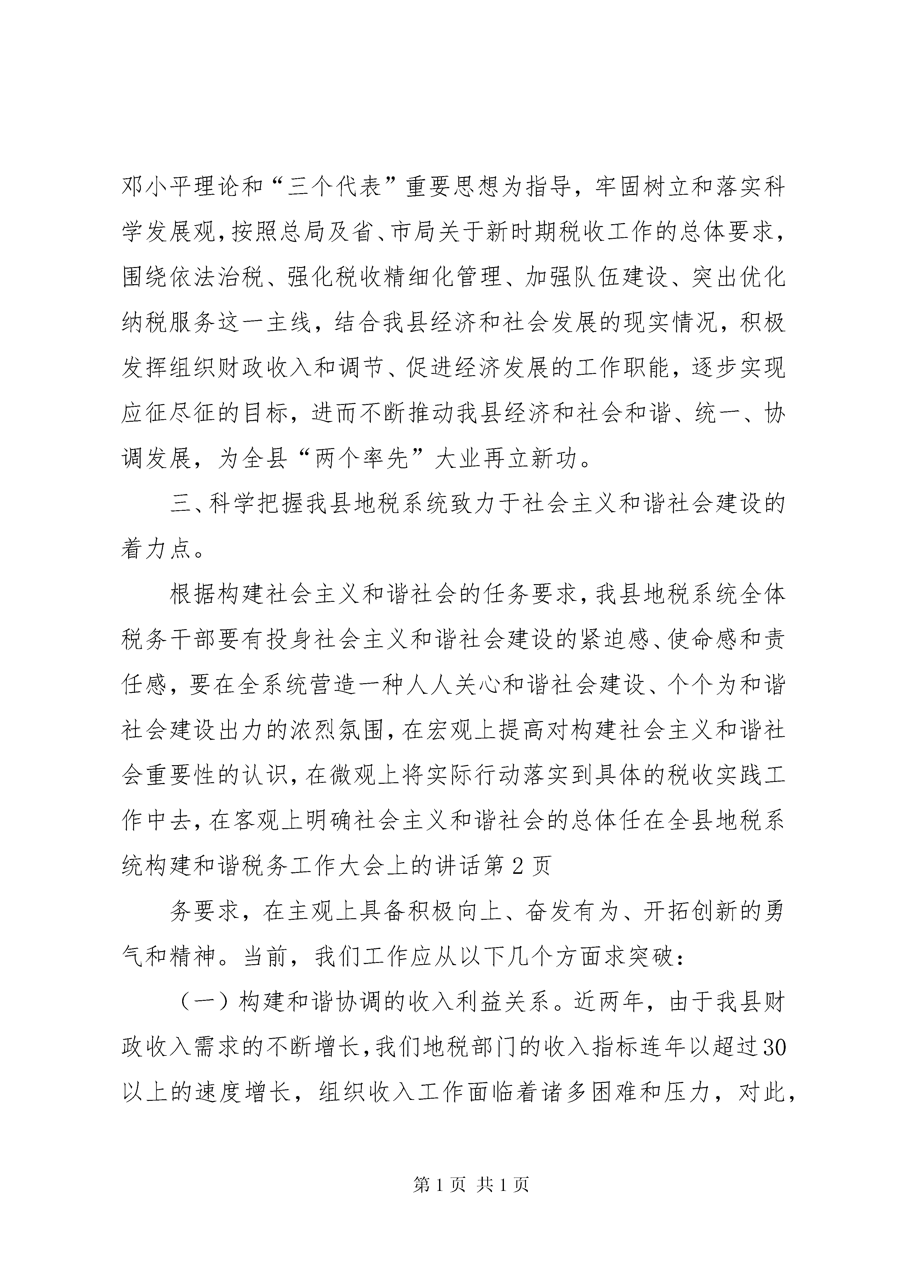 在全县地税系统构建和谐税务工作大会上的讲话在全县地税系统构建和谐税务工作大会上的讲话认清形势明确任务努力推进我县地税事业和谐协调发展——××同志在全县地税系统构建和谐社会研讨会上的讲话同志们:党的十六届四中全会向全党明确提出要不断提高构建社会主义和谐社会的能力。这一要求,适应了当前我国社会结构和社会生活深刻变化的迫切需要,扩展了我国社会主义现代化建设的内涵,对于我们党完成执政任务,实现经济社会协调发展,具有十分重要的战略意义。今天,县局党组在这里召开构建和谐税务工作研讨会,目的是为了提高同志们对于构建和谐社会重要性的认识,了解我县地税系统在构建和谐社会工作中所面临的形势,落实推进我县地税系统和谐协调发展的任务和措施。本次会议,集理论研讨与工作落实于一体,会议的召开,必将对我县地税事业的发展起到里程碑式的作用。下面,我联系我县地税工作实际,讲几点意见。一、充分认识构建社会主义和谐社会的重大意义。党中央适时提出了构建社会主义和谐社会的要求,这既是对我国改革开放和现代化建设经济的科学总结,也是在新的国内外形势下提高党的执政能力、贯彻落实科学发展观、更快地推动我国经济和社会发展的重大战略举措。首先,构建和谐社会是我国经济社会发展的必然要求。20xx年,我国人均国内生产总值已突破1000美元,正在向人均3000美元的目标迈进。许多国家的发展经验表明,这一阶段往往是各种矛盾的凸显期。从我国国情来看,随着改革的深入,经济社会生活发生了深刻的变化,社会经济成分、经济形式、分配方式日益多样化,社会利益关系更为复杂,出现了许多新问题。如果把握得好,就能推动经济和谐发展,否则就会出现发展中的脱节,造成社会动荡甚至出现倒退发展。为了创造经济社会全面发展的良好环境,不断满足人们日益增长的物质文化生活需要,保证国家的长治久安和安定团结,就必须努力构建社会主义和谐社会。其次,构建和谐社会,是巩固党执政的社会基础的必然要求。我们党是我国工人阶段的先锋队,随着改革的不断深入,工人阶级队伍不断扩大,素质不断提高。包括知识分子在内的工人阶级,始终是推动我国先进生产力发展的根本力量。同时,民营经济工作者、外资企业中的中方人员、自由职业者,也是我们党执政必须团结和依靠的力量。为了不断加强党的执政基础,并把新的社会阶层凝聚在党的周围,扩大党执政的群众基础,形成全国人民各尽所能、各得其所而又和谐的社会局面,就必须努力构建社会主义和谐社会。再次,构建和谐社会,是实现党执政的历史任务的必然要求。党的十六大提出了在本世纪前二十年实现全面建设小康社会的奋斗目标,继而再继续奋斗几十年,到本世纪中叶基本实现现代化,把我国建成富强民主文明的社会主义国家。因此,构建社会主义和谐社会,既是我们党带领人民全面建设小康社会、实现工业化和现代化并最终这现中华民族伟大复兴的必由之路,也是我们党把最广大人民的积极性、创造性调动起来,共同完成党的执政任务而奋斗的现实要求。二、正确理解税务工作在构建和谐社会大局中的位置和作用。税收是国家财政收入的主要来源,也是国家进行宏观调控的一个重要经济杠杆。税收涉及社会生产、分配、消费、生活等各个经济社会领域,具有通过调节社会财富分配状况来影响不同经济主体的物质利益,进而促进社会经济稳定发展的功能。因而在构建社会主义和谐社会中具有重要意义,可以说,和谐社会建设的方方面面均与税收工作息息相关。地税部门作为组织地方财政收入的主力军,其工作成效直接决定了地方财政能否足额供给,决定着社会保障体系职能效应的充分发挥,决定着地方经济发展能否健康科学发展,决定着社会贫富差距能否保持在可承受的范围内,也应是构建社会主义和谐社会不可或缺的重要组成部分。因此,全县地税系统要深入贯彻胡锦涛总书记重要讲话精神,以邓小平理论和“三个代表”重要思想为指导,牢固树立和落实科学发展观,按照总局及省、市局关于新时期税收工作的总体要求,围绕依法治税、强化税收精细化管理、加强队伍建设、突出优化纳税服务这一主线,结合我县经济和社会发展的现实情况,积极发挥组织财政收入和调节、促进经济发展的工作职能,逐步实现应征尽征的目标,进而不断推动我县经济和社会和谐、统一、协调发展,为全县“两个率先”大业再立新功。三、科学把握我县地税系统致力于社会主义和谐社会建设的着力点。根据构建社会主义和谐社会的任务要求,我县地税系统全体税务干部要有投身社会主义和谐社会建设的紧迫感、使命感和责任感,要在全系统营造一种人人关心和谐社会建设、个个为和谐社会建设出力的浓烈氛围,在宏观上提高对构建社会主义和谐社会重要性的认识,在微观上将实际行动落实到具体的税收实践工作中去,在客观上明确社会主义和谐社会的总体任在全县地税系统构建和谐税务工作大会上的讲话务要求,在主观上具备积极向上、奋发有为、开拓创新的勇气和精神。