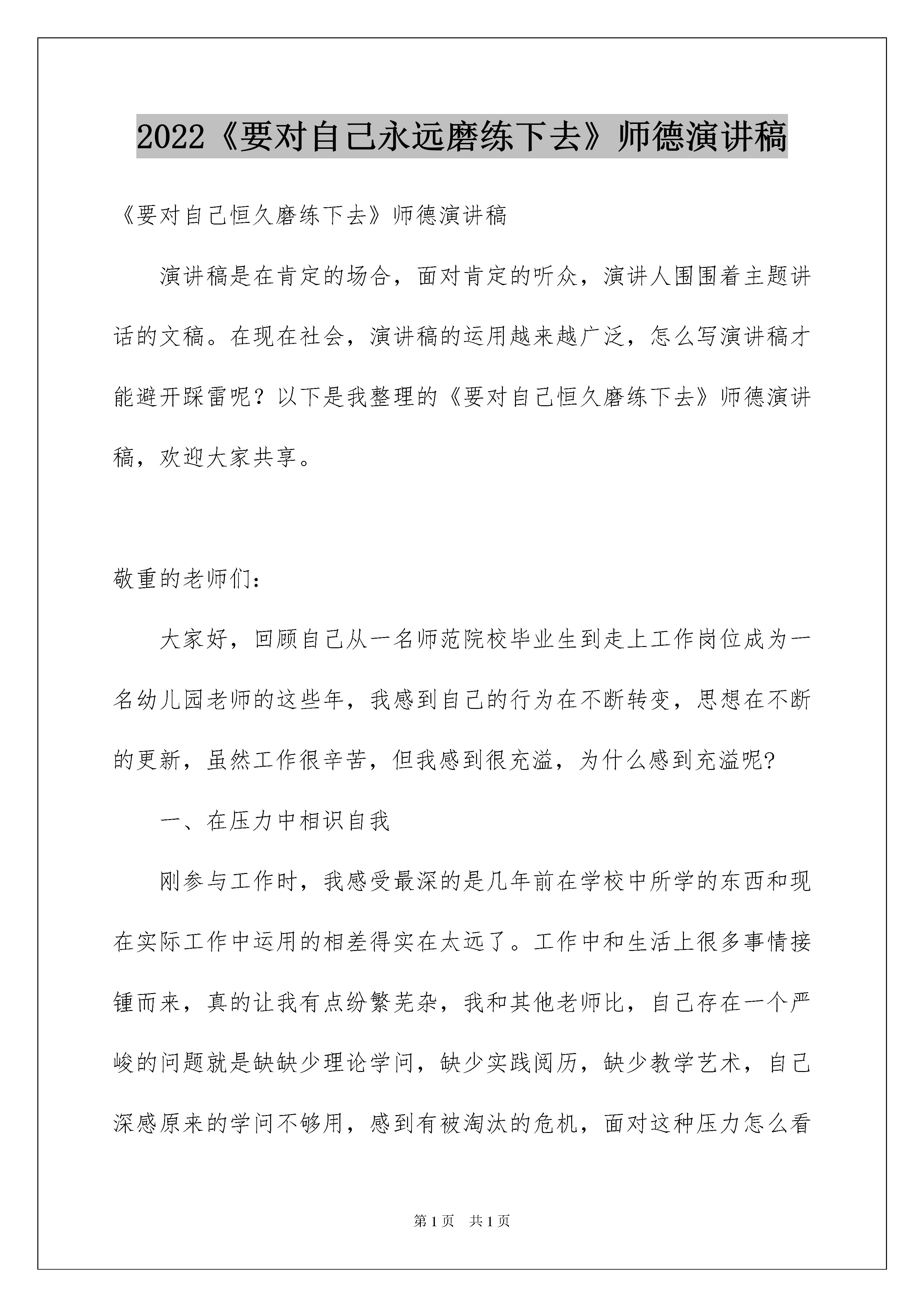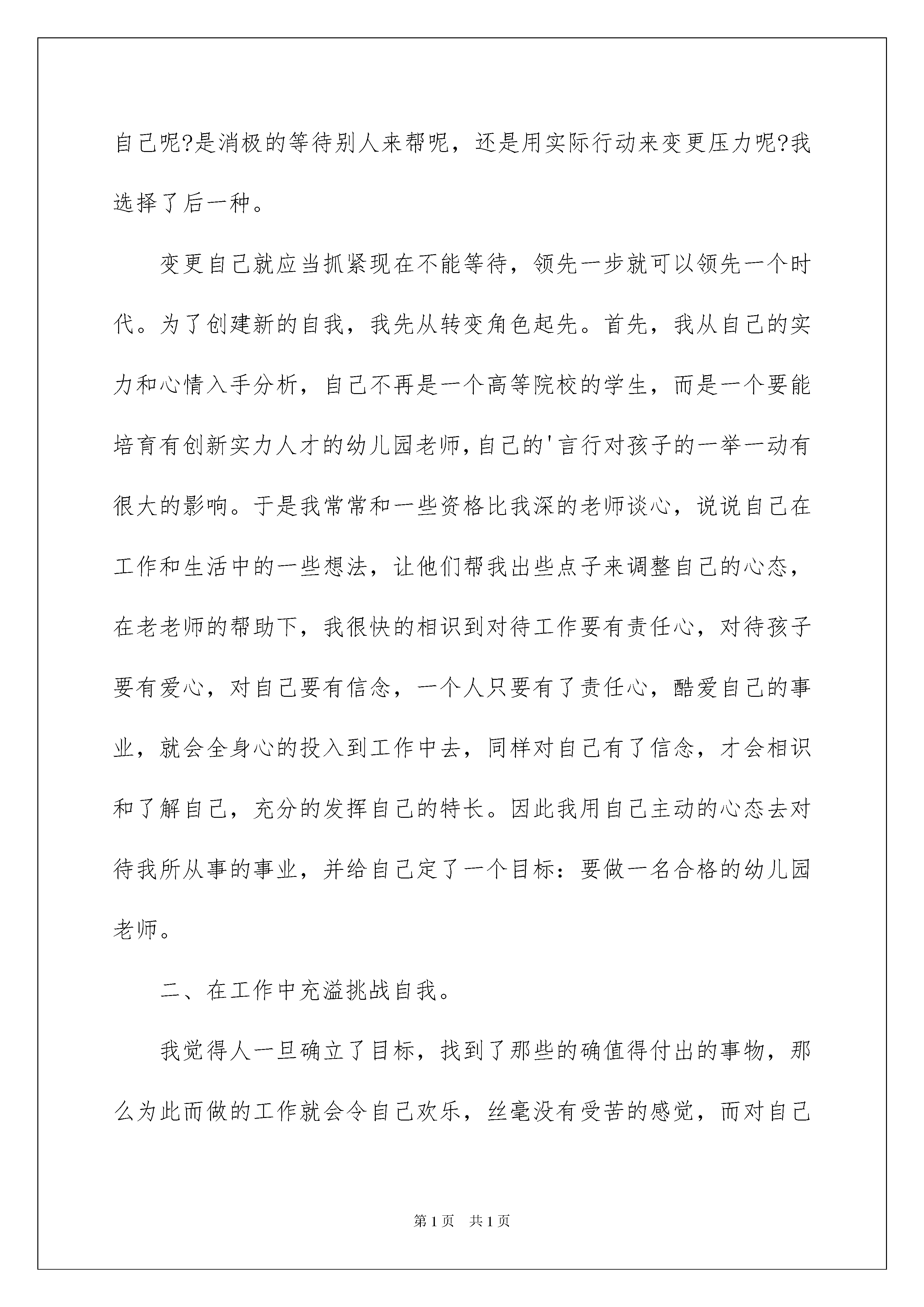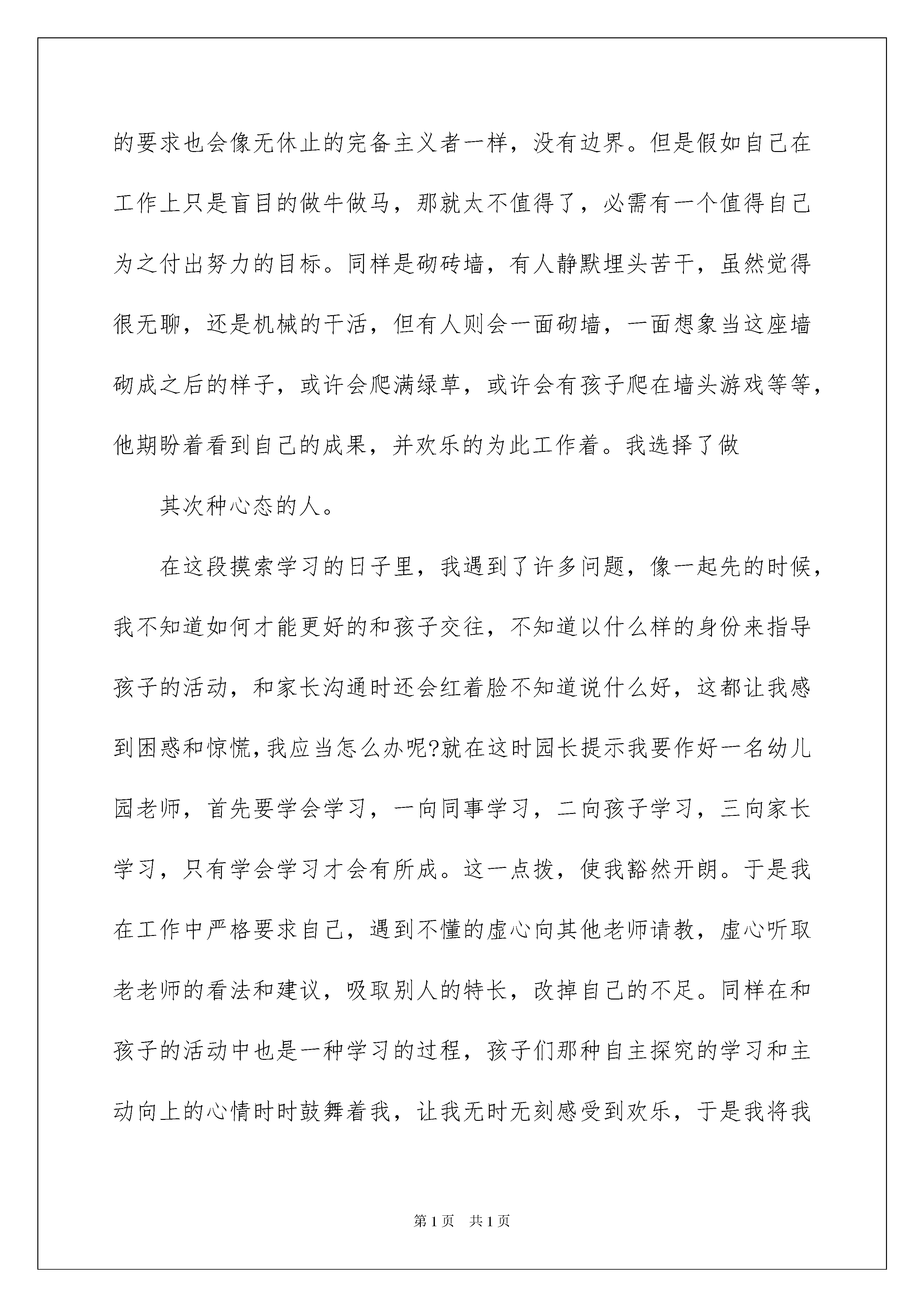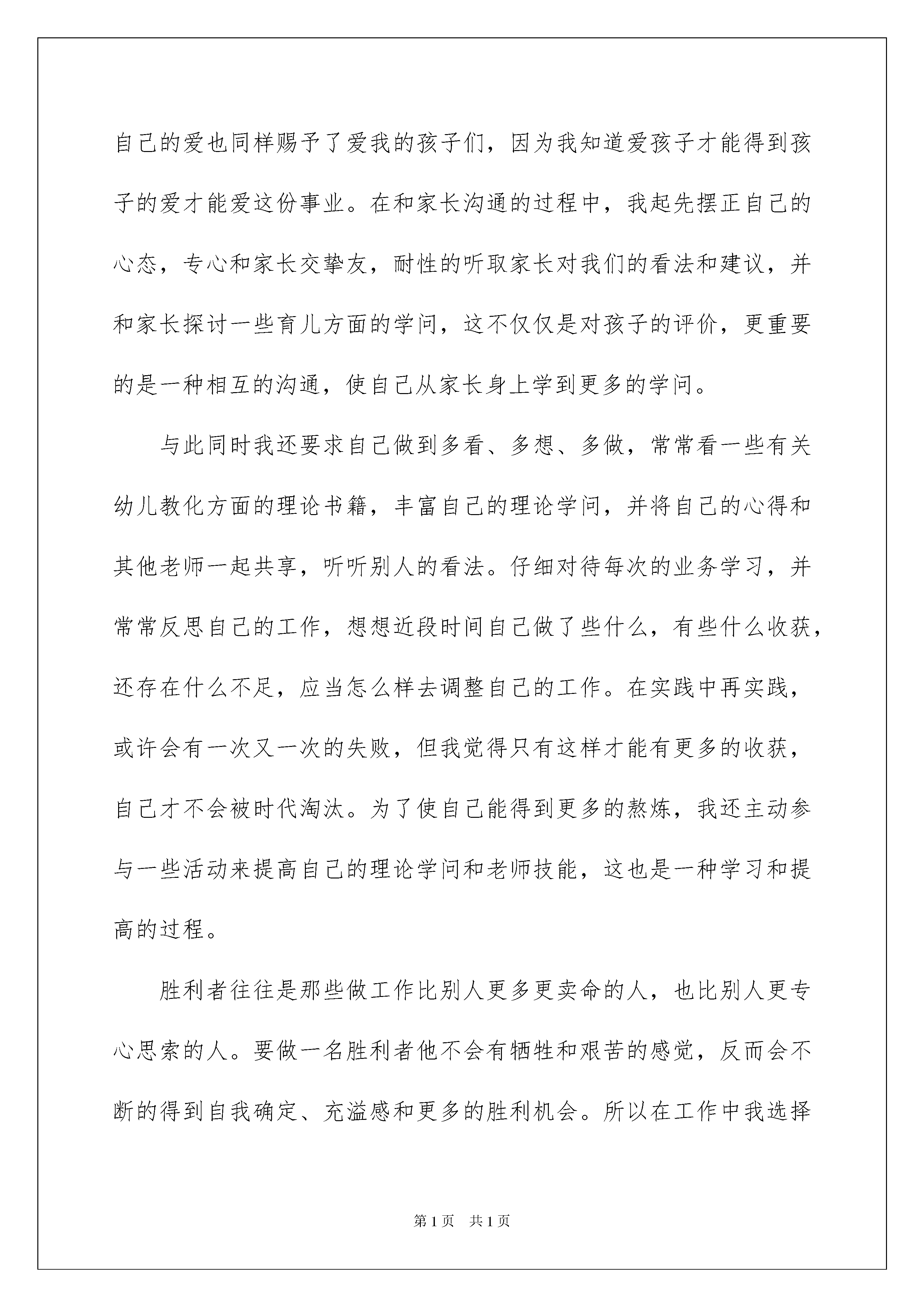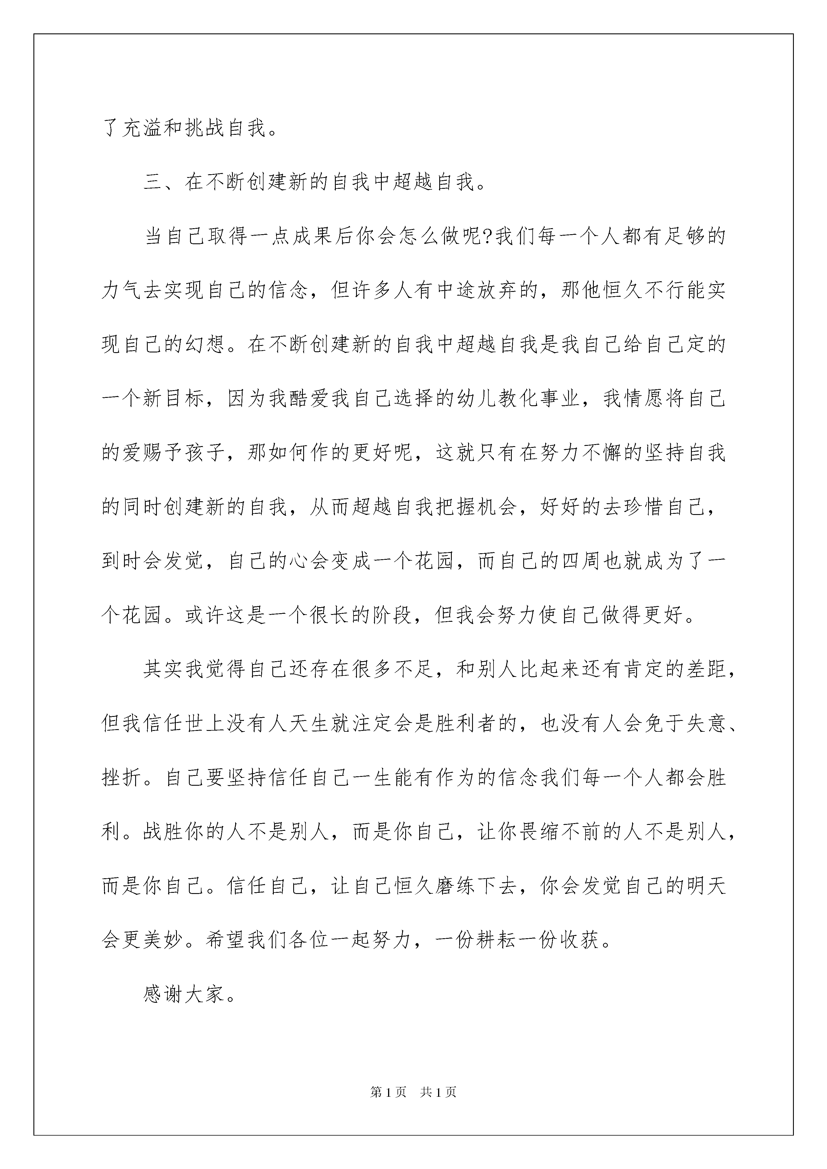 2022《要对自己永远磨练下去》师德演讲稿《要对自己恒久磨练下去》师德演讲稿演讲稿是在肯定的场合,面对肯定的听众,演讲人围围着主题讲话的文稿。在现在社会,演讲稿的运用越来越广泛,怎么写演讲稿才能避开踩雷呢?以下是我整理的《要对自己恒久磨练下去》师德演讲稿,欢迎大家共享。敬重的老师们:大家好,回顾自己从一名师范院校毕业生到走上工作岗位成为一名幼儿园老师的这些年,我感到自己的行为在不断转变,思想在不断的更新,虽然工作很辛苦,但我感到很充溢,为什么感到充溢呢?一、在压力中相识自我刚参与工作时,我感受最深的是几年前在学校中所学的东西和现在实际工作中运用的相差得实在太远了。工作中和生活上很多事情接锺而来,真的让我有点纷繁芜杂,我和其他老师比,自己存在一个严峻的问题就是缺缺少理论学问,缺少实践阅历,缺少教学艺术,自己深感原来的学问不够用,感到有被淘汰的危机,面对这种压力怎么看自己呢?是消极的等待别人来帮呢,还是用实际行动来变更压力呢?我选择了后一种。变更自己就应当抓紧现在不能等待,领先一步就可以领先一个时代。为了创建新的自我,我先从转变角色起先。首先,我从自己的实力和心情入手分析,自己不再是一个高等院校的学生,而是一个要能培育有创新实力人才的幼儿园老师,自己的'言行对孩子的一举一动有很大的影响。于是我常常和一些资格比我深的老师谈心,说说自己在工作和生活中的一些想法,让他们帮我出些点子来调整自己的心态,在老老师的帮助下,我很快的相识到对待工作要有责任心,对待孩子要有爱心,对自己要有信念,一个人只要有了责任心,酷爱自己的事业,就会全身心的投入到工作中去,同样对自己有了信念,才会相识和了解自己,充分的发挥自己的特长。因此我用自己主动的心态去对待我所从事的事业,并给自己定了一个目标:要做一名合格的幼儿园老师。二、在工作中充溢挑战自我。我觉得人一旦确立了目标,找到了那些的确值得付出的事物,那么为此而做的工作就会令自己欢乐,丝毫没有受苦的感觉,而对自己的要求也会像无休止的完备主义者一样,没有边界。但是假如自己在工作上只是盲目的做牛做马,那就太不值得了,必需有一个值得自己为之付出努力的目标。同样是砌砖墙,有人静默埋头苦干,虽然觉得很无聊,还是机械的干活,但有人则会一面砌墙,一面想象当这座墙砌成之后的样子,或许会爬满绿草,或许会有孩子爬在墙头游戏等等,他期盼着看到自己的成果,并欢乐的为此工作着。我选择了做其次种心态的人。在这段摸索学习的日子里,我遇到了许多问题,像一起先的时候,我不知道如何才能更好的和孩子交往,不知道以什么样的身份来指导孩子的活动,和家长沟通时还会红着脸不知道说什么好,这都让我感到困惑和惊慌,我应当怎么办呢?就在这时园长提示我要作好一名幼儿园老师,首先要学会学习,一向同事学习,二向孩子学习,三向家长学习,只有学会学习才会有所成。这一点拨,使我豁然开朗。于是我在工作中严格要求自己,遇到不懂的虚心向其他老师请教,虚心听取老老师的看法和建议,吸取别人的特长,改掉自己的不足。同样在和孩子的活动中也是一种学习的过程,孩子们那种自主探究的学习和主动向上的心情时时鼓舞着我,让我无时无刻感受到欢乐,于是我将我自己的爱也同样赐予了爱我的孩子们,因为我知道爱孩子才能得到孩子的爱才能爱这份事业。在和家长沟通的过程中,我起先摆正自己的心态,专心和家长交挚友,耐性的听取家长对我们的看法和建议,并和家长探讨一些育儿方面的学问,这不仅仅是对孩子的评价,更重要的是一种相互的沟通,使自己从家长身上学到更多的学问。与此同时我还要求自己做到多看、多想、多做,常常看一些有关幼儿教化方面的理论书籍,丰富自己的理论学问,并将自己的心得和其他老师一起共享,听听别人的看法。仔细对待每次的业务学习,并常常反思自己的工作,想想近段时间自己做了些什么,有些什么收获,还存在什么不足,应当怎么样去调整自己的工作。在实践中再实践,或许会有一次又一次的失败,但我觉得只有这样才能有更多的收获,自己才不会被时代淘汰。为了使自己能得到更多的熬炼,我还主动参与一些活动来提高自己的理论学问和老师技能,这也是一种学习和提高的过程。胜利者往往是那些做工作比别人更多更卖命的人,也比别人更专心思索的人。要做一名胜利者他不会有牺牲和艰苦的感觉,反而会不断的得到自我确定、充溢感和更多的胜利机会。所以在工作中我选择了充溢和挑战自我。三、在不断创建新的自我中超越自我。当自己取得一点成果后你会怎么做呢?我们每一个人都有足够的力气去实现自己的信念,但许多人有中途放弃的,那他恒久不行能实现自己的幻想。在不断创建新的自我中超越自我是我自己给自己定的一个新目标,因为我酷爱我自己选