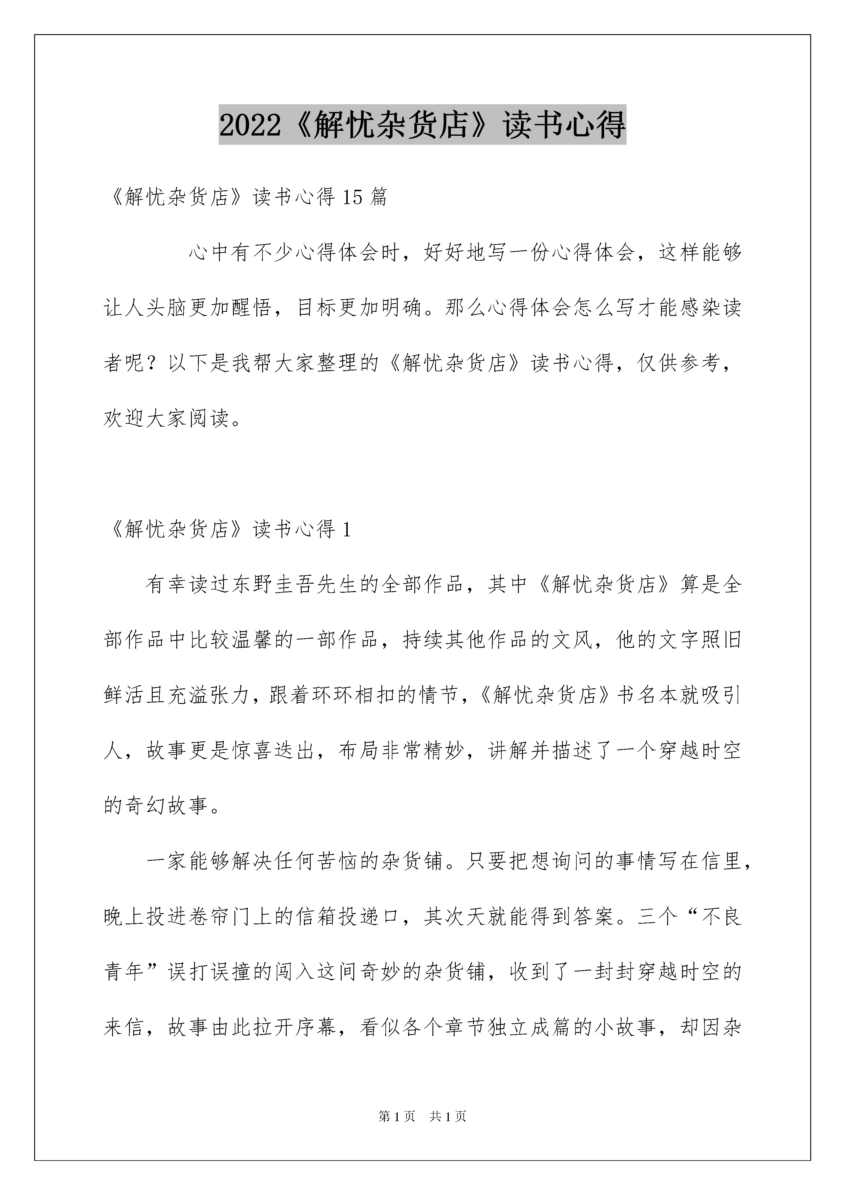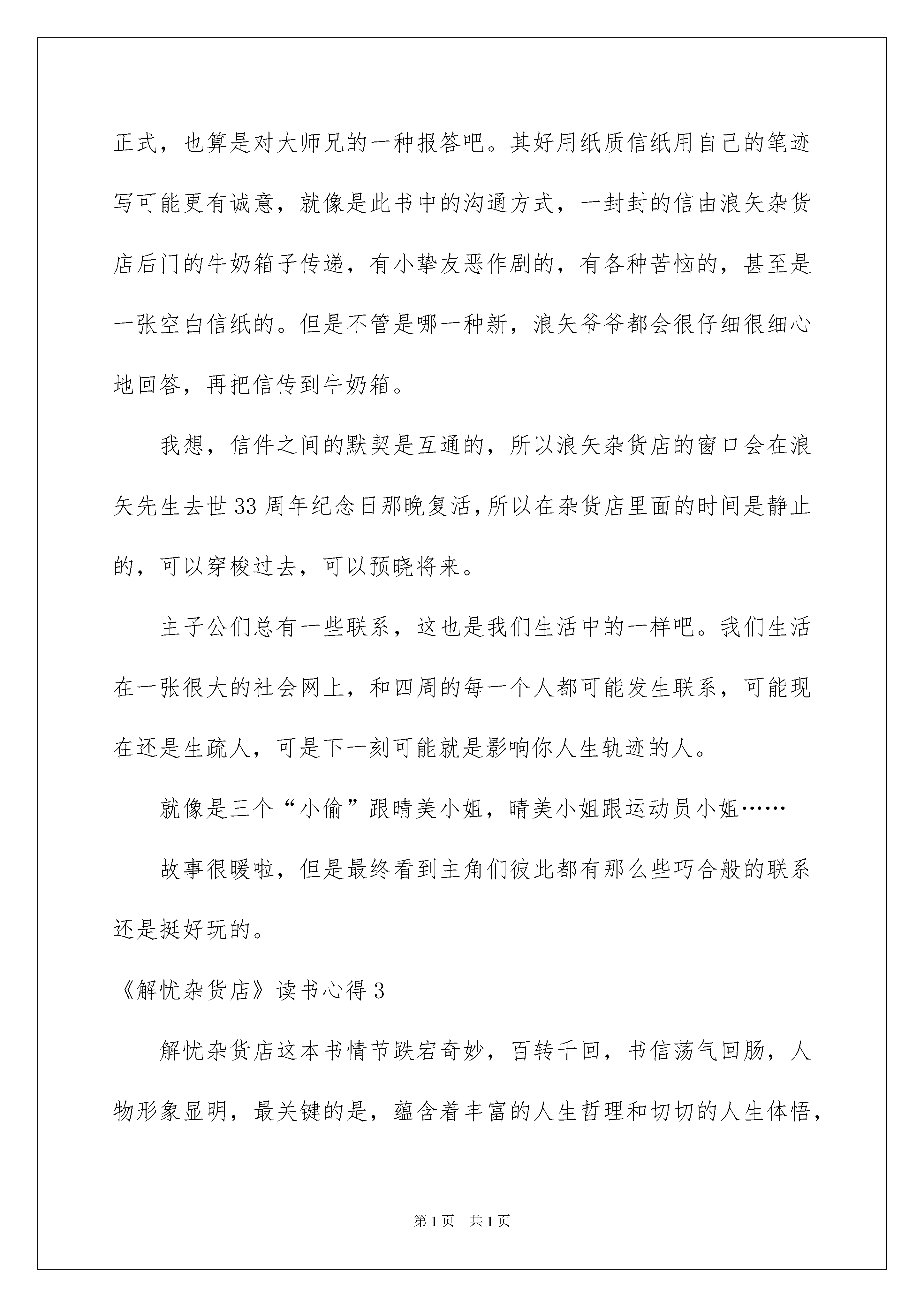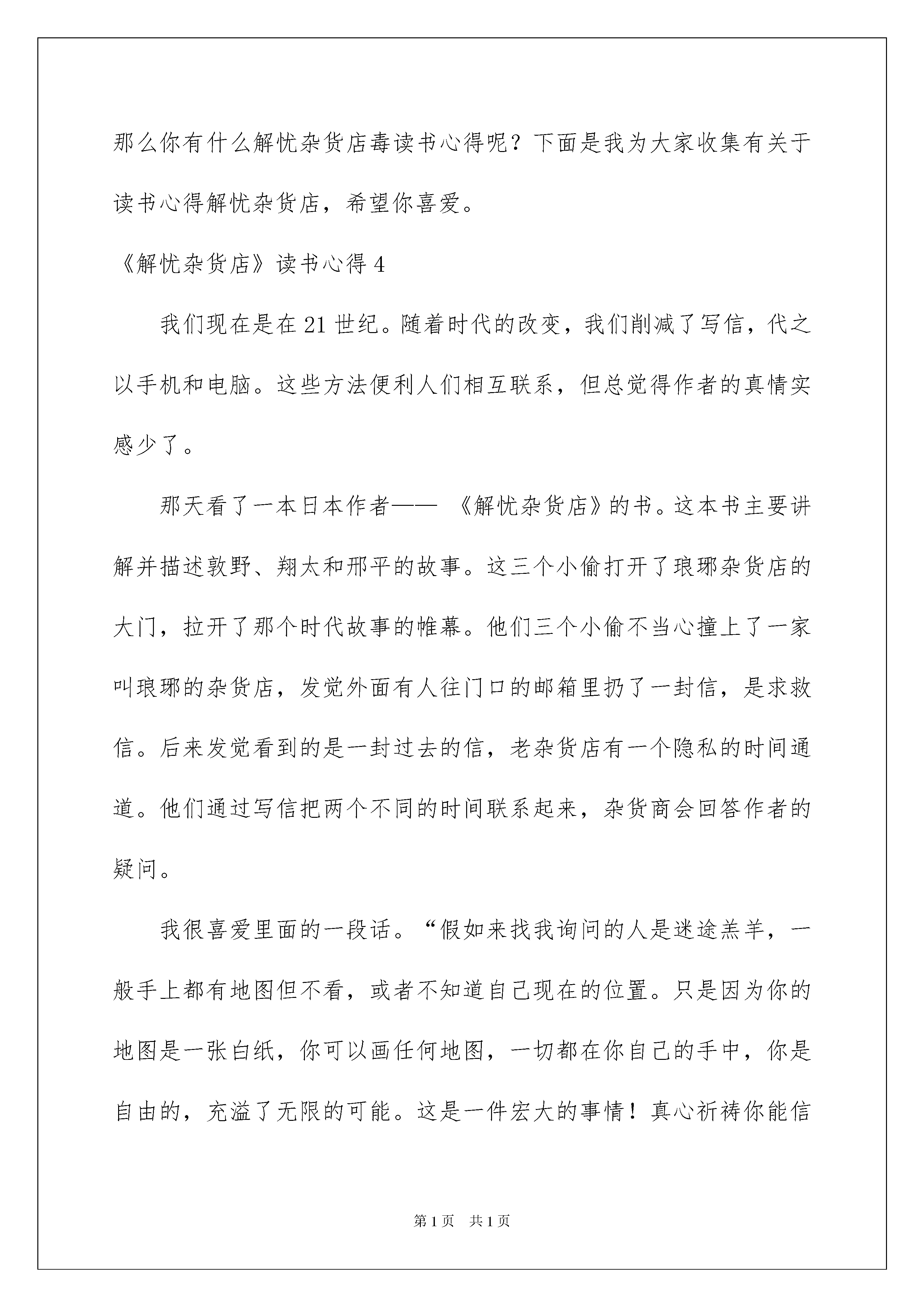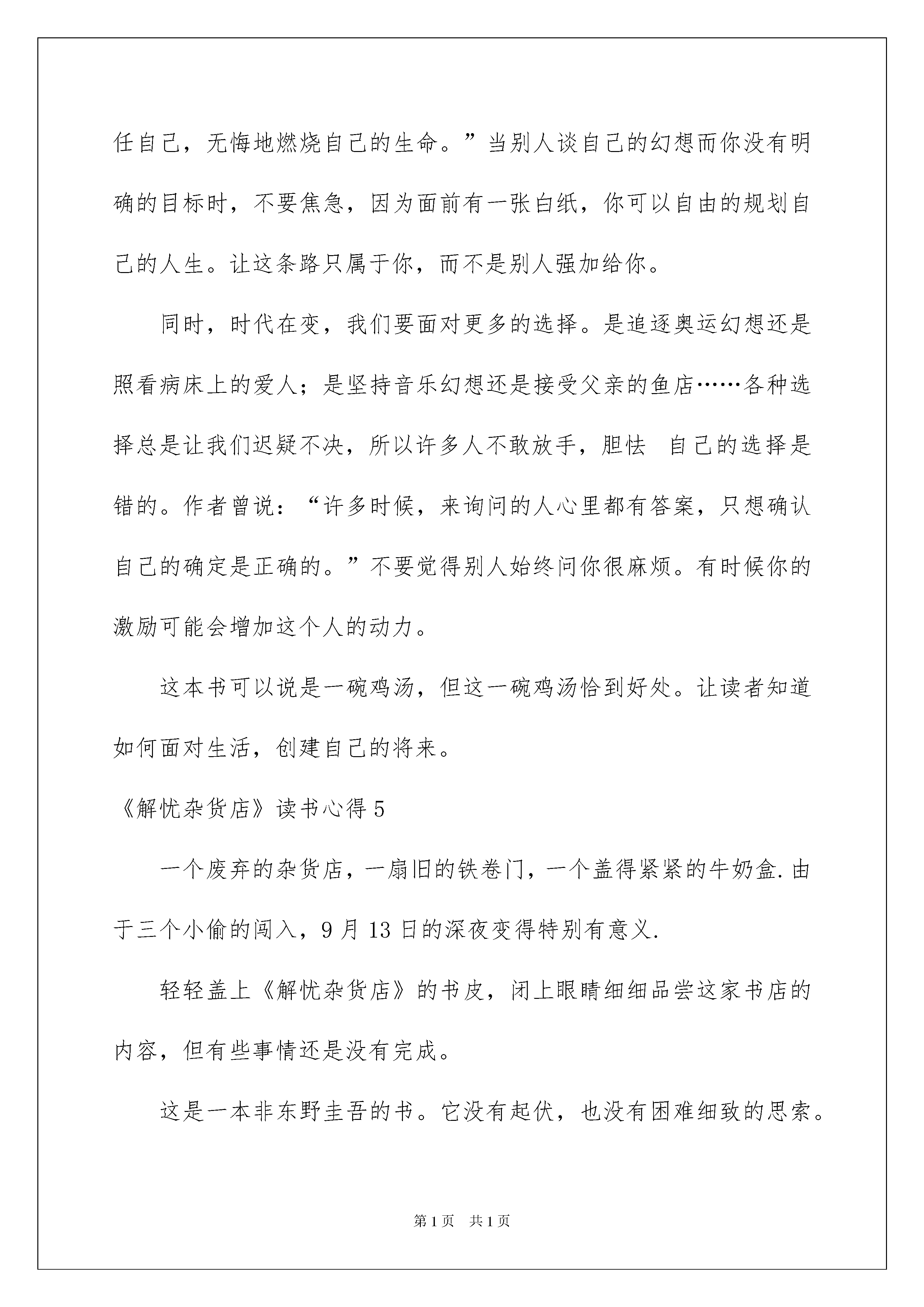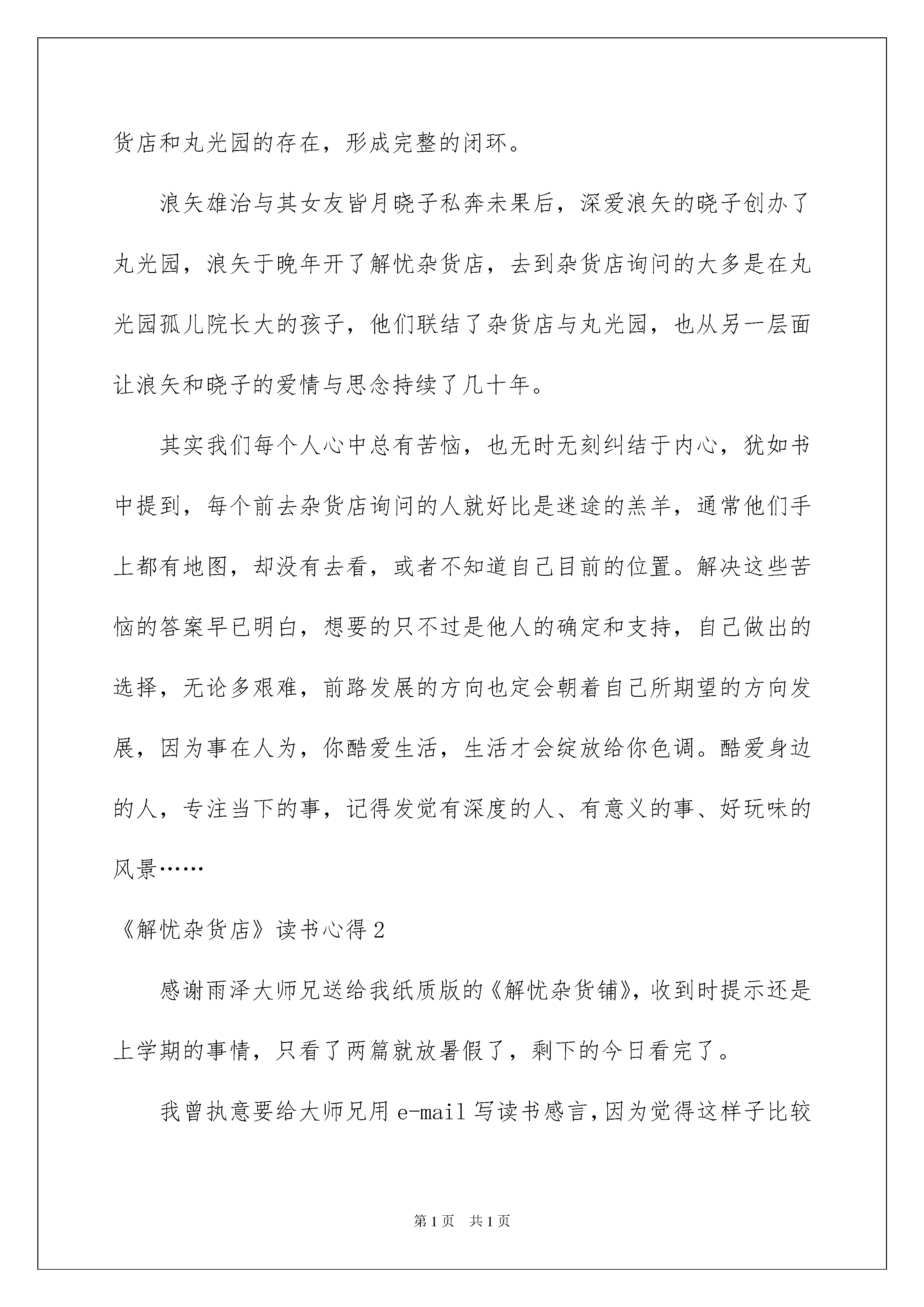 2022《解忧杂货店》读书心得《解忧杂货店》读书心得15篇心中有不少心得体会时,好好地写一份心得体会,这样能够让人头脑更加醒悟,目标更加明确。那么心得体会怎么写才能感染读者呢?以下是我帮大家整理的《解忧杂货店》读书心得,仅供参考,欢迎大家阅读。《解忧杂货店》读书心得1有幸读过东野圭吾先生的全部作品,其中《解忧杂货店》算是全部作品中比较温馨的一部作品,持续其他作品的文风,他的文字照旧鲜活且充溢张力,跟着环环相扣的情节,《解忧杂货店》书名本就吸引人,故事更是惊喜迭出,布局非常精妙,讲解并描述了一个穿越时空的奇幻故事。一家能够解决任何苦恼的杂货铺。只要把想询问的事情写在信里,晚上投进卷帘门上的信箱投递口,其次天就能得到答案。三个“不良青年”误打误撞的闯入这间奇妙的杂货铺,收到了一封封穿越时空的来信,故事由此拉开序幕,看似各个章节独立成篇的小故事,却因杂货店和丸光园的存在,形成完整的闭环。浪矢雄治与其女友皆月晓子私奔未果后,深爱浪矢的晓子创办了丸光园,浪矢于晚年开了解忧杂货店,去到杂货店询问的大多是在丸光园孤儿院长大的孩子,他们联结了杂货店与丸光园,也从另一层面让浪矢和晓子的爱情与思念持续了几十年。其实我们每个人心中总有苦恼,也无时无刻纠结于内心,犹如书中提到,每个前去杂货店询问的人就好比是迷途的羔羊,通常他们手上都有地图,却没有去看,或者不知道自己目前的位置。解决这些苦恼的答案早已明白,想要的只不过是他人的确定和支持,自己做出的选择,无论多艰难,前路发展的方向也定会朝着自己所期望的方向发展,因为事在人为,你酷爱生活,生活才会绽放给你色调。酷爱身边的人,专注当下的事,记得发觉有深度的人、有意义的事、好玩味的风景……《解忧杂货店》读书心得2感谢雨泽大师兄送给我纸质版的《解忧杂货铺》,收到时提示还是上学期的事情,只看了两篇就放暑假了,剩下的今日看完了。我曾执意要给大师兄用e-mail写读书感言,因为觉得这样子比较正式,也算是对大师兄的一种报答吧。其好用纸质信纸用自己的笔迹写可能更有诚意,就像是此书中的沟通方式,一封封的信由浪矢杂货店后门的牛奶箱子传递,有小挚友恶作剧的,有各种苦恼的,甚至是一张空白信纸的。但是不管是哪一种新,浪矢爷爷都会很仔细很细心地回答,再把信传到牛奶箱。我想,信件之间的默契是互通的,所以浪矢杂货店的窗口会在浪矢先生去世33周年纪念日那晚复活,所以在杂货店里面的时间是静止的,可以穿梭过去,可以预晓将来。主子公们总有一些联系,这也是我们生活中的一样吧。我们生活在一张很大的社会网上,和四周的每一个人都可能发生联系,可能现在还是生疏人,可是下一刻可能就是影响你人生轨迹的人。就像是三个“小偷”跟晴美小姐,晴美小姐跟运动员小姐……故事很暖啦,但是最终看到主角们彼此都有那么些巧合般的联系还是挺好玩的。《解忧杂货店》读书心得3解忧杂货店这本书情节跌宕奇妙,百转千回,书信荡气回肠,人物形象显明,最关键的是,蕴含着丰富的人生哲理和切切的人生体悟,那么你有什么解忧杂货店毒读书心得呢?下面是我为大家收集有关于读书心得解忧杂货店,希望你喜爱。《解忧杂货店》读书心得4我们现在是在21世纪。随着时代的改变,我们削减了写信,代之以手机和电脑。这些方法便利人们相互联系,但总觉得作者的真情实感少了。那天看了一本日本作者——《解忧杂货店》的书。这本书主要讲解并描述敦野、翔太和邢平的故事。这三个小偷打开了琅琊杂货店的大门,拉开了那个时代故事的帷幕。他们三个小偷不当心撞上了一家叫琅琊的杂货店,发觉外面有人往门口的邮箱里扔了一封信,是求救信。后来发觉看到的是一封过去的信,老杂货店有一个隐私的时间通道。他们通过写信把两个不同的时间联系起来,杂货商会回答作者的疑问。我很喜爱里面的一段话。“假如来找我询问的人是迷途羔羊,一般手上都有地图但不看,或者不知道自己现在的位置。只是因为你的地图是一张白纸,你可以画任何地图,一切都在你自己的手中,你是自由的,充溢了无限的可能。这是一件宏大的事情!真心祈祷你能信任自己,无悔地燃烧自己的生命。”当别人谈自己的幻想而你没有明确的目标时,不要焦急,因为面前有一张白纸,你可以自由的规划自己的人生。让这条路只属于你,而不是别人强加给你。同时,时代在变,我们要面对更多的选择。是追逐奥运幻想还是照看病床上的爱人;是坚持音乐幻想还是接受父亲的鱼店……各种选择总是让我们迟疑不决,所以许多人不敢放手,胆怯自己的选择是错的。作者曾说:“许多时候,来询问的人心里都有答案,只想确认自己的确定是正确的。”不要觉得别人始终问你很麻烦。有时候你的激励可能会增加这个人的动力。这本书可以说是一碗鸡汤,但这一碗鸡