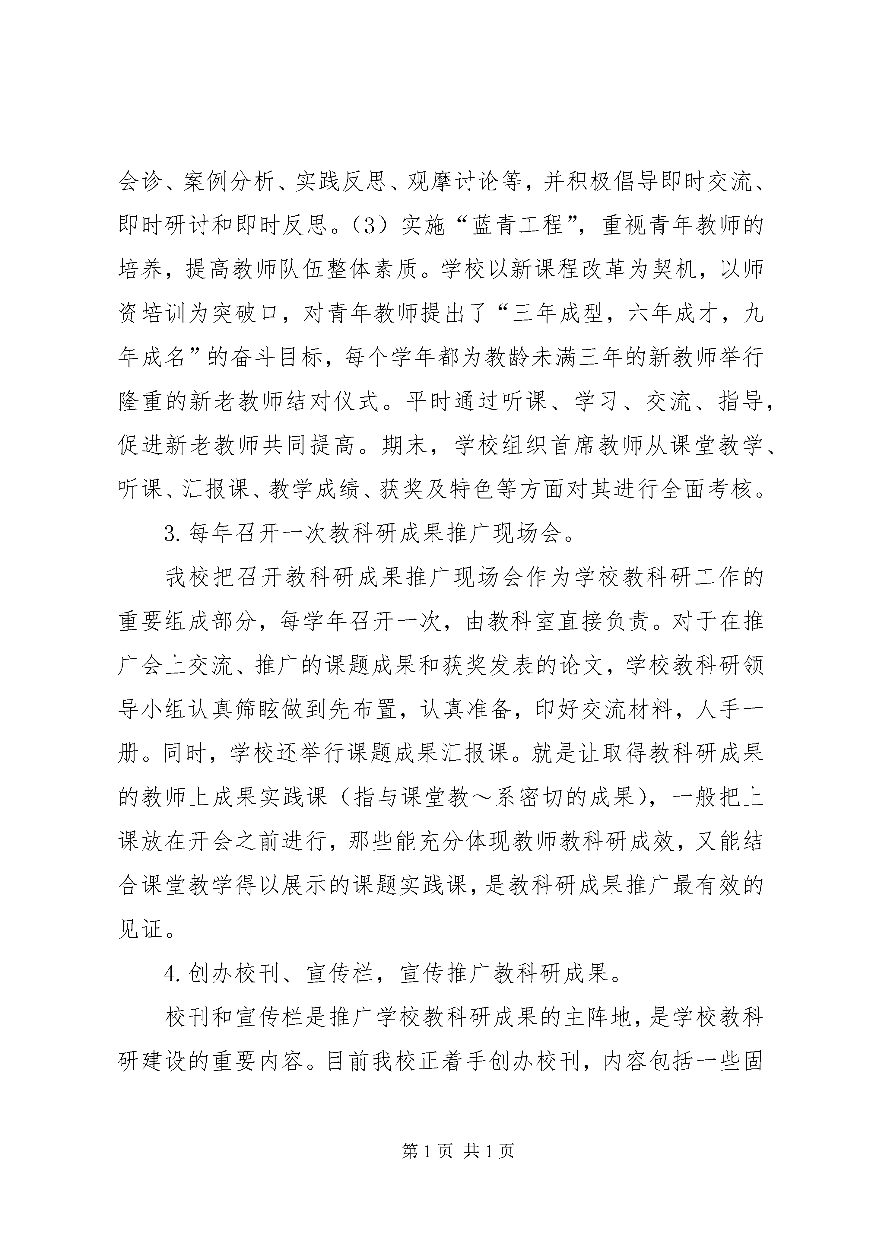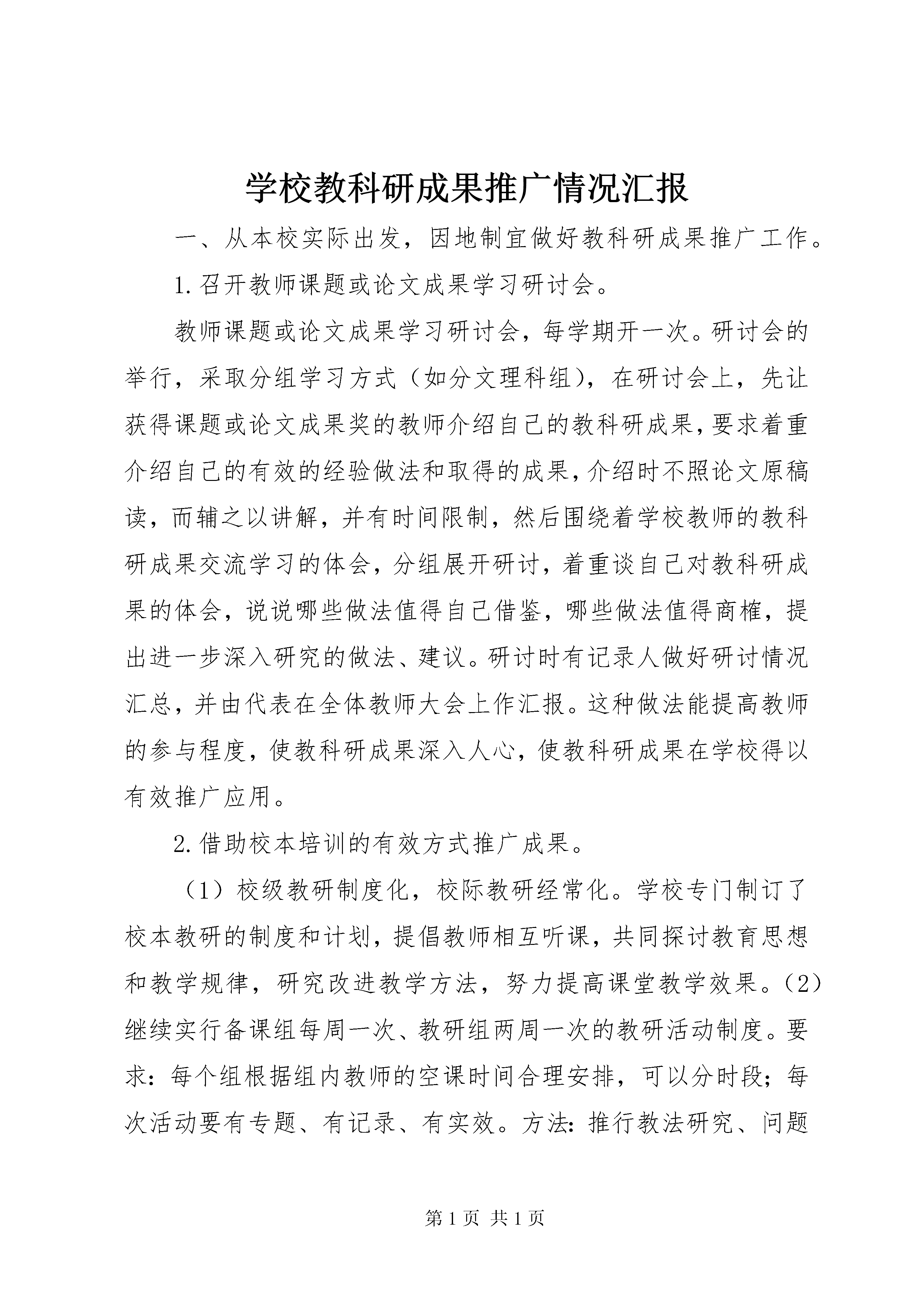 学校教科研成果推广情况汇报一、从本校实际出发,因地制宜做好教科研成果推广工作。1.召开教师课题或论文成果学习研讨会。教师课题或论文成果学习研讨会,每学期开一次。研讨会的举行,采取分组学习方式(如分文理科组),在研讨会上,先让获得课题或论文成果奖的教师介绍自己的教科研成果,要求着重介绍自己的有效的经验做法和取得的成果,介绍时不照论文原稿读,而辅之以讲解,并有时间限制,然后围绕着学校教师的教科研成果交流学习的体会,分组展开研讨,着重谈自己对教科研成果的体会,说说哪些做法值得自己借鉴,哪些做法值得商榷,提出进一步深入研究的做法、建议。研讨时有记录人做好研讨情况汇总,并由代表在全体教师大会上作汇报。这种做法能提高教师的参与程度,使教科研成果深入人心,使教科研成果在学校得以有效推广应用。2.借助校本培训的有效方式推广成果。(1)校级教研制度化,校际教研经常化。学校专门制订了校本教研的制度和计划,提倡教师相互听课,共同探讨教育思想和教学规律,研究改进教学方法,努力提高课堂教学效果。(2)继续实行备课组每周一次、教研组两周一次的教研活动制度。要求:每个组根据组内教师的空课时间合理安排,可以分时段;每次活动要有专题、有记录、有实效。方法:推行教法研究、问题会诊、案例分析、实践反思、观摩讨论等,并积极倡导即时交流、即时研讨和即时反思。(3)实施“蓝青工程”,重视青年教师的培养,提高教师队伍整体素质。学校以新课程改革为契机,以师资培训为突破口,对青年教师提出了“三年成型,六年成才,九年成名”的奋斗目标,每个学年都为教龄未满三年的新教师举行隆重的新老教师结对仪式。平时通过听课、学习、交流、指导,促进新老教师共同提高。期末,学校组织首席教师从课堂教学、听课、汇报课、教学成绩、获奖及特色等方面对其进行全面考核。3.每年召开一次教科研成果推广现场会。我校把召开教科研成果推广现场会作为学校教科研工作的重要组成部分,每学年召开一次,由教科室直接负责。对于在推广会上交流、推广的课题成果和获奖发表的论文,学校教科研领导小组认真筛眩做到先布置,认真准备,印好交流材料,人手一册。同时,学校还举行课题成果汇报课。就是让取得教科研成果的教师上成果实践课(指与课堂教~系密切的成果),一般把上课放在开会之前进行,那些能充分体现教师教科研成效,又能结合课堂教学得以展示的课题实践课,是教科研成果推广最有效的见证。4.创办校刊、宣传栏,宣传推广教科研成果。校刊和宣传栏是推广学校教科研成果的主阵地,是学校教科研建设的重要内容。目前我校正着手创办校刊,内容包括一些固定栏目:如(1)学校教科研活动信息报道;(2)教师课题研究过程中相关论文选登;(3)教师在报刊上发表或在上一级论文评比中获奖的论文选登;(4)本校师生作品眩也设一些不固定栏目,如(1)外校先进的教育教学经验和教科研成果选登;(2)上级教育政策法规或学校规章制度选登;(3)教育教学热点问题探讨等。