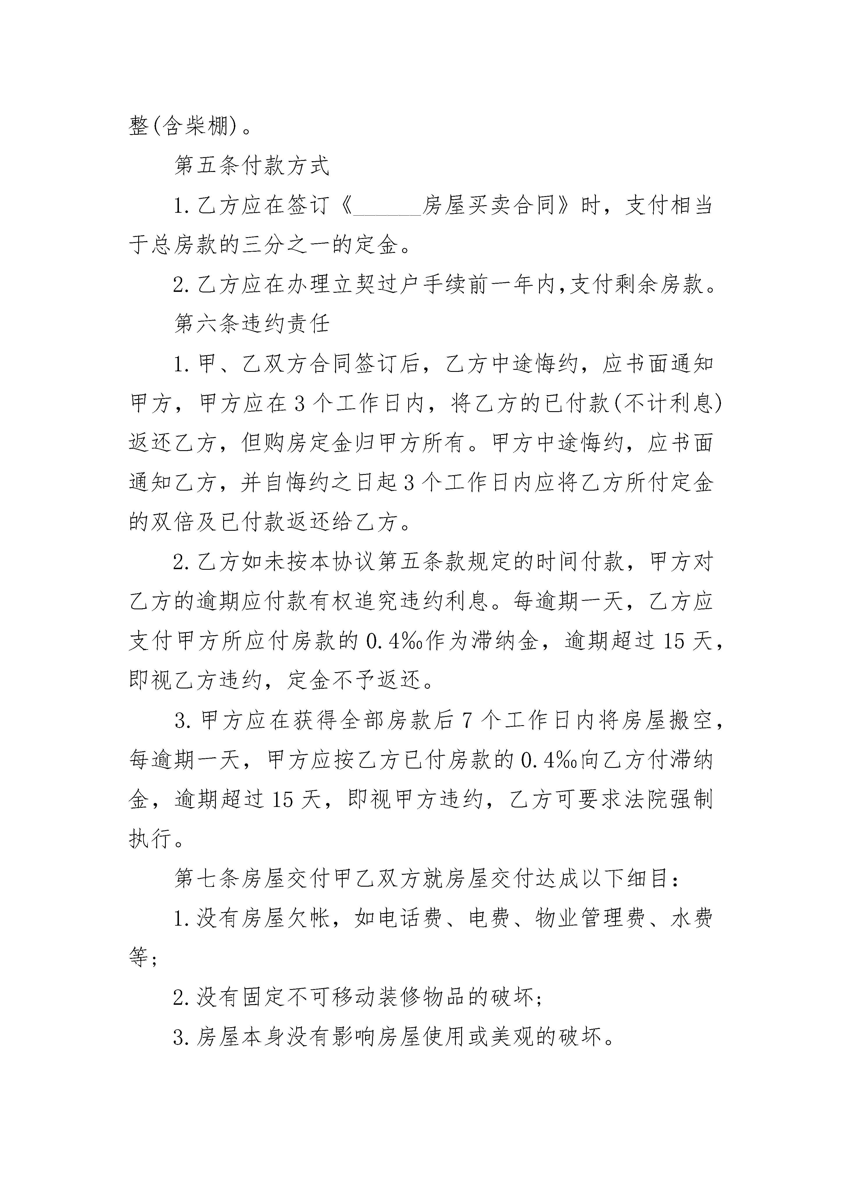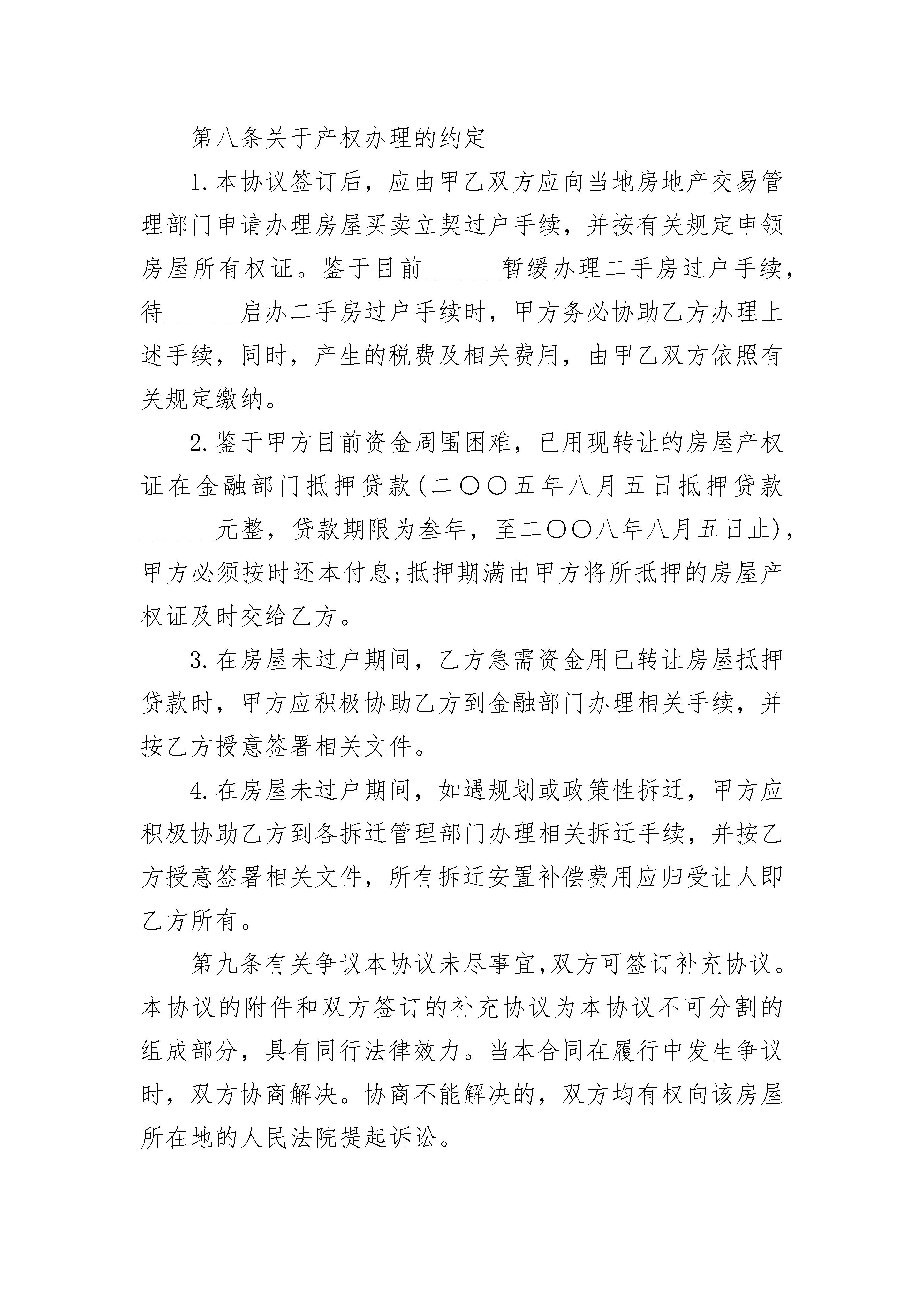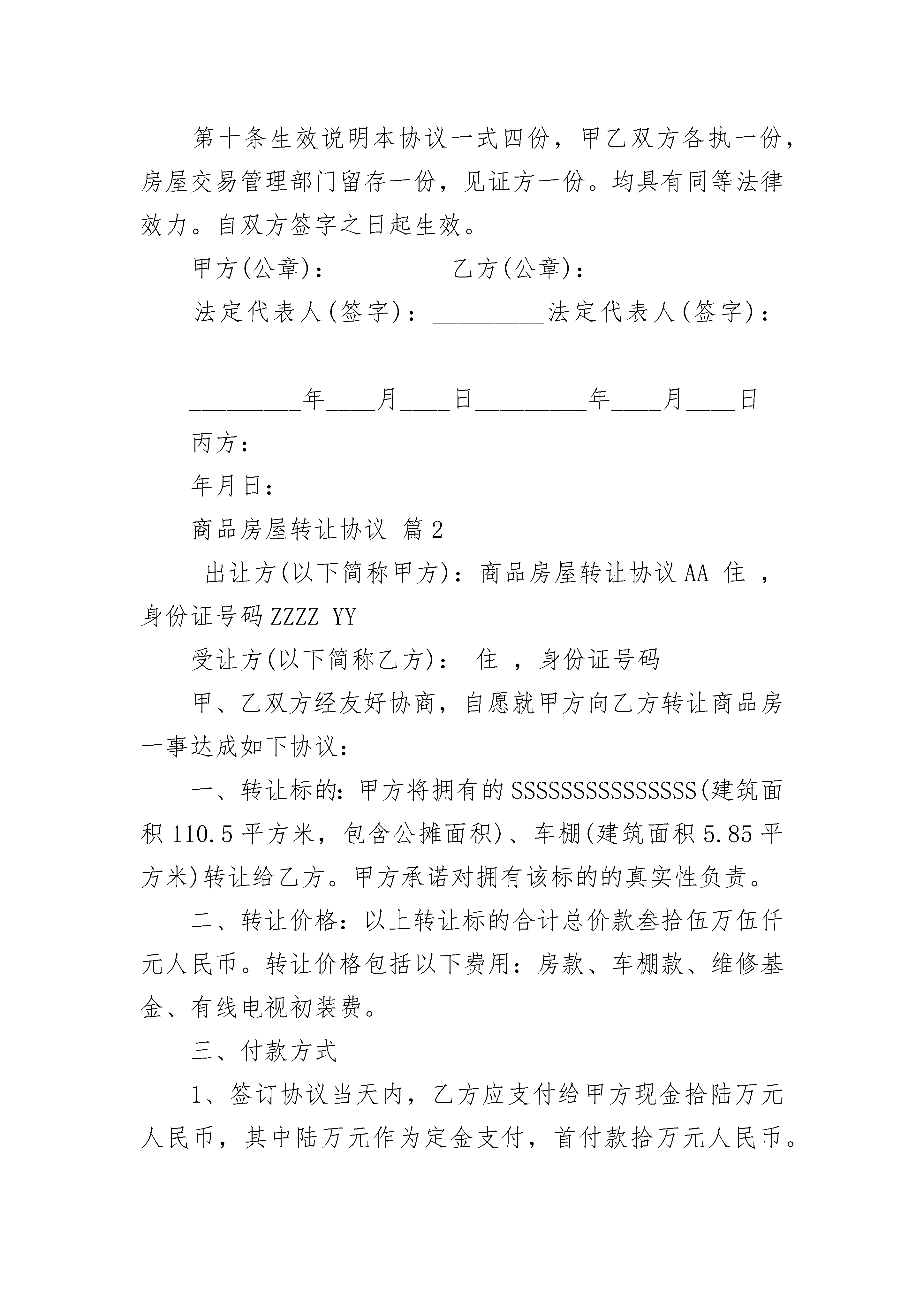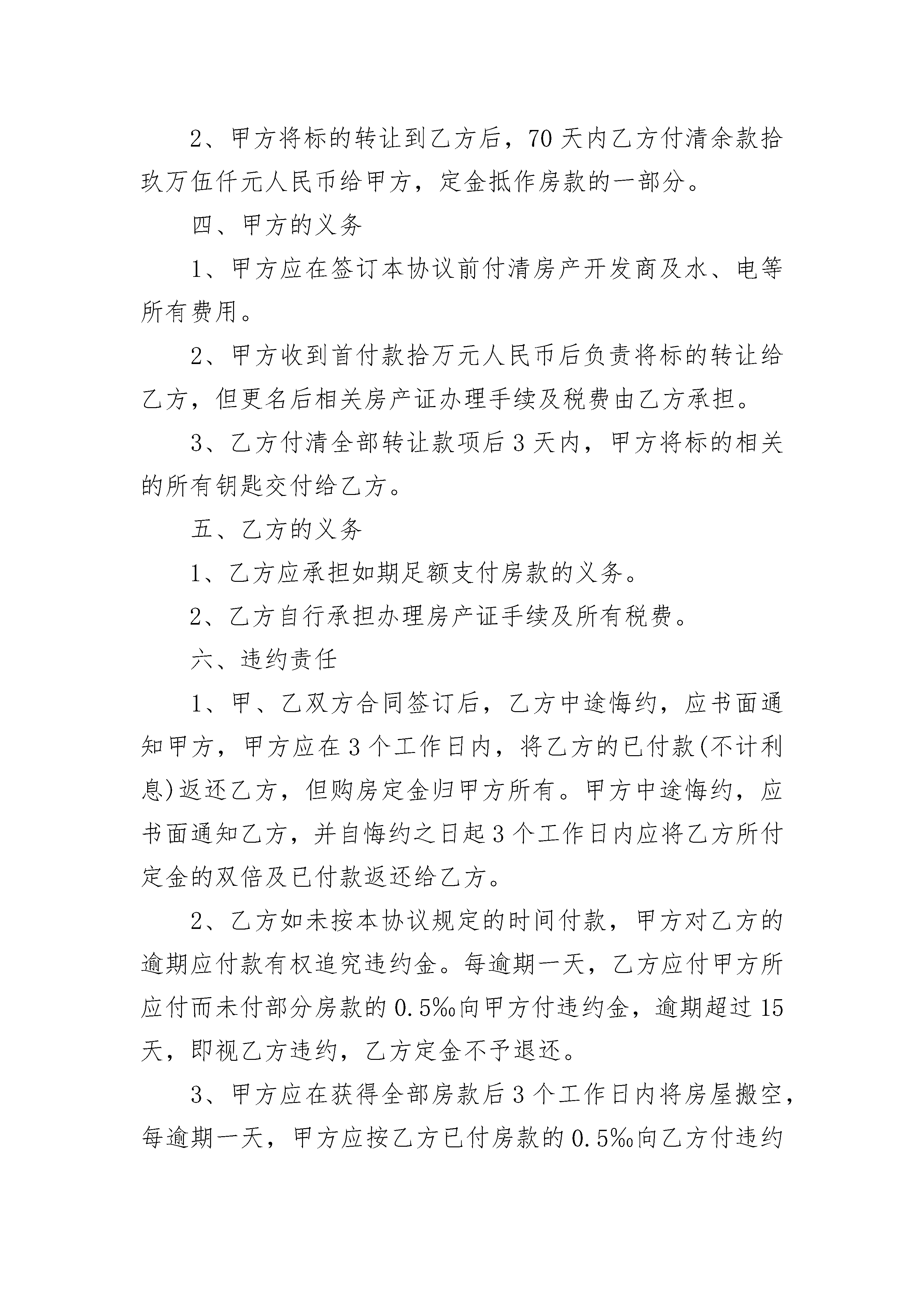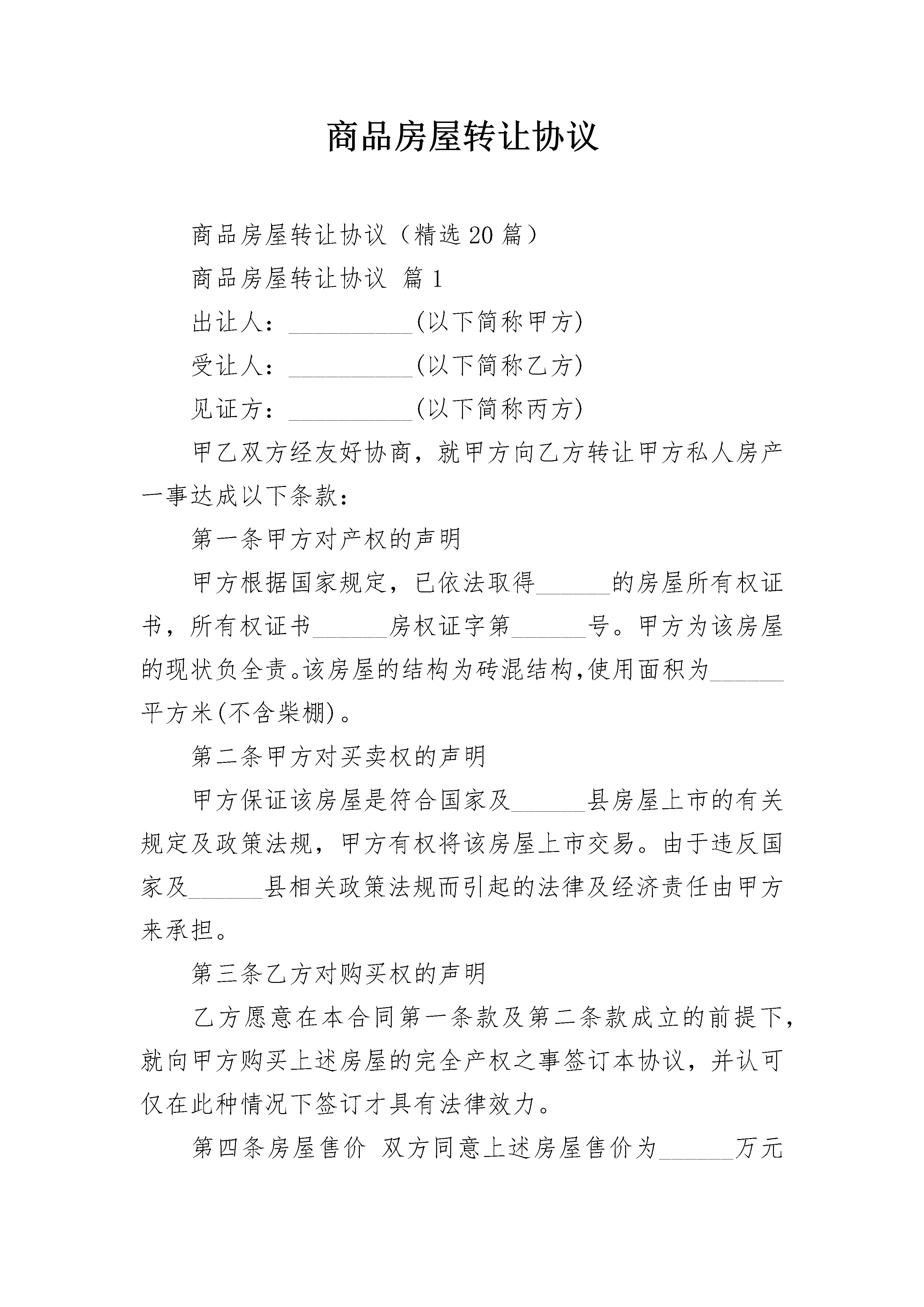 商品房屋转让协议商品房屋转让协议(精选20篇)商品房屋转让协议篇1出让人:__________(以下简称甲方)受让人:__________(以下简称乙方)见证方:__________(以下简称丙方)甲乙双方经友好协商,就甲方向乙方转让甲方私人房产一事达成以下条款:第一条甲方对产权的声明甲方根据国家规定,已依法取得______的房屋所有权证书,所有权证书______房权证字第______号。甲方为该房屋的现状负全责。该房屋的结构为砖混结构,使用面积为______平方米(不含柴棚)。第二条甲方对买卖权的声明甲方保证该房屋是符合国家及______县房屋上市的有关规定及政策法规,甲方有权将该房屋上市交易。由于违反国家及______县相关政策法规而引起的法律及经济责任由甲方来承担。第三条乙方对购买权的声明乙方愿意在本合同第一条款及第二条款成立的前提下,就向甲方购买上述房屋的完全产权之事签订本协议,并认可仅在此种情况下签订才具有法律效力。第四条房屋售价双方同意上述房屋售价为______万元整(含柴棚)。第五条付款方式1.乙方应在签订《______房屋买卖合同》时,支付相当于总房款的三分之一的定金。2.乙方应在办理立契过户手续前一年内,支付剩余房款。第六条违约责任1.甲、乙双方合同签订后,乙方中途悔约,应书面通知甲方,甲方应在3个工作日内,将乙方的已付款(不计利息)返还乙方,但购房定金归甲方所有。甲方中途悔约,应书面通知乙方,并自悔约之日起3个工作日内应将乙方所付定金的双倍及已付款返还给乙方。2.乙方如未按本协议第五条款规定的时间付款,甲方对乙方的逾期应付款有权追究违约利息。每逾期一天,乙方应支付甲方所应付房款的0.4‰作为滞纳金,逾期超过15天,即视乙方违约,定金不予返还。3.甲方应在获得全部房款后7个工作日内将房屋搬空,每逾期一天,甲方应按乙方已付房款的0.4‰向乙方付滞纳金,逾期超过15天,即视甲方违约,乙方可要求法院强制执行。第七条房屋交付甲乙双方就房屋交付达成以下细目:1.没有房屋欠帐,如电话费、电费、物业管理费、水费等;2.没有固定不可移动装修物品的破坏;3.房屋本身没有影响房屋使用或美观的破坏。第八条关于产权办理的约定1.本协议签订后,应由甲乙双方应向当地房地产交易管理部门申请办理房屋买卖立契过户手续,并按有关规定申领房屋所有权证。鉴于目前______暂缓办理二手房过户手续,待______启办二手房过户手续时,甲方务必协助乙方办理上述手续,同时,产生的税费及相关费用,由甲乙双方依照有关规定缴纳。2.鉴于甲方目前资金周围困难,已用现转让的房屋产权证在金融部门抵押贷款(二○○五年八月五日抵押贷款______元整,贷款期限为叁年,至二○○八年八月五日止),甲方必须按时还本付息;抵押期满由甲方将所抵押的房屋产权证及时交给乙方。3.在房屋未过户期间,乙方急需资金用已转让房屋抵押贷款时,甲方应积极协助乙方到金融部门办理相关手续,并按乙方授意签署相关文件。4.在房屋未过户期间,如遇规划或政策性拆迁,甲方应积极协助乙方到各拆迁管理部门办理相关拆迁手续,并按乙方授意签署相关文件,所有拆迁安置补偿费用应归受让人即乙方所有。第九条有关争议本协议未尽事宜,双方可签订补充协议。本协议的附件和双方签订的补充协议为本协议不可分割的组成部分,具有同行法律效力。当本合同在履行中发生争议时,双方协商解决。协商不能解决的,双方均有权向该房屋所在地的人民法院提起诉讼。第十条生效说明本协议一式四份,甲乙双方各执一份,房屋交易管理部门留存一份,见证方一份。均具有同等法律效力。自双方签字之日起生效。甲方(公章):_________乙方(公章):_________法定代表人(签字):_________法定代表人(签字):__________________年____月____日_________年____月____日丙方:年月日:商品房屋转让协议篇2出让方(以下简称甲方):商品房屋转让协议AA住,身份证号码ZZZZYY受让方(以下简称乙方):住,身份证号码甲、乙双方经友好协商,自愿就甲方向乙方转让商品房一事达成如下协议:一、转让标的:甲方将拥有的SSSSSSSSSSSSSSS(建筑面积110.5平方米,包含公摊面积)、车棚(建筑面积5.85平方米)转让给乙方。甲方承诺对拥有该标的的真实性负责。二、转让价格:以上转让标的合计总价款叁拾伍万伍仟元人民币。转让价格包括以下费用:房款、车棚款、维修基金、有线电视初装费。三、付款方式1、签订协议当天内,乙方应支付给甲方现金拾陆万元人民币,其中陆万元作为定金支付,首付款拾万元人民币。2、甲方将标的转让到乙方后,70天内乙方付清余款拾玖万伍仟元人民币给甲方,定金抵作房款的一部分。四、甲方的义务1、甲方应在签订本协议前付清房产开发商及水