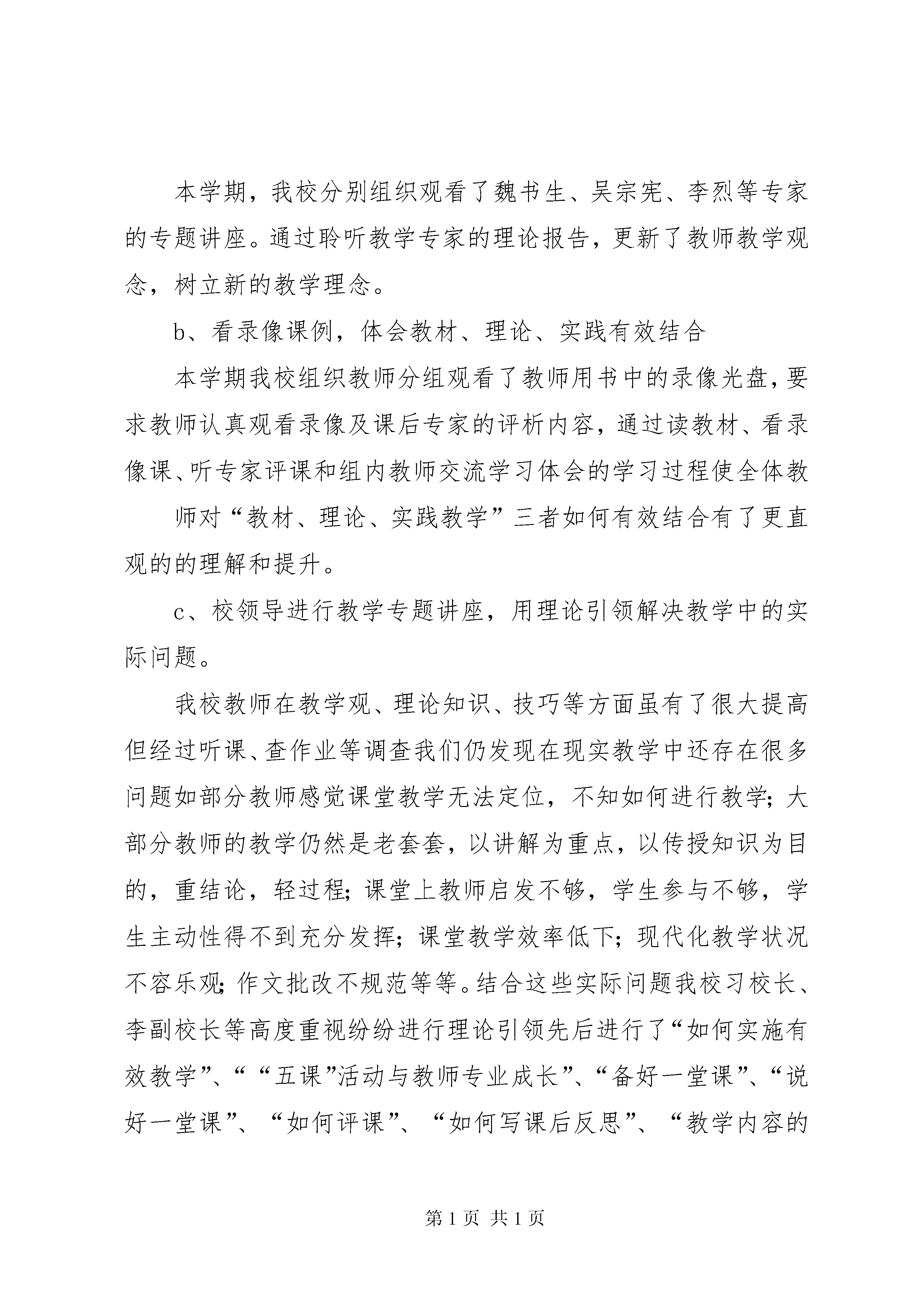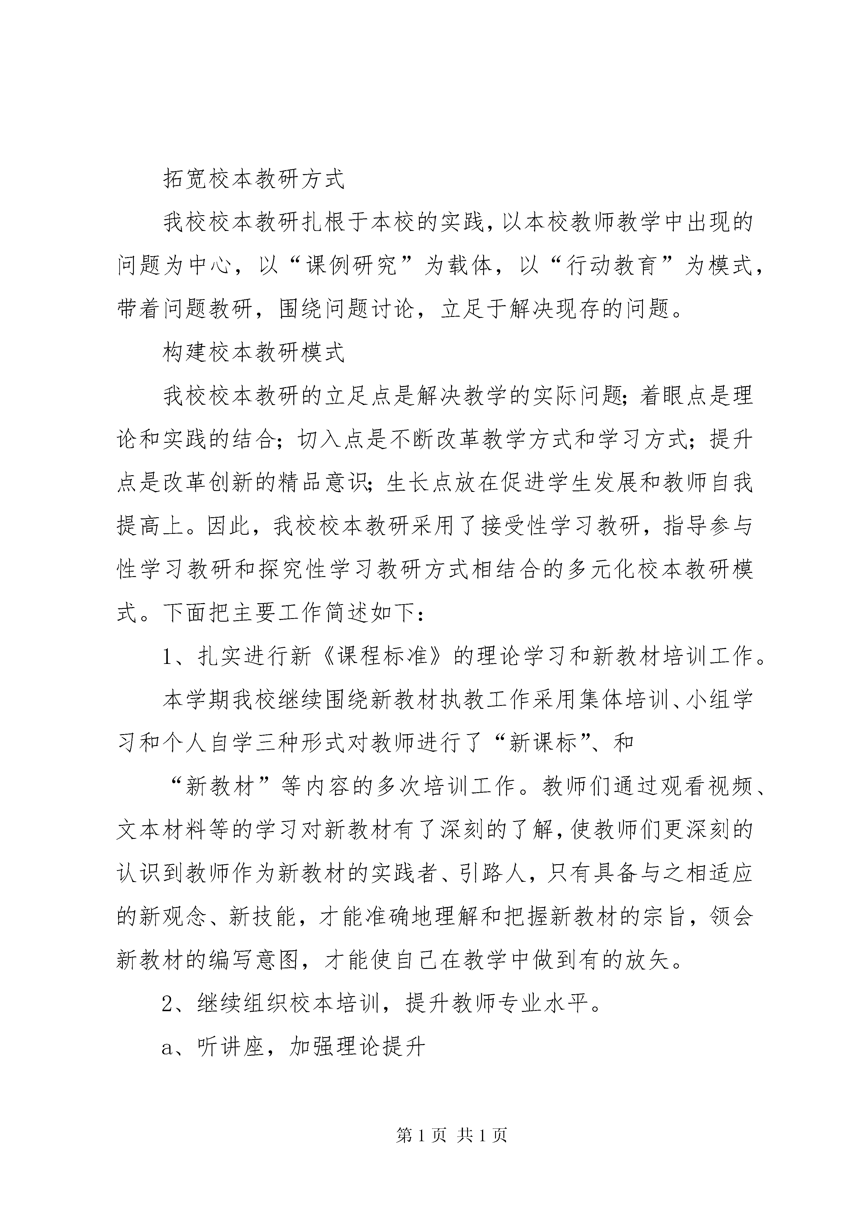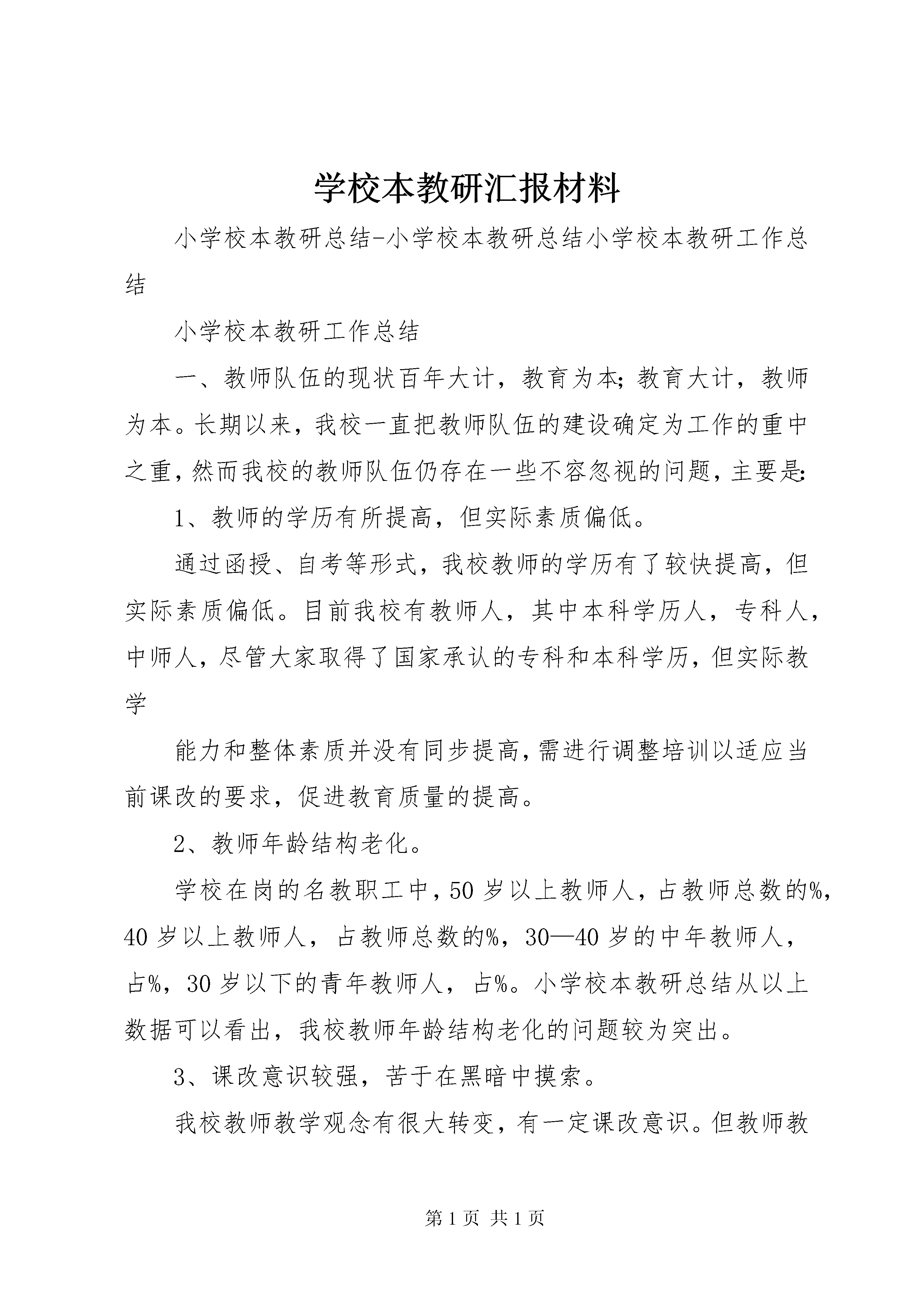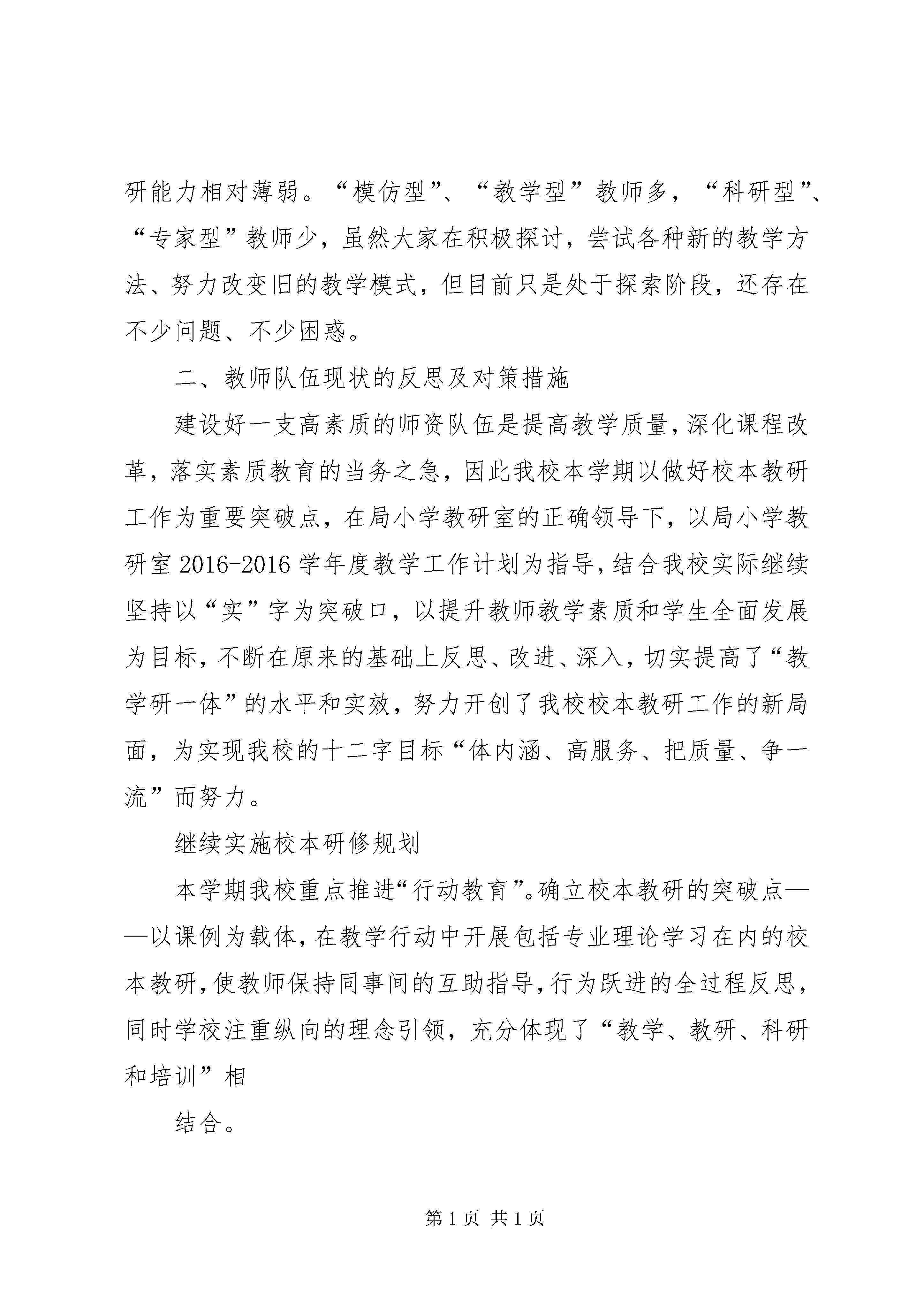 学校本教研汇报材料小学校本教研总结-小学校本教研总结小学校本教研工作总结小学校本教研工作总结一、教师队伍的现状百年大计,教育为本;教育大计,教师为本。长期以来,我校一直把教师队伍的建设确定为工作的重中之重,然而我校的教师队伍仍存在一些不容忽视的问题,主要是:1、教师的学历有所提高,但实际素质偏低。通过函授、自考等形式,我校教师的学历有了较快提高,但实际素质偏低。目前我校有教师人,其中本科学历人,专科人,中师人,尽管大家取得了国家承认的专科和本科学历,但实际教学能力和整体素质并没有同步提高,需进行调整培训以适应当前课改的要求,促进教育质量的提高。2、教师年龄结构老化。学校在岗的名教职工中,50岁以上教师人,占教师总数的%,40岁以上教师人,占教师总数的%,30—40岁的中年教师人,占%,30岁以下的青年教师人,占%。小学校本教研总结从以上数据可以看出,我校教师年龄结构老化的问题较为突出。3、课改意识较强,苦于在黑暗中摸索。我校教师教学观念有很大转变,有一定课改意识。但教师教研能力相对薄弱。“模仿型”、“教学型”教师多,“科研型”、“专家型”教师少,虽然大家在积极探讨,尝试各种新的教学方法、努力改变旧的教学模式,但目前只是处于探索阶段,还存在不少问题、不少困惑。二、教师队伍现状的反思及对策措施建设好一支高素质的师资队伍是提高教学质量,深化课程改革,落实素质教育的当务之急,因此我校本学期以做好校本教研工作为重要突破点,在局小学教研室的正确领导下,以局小学教研室2016-2016学年度教学工作计划为指导,结合我校实际继续坚持以“实”字为突破口,以提升教师教学素质和学生全面发展为目标,不断在原来的基础上反思、改进、深入,切实提高了“教学研一体”的水平和实效,努力开创了我校校本教研工作的新局面,为实现我校的十二字目标“体内涵、高服务、把质量、争一流”而努力。继续实施校本研修规划本学期我校重点推进“行动教育”。确立校本教研的突破点——以课例为载体,在教学行动中开展包括专业理论学习在内的校本教研,使教师保持同事间的互助指导,行为跃进的全过程反思,同时学校注重纵向的理念引领,充分体现了“教学、教研、科研和培训”相结合。拓宽校本教研方式我校校本教研扎根于本校的实践,以本校教师教学中出现的问题为中心,以“课例研究”为载体,以“行动教育”为模式,带着问题教研,围绕问题讨论,立足于解决现存的问题。构建校本教研模式我校校本教研的立足点是解决教学的实际问题;着眼点是理论和实践的结合;切入点是不断改革教学方式和学习方式;提升点是改革创新的精品意识;生长点放在促进学生发展和教师自我提高上。因此,我校校本教研采用了接受性学习教研,指导参与性学习教研和探究性学习教研方式相结合的多元化校本教研模式。下面把主要工作简述如下:1、扎实进行新《课程标准》的理论学习和新教材培训工作。本学期我校继续围绕新教材执教工作采用集体培训、小组学习和个人自学三种形式对教师进行了“新课标”、和“新教材”等内容的多次培训工作。教师们通过观看视频、文本材料等的学习对新教材有了深刻的了解,使教师们更深刻的认识到教师作为新教材的实践者、引路人,只有具备与之相适应的新观念、新技能,才能准确地理解和把握新教材的宗旨,领会新教材的编写意图,才能使自己在教学中做到有的放矢。2、继续组织校本培训,提升教师专业水平。a、听讲座,加强理论提升本学期,我校分别组织观看了魏书生、吴宗宪、李烈等专家的专题讲座。通过聆听教学专家的理论报告,更新了教师教学观念,树立新的教学理念。b、看录像课例,体会教材、理论、实践有效结合本学期我校组织教师分组观看了教师用书中的录像光盘,要求教师认真观看录像及课后专家的评析内容,通过读教材、看录像课、听专家评课和组内教师交流学习体会的学习过程使全体教师对“教材、理论、实践教学”三者如何有效结合有了更直观的的理解和提升。c、校领导进行教学专题讲座,用理论引领解决教学中的实际问题。我校教师在教学观、理论知识、技巧等方面虽有了很大提高但经过听课、查作业等调查我们仍发现在现实教学中还存在很多问题如部分教师感觉课堂教学无法定位,不知如何进行教学;大部分教师的教学仍然是老套套,以讲解为重点,以传授知识为目的,重结论,轻过程;课堂上教师启发不够,学生参与不够,学生主动性得不到充分发挥;课堂教学效率低下;现代化教学状况不容乐观;作文批改不规范等等。结合这些实际问题我校习校长、李副校长等高度重视纷纷进行理论引领先后进行了“如何实施有效教学”、““五课”活动与教师专业成长”、“备好一堂课”、“说好一堂课”、“如何评课”、“如何写课后反思”、“教学内容的最佳呈现,需要教师读活教材”等专题讲座为教师解疑答惑收到了较好的效果。