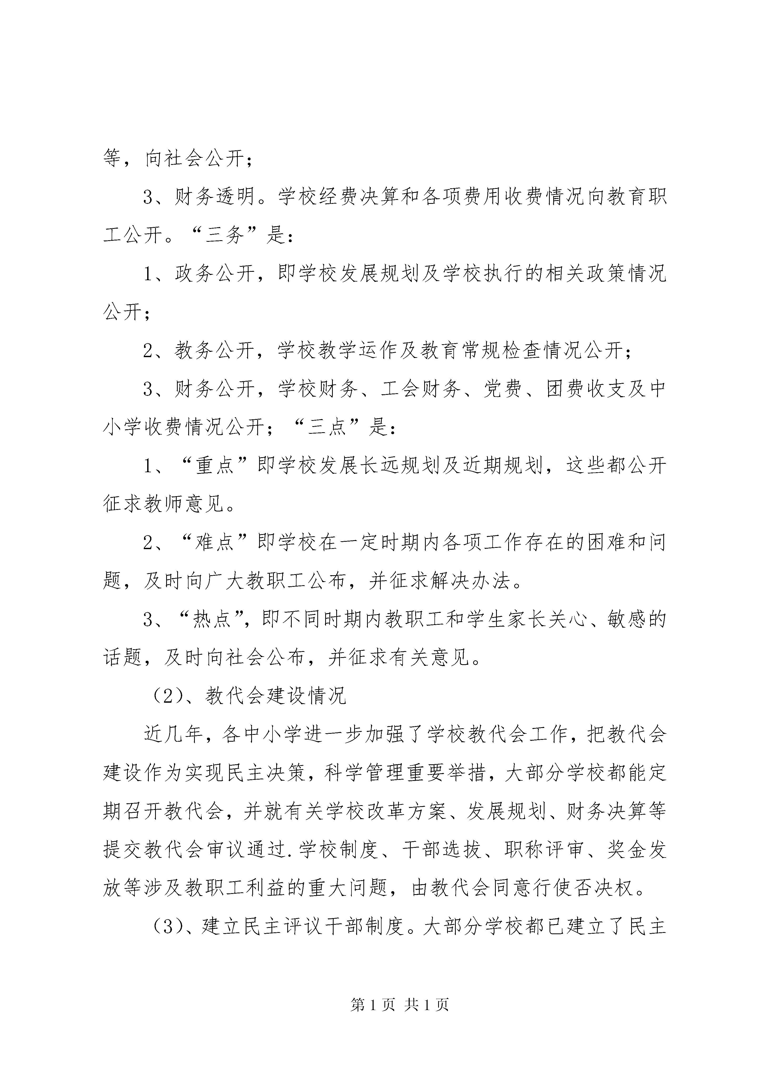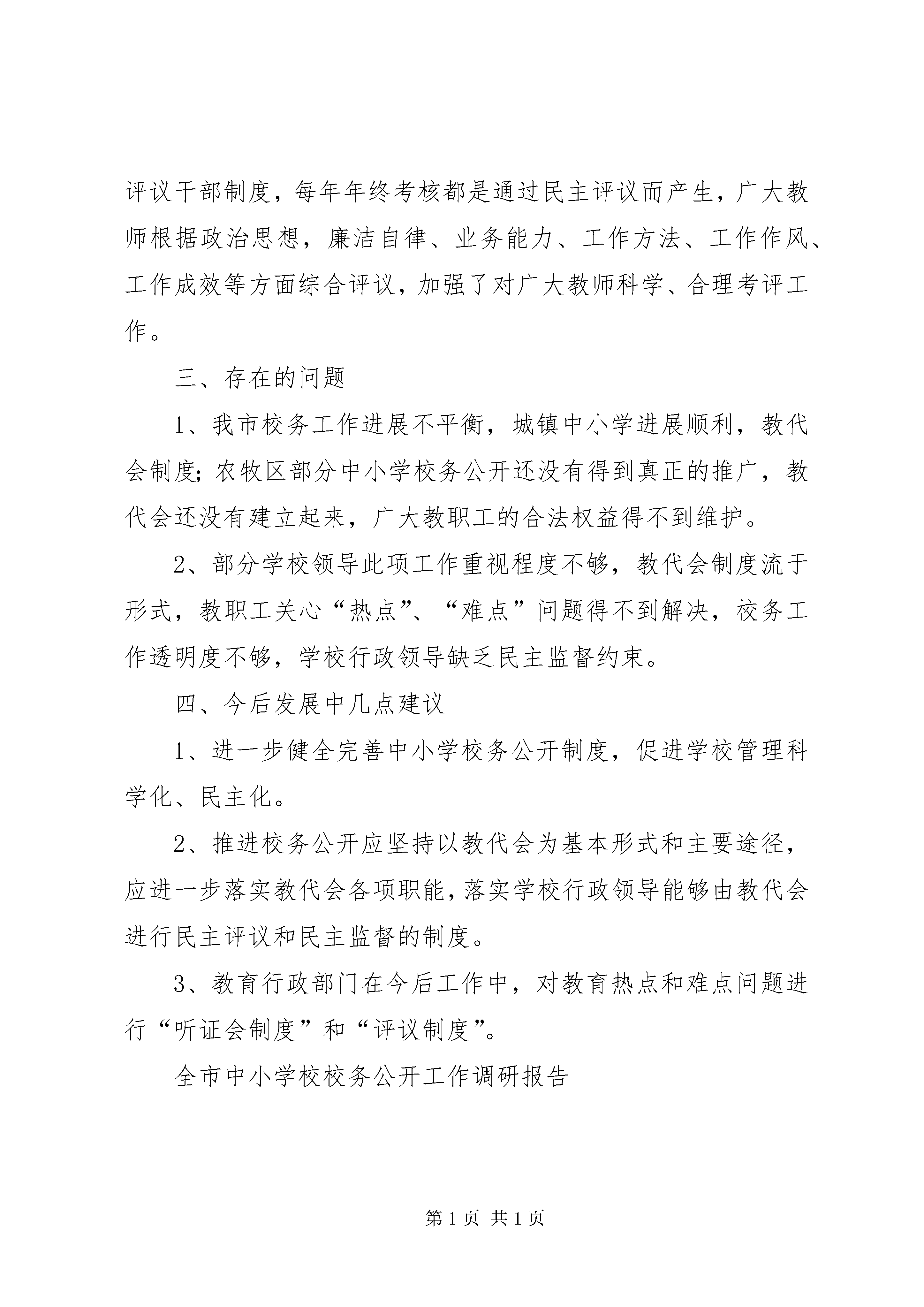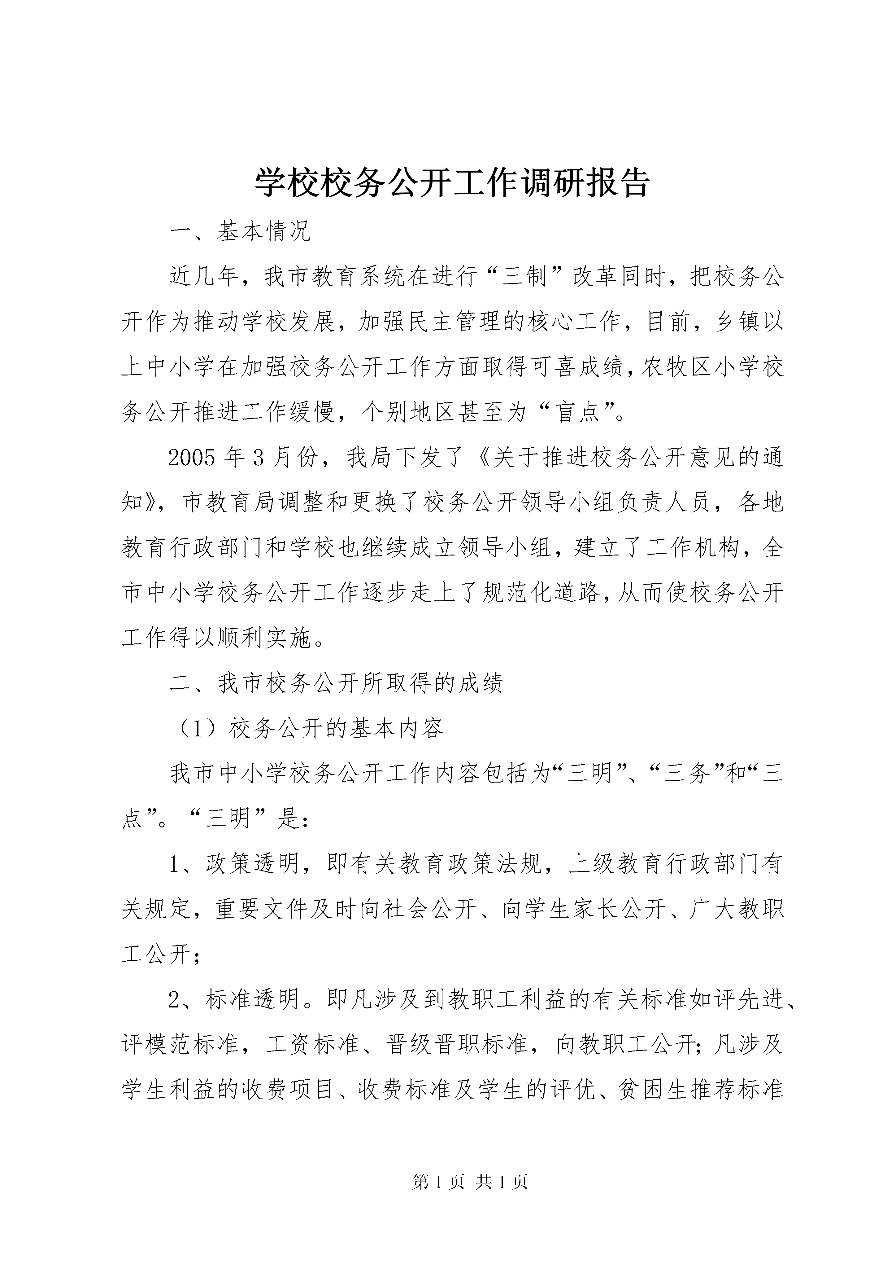 学校校务公开工作调研报告一、基本情况近几年,我市教育系统在进行“三制”改革同时,把校务公开作为推动学校发展,加强民主管理的核心工作,目前,乡镇以上中小学在加强校务公开工作方面取得可喜成绩,农牧区小学校务公开推进工作缓慢,个别地区甚至为“盲点”。2005年3月份,我局下发了《关于推进校务公开意见的通知》,市教育局调整和更换了校务公开领导小组负责人员,各地教育行政部门和学校也继续成立领导小组,建立了工作机构,全市中小学校务公开工作逐步走上了规范化道路,从而使校务公开工作得以顺利实施。二、我市校务公开所取得的成绩(1)校务公开的基本内容我市中小学校务公开工作内容包括为“三明”、“三务”和“三点”。“三明”是:1、政策透明,即有关教育政策法规,上级教育行政部门有关规定,重要文件及时向社会公开、向学生家长公开、广大教职工公开;2、标准透明。即凡涉及到教职工利益的有关标准如评先进、评模范标准,工资标准、晋级晋职标准,向教职工公开;凡涉及学生利益的收费项目、收费标准及学生的评优、贫困生推荐标准等,向社会公开;3、财务透明。学校经费决算和各项费用收费情况向教育职工公开。“三务”是:1、政务公开,即学校发展规划及学校执行的相关政策情况公开;2、教务公开,学校教学运作及教育常规检查情况公开;3、财务公开,学校财务、工会财务、党费、团费收支及中小学收费情况公开;“三点”是:1、“重点”即学校发展长远规划及近期规划,这些都公开征求教师意见。2、“难点”即学校在一定时期内各项工作存在的困难和问题,及时向广大教职工公布,并征求解决办法。3、“热点”,即不同时期内教职工和学生家长关心、敏感的话题,及时向社会公布,并征求有关意见。(2)、教代会建设情况近几年,各中小学进一步加强了学校教代会工作,把教代会建设作为实现民主决策,科学管理重要举措,大部分学校都能定期召开教代会,并就有关学校改革方案、发展规划、财务决算等提交教代会审议通过.学校制度、干部选拔、职称评审、奖金发放等涉及教职工利益的重大问题,由教代会同意行使否决权。(3)、建立民主评议干部制度。大部分学校都已建立了民主评议干部制度,每年年终考核都是通过民主评议而产生,广大教师根据政治思想,廉洁自律、业务能力、工作方法、工作作风、工作成效等方面综合评议,加强了对广大教师科学、合理考评工作。三、存在的问题1、我市校务工作进展不平衡,城镇中小学进展顺利,教代会制度;农牧区部分中小学校务公开还没有得到真正的推广,教代会还没有建立起来,广大教职工的合法权益得不到维护。2、部分学校领导此项工作重视程度不够,教代会制度流于形式,教职工关心“热点”、“难点”问题得不到解决,校务工作透明度不够,学校行政领导缺乏民主监督约束。四、今后发展中几点建议1、进一步健全完善中小学校务公开制度,促进学校管理科学化、民主化。2、推进校务公开应坚持以教代会为基本形式和主要途径,应进一步落实教代会各项职能,落实学校行政领导能够由教代会进行民主评议和民主监督的制度。3、教育行政部门在今后工作中,对教育热点和难点问题进行“听证会制度”和“评议制度”。全市中小学校校务公开工作调研报告