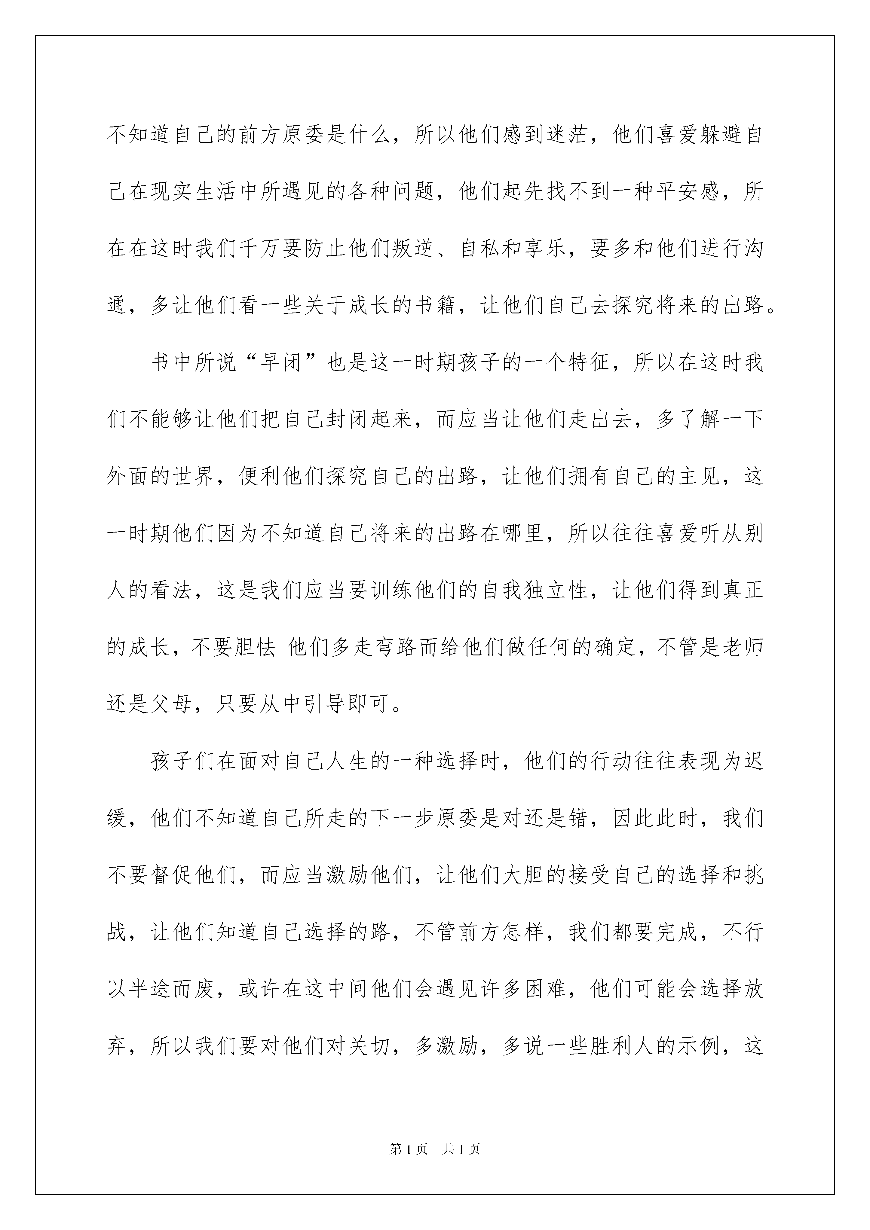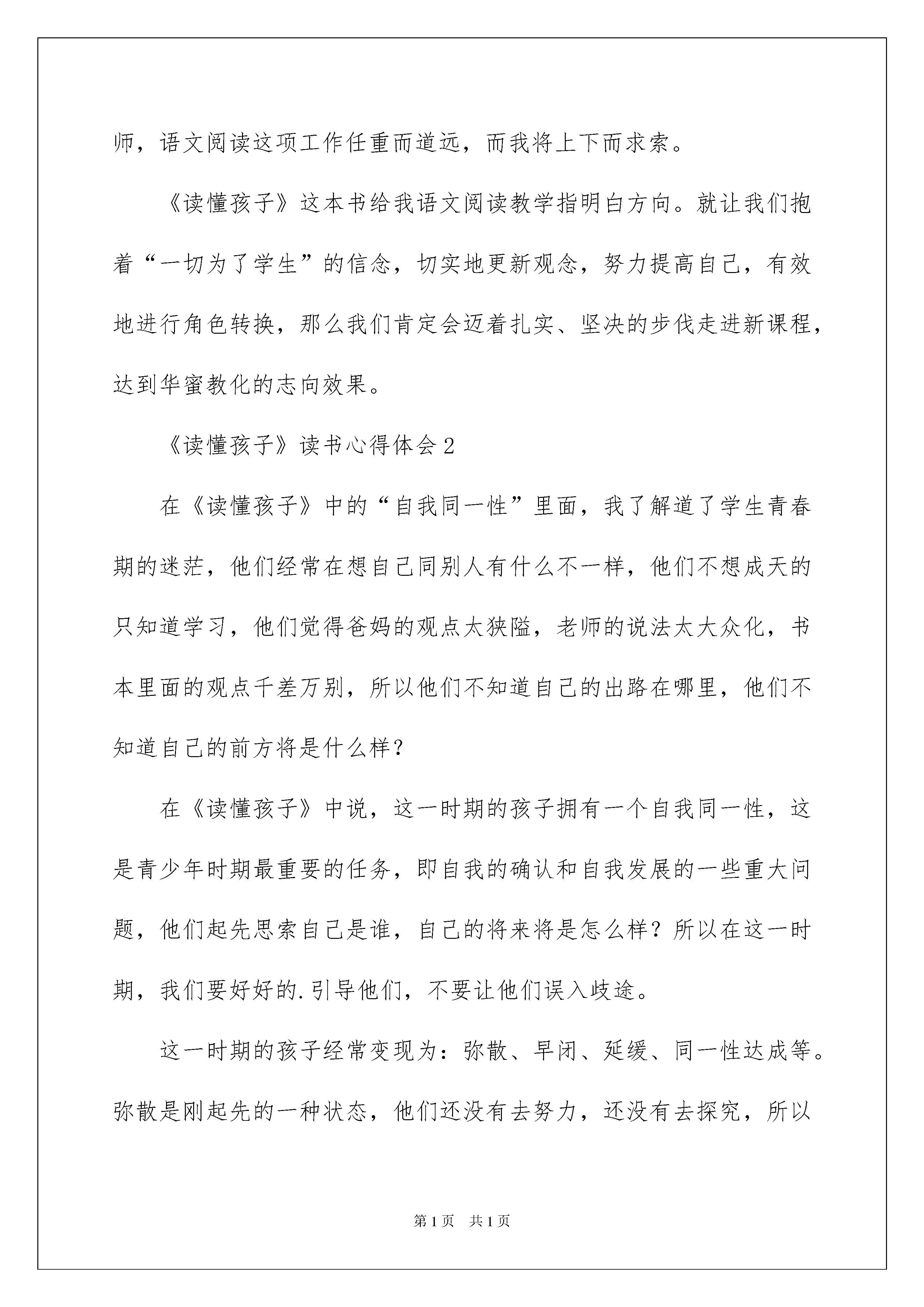 2022《读懂孩子》读书心得体会《读懂孩子》读书心得体会阅读是课内阅读的补充和延长,是提高学生阅读实力,形成良好阅读习惯的重要措施之一,也是提高人文素养的重要途径。以下是我整理的《读懂孩子》读书心得体会,欢迎大家参考!《读懂孩子》读书心得体会1《读懂孩子》这本书对我的教化教学工作起到了很好的指导和借鉴作用。作为一名语文老师,当我看到书中对语文阅读提出的种种方法及途径时,使我忽然大悟,为自己的教学指明白方向。阅读是人类获得学问、相识世界、发展思维、获得审美体验等方面特别重要的手段。而小学阶段是培育孩子阅读实力、阅读习惯的重要阶段。孩子的阅读水平预示着他们将来具备公民素养的凹凸,预示着将来国家竞争力的凹凸。因此不但家长须要在家庭教化中发挥重要作用,作为一名小学语文老师肩上的担子更是很重,日常教学中要重视培育孩子的阅读实力,保证孩子的阅读量和阅读面。中书提到孩子的成长规律和哺育策略,提到阅读实力的发展对其他方面实力的发展有重要影响。我们班中就有这样一种现象,阅读实力差的学生往往数学的算术应用题相对较弱,因为阅读实力会影响孩子对题目的理解与分析。从最近几年的中高考考题中也折射出这样一种现象:语文成为众科之王,全部科目都将增大阅读的重量。从小培育孩子的阅读习惯,争取在小学中年级让孩子养成良好的阅读习惯,包括阅读看法、阅读方法、阅读姿态。阅读过后培育学生养成思索,积累的习惯。作为语文老师可以一起和孩子商议制定每月、每季的阅读安排,并制定一张简洁的“阅读完成表”。引导孩子做好读书笔记,笔记不在多,贵在有感而发,这种批注的习惯对语文学习至关重要。每周进行好词好句的积累,只有大脑进行充分的输入,当孩子写作时才能够有肯定量的输出。班中有这样一名女生,平常的语文成果比不是很突出,但是酷爱读书而且积累了一本本的好词好句,每到期末考试中总是会给老师一个惊喜。因为随着年级的上升,对于基础学问的考察比重下降,而阅读理解、习作成了重点。中年级学生已经具备自己阅读的实力,作为老师除了要培育学生的阅读爱好,还有在书籍的类型上为学生把好关。作为一名语文老师,语文阅读这项工作任重而道远,而我将上下而求索。《读懂孩子》这本书给我语文阅读教学指明白方向。就让我们抱着“一切为了学生”的信念,切实地更新观念,努力提高自己,有效地进行角色转换,那么我们肯定会迈着扎实、坚决的步伐走进新课程,达到华蜜教化的志向效果。《读懂孩子》读书心得体会2在《读懂孩子》中的“自我同一性”里面,我了解道了学生青春期的迷茫,他们经常在想自己同别人有什么不一样,他们不想成天的只知道学习,他们觉得爸妈的观点太狭隘,老师的说法太大众化,书本里面的观点千差万别,所以他们不知道自己的出路在哪里,他们不知道自己的前方将是什么样?在《读懂孩子》中说,这一时期的孩子拥有一个自我同一性,这是青少年时期最重要的任务,即自我的确认和自我发展的一些重大问题,他们起先思索自己是谁,自己的将来将是怎么样?所以在这一时期,我们要好好的.引导他们,不要让他们误入歧途。这一时期的孩子经常变现为:弥散、早闭、延缓、同一性达成等。弥散是刚起先的一种状态,他们还没有去努力,还没有去探究,所以不知道自己的前方原委是什么,所以他们感到迷茫,他们喜爱躲避自己在现实生活中所遇见的各种问题,他们起先找不到一种平安感,所在在这时我们千万要防止他们叛逆、自私和享乐,要多和他们进行沟通,多让他们看一些关于成长的书籍,让他们自己去探究将来的出路。书中所说“早闭”也是这一时期孩子的一个特征,所以在这时我们不能够让他们把自己封闭起来,而应当让他们走出去,多了解一下外面的世界,便利他们探究自己的出路,让他们拥有自己的主见,这一时期他们因为不知道自己将来的出路在哪里,所以往往喜爱听从别人的看法,这是我们应当要训练他们的自我独立性,让他们得到真正的成长,不要胆怯他们多走弯路而给他们做任何的确定,不管是老师还是父母,只要从中引导即可。孩子们在面对自己人生的一种选择时,他们的行动往往表现为迟缓,他们不知道自己所走的下一步原委是对还是错,因此此时,我们不要督促他们,而应当激励他们,让他们大胆的接受自己的选择和挑战,让他们知道自己选择的路,不管前方怎样,我们都要完成,不行以半途而废,或许在这中间他们会遇见许多困难,他们可能会选择放弃,所以我们要对他们对关切,多激励,多说一些胜利人的示例,这一阶段过后,孩子们都会有自己的一个选择,这时候统一性达成,他们就会对生活和学习充溢热忱,他们也知道了自己将来的路该怎么走,该怎么努力。所以,不管在孩子的那一个阶段,我们都要培育孩子的自我独立性,不要胆怯他们受到任何的困难和打击,我们