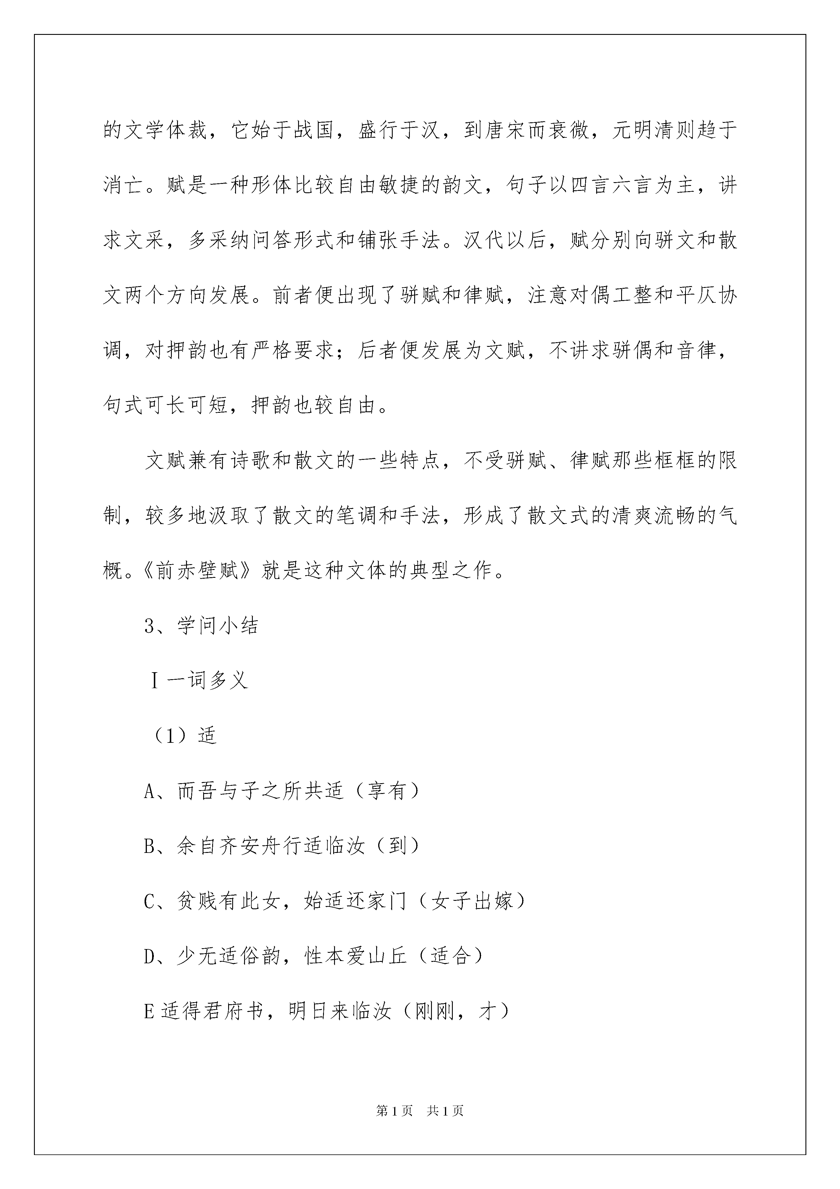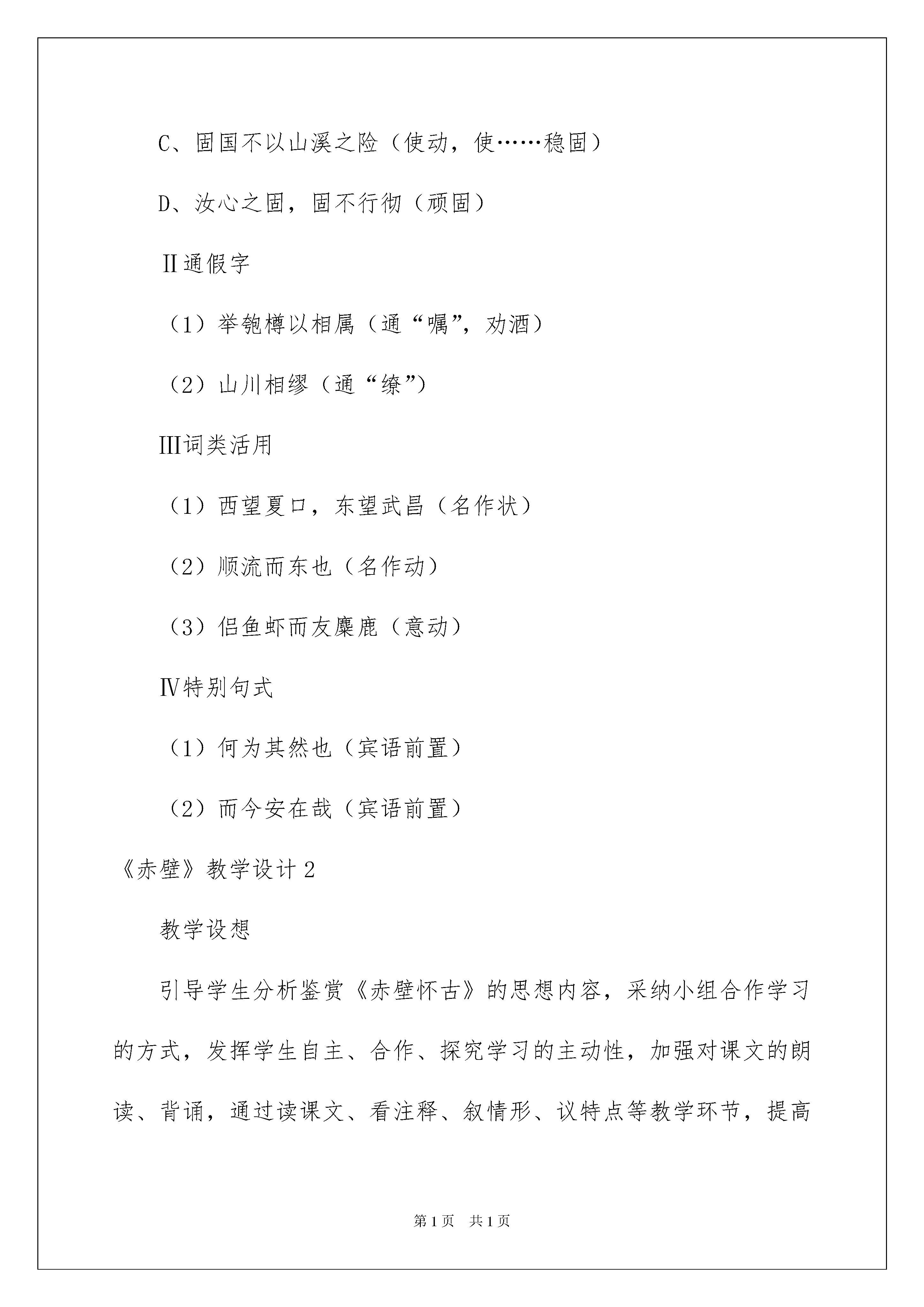 2022《赤壁》教学设计《赤壁》教学设计作为一位杰出的教职工,经常要依据教学须要编写教学设计,借助教学设计可以更大幅度地提高学生各方面的实力,从而使学生获得良好的发展。那么写教学设计须要留意哪些问题呢?下面是我收集整理的《赤壁》教学设计,仅供参考,欢迎大家阅读。《赤壁》教学设计1一、教学目标1、驾驭本文景、情、理相互交融的艺术特色。2、了解文中苏轼情感改变的过程。体会苏轼由乐转悲再转喜的情感历程。3、感受苏轼乐观旷达的情怀;感悟文中蕴含的人生哲理。二、教学重点难点1、理清本文的情感线索。2、感悟文中蕴含的人生哲理。三、教学课时3课时(本教案是第2、第3课时)四、教学手段课前印发相关写作背景资料及余秋雨散文《东坡突围》。五、教学过程(第一课时要求学生借助工具书和书下注释,以自学、探讨为主,老师适时点拨,翻译全文,疏通文意。反复实行自读、齐读等读法,使学生感受赋的音乐美。留意朗读指导。)附录:1、绝命诗《狱中寄弟子由》其一:圣主如天万物春,小臣愚暗自亡身。百年未满先偿债,千口无归更累人。是处青山可藏骨,他年夜雨独伤神。与君今世为兄弟,更结来生未了因。《狱中寄弟子由》其二:柏台霜气夜凄凄,风动琅珰月向低。梦绕云山心似鹿,魂飞汤火命如鸡。额中犀角真君子,身后牛衣愧老妻。百岁神游定何处?桐乡应在浙江西。2、学问小结:关于散文赋散文赋也叫文赋,是中唐以后出现的一种文体。赋本是汉代流行的文学体裁,它始于战国,盛行于汉,到唐宋而衰微,元明清则趋于消亡。赋是一种形体比较自由敏捷的韵文,句子以四言六言为主,讲求文采,多采纳问答形式和铺张手法。汉代以后,赋分别向骈文和散文两个方向发展。前者便出现了骈赋和律赋,注意对偶工整和平仄协调,对押韵也有严格要求;后者便发展为文赋,不讲求骈偶和音律,句式可长可短,押韵也较自由。文赋兼有诗歌和散文的一些特点,不受骈赋、律赋那些框框的限制,较多地汲取了散文的笔调和手法,形成了散文式的清爽流畅的气概。《前赤壁赋》就是这种文体的典型之作。3、学问小结Ⅰ一词多义(1)适A、而吾与子之所共适(享有)B、余自齐安舟行适临汝(到)C、贫贱有此女,始适还家门(女子出嫁)D、少无适俗韵,性本爱山丘(适合)E适得君府书,明日来临汝(刚刚,才)F适大病,不能行(适逢)(2)逝A、逝者如斯,而未尝为也(消逝)B、逝将去女,适彼乐土(通“誓”,发誓)C、淑尔远逝,往来翕忽(去,消逝)D、时不利兮骓不逝(跑)(3)曾A、天地曾不能以一瞬(副词,用来加强语气,常与“不”连用,译为“连……都……”)B、曾不知老之将近(副词,用来加强语气,常与“不”连用,译为“连……都……”)(4)虽A、虽一毫而莫取(即使)B、虽无丝竹管弦之盛(虽然)(5)固A、固一世之雄也(原来)B、雍州之地,殽函之固,自若也(险固)C、固国不以山溪之险(使动,使……稳固)D、汝心之固,固不行彻(顽固)Ⅱ通假字(1)举匏樽以相属(通“嘱”,劝酒)(2)山川相缪(通“缭”)Ⅲ词类活用(1)西望夏口,东望武昌(名作状)(2)顺流而东也(名作动)(3)侣鱼虾而友麋鹿(意动)Ⅳ特别句式(1)何为其然也(宾语前置)(2)而今安在哉(宾语前置)《赤壁》教学设计2教学设想引导学生分析鉴赏《赤壁怀古》的思想内容,采纳小组合作学习的方式,发挥学生自主、合作、探究学习的主动性,加强对课文的朗读、背诵,通过读课文、看注释、叙情形、议特点等教学环节,提高学生对宋词的阅读鉴赏实力教学目标学问目标:了解苏轼的创作风格及豪放词的特点实力目标:(1)抓关键语句,提高学生鉴赏和评价的表达实力(2)学习本文写景、咏史、抒情相结合的特点(3)在理解词的内容的基础上诵读和背诵情感目标:引导学生领悟作者在词中寄予的情感,感悟词人丰富的内心世界审美目标:领悟、感受到苏词豪放旷达的特点并作出简评教学重点理解《赤壁怀古》的思想内容教学难点作为豪放派代表词人,苏轼在写作上有什么特色?怎样理解《念奴娇赤壁怀古》的艺术特色?教学内容与过程一、导入新课三国是个英雄辈出、充溢魅力的时代,其中赤壁之战奠定了三分天下的局势,而且是中国历史上闻名的一次以少胜多的战役时间虽然过去了近1800年,但是每一位为赤壁之战所激烈的人,一旦来到赤壁,当年火光冲天、到处喊杀声的情形仿佛又萦绕于脑海赤壁之战八百年后,一位宏大的文坛泰斗来到赤壁,写下了一篇和赤壁之战一样流传千古的宏大词作——《念奴娇赤壁怀古》这位宏大人物就是苏轼《念奴娇赤壁怀古》历来被称为宋词豪放派的代表作,是苏轼被贬到湖北黄州期间所写,表达了词人对古代英雄的赞美和壮志未酬的感慨古代诗歌的学习,关键在于品尝出诗歌之美最根本的方法是读正