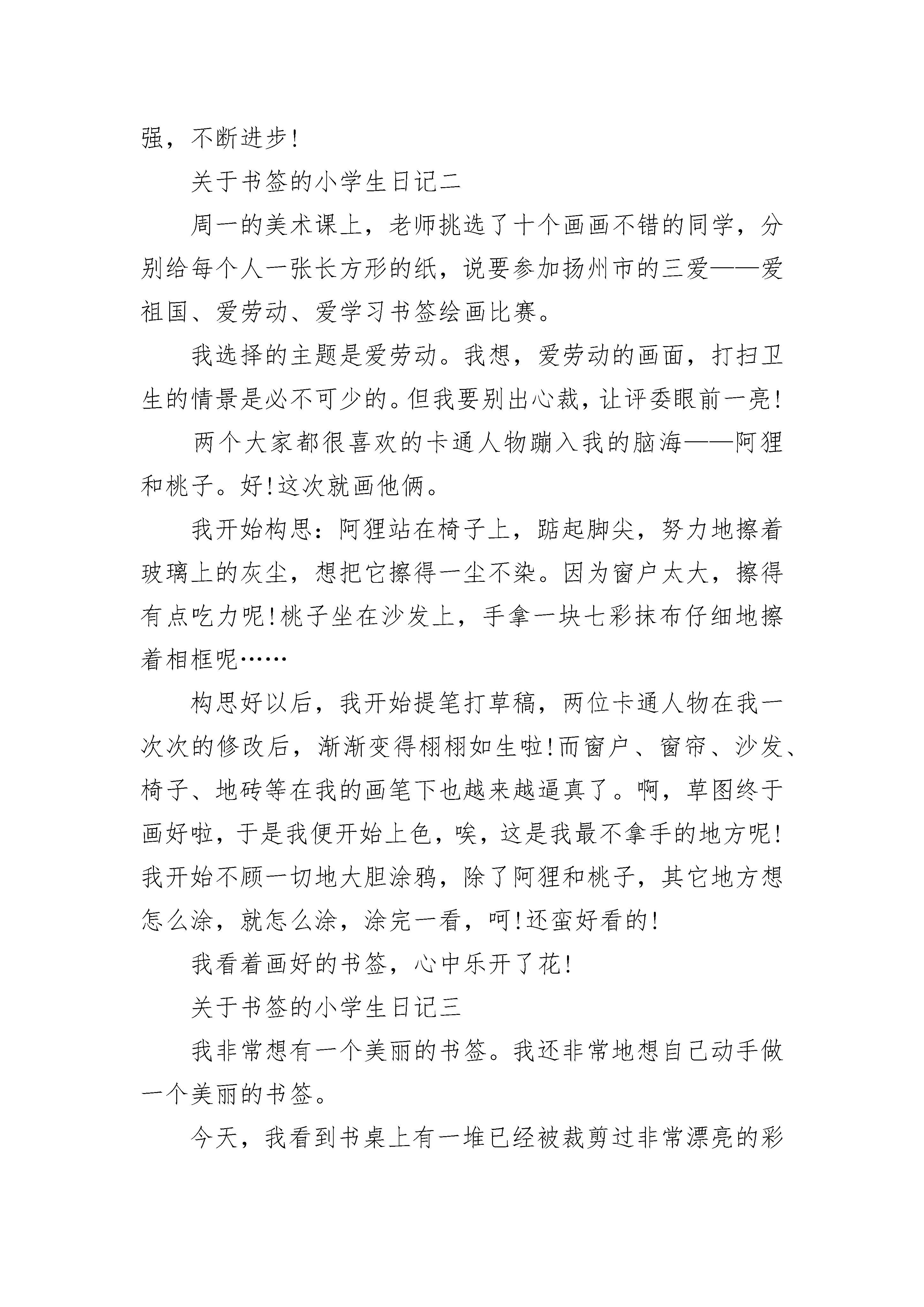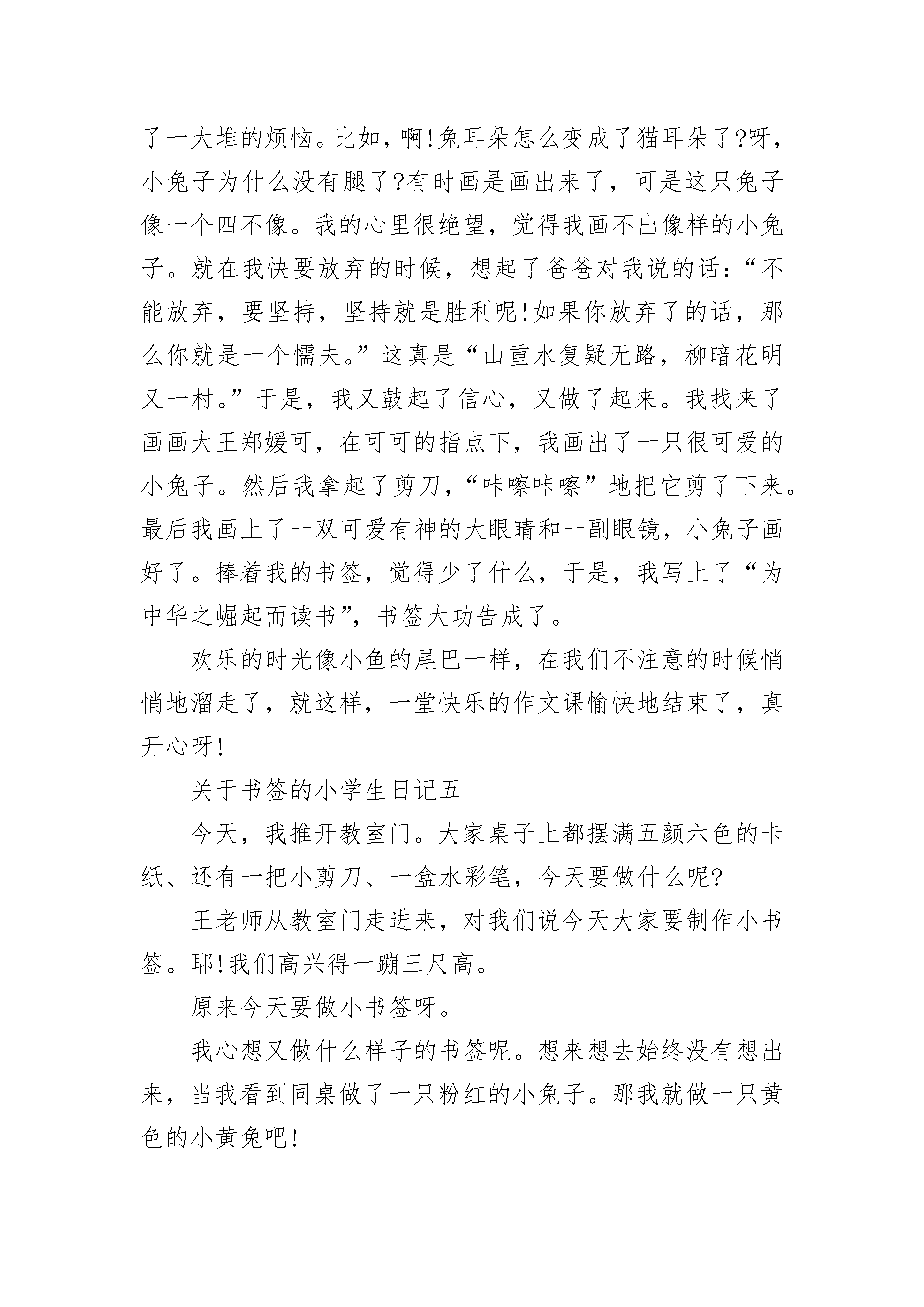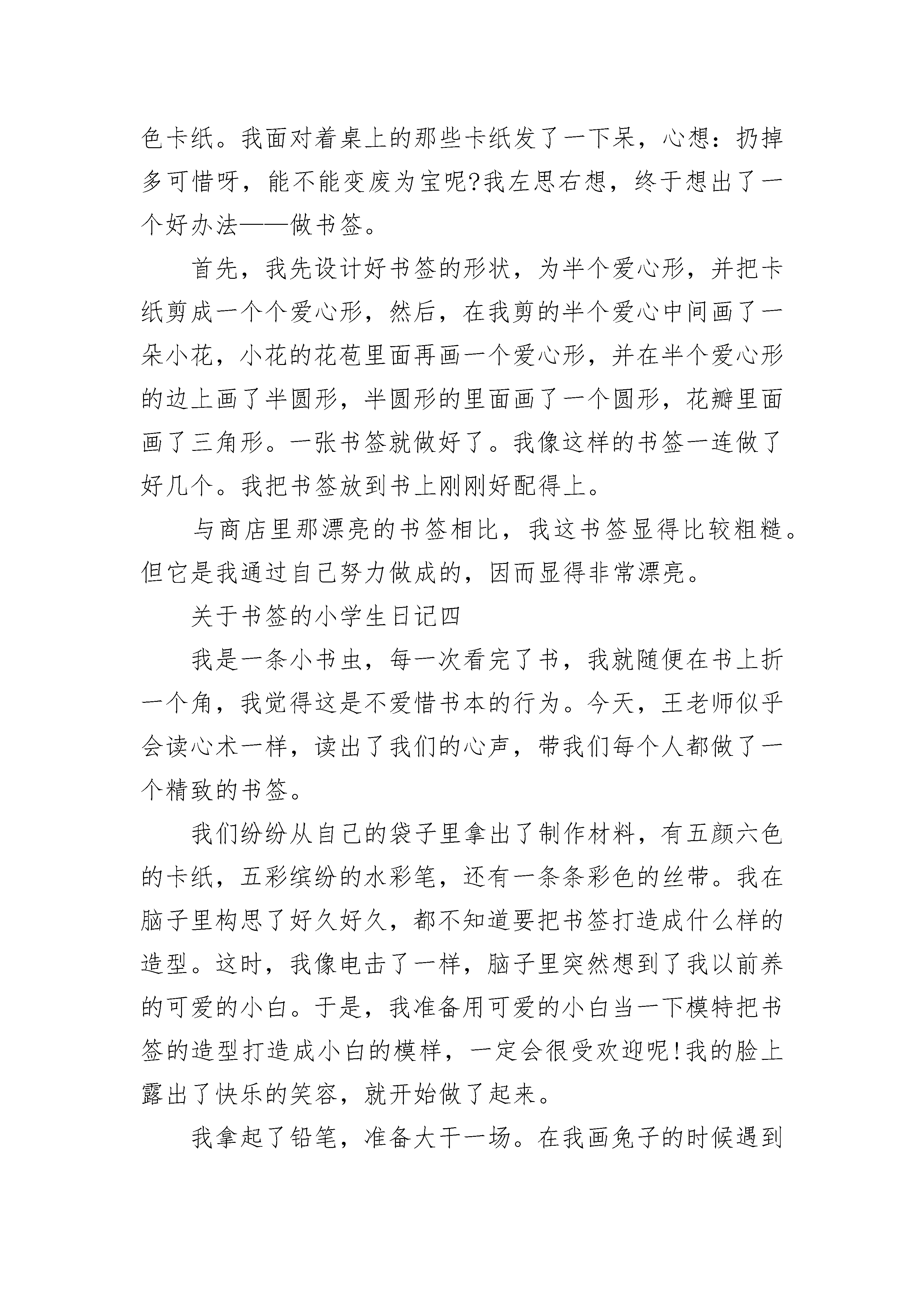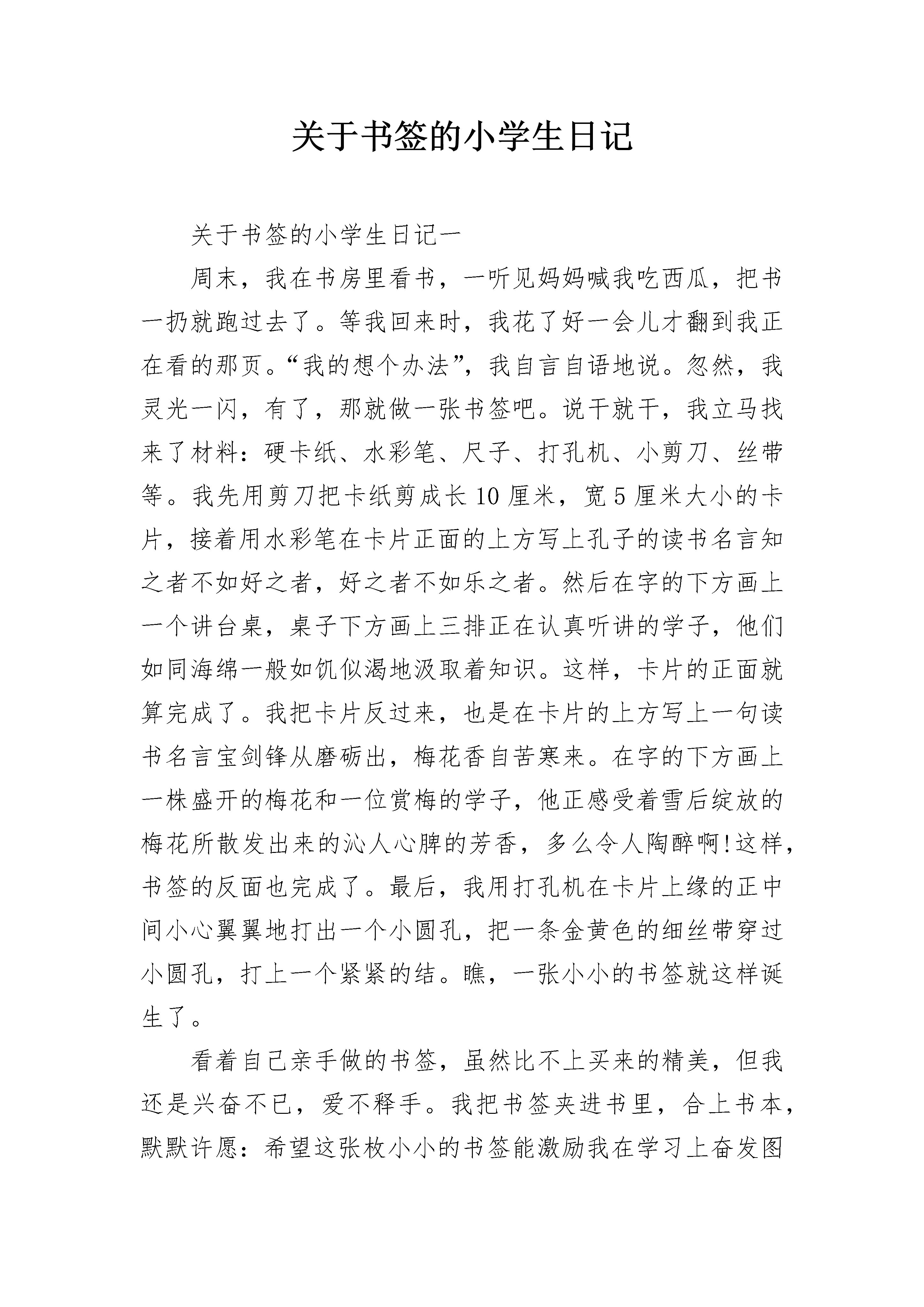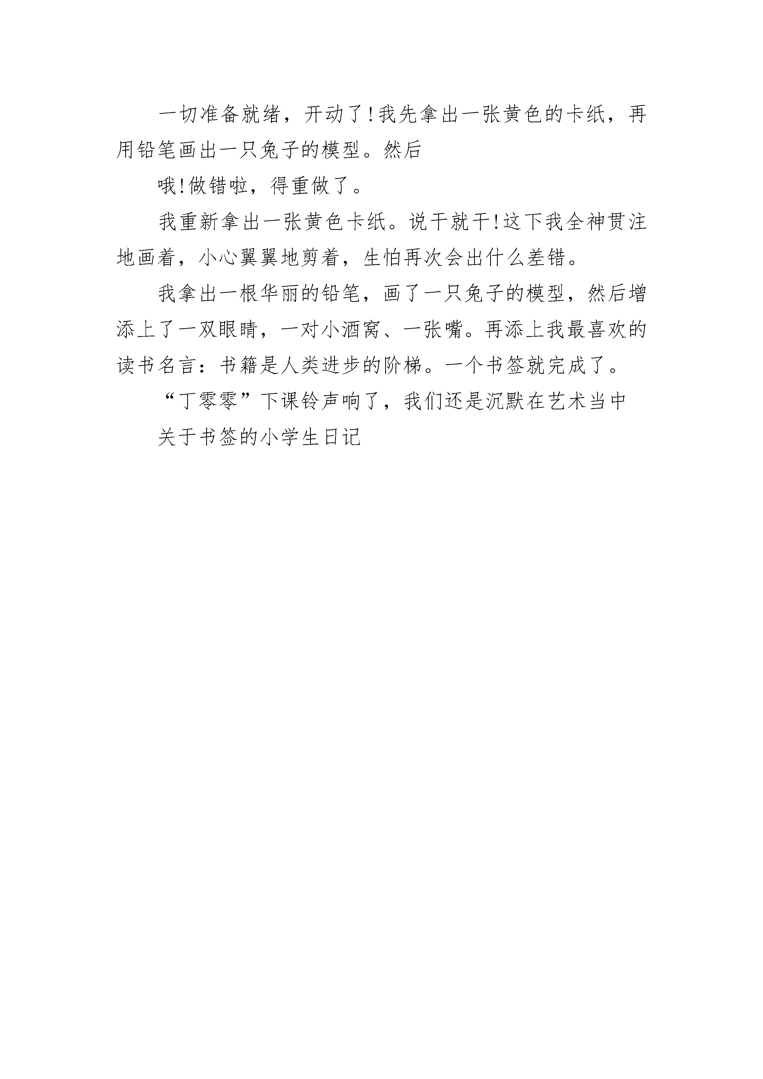关于书签的小学生日记关于书签的小学生日记一周末,我在书房里看书,一听见妈妈喊我吃西瓜,把书一扔就跑过去了。等我回来时,我花了好一会儿才翻到我正在看的那页。“我的想个办法”,我自言自语地说。忽然,我灵光一闪,有了,那就做一张书签吧。说干就干,我立马找来了材料:硬卡纸、水彩笔、尺子、打孔机、小剪刀、丝带等。我先用剪刀把卡纸剪成长10厘米,宽5厘米大小的卡片,接着用水彩笔在卡片正面的上方写上孔子的读书名言知之者不如好之者,好之者不如乐之者。然后在字的下方画上一个讲台桌,桌子下方画上三排正在认真听讲的学子,他们如同海绵一般如饥似渴地汲取着知识。这样,卡片的正面就算完成了。我把卡片反过来,也是在卡片的上方写上一句读书名言宝剑锋从磨砺出,梅花香自苦寒来。在字的下方画上一株盛开的梅花和一位赏梅的学子,他正感受着雪后绽放的梅花所散发出来的沁人心脾的芳香,多么令人陶醉啊!这样,书签的反面也完成了。最后,我用打孔机在卡片上缘的正中间小心翼翼地打出一个小圆孔,把一条金黄色的细丝带穿过小圆孔,打上一个紧紧的结。瞧,一张小小的书签就这样诞生了。看着自己亲手做的书签,虽然比不上买来的精美,但我还是兴奋不已,爱不释手。我把书签夹进书里,合上书本,默默许愿:希望这张枚小小的书签能激励我在学习上奋发图强,不断进步!关于书签的小学生日记二周一的美术课上,老师挑选了十个画画不错的同学,分别给每个人一张长方形的纸,说要参加扬州市的三爱——爱祖国、爱劳动、爱学习书签绘画比赛。我选择的主题是爱劳动。我想,爱劳动的画面,打扫卫生的情景是必不可少的。但我要别出心裁,让评委眼前一亮!两个大家都很喜欢的卡通人物蹦入我的脑海——阿狸和桃子。好!这次就画他俩。我开始构思:阿狸站在椅子上,踮起脚尖,努力地擦着玻璃上的灰尘,想把它擦得一尘不染。因为窗户太大,擦得有点吃力呢!桃子坐在沙发上,手拿一块七彩抹布仔细地擦着相框呢……构思好以后,我开始提笔打草稿,两位卡通人物在我一次次的修改后,渐渐变得栩栩如生啦!而窗户、窗帘、沙发、椅子、地砖等在我的画笔下也越来越逼真了。啊,草图终于画好啦,于是我便开始上色,唉,这是我最不拿手的地方呢!我开始不顾一切地大胆涂鸦,除了阿狸和桃子,其它地方想怎么涂,就怎么涂,涂完一看,呵!还蛮好看的!我看着画好的书签,心中乐开了花!关于书签的小学生日记三我非常想有一个美丽的书签。我还非常地想自己动手做一个美丽的书签。今天,我看到书桌上有一堆已经被裁剪过非常漂亮的彩色卡纸。我面对着桌上的那些卡纸发了一下呆,心想:扔掉多可惜呀,能不能变废为宝呢?我左思右想,终于想出了一个好办法——做书签。首先,我先设计好书签的形状,为半个爱心形,并把卡纸剪成一个个爱心形,然后,在我剪的半个爱心中间画了一朵小花,小花的花苞里面再画一个爱心形,并在半个爱心形的边上画了半圆形,半圆形的里面画了一个圆形,花瓣里面画了三角形。一张书签就做好了。我像这样的书签一连做了好几个。我把书签放到书上刚刚好配得上。与商店里那漂亮的书签相比,我这书签显得比较粗糙。但它是我通过自己努力做成的,因而显得非常漂亮。关于书签的小学生日记四我是一条小书虫,每一次看完了书,我就随便在书上折一个角,我觉得这是不爱惜书本的行为。今天,王老师似乎会读心术一样,读出了我们的心声,带我们每个人都做了一个精致的书签。我们纷纷从自己的袋子里拿出了制作材料,有五颜六色的卡纸,五彩缤纷的水彩笔,还有一条条彩色的丝带。我在脑子里构思了好久好久,都不知道要把书签打造成什么样的造型。这时,我像电击了一样,脑子里突然想到了我以前养的可爱的小白。于是,我准备用可爱的小白当一下模特把书签的造型打造成小白的模样,一定会很受欢迎呢!我的脸上露出了快乐的笑容,就开始做了起来。我拿起了铅笔,准备大干一场。在我画兔子的时候遇到了一大堆的烦恼。比如,啊!兔耳朵怎么变成了猫耳朵了?呀,小兔子为什么没有腿了?有时画是画出来了,可是这只兔子像一个四不像。我的心里很绝望,觉得我画不出像样的小兔子。就在我快要放弃的时候,想起了爸爸对我说的话:“不能放弃,要坚持,坚持就是胜利呢!如果你放弃了的话,那么你就是一个懦夫。”这真是“山重水复疑无路,柳暗花明又一村。”于是,我又鼓起了信心,又做了起来。我找来了画画大王郑媛可,在可可的指点下,我画出了一只很可爱的小兔子。然后我拿起了剪刀,“咔嚓咔嚓”地把它剪了下来。最后我画上了一双可爱有神的大眼睛和一副眼镜,小兔子画好了。捧着我的书签,觉得少了什么,于是,我写上了“为中华之崛起而读书”,书签大功告成了。欢乐的时光像小鱼的尾巴一样,在我们不注意的时候悄悄地溜走了,就这样,一堂快乐的作文课愉快地结束了,真开心呀!关于书签的小学生日记五今天,我推开教室门。大家桌子上都摆满五颜六色的卡纸、还有一把小剪刀、一盒水彩笔,今天要做什么呢?王老