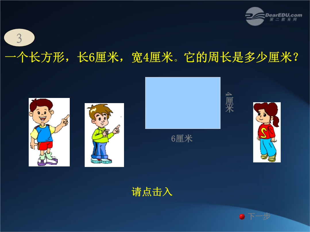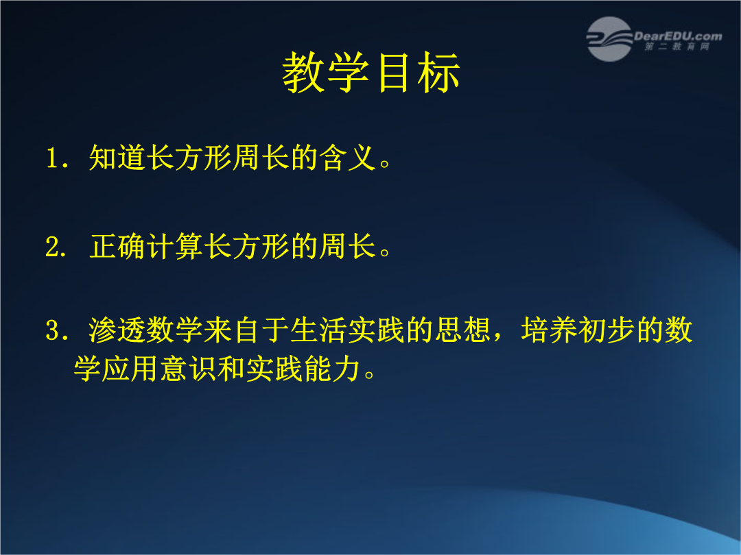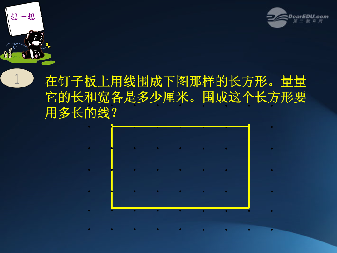 人教版三年级数学上册教学目标在钉子板上用线围成下图那样的长方形。量量它的长和宽各是多少厘米。围成这个长方形要用多长的线?234567总结