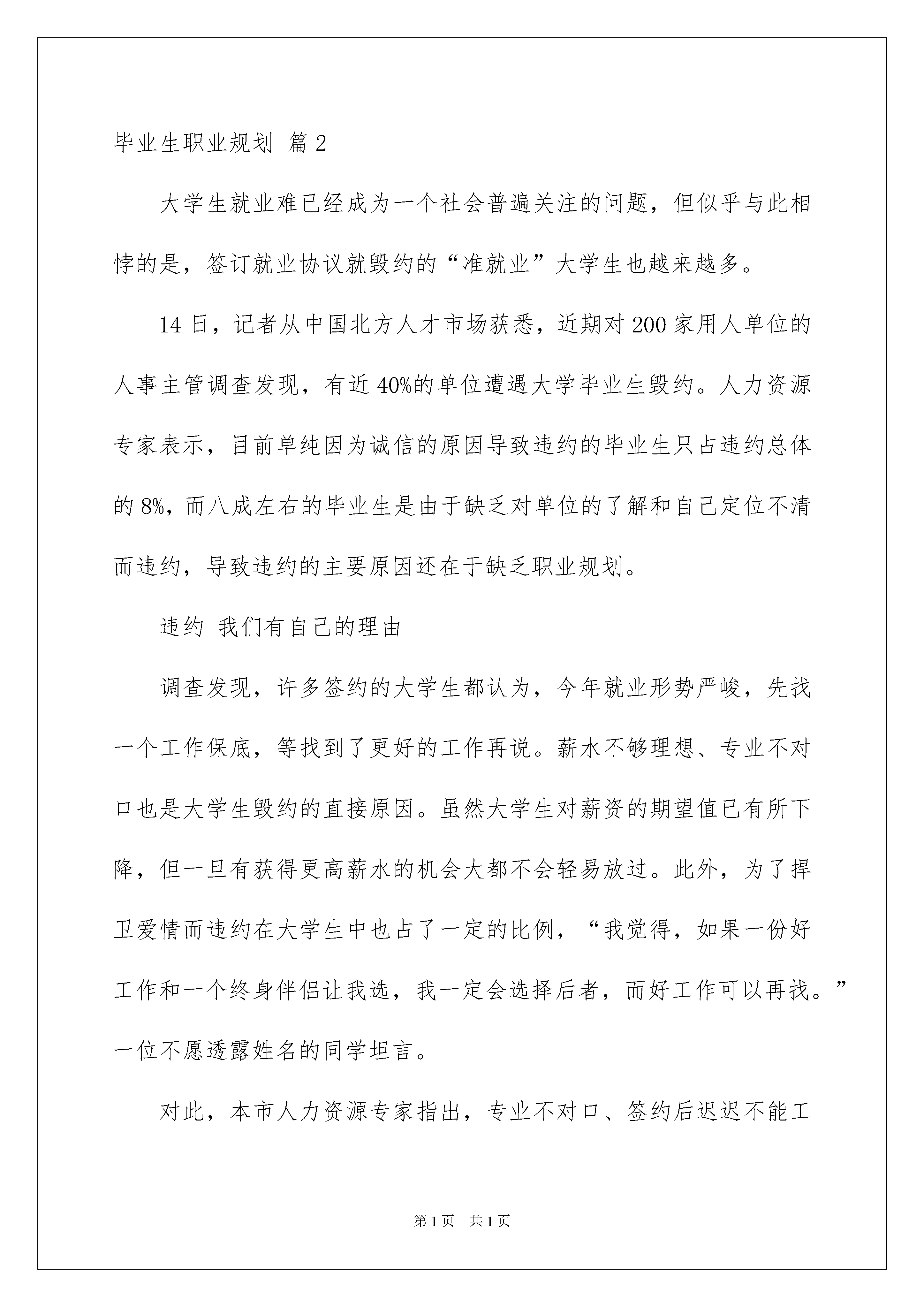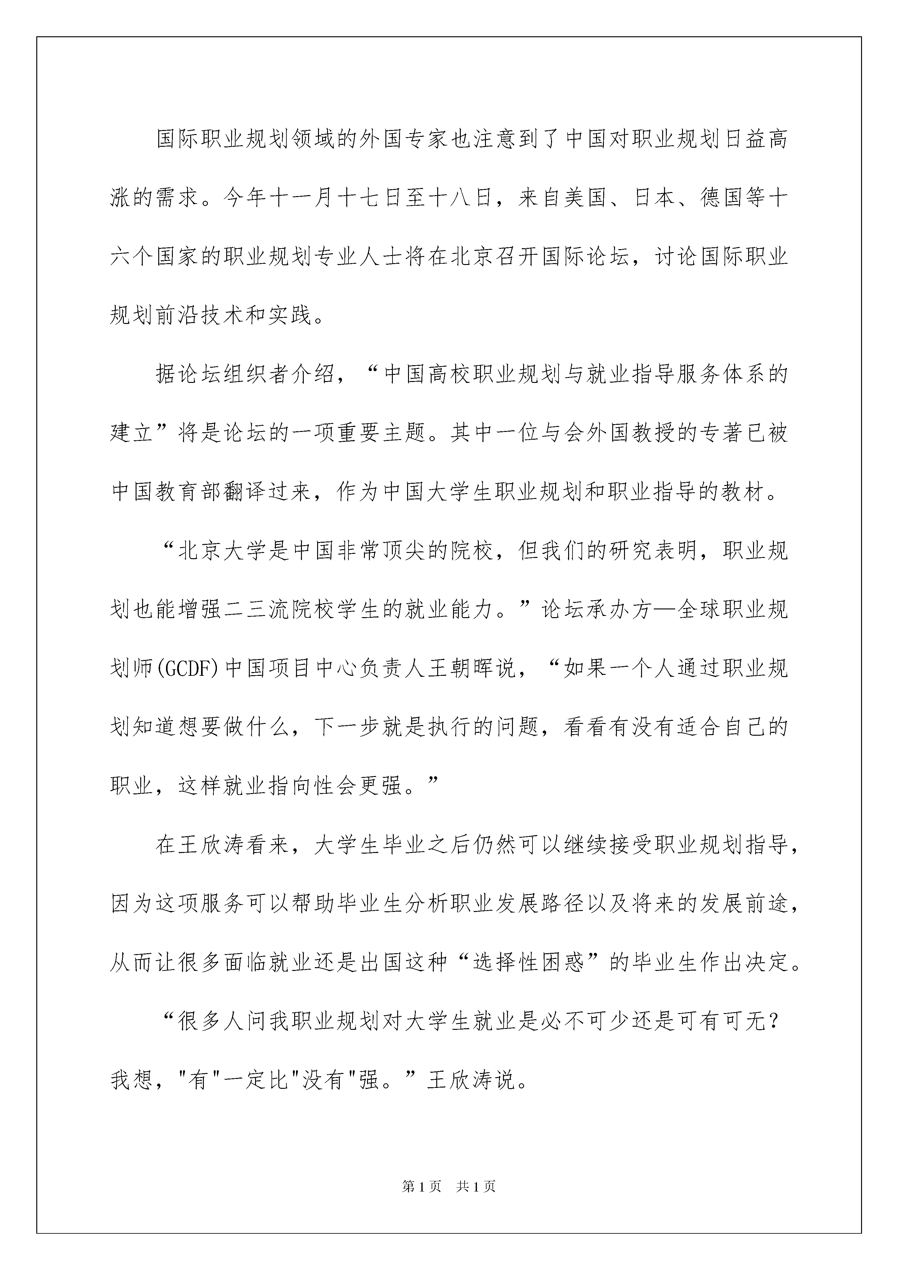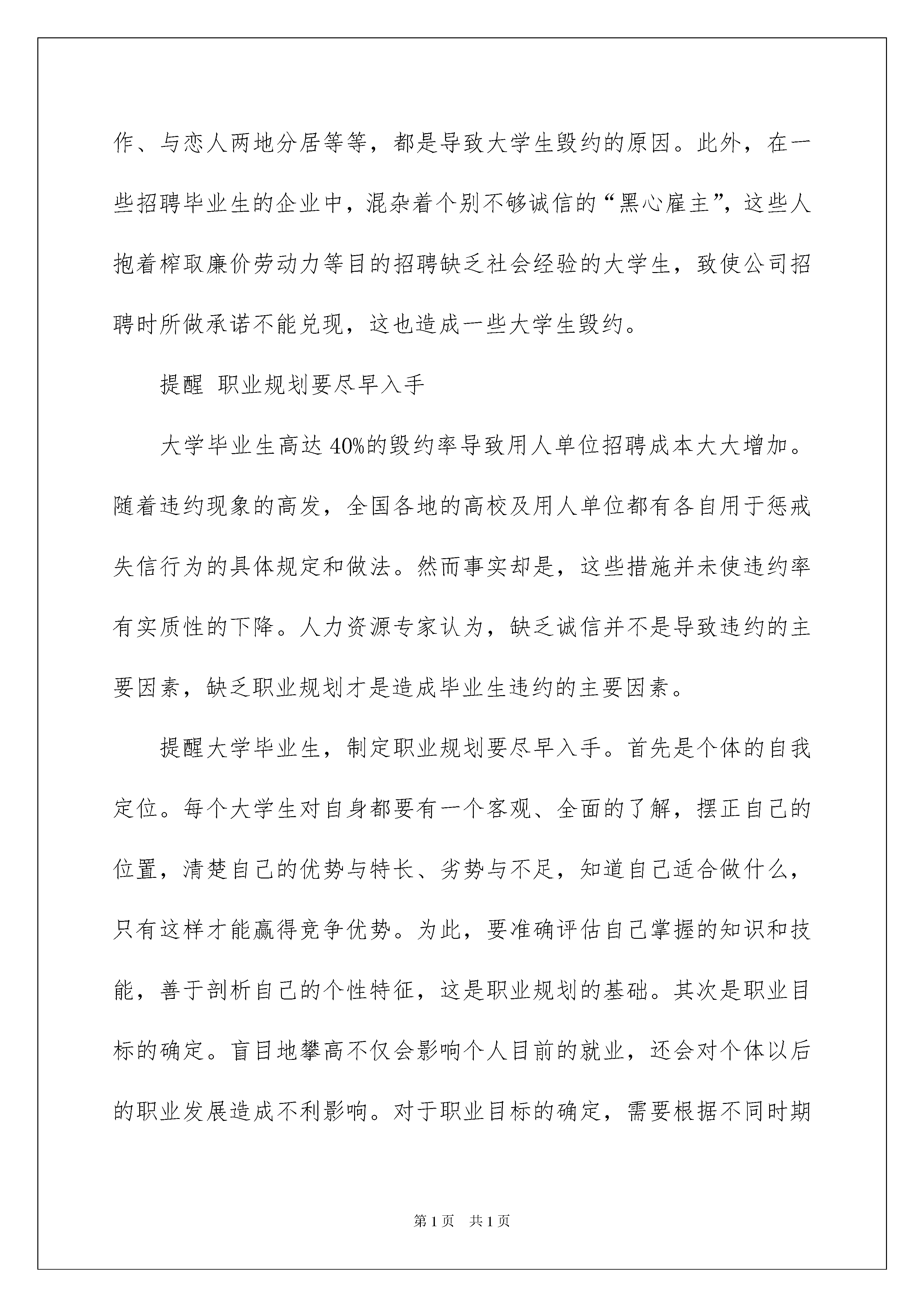 2022关于毕业生职业规划三篇关于毕业生职业规划三篇岁月流逝,流出一缕清泉,流出一阵芳香,我们又将开启新一轮的工作,我想我们需要好好地做个职业规划了。但是你知道怎样才能写的好吗?下面是我为大家收集的毕业生职业规划3篇,欢迎阅读与收藏。毕业生职业规划篇1中国大学生逐年升高的就业难度正在“催涨”一项新生事物——职业规划的热度。内地顶尖大学——北京大学新学期伊始就增设了“职业规划”课,为大学生就业“出谋划策”的国际论坛也将在两个月后举行。中国教育部统计数据显示,二00七年,中国高校毕业生总数为四百九十五万人,较二00六年增加八十多万人;实际需要就业人数则超过了五百万人。大学生就业人数的日益增加“催涨”了在中国尚属新兴的行业—职业规划的热度。职业规划目前在美国、瑞典等国已经成为一项产业,在专职职业规划师的帮助下,求职者可以了解自己的优劣势,明确自己的发展方向,并且了解自己所学专业是否与社会具体就业需求相吻合。北京大学本月初开学之际,面向全校学生增设了名为“大学生职业生涯规划”的课程。“试讲”当天就吸引了二百多名刚入校门的新生。此前,作为“积极劳动力市场政策”的重要组成部分,“职业生涯规划”已被中国人事部、教育部等相关部委列入“十一五”工作之列。北京大学就业中心副主任王欣涛表示,职业规划与目前中国高校普遍开展的就业指导有很大区别。“就业指导会一般性地号召去基层,去偏远地区,职业规划则强调"人职匹配、人职和谐";就业指导通常会停留在如何应对面试官等技巧性问题,职业规划则帮助分析求职者适不适合这个岗位。”除了开设“职业规划课”,北京大学还开办过“职业规划训练营”,并且在新生报到时就推出了职业规划服务;今年四月,在举行“北大开放日”时,校方为即将毕业的高中生进行了职业规划指导,帮助他们分析报考大学何种专业最适合自己。国际职业规划领域的外国专家也注意到了中国对职业规划日益高涨的需求。今年十一月十七日至十八日,来自美国、日本、德国等十六个国家的职业规划专业人士将在北京召开国际论坛,讨论国际职业规划前沿技术和实践。据论坛组织者介绍,“中国高校职业规划与就业指导服务体系的建立”将是论坛的一项重要主题。其中一位与会外国教授的专著已被中国教育部翻译过来,作为中国大学生职业规划和职业指导的教材。“北京大学是中国非常顶尖的院校,但我们的研究表明,职业规划也能增强二三流院校学生的就业能力。”论坛承办方—全球职业规划师(GCDF)中国项目中心负责人王朝晖说,“如果一个人通过职业规划知道想要做什么,下一步就是执行的问题,看看有没有适合自己的职业,这样就业指向性会更强。”在王欣涛看来,大学生毕业之后仍然可以继续接受职业规划指导,因为这项服务可以帮助毕业生分析职业发展路径以及将来的发展前途,从而让很多面临就业还是出国这种“选择性困惑”的毕业生作出决定。“很多人问我职业规划对大学生就业是必不可少还是可有可无?我想,"有"一定比"没有"强。”王欣涛说。毕业生职业规划篇2大学生就业难已经成为一个社会普遍关注的问题,但似乎与此相悖的是,签订就业协议就毁约的“准就业”大学生也越来越多。14日,记者从中国北方人才市场获悉,近期对200家用人单位的人事主管调查发现,有近40%的单位遭遇大学毕业生毁约。人力资源专家表示,目前单纯因为诚信的原因导致违约的毕业生只占违约总体的8%,而八成左右的毕业生是由于缺乏对单位的了解和自己定位不清而违约,导致违约的主要原因还在于缺乏职业规划。违约我们有自己的理由调查发现,许多签约的大学生都认为,今年就业形势严峻,先找一个工作保底,等找到了更好的工作再说。薪水不够理想、专业不对口也是大学生毁约的直接原因。虽然大学生对薪资的期望值已有所下降,但一旦有获得更高薪水的机会大都不会轻易放过。此外,为了捍卫爱情而违约在大学生中也占了一定的比例,“我觉得,如果一份好工作和一个终身伴侣让我选,我一定会选择后者,而好工作可以再找。”一位不愿透露姓名的同学坦言。对此,本市人力资源专家指出,专业不对口、签约后迟迟不能工作、与恋人两地分居等等,都是导致大学生毁约的原因。此外,在一些招聘毕业生的企业中,混杂着个别不够诚信的“黑心雇主”,这些人抱着榨取廉价劳动力等目的招聘缺乏社会经验的大学生,致使公司招聘时所做承诺不能兑现,这也造成一些大学生毁约。提醒职业规划要尽早入手大学毕业生高达40%的毁约率导致用人单位招聘成本大大增加。随着违约现象的高发,全国各地的高校及用人单位都有各自用于惩戒失信行为的具体规定和做法。然而事实却是,这些措施并未使违约率有实质性的下降。人力资源专家认为,缺乏诚信并不是导致违约的主要因素,缺乏职业规划