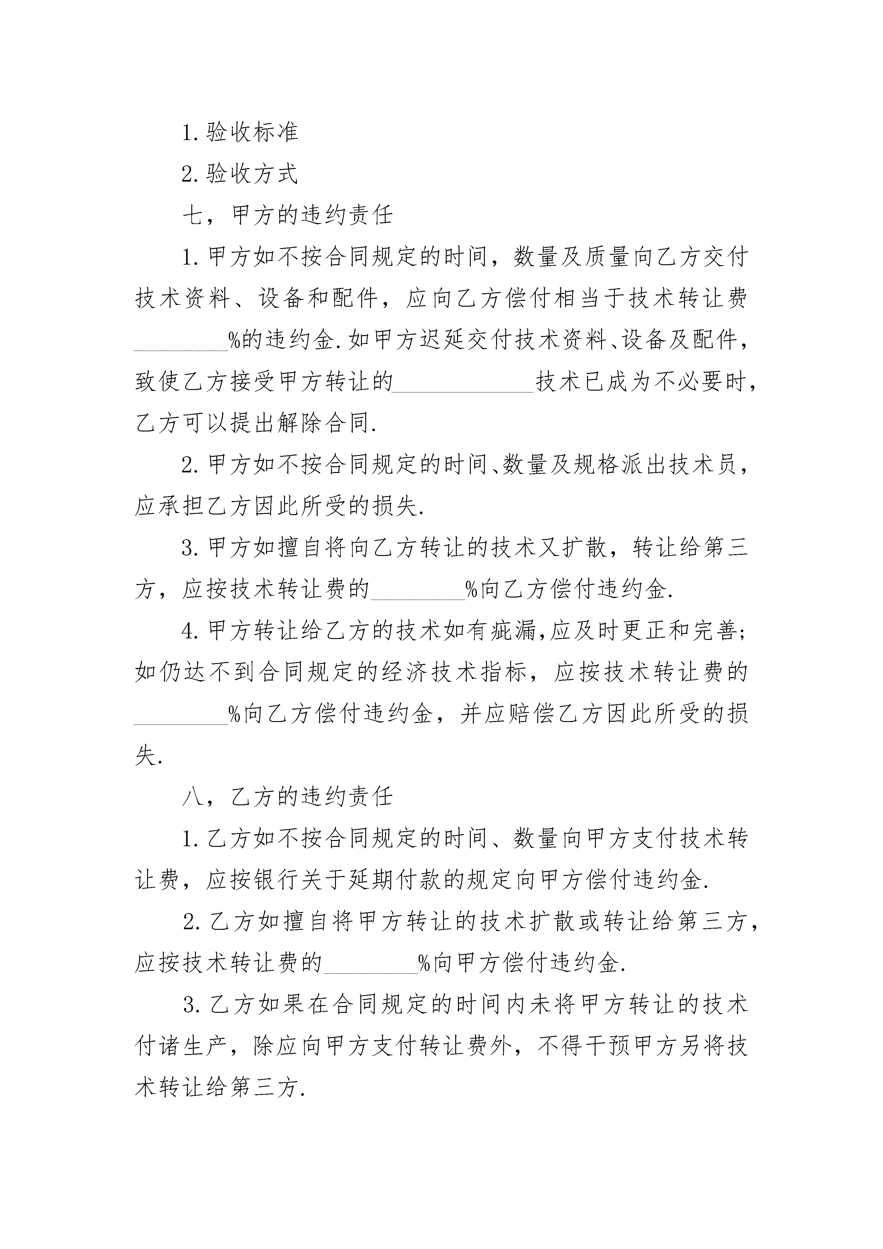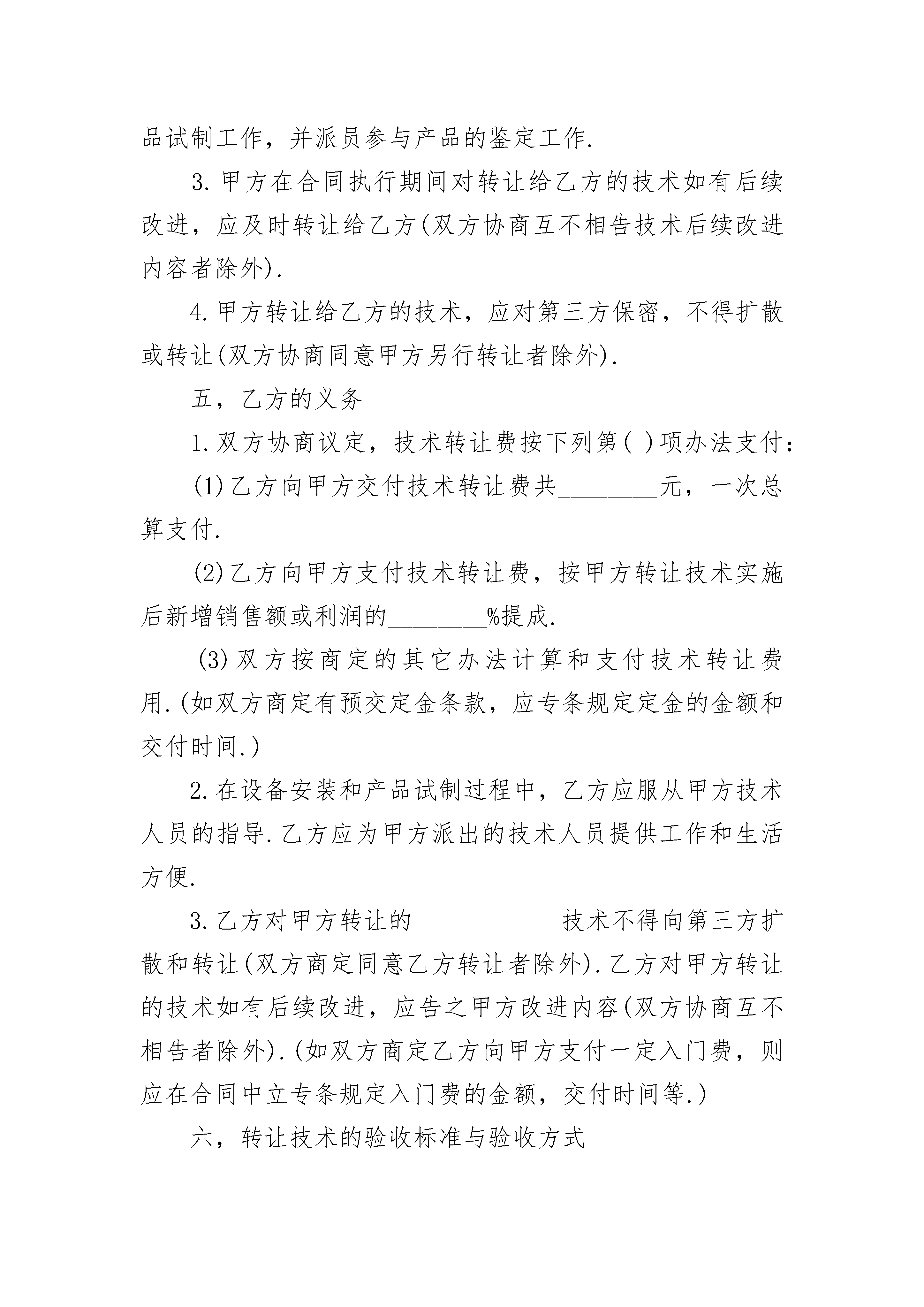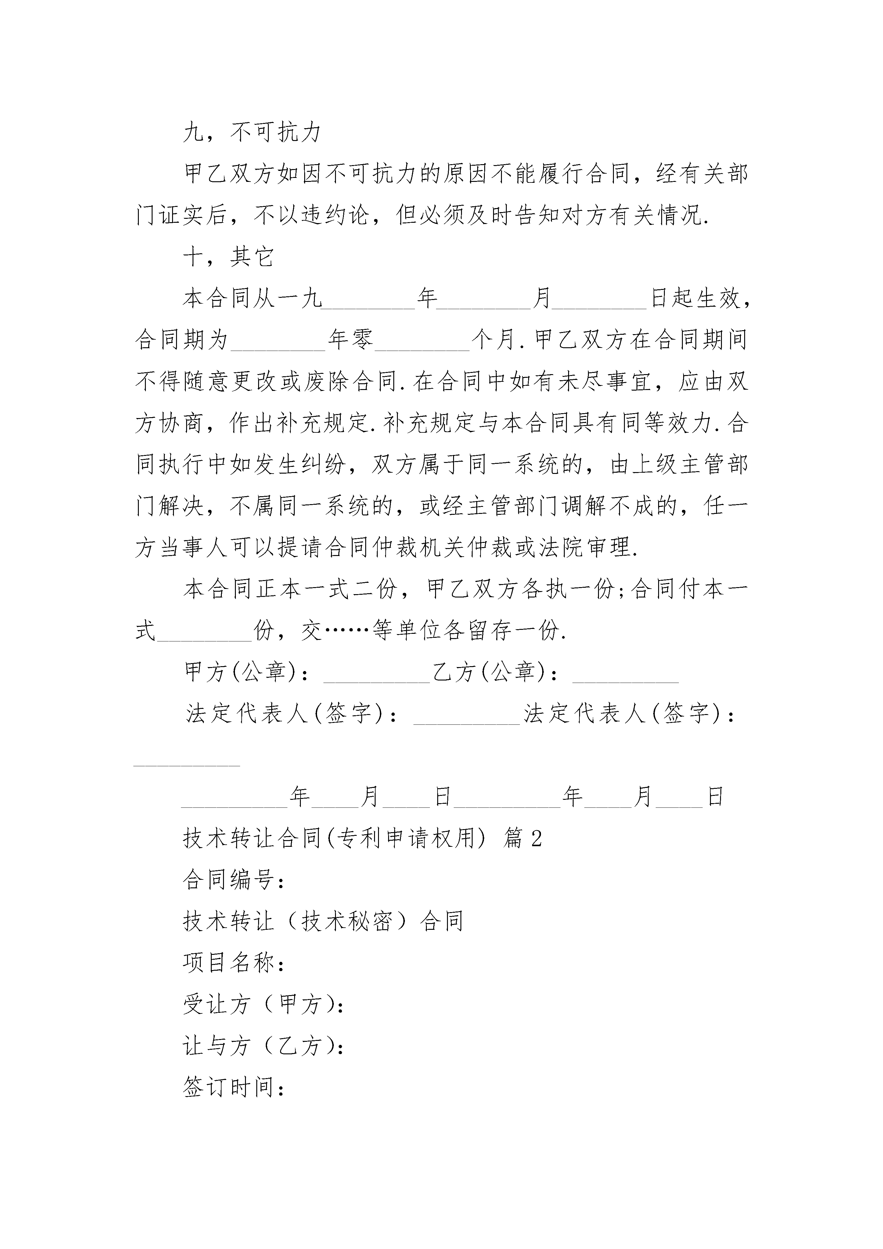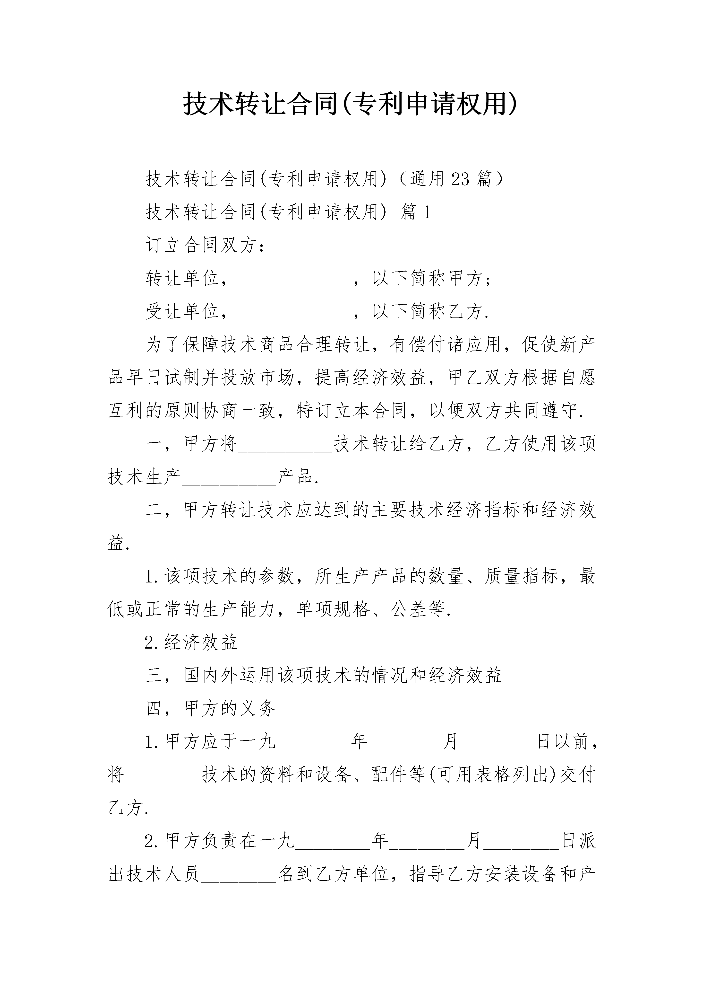 技术转让合同(专利申请权用)技术转让合同(专利申请权用)(通用23篇)技术转让合同(专利申请权用)篇1订立合同双方:转让单位,____________,以下简称甲方;受让单位,____________,以下简称乙方.为了保障技术商品合理转让,有偿付诸应用,促使新产品早日试制并投放市场,提高经济效益,甲乙双方根据自愿互利的原则协商一致,特订立本合同,以便双方共同遵守.一,甲方将__________技术转让给乙方,乙方使用该项技术生产__________产品.二,甲方转让技术应达到的主要技术经济指标和经济效益.1.该项技术的参数,所生产产品的数量、质量指标,最低或正常的生产能力,单项规格、公差等.______________2.经济效益__________三,国内外运用该项技术的情况和经济效益四,甲方的义务1.甲方应于一九________年________月________日以前,将________技术的资料和设备、配件等(可用表格列出)交付乙方.2.甲方负责在一九________年________月________日派出技术人员________名到乙方单位,指导乙方安装设备和产品试制工作,并派员参与产品的鉴定工作.3.甲方在合同执行期间对转让给乙方的技术如有后续改进,应及时转让给乙方(双方协商互不相告技术后续改进内容者除外).4.甲方转让给乙方的技术,应对第三方保密,不得扩散或转让(双方协商同意甲方另行转让者除外).五,乙方的义务1.双方协商议定,技术转让费按下列第()项办法支付:(1)乙方向甲方交付技术转让费共________元,一次总算支付.(2)乙方向甲方支付技术转让费,按甲方转让技术实施后新增销售额或利润的________%提成.(3)双方按商定的其它办法计算和支付技术转让费用.(如双方商定有预交定金条款,应专条规定定金的金额和交付时间.)2.在设备安装和产品试制过程中,乙方应服从甲方技术人员的指导.乙方应为甲方派出的技术人员提供工作和生活方便.3.乙方对甲方转让的____________技术不得向第三方扩散和转让(双方商定同意乙方转让者除外).乙方对甲方转让的技术如有后续改进,应告之甲方改进内容(双方协商互不相告者除外).(如双方商定乙方向甲方支付一定入门费,则应在合同中立专条规定入门费的金额,交付时间等.)六,转让技术的验收标准与验收方式1.验收标准2.验收方式七,甲方的违约责任1.甲方如不按合同规定的时间,数量及质量向乙方交付技术资料、设备和配件,应向乙方偿付相当于技术转让费________%的违约金.如甲方迟延交付技术资料、设备及配件,致使乙方接受甲方转让的____________技术已成为不必要时,乙方可以提出解除合同.2.甲方如不按合同规定的时间、数量及规格派出技术员,应承担乙方因此所受的损失.3.甲方如擅自将向乙方转让的技术又扩散,转让给第三方,应按技术转让费的________%向乙方偿付违约金.4.甲方转让给乙方的技术如有疵漏,应及时更正和完善;如仍达不到合同规定的经济技术指标,应按技术转让费的________%向乙方偿付违约金,并应赔偿乙方因此所受的损失.八,乙方的违约责任1.乙方如不按合同规定的时间、数量向甲方支付技术转让费,应按银行关于延期付款的规定向甲方偿付违约金.2.乙方如擅自将甲方转让的技术扩散或转让给第三方,应按技术转让费的________%向甲方偿付违约金.3.乙方如果在合同规定的时间内未将甲方转让的技术付诸生产,除应向甲方支付转让费外,不得干预甲方另将技术转让给第三方.九,不可抗力甲乙双方如因不可抗力的原因不能履行合同,经有关部门证实后,不以违约论,但必须及时告知对方有关情况.十,其它本合同从一九________年________月________日起生效,合同期为________年零________个月.甲乙双方在合同期间不得随意更改或废除合同.在合同中如有未尽事宜,应由双方协商,作出补充规定.补充规定与本合同具有同等效力.合同执行中如发生纠纷,双方属于同一系统的,由上级主管部门解决,不属同一系统的,或经主管部门调解不成的,任一方当事人可以提请合同仲裁机关仲裁或法院审理.本合同正本一式二份,甲乙双方各执一份;合同付本一式________份,交……等单位各留存一份.甲方(公章):_________乙方(公章):_________法定代表人(签字):_________法定代表人(签字):__________________年____月____日_________年____月____日技术转让合同(专利申请权用)篇2合同编号:技术转让(技术秘密)合同项目名称:受让方(甲方):让与方(乙方):签订时间:签订地点:有效期限:中华人民共和国科学技术部制填写说明一、本合同为中华人民共和国科学技术