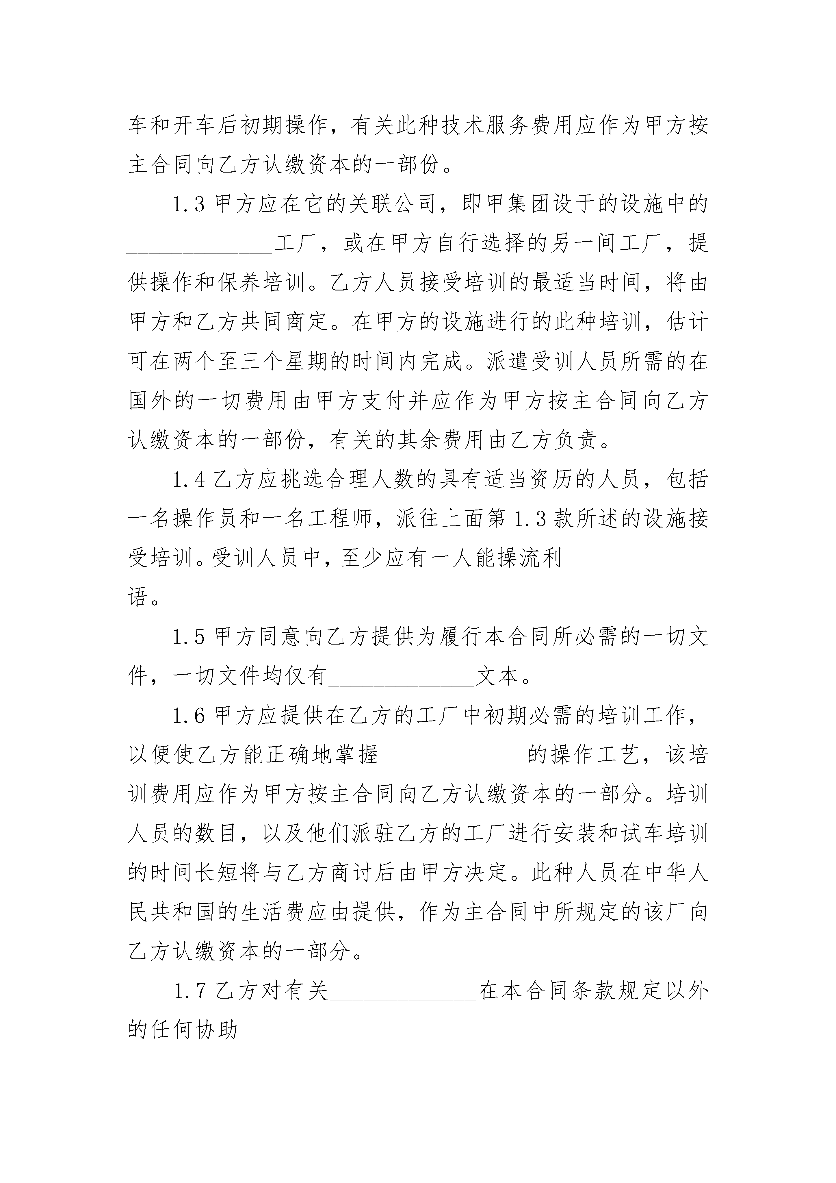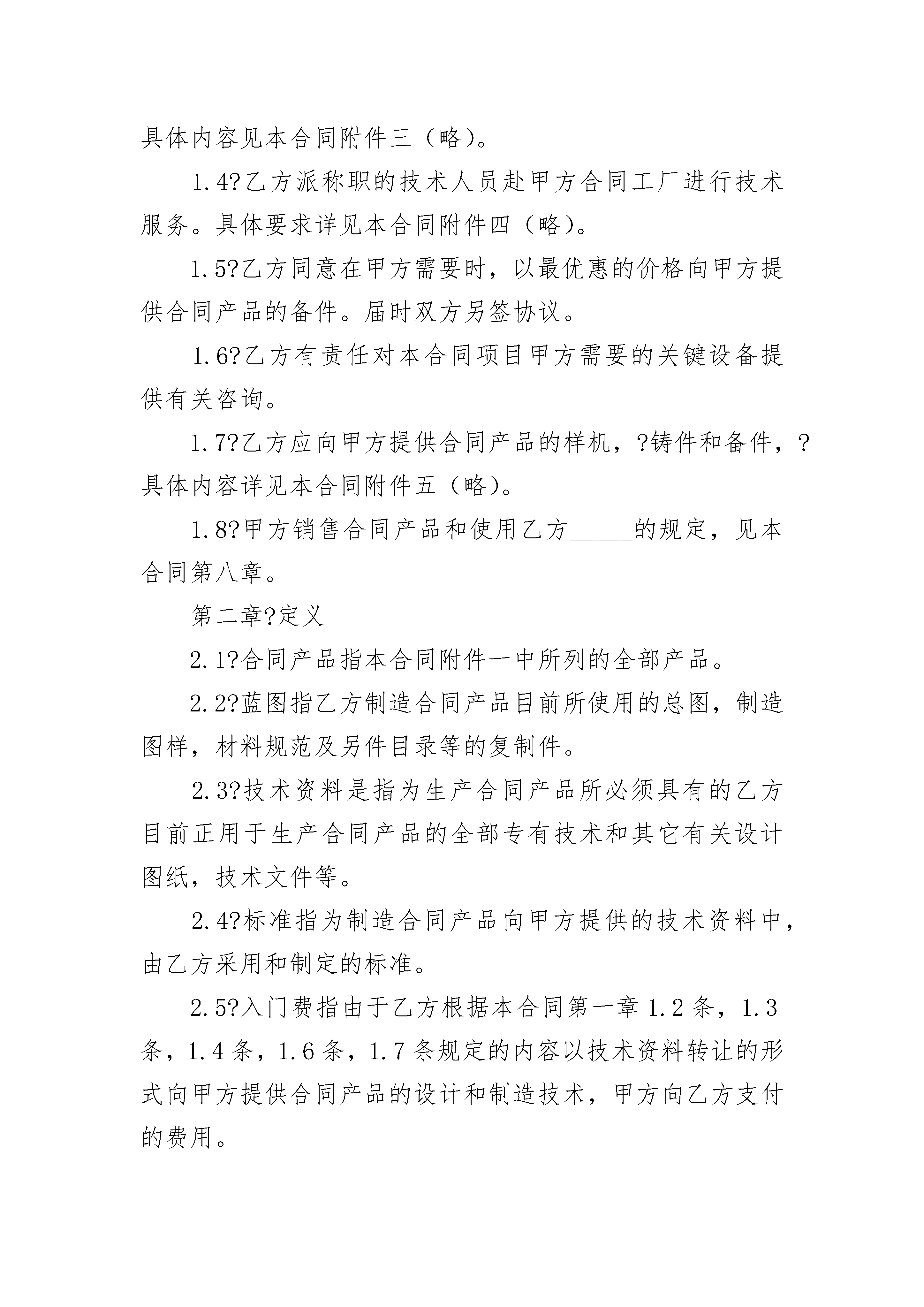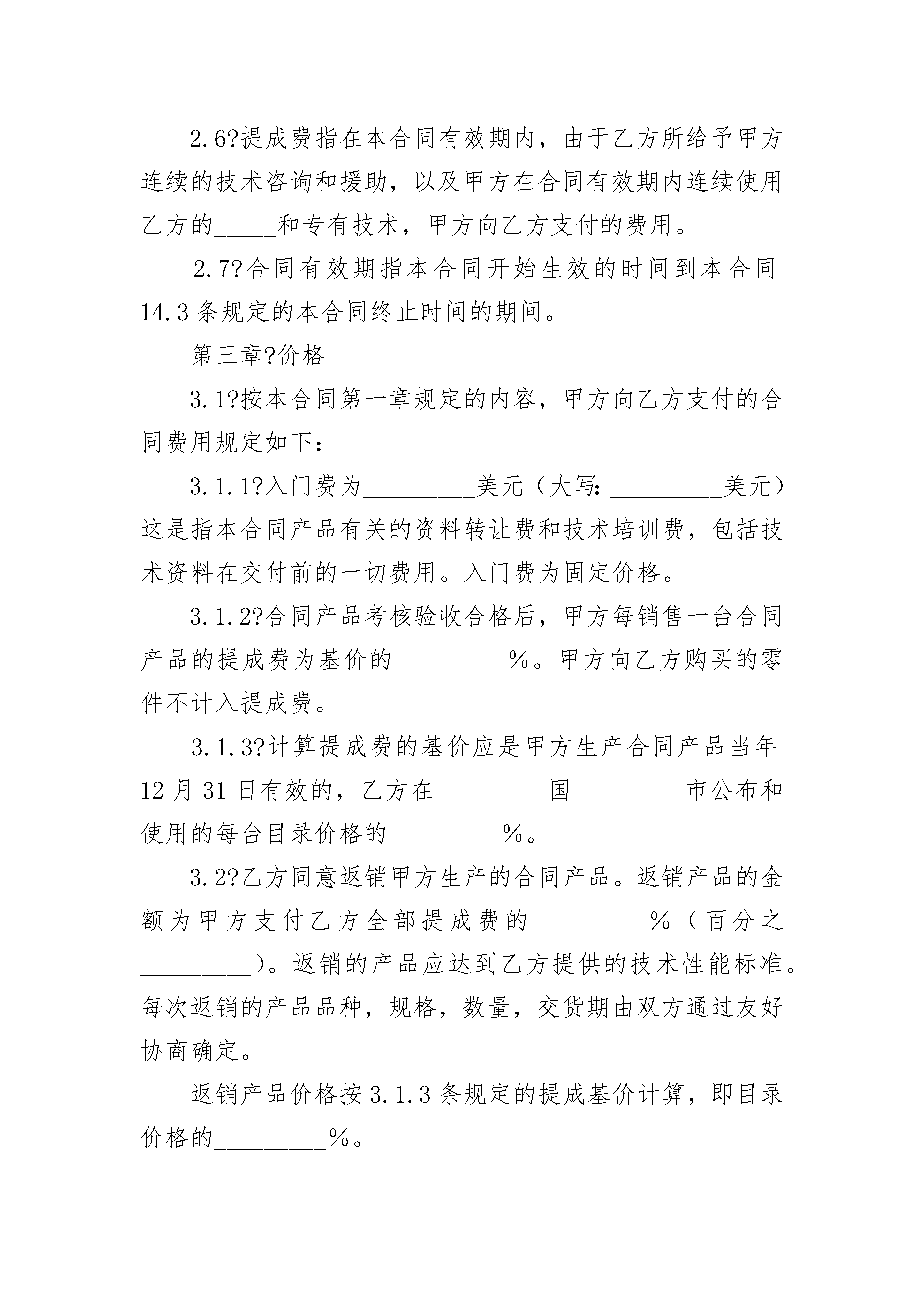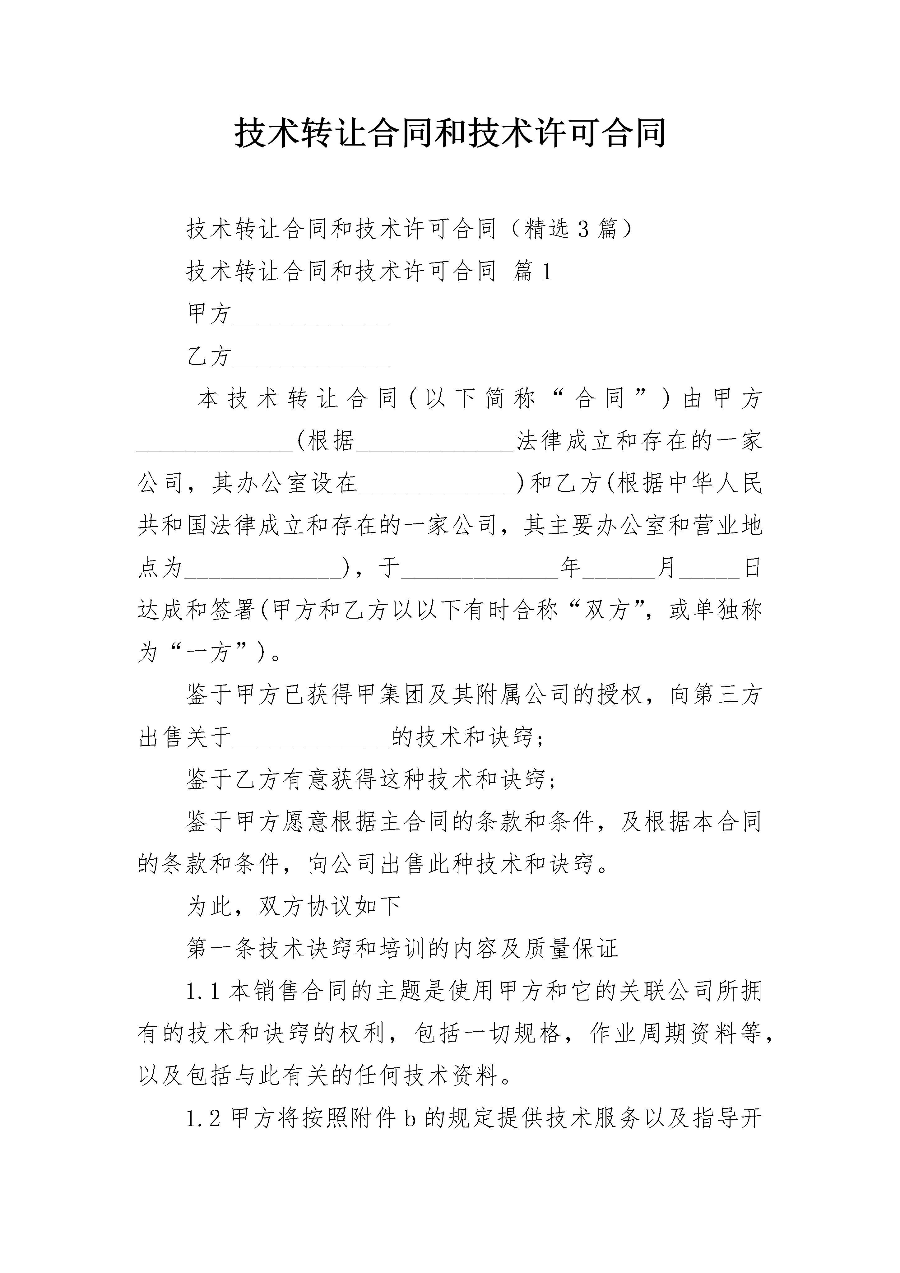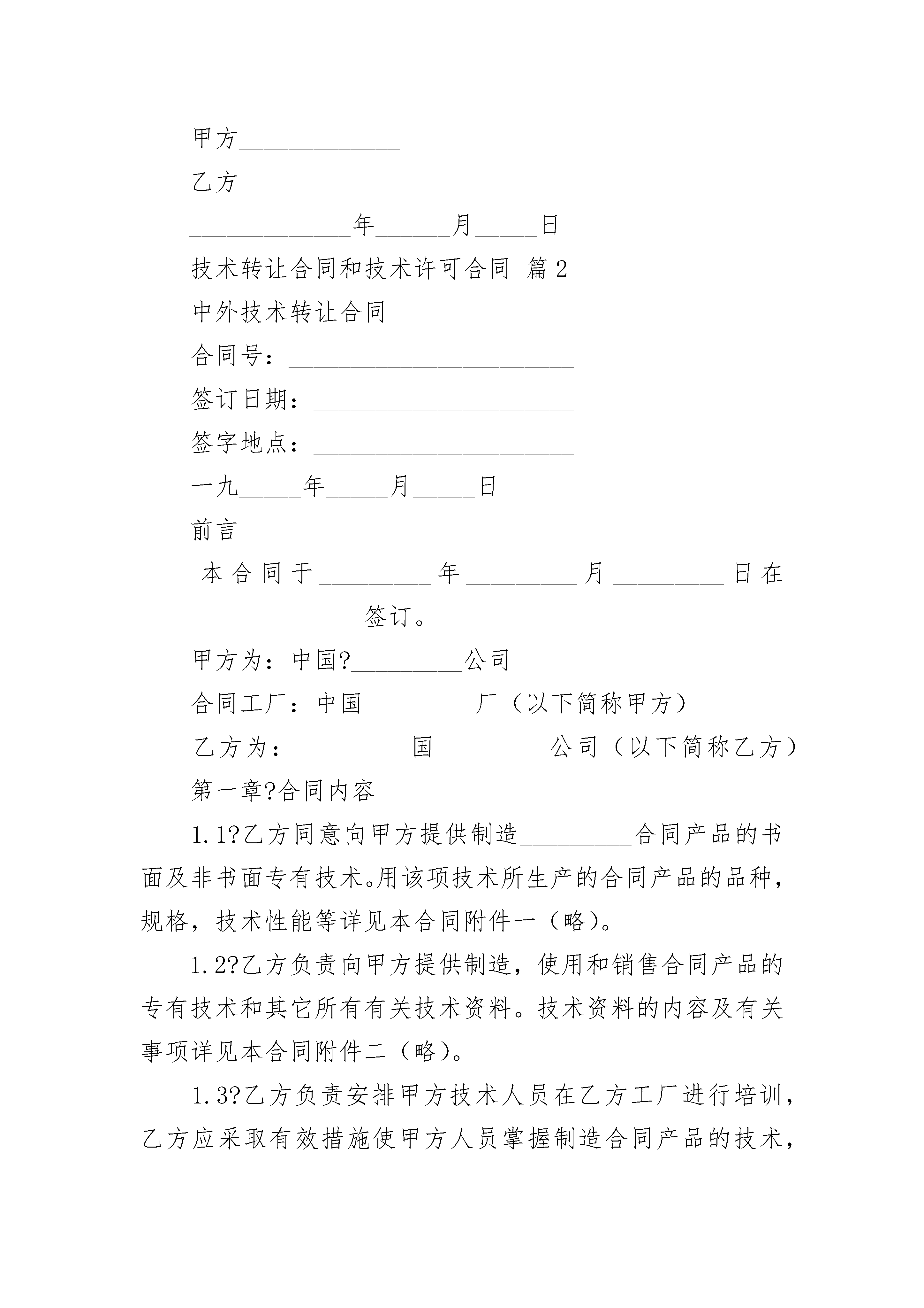 技术转让合同和技术许可合同技术转让合同和技术许可合同(精选3篇)技术转让合同和技术许可合同篇1甲方_____________乙方_____________本技术转让合同(以下简称“合同”)由甲方_____________(根据_____________法律成立和存在的一家公司,其办公室设在_____________)和乙方(根据中华人民共和国法律成立和存在的一家公司,其主要办公室和营业地点为_____________),于_____________年______月_____日达成和签署(甲方和乙方以以下有时合称“双方”,或单独称为“一方”)。鉴于甲方已获得甲集团及其附属公司的授权,向第三方出售关于_____________的技术和诀窍;鉴于乙方有意获得这种技术和诀窍;鉴于甲方愿意根据主合同的条款和条件,及根据本合同的条款和条件,向公司出售此种技术和诀窍。为此,双方协议如下第一条技术诀窍和培训的内容及质量保证1.1本销售合同的主题是使用甲方和它的关联公司所拥有的技术和诀窍的权利,包括一切规格,作业周期资料等,以及包括与此有关的任何技术资料。1.2甲方将按照附件b的规定提供技术服务以及指导开车和开车后初期操作,有关此种技术服务费用应作为甲方按主合同向乙方认缴资本的一部份。1.3甲方应在它的关联公司,即甲集团设于的设施中的_____________工厂,或在甲方自行选择的另一间工厂,提供操作和保养培训。乙方人员接受培训的最适当时间,将由甲方和乙方共同商定。在甲方的设施进行的此种培训,估计可在两个至三个星期的时间内完成。派遣受训人员所需的在国外的一切费用由甲方支付并应作为甲方按主合同向乙方认缴资本的一部份,有关的其余费用由乙方负责。1.4乙方应挑选合理人数的具有适当资历的人员,包括一名操作员和一名工程师,派往上面第1.3款所述的设施接受培训。受训人员中,至少应有一人能操流利_____________语。1.5甲方同意向乙方提供为履行本合同所必需的一切文件,一切文件均仅有_____________文本。1.6甲方应提供在乙方的工厂中初期必需的培训工作,以便使乙方能正确地掌握_____________的操作工艺,该培训费用应作为甲方按主合同向乙方认缴资本的一部分。培训人员的数目,以及他们派驻乙方的工厂进行安装和试车培训的时间长短将与乙方商讨后由甲方决定。此种人员在中华人民共和国的生活费应由提供,作为主合同中所规定的该厂向乙方认缴资本的一部分。1.7乙方对有关_____________在本合同条款规定以外的任何协助甲方_____________乙方__________________________年______月_____日技术转让合同和技术许可合同篇2中外技术转让合同合同号:_______________________签订日期:_____________________签字地点:_____________________一九_____年_____月_____日前言本合同于_________年_________月_________日在__________________签订。甲方为:中国?_________公司合同工厂:中国_________厂(以下简称甲方)乙方为:_________国_________公司(以下简称乙方)第一章?合同内容1.1?乙方同意向甲方提供制造_________合同产品的书面及非书面专有技术。用该项技术所生产的合同产品的品种,规格,技术性能等详见本合同附件一(略)。1.2?乙方负责向甲方提供制造,使用和销售合同产品的专有技术和其它所有有关技术资料。技术资料的内容及有关事项详见本合同附件二(略)。1.3?乙方负责安排甲方技术人员在乙方工厂进行培训,乙方应采取有效措施使甲方人员掌握制造合同产品的技术,具体内容见本合同附件三(略)。1.4?乙方派称职的技术人员赴甲方合同工厂进行技术服务。具体要求详见本合同附件四(略)。1.5?乙方同意在甲方需要时,以最优惠的价格向甲方提供合同产品的备件。届时双方另签协议。1.6?乙方有责任对本合同项目甲方需要的关键设备提供有关咨询。1.7?乙方应向甲方提供合同产品的样机,?铸件和备件,?具体内容详见本合同附件五(略)。1.8?甲方销售合同产品和使用乙方_____的规定,见本合同第八章。第二章?定义2.1?合同产品指本合同附件一中所列的全部产品。2.2?蓝图指乙方制造合同产品目前所使用的总图,制造图样,材料规范及另件目录等的复制件。2.3?技术资料是指为生产合同产品所必须具有的乙方目前正用于生产合同产品的全部专有技术和其它有关设计图纸,技术文件等。2.4?标准指为制造合同产品向甲方提供的技术资料中,由乙方采用和制定的标准。2.5?入门费指由于乙方根据本合同第一章1.2条,1.3条,