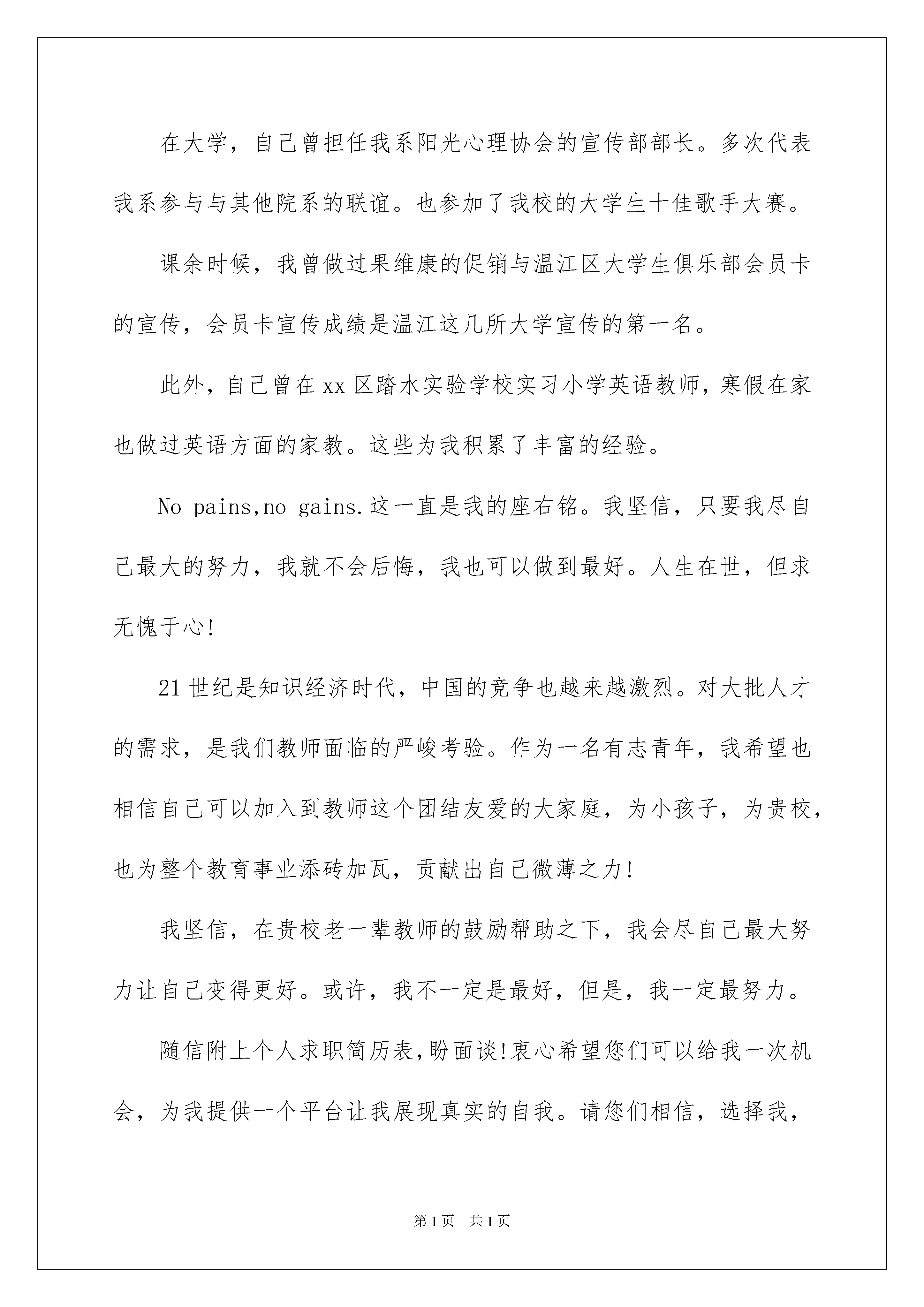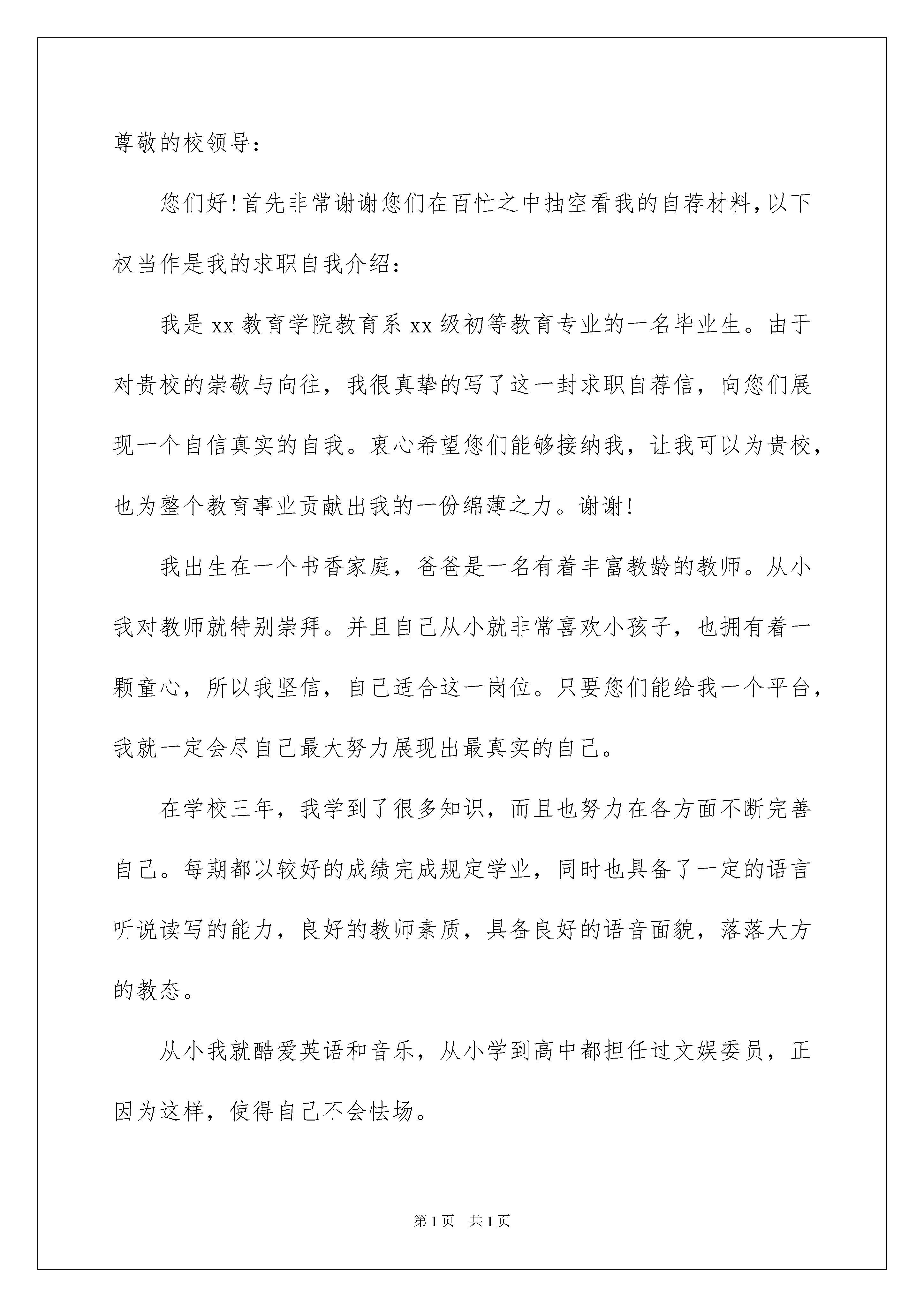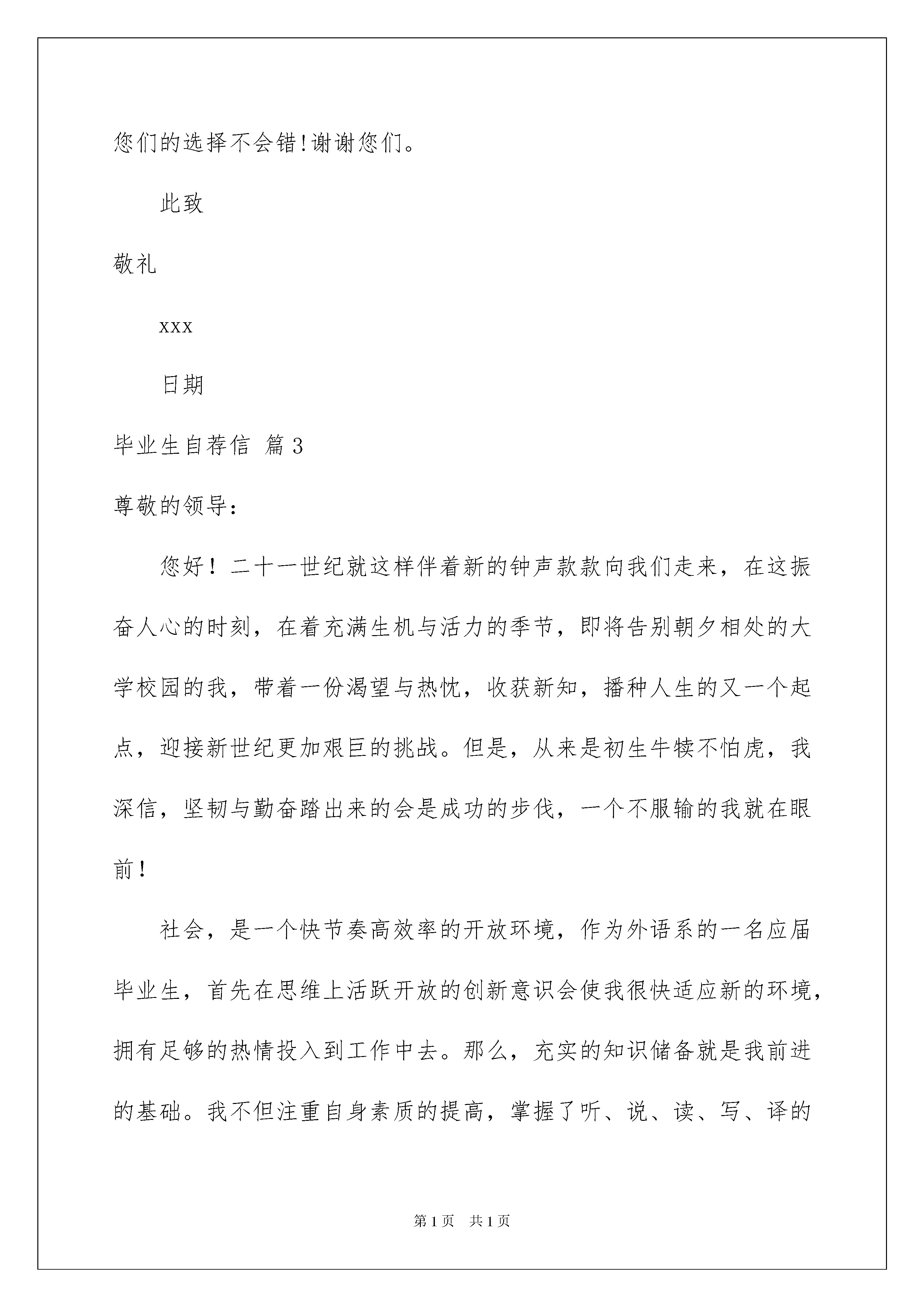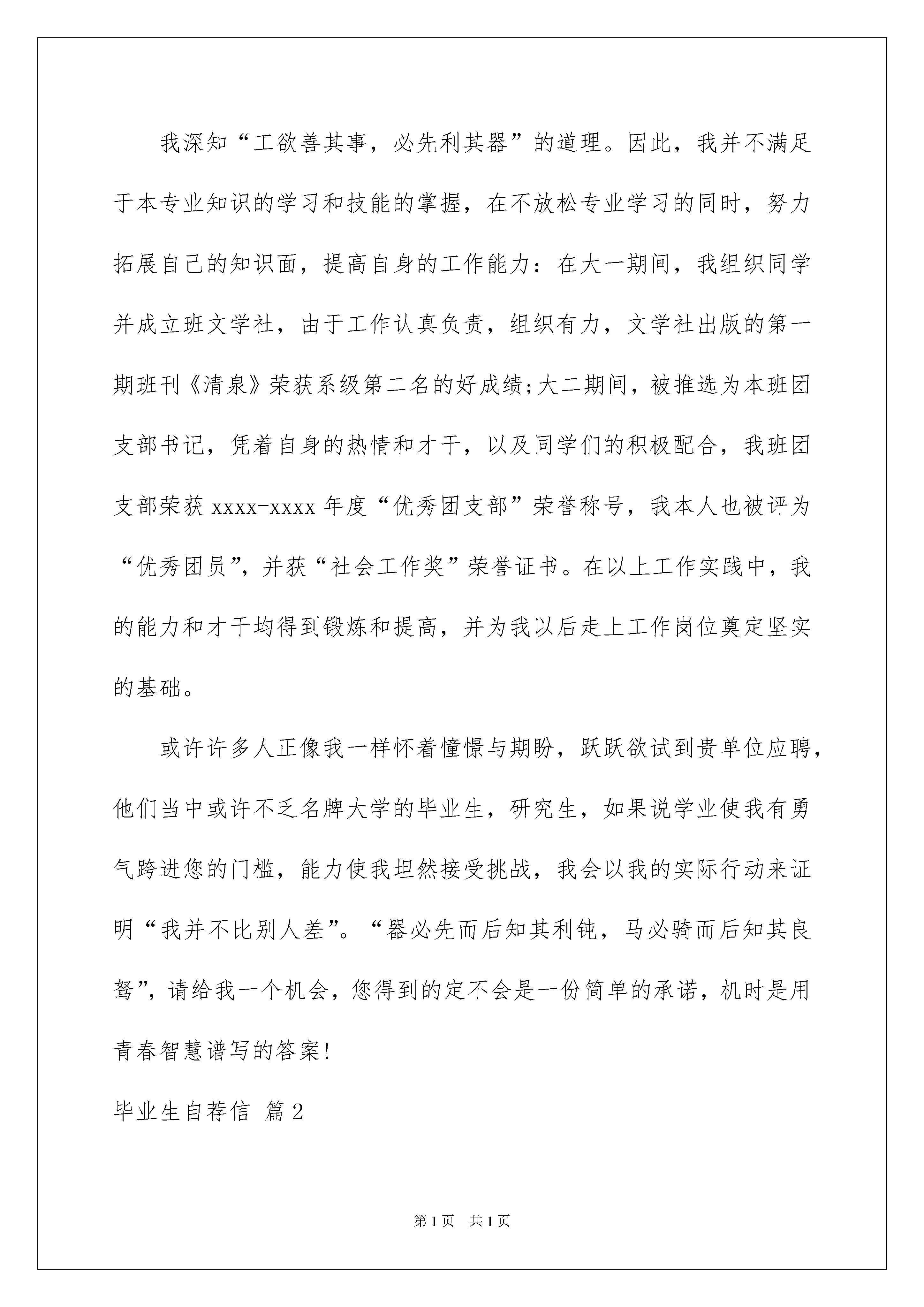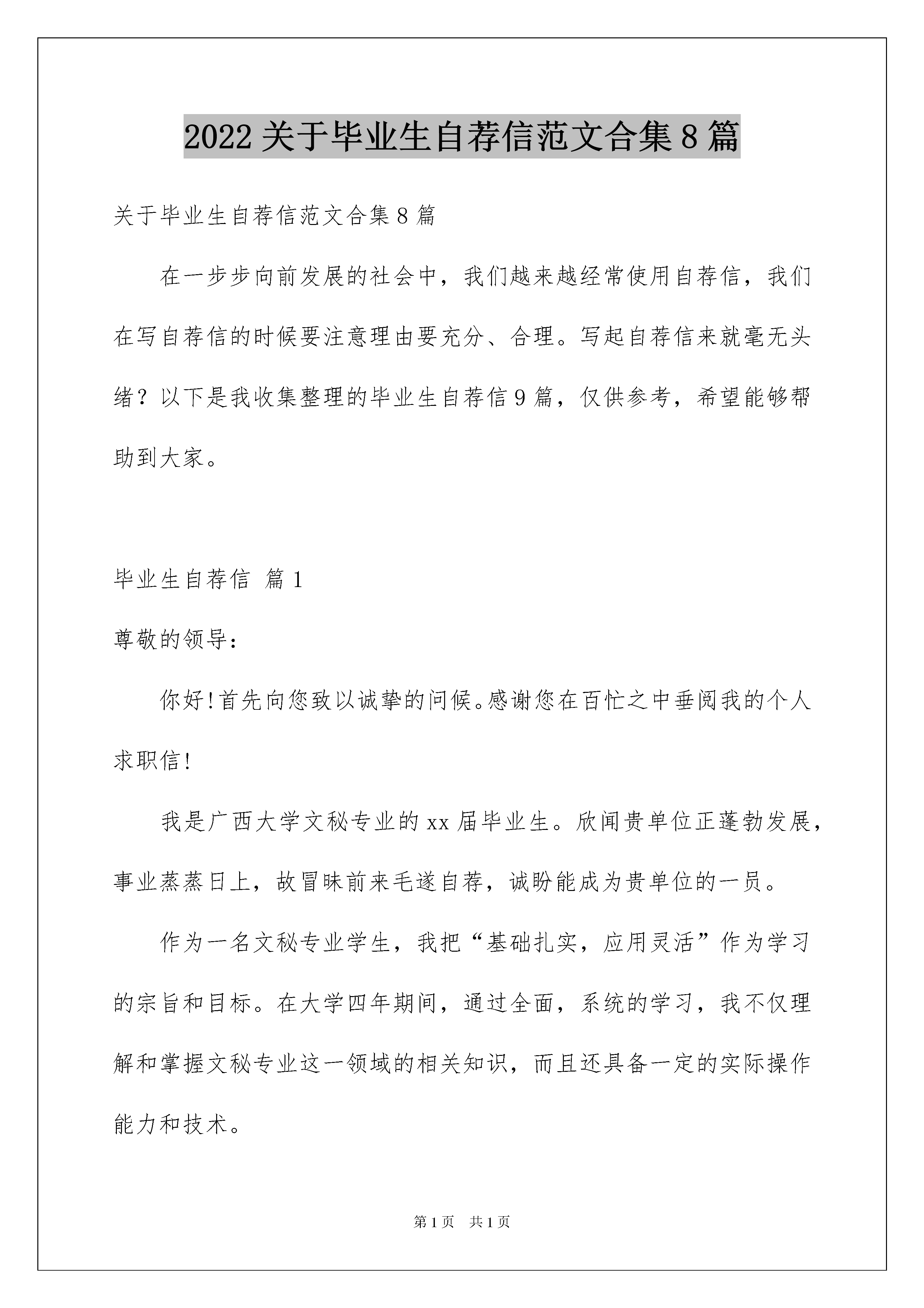 2022关于毕业生自荐信范文合集8篇关于毕业生自荐信范文合集8篇在一步步向前发展的社会中,我们越来越经常使用自荐信,我们在写自荐信的时候要注意理由要充分、合理。写起自荐信来就毫无头绪?以下是我收集整理的毕业生自荐信9篇,仅供参考,希望能够帮助到大家。毕业生自荐信篇1尊敬的领导:你好!首先向您致以诚挚的问候。感谢您在百忙之中垂阅我的个人求职信!我是广西大学文秘专业的xx届毕业生。欣闻贵单位正蓬勃发展,事业蒸蒸日上,故冒昧前来毛遂自荐,诚盼能成为贵单位的一员。作为一名文秘专业学生,我把“基础扎实,应用灵活”作为学习的宗旨和目标。在大学四年期间,通过全面,系统的学习,我不仅理解和掌握文秘专业这一领域的相关知识,而且还具备一定的实际操作能力和技术。我深知“工欲善其事,必先利其器”的道理。因此,我并不满足于本专业知识的学习和技能的掌握,在不放松专业学习的同时,努力拓展自己的知识面,提高自身的工作能力:在大一期间,我组织同学并成立班文学社,由于工作认真负责,组织有力,文学社出版的第一期班刊《清泉》荣获系级第二名的好成绩;大二期间,被推选为本班团支部书记,凭着自身的热情和才干,以及同学们的积极配合,我班团支部荣获xxxx-xxxx年度“优秀团支部”荣誉称号,我本人也被评为“优秀团员”,并获“社会工作奖”荣誉证书。在以上工作实践中,我的能力和才干均得到锻炼和提高,并为我以后走上工作岗位奠定坚实的基础。或许许多人正像我一样怀着憧憬与期盼,跃跃欲试到贵单位应聘,他们当中或许不乏名牌大学的毕业生,研究生,如果说学业使我有勇气跨进您的门槛,能力使我坦然接受挑战,我会以我的实际行动来证明“我并不比别人差”。“器必先而后知其利钝,马必骑而后知其良驽”,请给我一个机会,您得到的定不会是一份简单的承诺,机时是用青春智慧谱写的答案!毕业生自荐信篇2尊敬的校领导:您们好!首先非常谢谢您们在百忙之中抽空看我的自荐材料,以下权当作是我的求职自我介绍:我是xx教育学院教育系xx级初等教育专业的一名毕业生。由于对贵校的崇敬与向往,我很真挚的写了这一封求职自荐信,向您们展现一个自信真实的自我。衷心希望您们能够接纳我,让我可以为贵校,也为整个教育事业贡献出我的一份绵薄之力。谢谢!我出生在一个书香家庭,爸爸是一名有着丰富教龄的教师。从小我对教师就特别崇拜。并且自己从小就非常喜欢小孩子,也拥有着一颗童心,所以我坚信,自己适合这一岗位。只要您们能给我一个平台,我就一定会尽自己最大努力展现出最真实的自己。在学校三年,我学到了很多知识,而且也努力在各方面不断完善自己。每期都以较好的成绩完成规定学业,同时也具备了一定的语言听说读写的能力,良好的教师素质,具备良好的语音面貌,落落大方的教态。从小我就酷爱英语和音乐,从小学到高中都担任过文娱委员,正因为这样,使得自己不会怯场。在大学,自己曾担任我系阳光心理协会的宣传部部长。多次代表我系参与与其他院系的联谊。也参加了我校的大学生十佳歌手大赛。课余时候,我曾做过果维康的促销与温江区大学生俱乐部会员卡的宣传,会员卡宣传成绩是温江这几所大学宣传的第一名。此外,自己曾在xx区踏水实验学校实习小学英语教师,寒假在家也做过英语方面的家教。这些为我积累了丰富的经验。Nopains,nogains.这一直是我的座右铭。我坚信,只要我尽自己最大的努力,我就不会后悔,我也可以做到最好。人生在世,但求无愧于心!21世纪是知识经济时代,中国的竞争也越来越激烈。对大批人才的需求,是我们教师面临的严峻考验。作为一名有志青年,我希望也相信自己可以加入到教师这个团结友爱的大家庭,为小孩子,为贵校,也为整个教育事业添砖加瓦,贡献出自己微薄之力!我坚信,在贵校老一辈教师的鼓励帮助之下,我会尽自己最大努力让自己变得更好。或许,我不一定是最好,但是,我一定最努力。随信附上个人求职简历表,盼面谈!衷心希望您们可以给我一次机会,为我提供一个平台让我展现真实的自我。请您们相信,选择我,您们的选择不会错!谢谢您们。此致敬礼xxx日期毕业生自荐信篇3尊敬的领导:您好!二十一世纪就这样伴着新的钟声款款向我们走来,在这振奋人心的时刻,在着充满生机与活力的季节,即将告别朝夕相处的大学校园的我,带着一份渴望与热忱,收获新知,播种人生的又一个起点,迎接新世纪更加艰巨的挑战。但是,从来是初生牛犊不怕虎,我深信,坚韧与勤奋踏出来的会是成功的步伐,一个不服输的我就在眼前!社会,是一个快节奏高效率的开放环境,作为外语系的一名应届毕业生,首先在思维上活跃开放的创新意识会使我很快适应新的环境,拥有足够的热情投入到工作中去。那么,充实的知识储备就是我前进的基础
