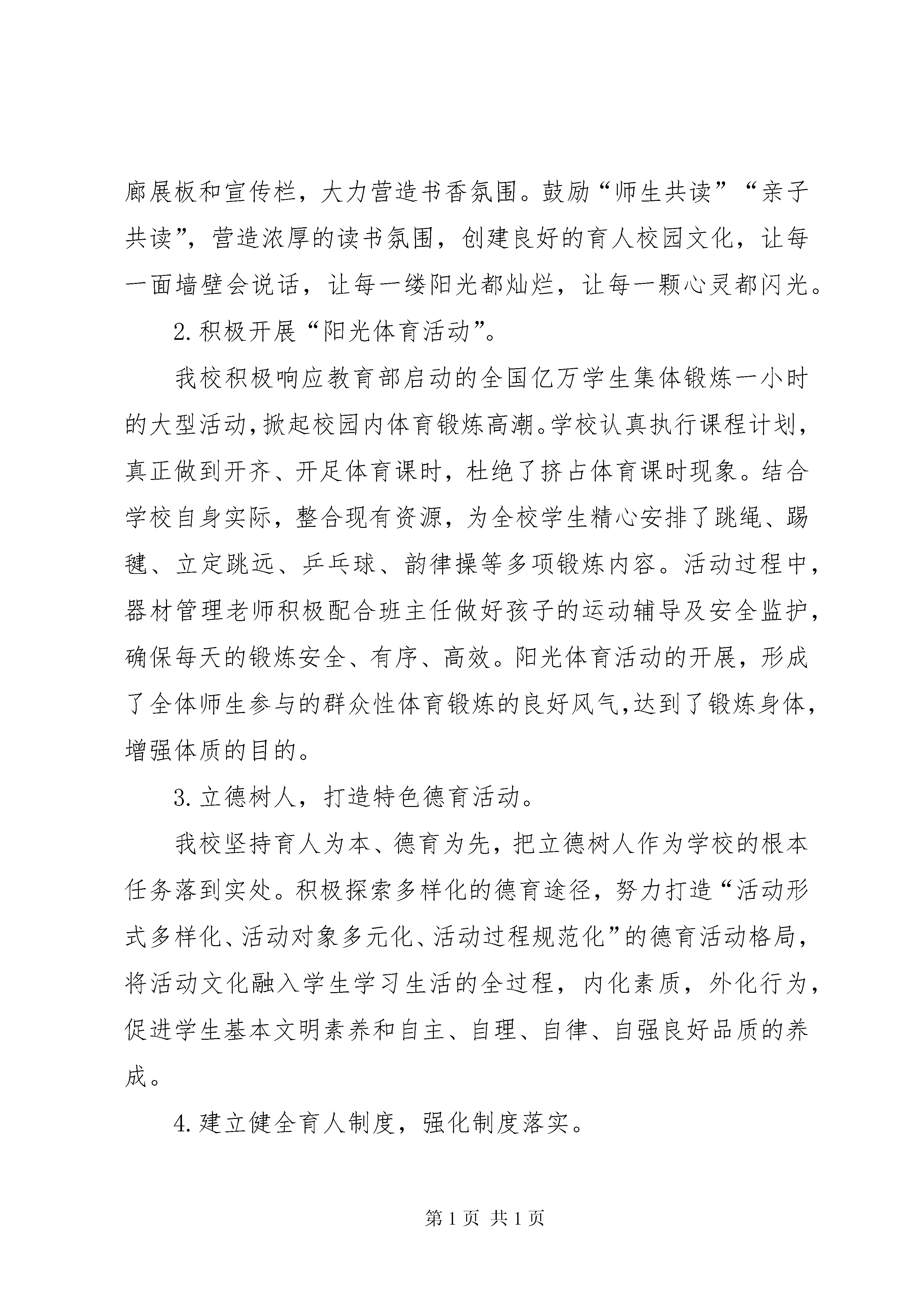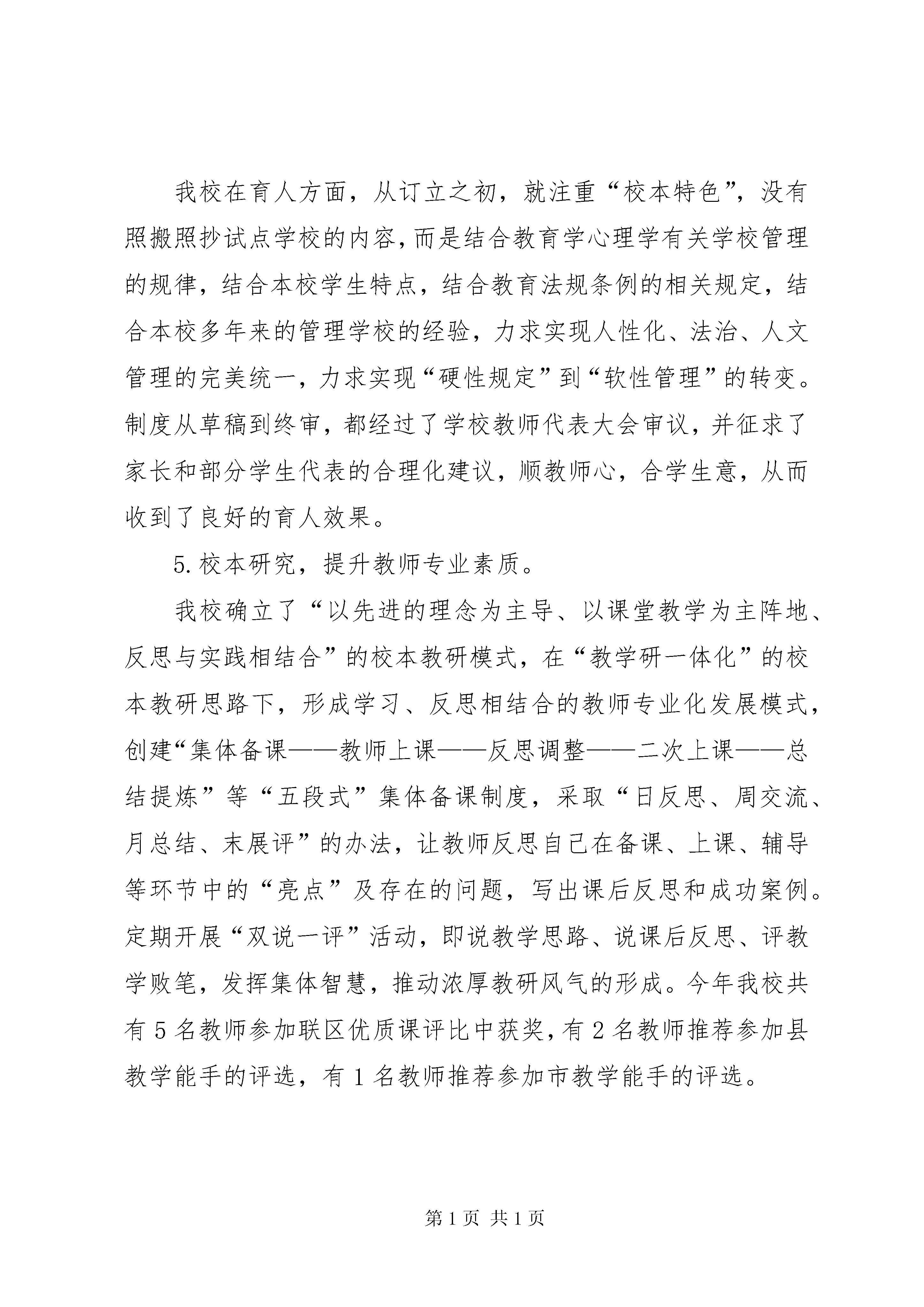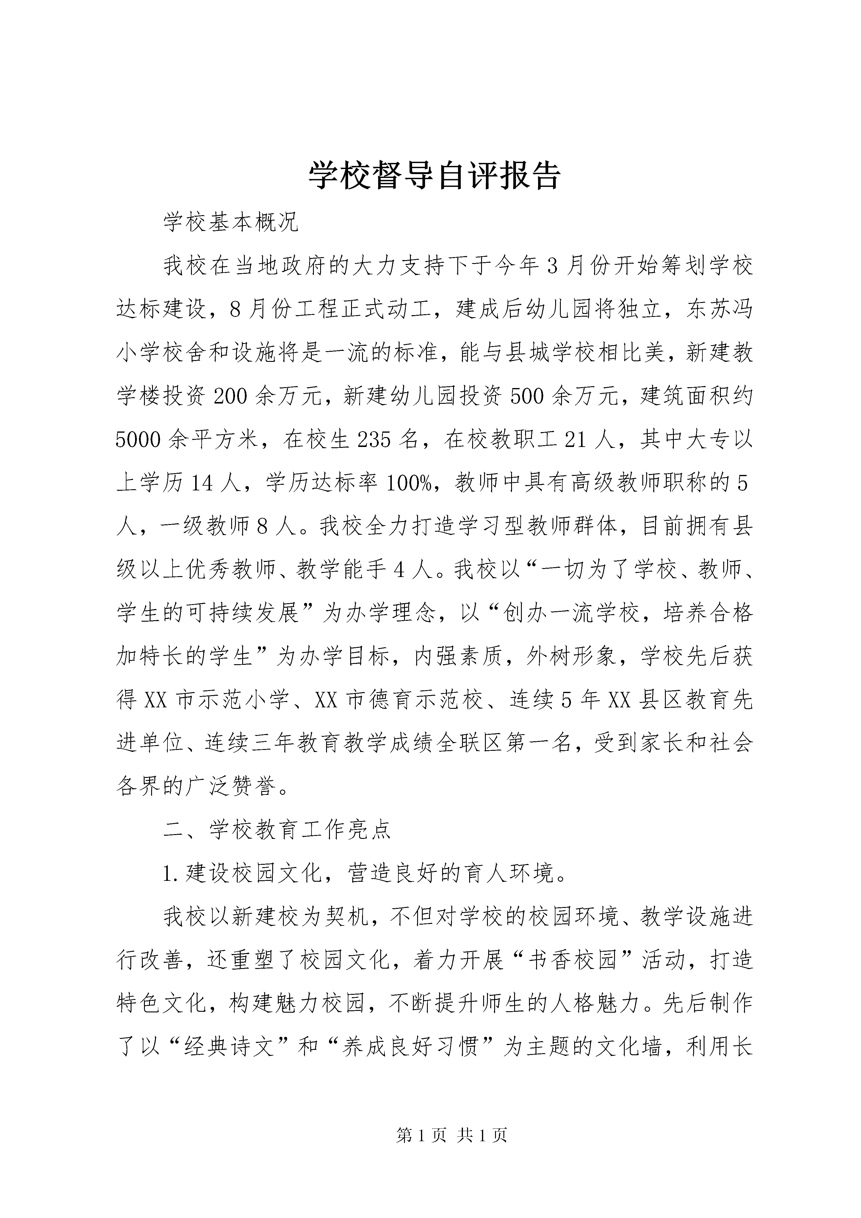 学校督导自评报告学校基本概况我校在当地政府的大力支持下于今年3月份开始筹划学校达标建设,8月份工程正式动工,建成后幼儿园将独立,东苏冯小学校舍和设施将是一流的标准,能与县城学校相比美,新建教学楼投资200余万元,新建幼儿园投资500余万元,建筑面积约5000余平方米,在校生235名,在校教职工21人,其中大专以上学历14人,学历达标率100%,教师中具有高级教师职称的5人,一级教师8人。我校全力打造学习型教师群体,目前拥有县级以上优秀教师、教学能手4人。我校以“一切为了学校、教师、学生的可持续发展”为办学理念,以“创办一流学校,培养合格加特长的学生”为办学目标,内强素质,外树形象,学校先后获得XX市示范小学、XX市德育示范校、连续5年XX县区教育先进单位、连续三年教育教学成绩全联区第一名,受到家长和社会各界的广泛赞誉。二、学校教育工作亮点1.建设校园文化,营造良好的育人环境。我校以新建校为契机,不但对学校的校园环境、教学设施进行改善,还重塑了校园文化,着力开展“书香校园”活动,打造特色文化,构建魅力校园,不断提升师生的人格魅力。先后制作了以“经典诗文”和“养成良好习惯”为主题的文化墙,利用长廊展板和宣传栏,大力营造书香氛围。鼓励“师生共读”“亲子共读”,营造浓厚的读书氛围,创建良好的育人校园文化,让每一面墙壁会说话,让每一缕阳光都灿烂,让每一颗心灵都闪光。2.积极开展“阳光体育活动”。我校积极响应教育部启动的全国亿万学生集体锻炼一小时的大型活动,掀起校园内体育锻炼高潮。学校认真执行课程计划,真正做到开齐、开足体育课时,杜绝了挤占体育课时现象。结合学校自身实际,整合现有资源,为全校学生精心安排了跳绳、踢毽、立定跳远、乒乓球、韵律操等多项锻炼内容。活动过程中,器材管理老师积极配合班主任做好孩子的运动辅导及安全监护,确保每天的锻炼安全、有序、高效。阳光体育活动的开展,形成了全体师生参与的群众性体育锻炼的良好风气,达到了锻炼身体,增强体质的目的。3.立德树人,打造特色德育活动。我校坚持育人为本、德育为先,把立德树人作为学校的根本任务落到实处。积极探索多样化的德育途径,努力打造“活动形式多样化、活动对象多元化、活动过程规范化”的德育活动格局,将活动文化融入学生学习生活的全过程,内化素质,外化行为,促进学生基本文明素养和自主、自理、自律、自强良好品质的养成。4.建立健全育人制度,强化制度落实。我校在育人方面,从订立之初,就注重“校本特色”,没有照搬照抄试点学校的内容,而是结合教育学心理学有关学校管理的规律,结合本校学生特点,结合教育法规条例的相关规定,结合本校多年来的管理学校的经验,力求实现人性化、法治、人文管理的完美统一,力求实现“硬性规定”到“软性管理”的转变。制度从草稿到终审,都经过了学校教师代表大会审议,并征求了家长和部分学生代表的合理化建议,顺教师心,合学生意,从而收到了良好的育人效果。5.校本研究,提升教师专业素质。我校确立了“以先进的理念为主导、以课堂教学为主阵地、反思与实践相结合”的校本教研模式,在“教学研一体化”的校本教研思路下,形成学习、反思相结合的教师专业化发展模式,创建“集体备课——教师上课——反思调整——二次上课——总结提炼”等“五段式”集体备课制度,采取“日反思、周交流、月总结、末展评”的办法,让教师反思自己在备课、上课、辅导等环节中的“亮点”及存在的问题,写出课后反思和成功案例。定期开展“双说一评”活动,即说教学思路、说课后反思、评教学败笔,发挥集体智慧,推动浓厚教研风气的形成。今年我校共有5名教师参加联区优质课评比中获奖,有2名教师推荐参加县教学能手的评选,有1名教师推荐参加市教学能手的评选。