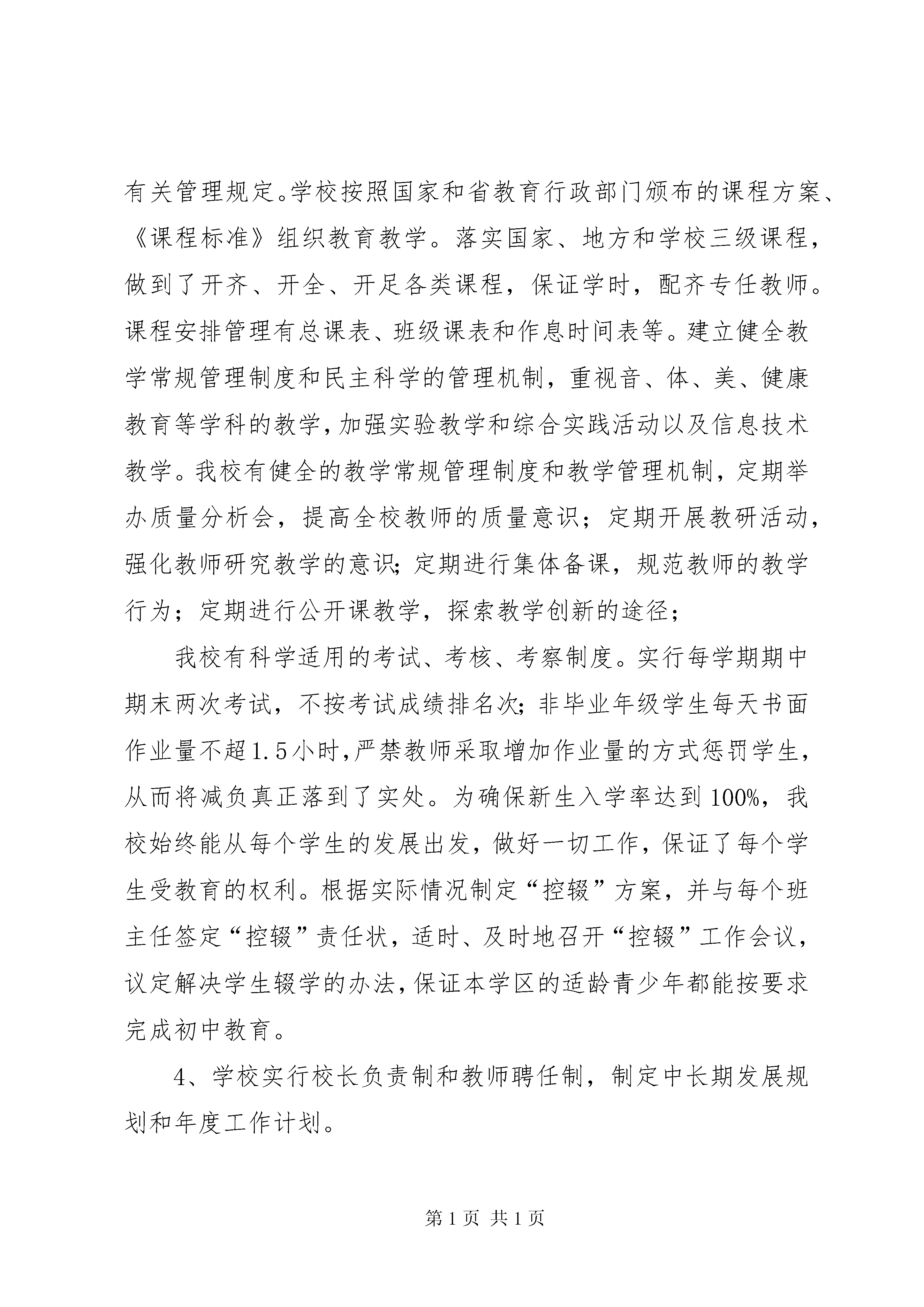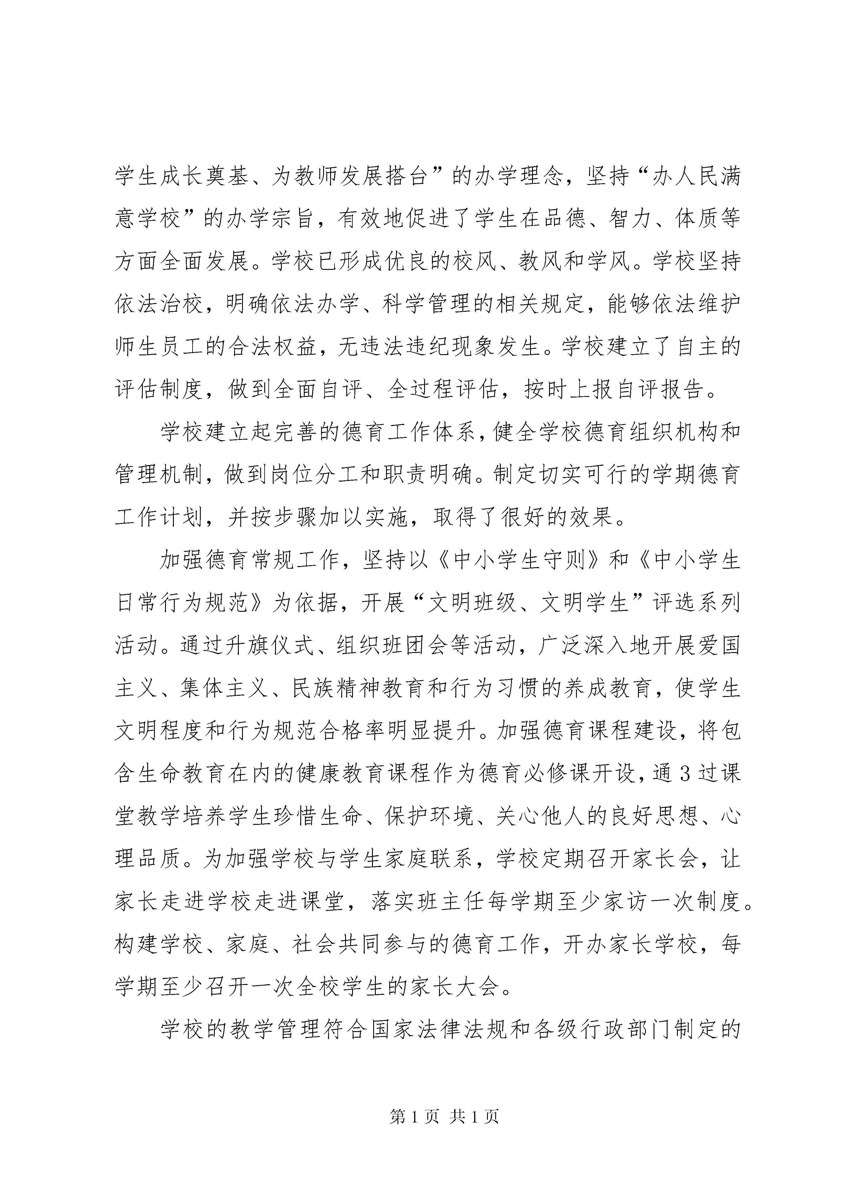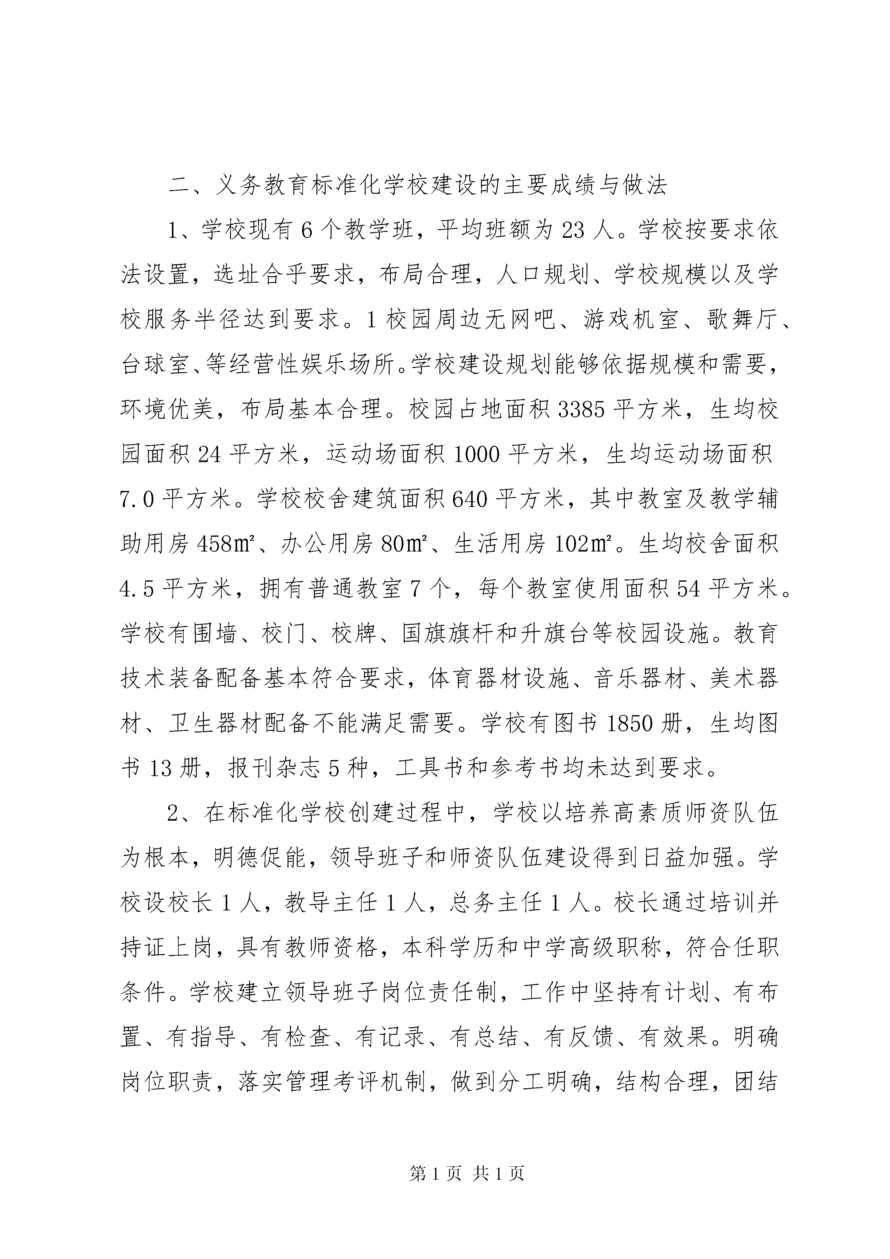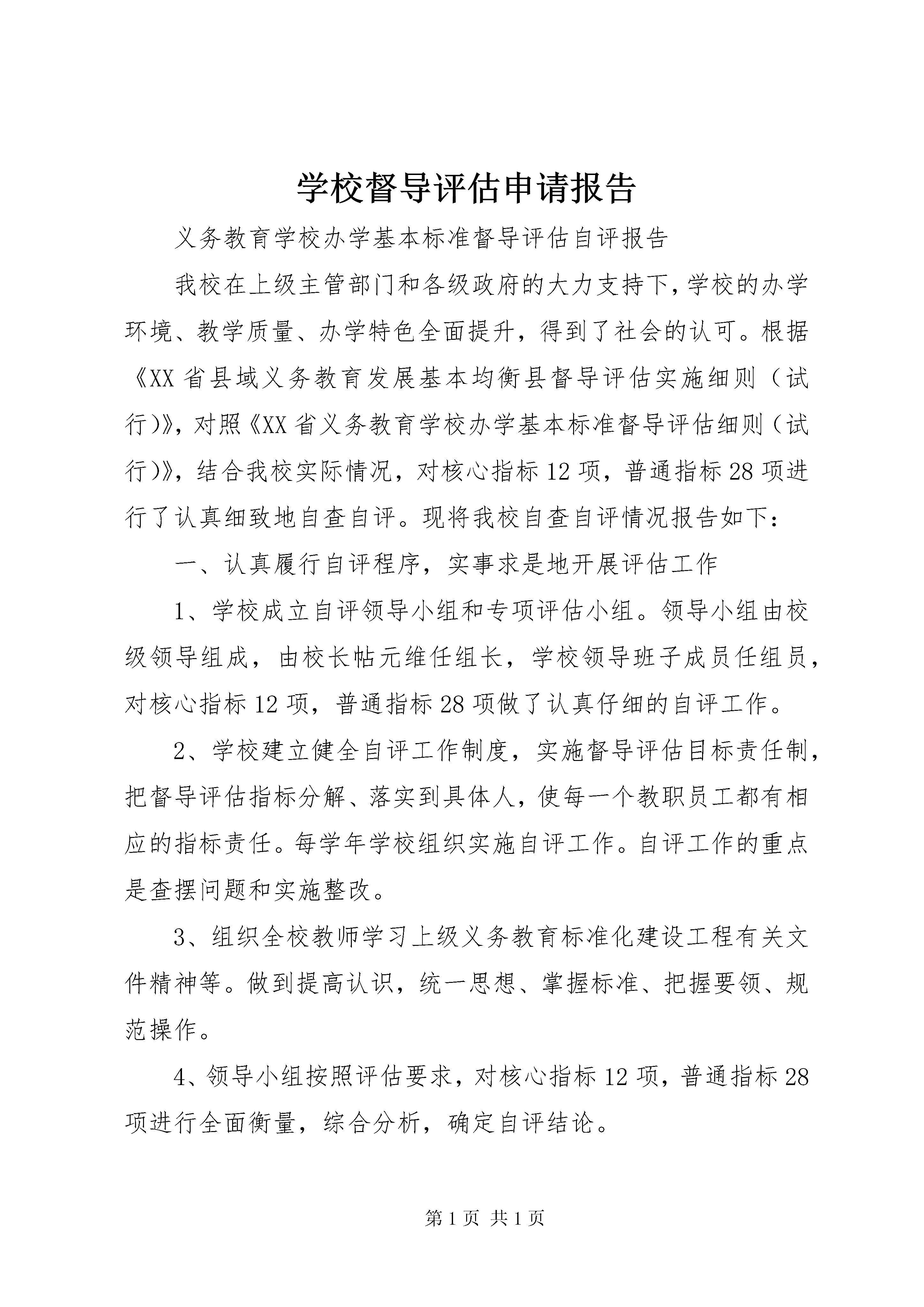 学校督导评估申请报告义务教育学校办学基本标准督导评估自评报告我校在上级主管部门和各级政府的大力支持下,学校的办学环境、教学质量、办学特色全面提升,得到了社会的认可。根据《XX省县域义务教育发展基本均衡县督导评估实施细则(试行)》,对照《XX省义务教育学校办学基本标准督导评估细则(试行)》,结合我校实际情况,对核心指标12项,普通指标28项进行了认真细致地自查自评。现将我校自查自评情况报告如下:一、认真履行自评程序,实事求是地开展评估工作1、学校成立自评领导小组和专项评估小组。领导小组由校级领导组成,由校长帖元维任组长,学校领导班子成员任组员,对核心指标12项,普通指标28项做了认真仔细的自评工作。2、学校建立健全自评工作制度,实施督导评估目标责任制,把督导评估指标分解、落实到具体人,使每一个教职员工都有相应的指标责任。每学年学校组织实施自评工作。自评工作的重点是查摆问题和实施整改。3、组织全校教师学习上级义务教育标准化建设工程有关文件精神等。做到提高认识,统一思想、掌握标准、把握要领、规范操作。4、领导小组按照评估要求,对核心指标12项,普通指标28项进行全面衡量,综合分析,确定自评结论。二、义务教育标准化学校建设的主要成绩与做法1、学校现有6个教学班,平均班额为23人。学校按要求依法设置,选址合乎要求,布局合理,人口规划、学校规模以及学校服务半径达到要求。1校园周边无网吧、游戏机室、歌舞厅、台球室、等经营性娱乐场所。学校建设规划能够依据规模和需要,环境优美,布局基本合理。校园占地面积3385平方米,生均校园面积24平方米,运动场面积1000平方米,生均运动场面积7.0平方米。学校校舍建筑面积640平方米,其中教室及教学辅助用房458㎡、办公用房80㎡、生活用房102㎡。生均校舍面积4.5平方米,拥有普通教室7个,每个教室使用面积54平方米。学校有围墙、校门、校牌、国旗旗杆和升旗台等校园设施。教育技术装备配备基本符合要求,体育器材设施、音乐器材、美术器材、卫生器材配备不能满足需要。学校有图书1850册,生均图书13册,报刊杂志5种,工具书和参考书均未达到要求。2、在标准化学校创建过程中,学校以培养高素质师资队伍为根本,明德促能,领导班子和师资队伍建设得到日益加强。学校设校长1人,教导主任1人,总务主任1人。校长通过培训并持证上岗,具有教师资格,本科学历和中学高级职称,符合任职条件。学校建立领导班子岗位责任制,工作中坚持有计划、有布置、有指导、有检查、有记录、有总结、有反馈、有效果。明确岗位职责,落实管理考评机制,做到分工明确,结构合理,团结协作,有民主平等的交流氛围和科学决策能力,在师生中享有较高威信,群众满意率达98%以上。学校把教师队伍建设作为办学的永恒主题。各学科专任教师配备基本齐全,实行教师资格制度和教师聘任制,所有教师全部具有国家规定教师资格。教师学历结构符合要求,我校有9名教师,其中,本科学历2人,占总数的22%;专科学历4人,占总数的44%。有县园丁1人、镇先进教师2人,占总数的33%。全体教师参培率100%。学历达标率100%;教师职务的学科分布基本合理。为加强教师队伍的管理,学校建立起教师岗位责任制,实行教师2聘任制,有教师考核制度,年度考核合格率达到100%。建立健全了教职工的晋职晋级、奖惩制度,并能有效实施。建立教职工业务档案制度和定期培训制度。学校基本做到依法落实教师待遇,维护教师合法权益。强化师德师风建设,学校重视师德师风建设,并纳入教师管理,形成制度。引导教师尊重学生人格,平等对待学生,关注学生心理发展特点和个性差异,教师遵守并严格执行职业道德规范,有效地控制了歧视学生、实施体罚和变相体罚、侮辱学生尊严和侵犯学生合法权益的行为发生。学生、家长、社会对教师整体师德师风状况评价良好,群众满意度98%以上。3、学校始终坚持正确的办学方向,全面贯彻教育方针,全面实施素质教育。关爱每一名学生,坚持以人为本,积极倡导“为学生成长奠基、为教师发展搭台”的办学理念,坚持“办人民满意学校”的办学宗旨,有效地促进了学生在品德、智力、体质等方面全面发展。学校已形成优良的校风、教风和学风。学校坚持依法治校,明确依法办学、科学管理的相关规定,能够依法维护师生员工的合法权益,无违法违纪现象发生。学校建立了自主的评估制度,做到全面自评、全过程评估,按时上报自评报告。学校建立起完善的德育工作体系,健全学校德育组织机构和管理机制,做到岗位分工和职责明确。制定切实可行的学期德育工作计划,并按步骤加以实施,取得了很好的效果。加强德育常规工作,坚持以《中小学生守则》和《中小学生日常行为规范》为依据,开展“文明班级、文明学生”评选系列活动。通过升旗仪式、组织班团会等活动,广泛深入地开展爱国主义、集体主义、民族精神教