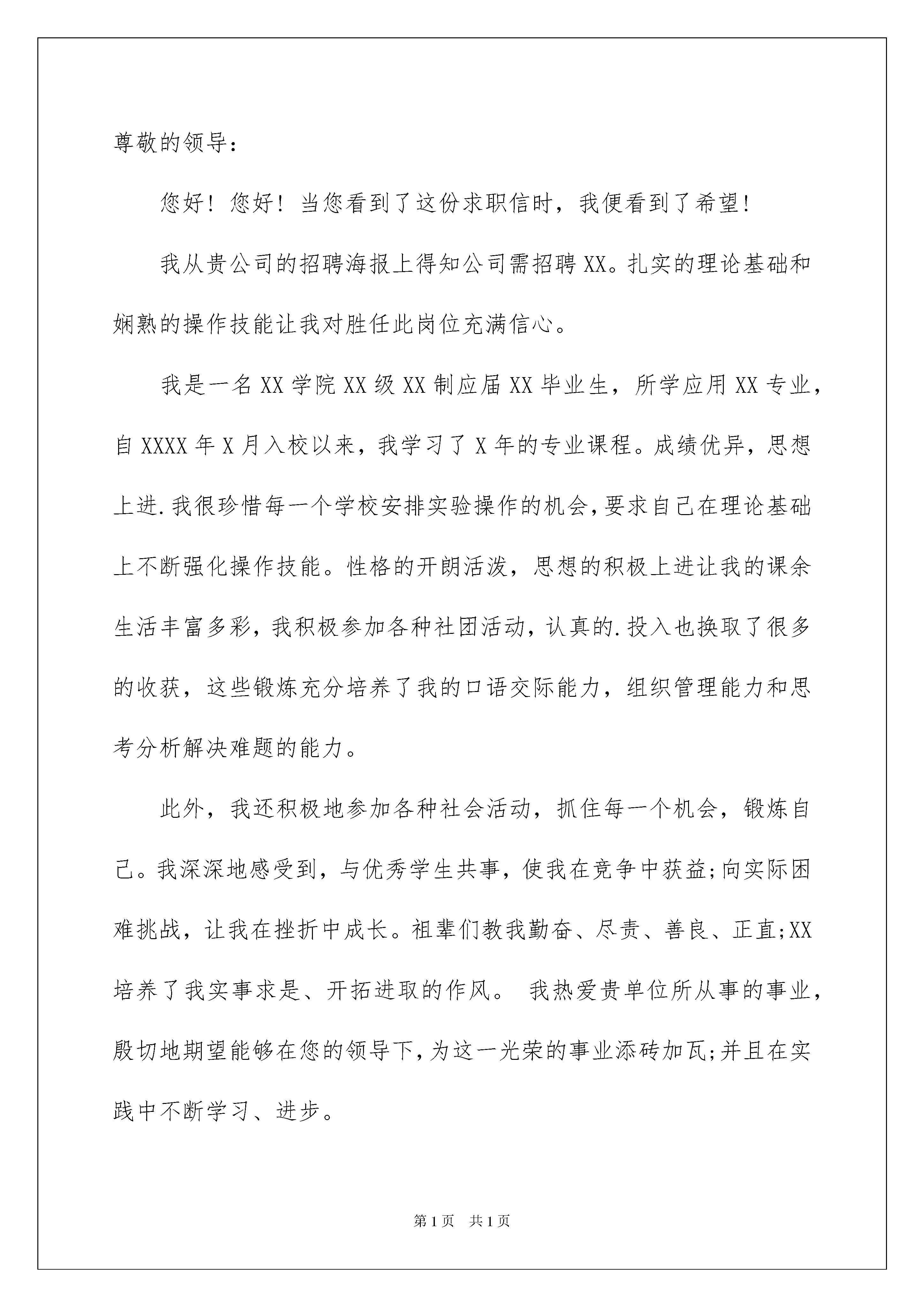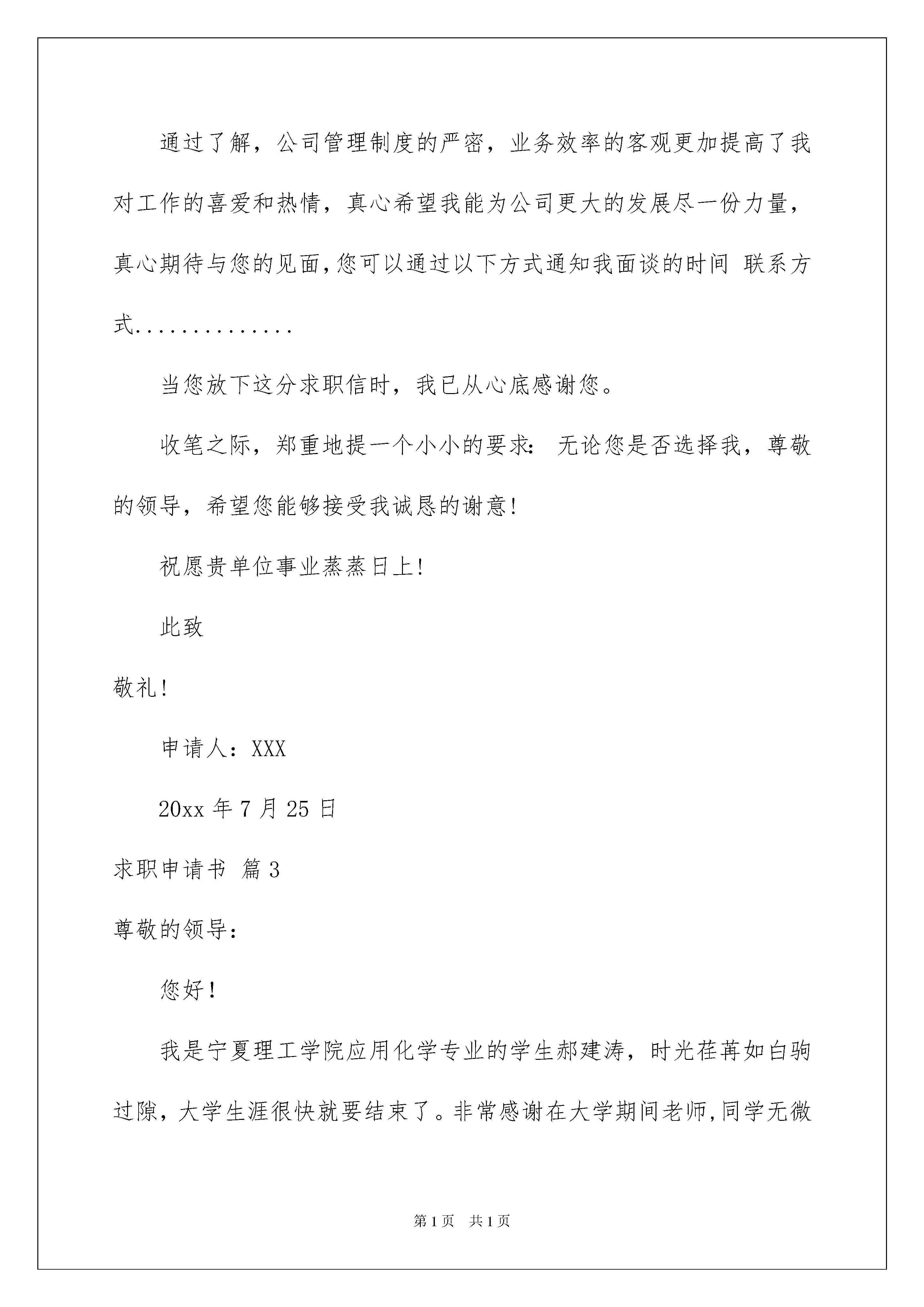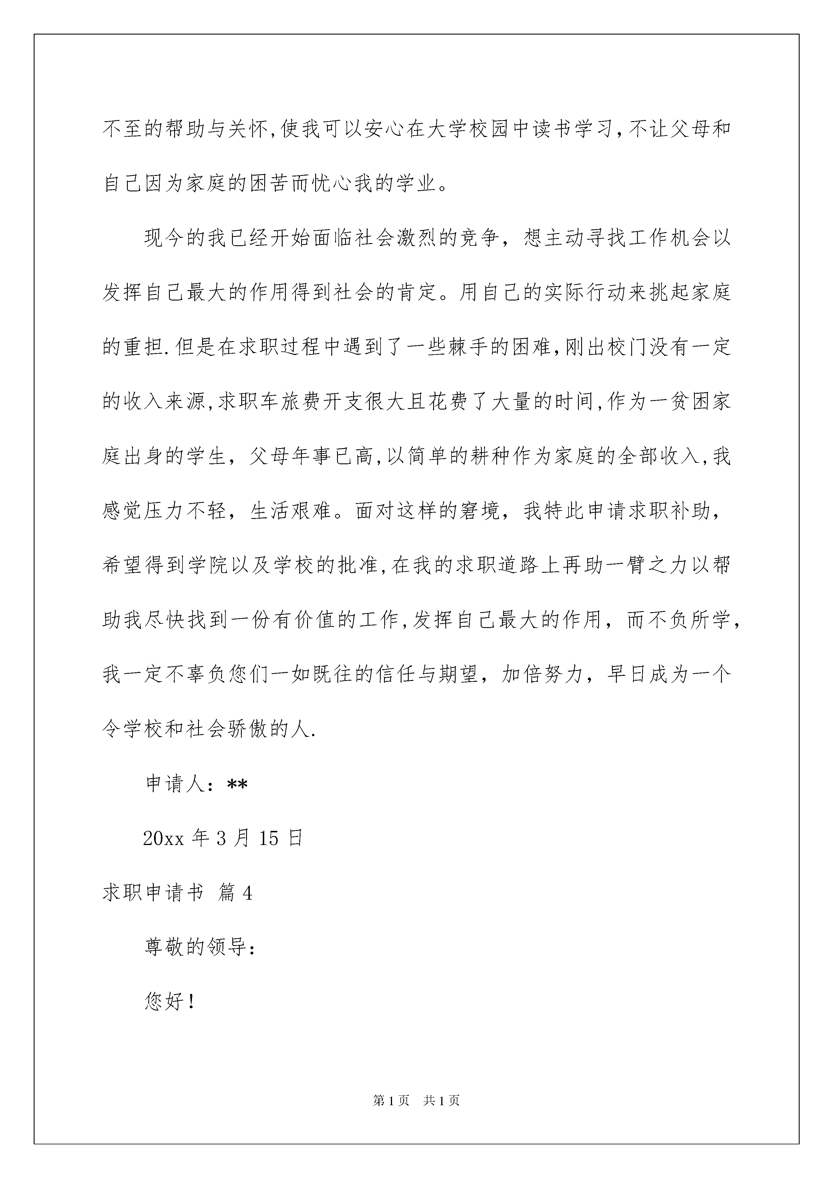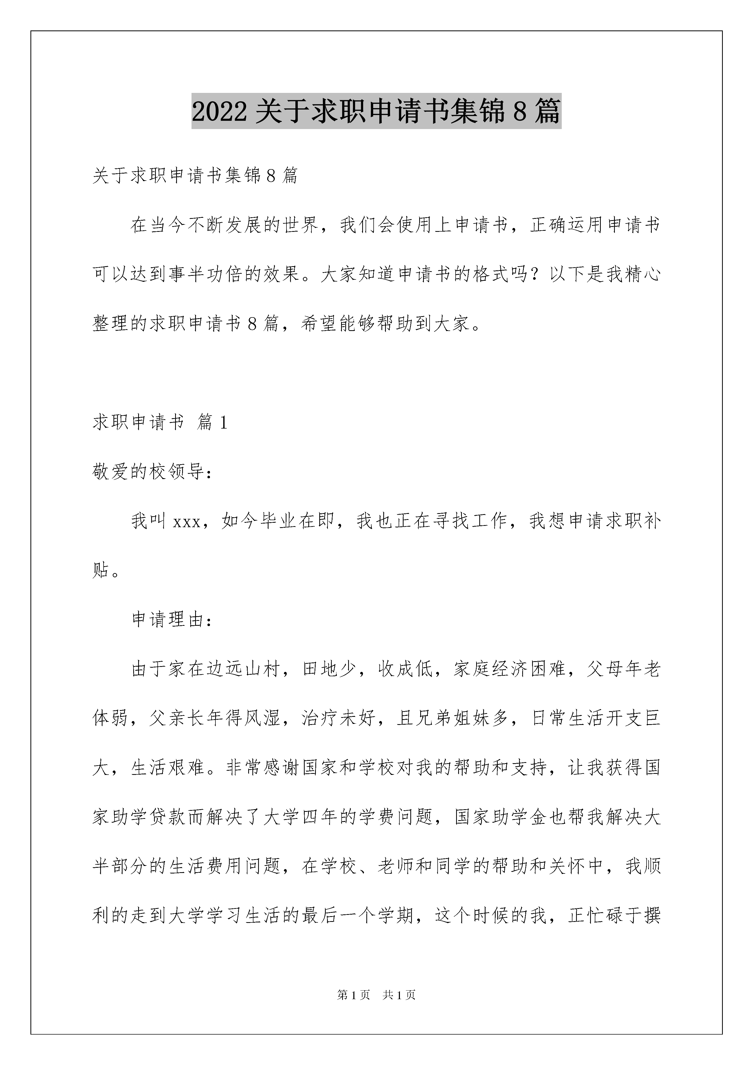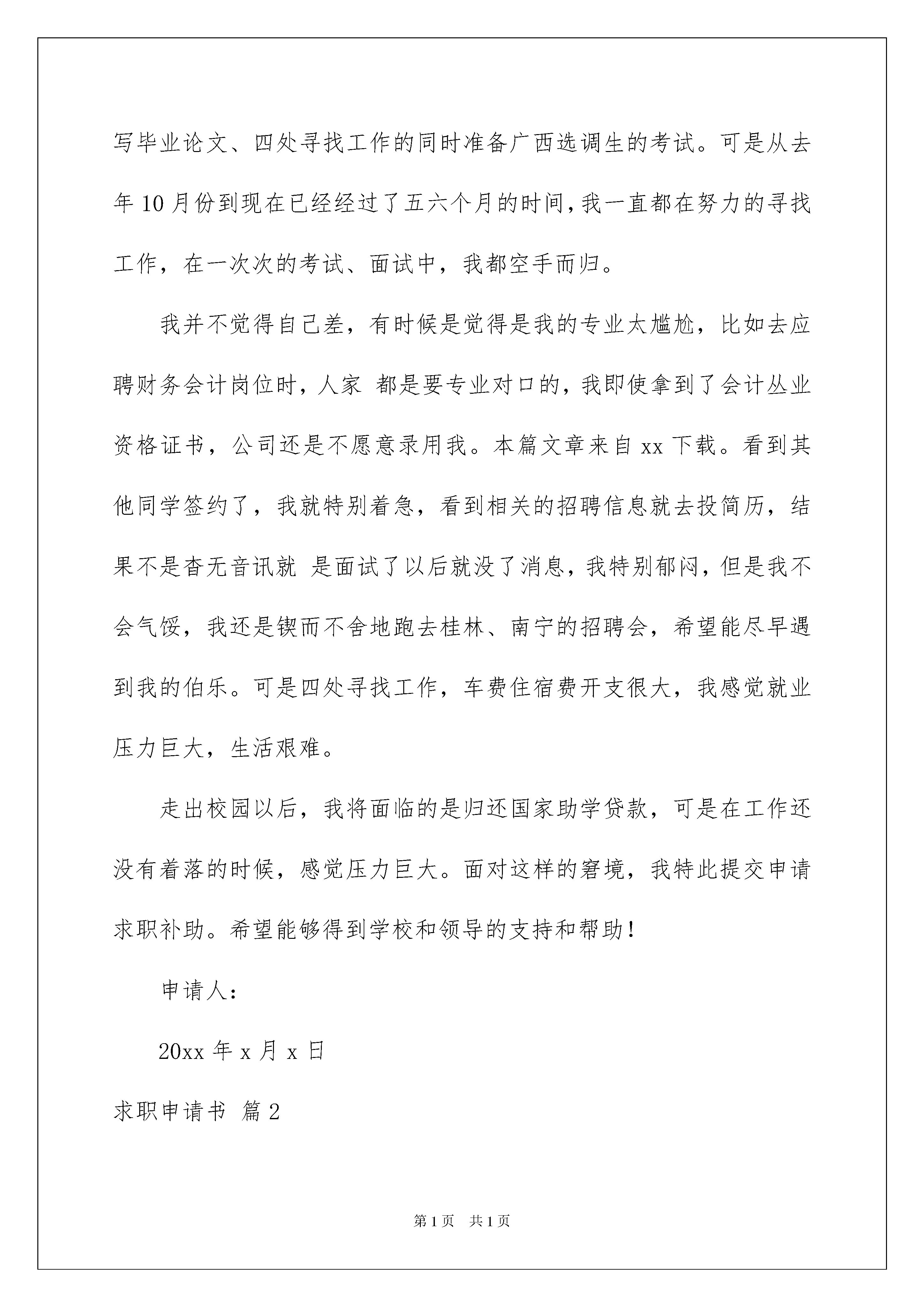 2022关于求职申请书集锦8篇关于求职申请书集锦8篇在当今不断发展的世界,我们会使用上申请书,正确运用申请书可以达到事半功倍的效果。大家知道申请书的格式吗?以下是我精心整理的求职申请书8篇,希望能够帮助到大家。求职申请书篇1敬爱的校领导:我叫xxx,如今毕业在即,我也正在寻找工作,我想申请求职补贴。申请理由:由于家在边远山村,田地少,收成低,家庭经济困难,父母年老体弱,父亲长年得风湿,治疗未好,且兄弟姐妹多,日常生活开支巨大,生活艰难。非常感谢国家和学校对我的帮助和支持,让我获得国家助学贷款而解决了大学四年的学费问题,国家助学金也帮我解决大半部分的生活费用问题,在学校、老师和同学的帮助和关怀中,我顺利的走到大学学习生活的最后一个学期,这个时候的我,正忙碌于撰写毕业论文、四处寻找工作的同时准备广西选调生的考试。可是从去年10月份到现在已经经过了五六个月的时间,我一直都在努力的寻找工作,在一次次的考试、面试中,我都空手而归。我并不觉得自己差,有时候是觉得是我的专业太尴尬,比如去应聘财务会计岗位时,人家都是要专业对口的,我即使拿到了会计丛业资格证书,公司还是不愿意录用我。本篇文章来自xx下载。看到其他同学签约了,我就特别着急,看到相关的招聘信息就去投简历,结果不是杳无音讯就是面试了以后就没了消息,我特别郁闷,但是我不会气馁,我还是锲而不舍地跑去桂林、南宁的招聘会,希望能尽早遇到我的伯乐。可是四处寻找工作,车费住宿费开支很大,我感觉就业压力巨大,生活艰难。走出校园以后,我将面临的是归还国家助学贷款,可是在工作还没有着落的时候,感觉压力巨大。面对这样的窘境,我特此提交申请求职补助。希望能够得到学校和领导的支持和帮助!申请人:20xx年x月x日求职申请书篇2尊敬的领导:您好!您好!当您看到了这份求职信时,我便看到了希望!我从贵公司的招聘海报上得知公司需招聘XX。扎实的理论基础和娴熟的操作技能让我对胜任此岗位充满信心。我是一名XX学院XX级XX制应届XX毕业生,所学应用XX专业,自XXXX年X月入校以来,我学习了X年的专业课程。成绩优异,思想上进.我很珍惜每一个学校安排实验操作的机会,要求自己在理论基础上不断强化操作技能。性格的开朗活泼,思想的积极上进让我的课余生活丰富多彩,我积极参加各种社团活动,认真的.投入也换取了很多的收获,这些锻炼充分培养了我的口语交际能力,组织管理能力和思考分析解决难题的能力。此外,我还积极地参加各种社会活动,抓住每一个机会,锻炼自己。我深深地感受到,与优秀学生共事,使我在竞争中获益;向实际困难挑战,让我在挫折中成长。祖辈们教我勤奋、尽责、善良、正直;XX培养了我实事求是、开拓进取的作风。我热爱贵单位所从事的事业,殷切地期望能够在您的领导下,为这一光荣的事业添砖加瓦;并且在实践中不断学习、进步。通过了解,公司管理制度的严密,业务效率的客观更加提高了我对工作的喜爱和热情,真心希望我能为公司更大的发展尽一份力量,真心期待与您的见面,您可以通过以下方式通知我面谈的时间联系方式..............当您放下这分求职信时,我已从心底感谢您。收笔之际,郑重地提一个小小的要求:无论您是否选择我,尊敬的领导,希望您能够接受我诚恳的谢意!祝愿贵单位事业蒸蒸日上!此致敬礼!申请人:XXX20xx年7月25日求职申请书篇3尊敬的领导:您好!我是宁夏理工学院应用化学专业的学生郝建涛,时光荏苒如白驹过隙,大学生涯很快就要结束了。非常感谢在大学期间老师,同学无微不至的帮助与关怀,使我可以安心在大学校园中读书学习,不让父母和自己因为家庭的困苦而忧心我的学业。现今的我已经开始面临社会激烈的竞争,想主动寻找工作机会以发挥自己最大的作用得到社会的肯定。用自己的实际行动来挑起家庭的重担.但是在求职过程中遇到了一些棘手的困难,刚出校门没有一定的收入来源,求职车旅费开支很大且花费了大量的时间,作为一贫困家庭出身的学生,父母年事已高,以简单的耕种作为家庭的全部收入,我感觉压力不轻,生活艰难。面对这样的窘境,我特此申请求职补助,希望得到学院以及学校的批准,在我的求职道路上再助一臂之力以帮助我尽快找到一份有价值的工作,发挥自己最大的作用,而不负所学,我一定不辜负您们一如既往的信任与期望,加倍努力,早日成为一个令学校和社会骄傲的人.申请人:**20xx年3月15日求职申请书篇4尊敬的领导:您好!我是集美轻工业学校机修的一名学生.集美轻工业学校近几年不断加大对机械制造与控制和数控技术应用等重点专业的建设的投入,全校机电类相关专业实验和实训部门整合后,独立建成校内机电专业实训基地――机电实训中心,并与浙江大