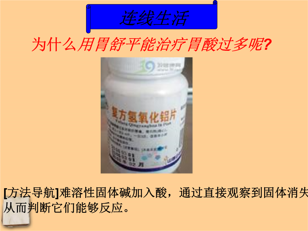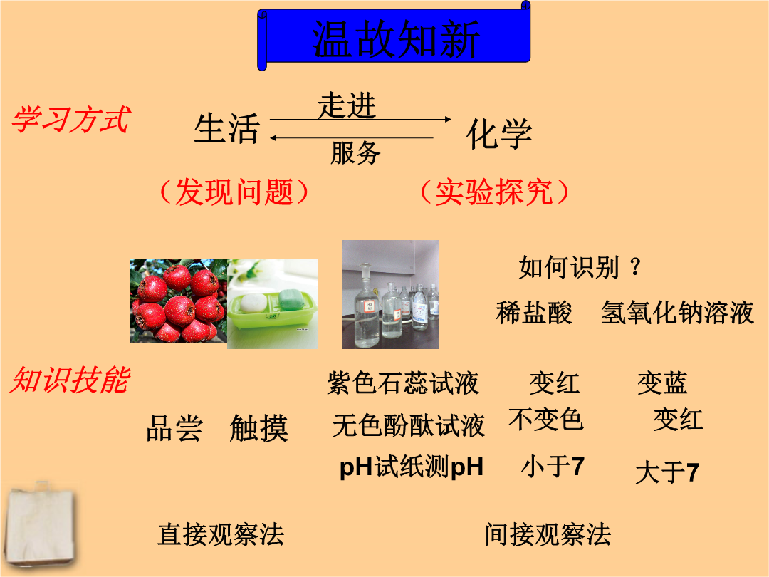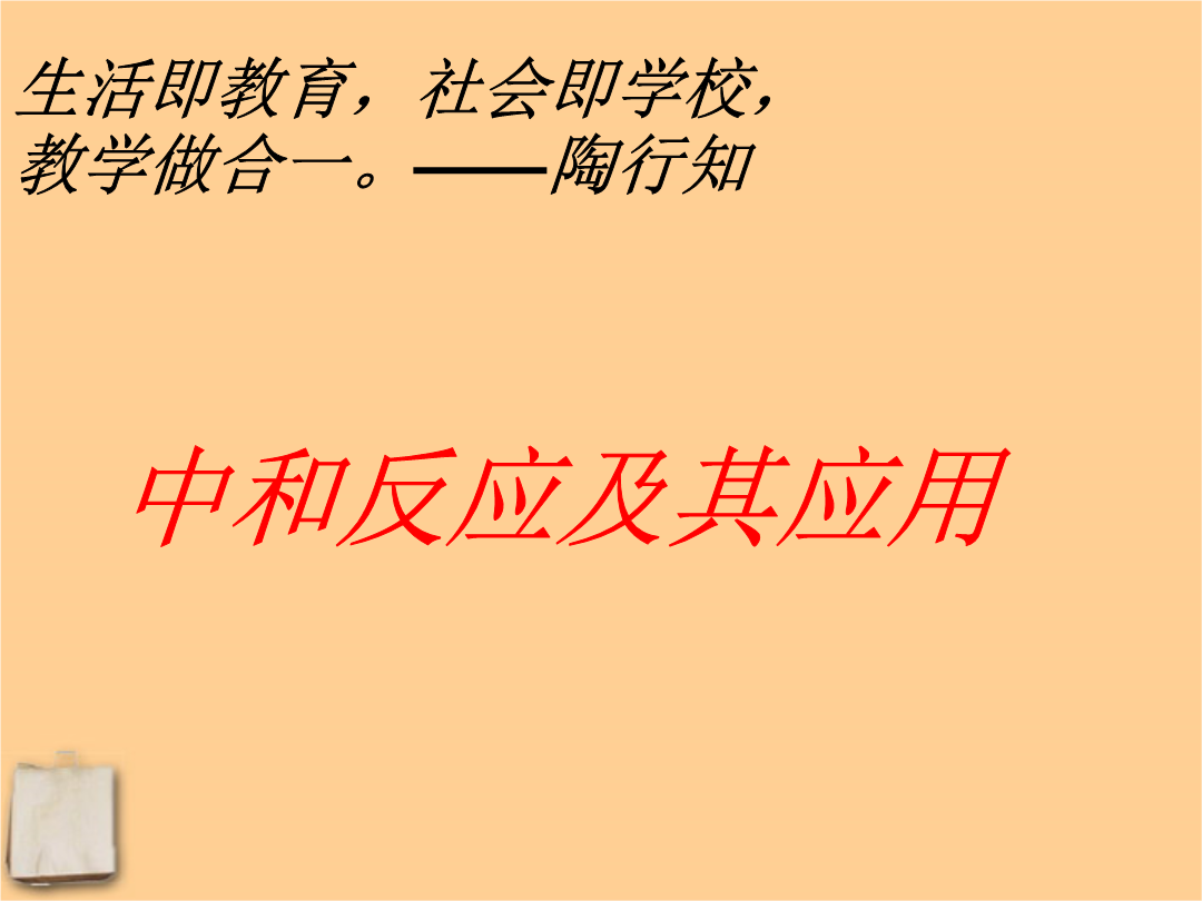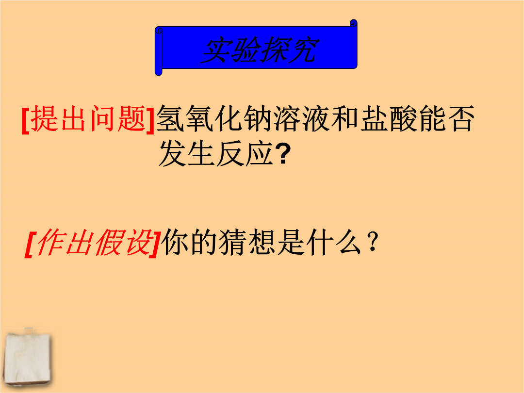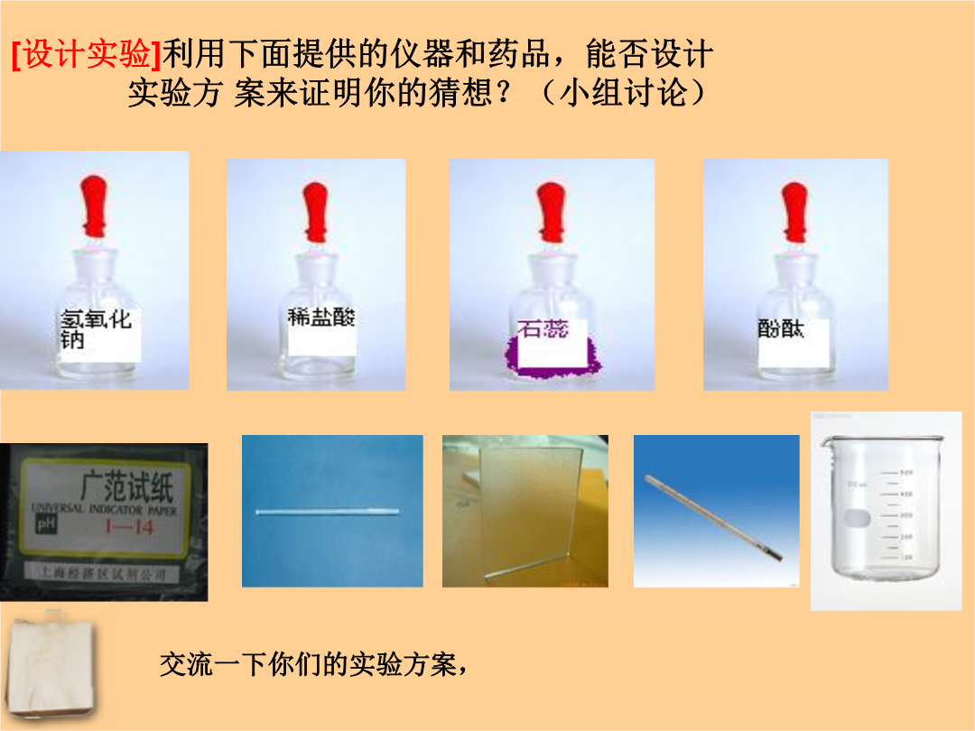 生活即教育,社会即学校,教学做合一。——陶行知生活连线生活实验探究[设计实验]利用下面提供的仪器和药品,能否设计实验方案来证明你的猜想?(小组讨论)[验证假设]选择一种可行的方案,进行实验(友情提示)1.酸和碱都有腐蚀性,实验时要注意安全!2.节约药品,酸碱指示剂2~3滴盐酸和氢氧化钠反应过程中溶液酸碱性的变化向盛有10ml稀盐酸的烧杯中逐滴滴加氢氧化钠溶液,用PH计测定溶液的PH,得到的数据如下表所示[问题]为什么氢氧化钠溶液和盐酸恰好完全反应时,溶液显中性?盐酸中的H+和氢氧化钠溶液OH-哪去呢?课堂小结挑战自我——体验成功二、[实验反思]——化学离不开实验3.下列变化不能表明盐酸与氢氧化钠发生了反应的是()A.向氢氧化钠溶液中加入盐酸后,混合溶液的温度升高B.向氢氧化钠溶液中加入盐酸后,混合溶液的质量增大C.向滴有酚酞的氢氧化钠溶液中加入盐酸后,红色褪去D.向氢氧化钠溶液中加入盐酸后,混合溶液的pH<74.在实验室里,欲使碱性溶液变成中性,下列试剂中最好选用哪一种组合()①NaOH溶液②稀盐酸③石灰水④酚酞试液A.①或③B.只有②C.只有①D.②和④5.在滴有酚酞的NaOH稀溶液中,加入足量盐酸,加酸前后溶液颜色依次为()A.红色、无色B.无色、红色C.红色、蓝色D.蓝色、无色6.某同学为证明氢氧化钠和盐酸能否发生反应,做了如下实验:在试管中加入2~3ml稀盐酸,再滴入1~2滴酚酞溶液。再用胶头滴管慢慢滴入氢氧化钠溶液,并不断振荡,至溶液变成红色为止。试回答下列问题:⑴实验中能说明氢氧化钠和盐酸发生化学反应的现象是。⑵有同学认为,当酚酞刚好变成红色时,说明氢氧化钠和盐酸恰好完全反应,你同意他的意见吗?说明理由。三、[实验创新]创造者才是真正的享受者7.革命先烈方志敏在国民党反动派的监狱中,为了将情报送给党组织,用米汤在白纸上写字,别人看不见,但当用碘酒涂在信纸上后,字便会显示出来,这是因为米汤含有淀粉,碘酒含有碘,而无色的淀粉溶液遇到碘会变蓝色。小明同学在听了这一故事以后,也想写一封“密信”,但他又不想再用上面的方法。同学们,运用你所学的化学知识帮帮小明,告诉他,用写字,用显字,其原理是。看完“密信”,想要字迹消失可再涂用其原理又是要解放孩子的头脑、双手、脚、空间、时间,使他们充分得到自由的生活,从自由的生活中得到真正的教育。——陶行知