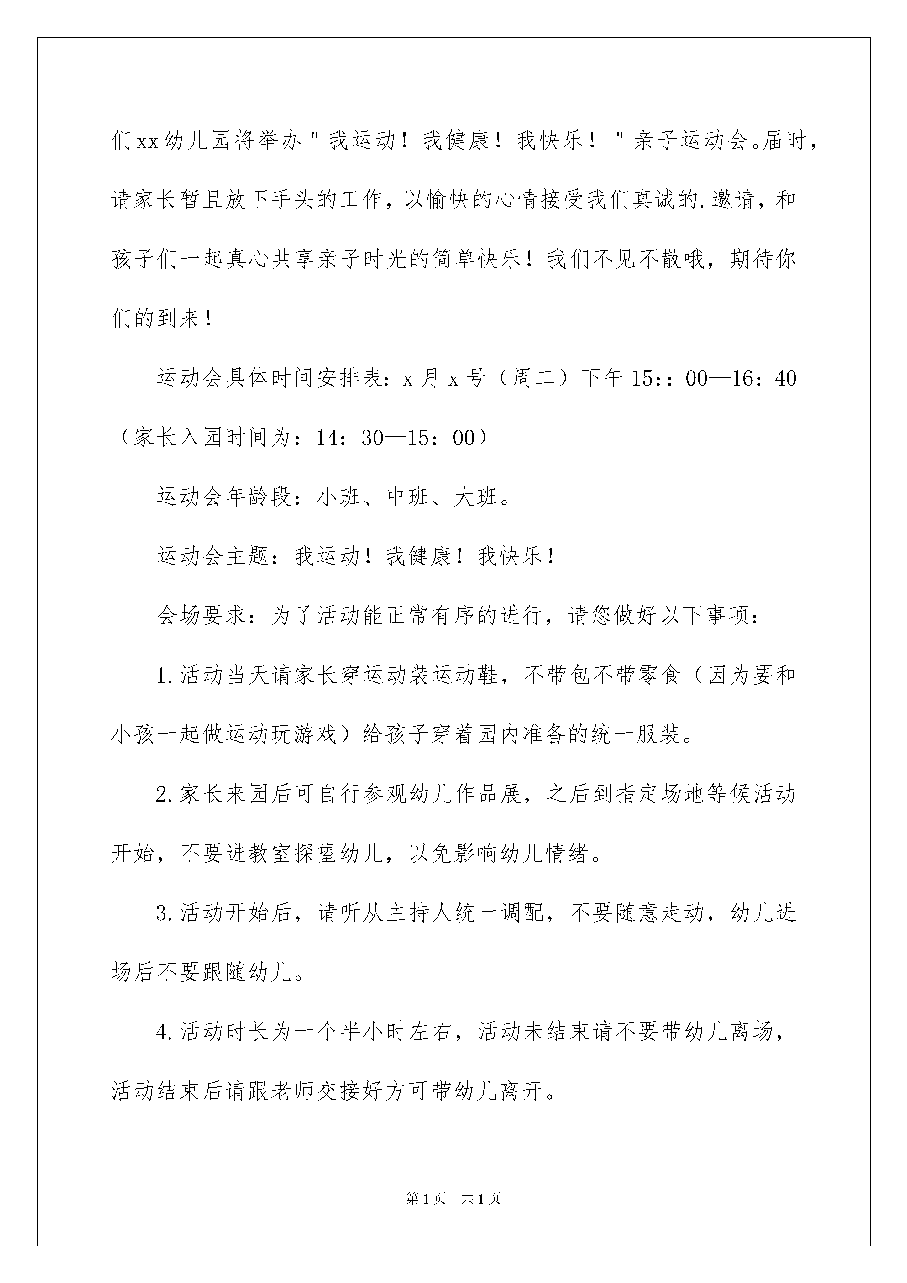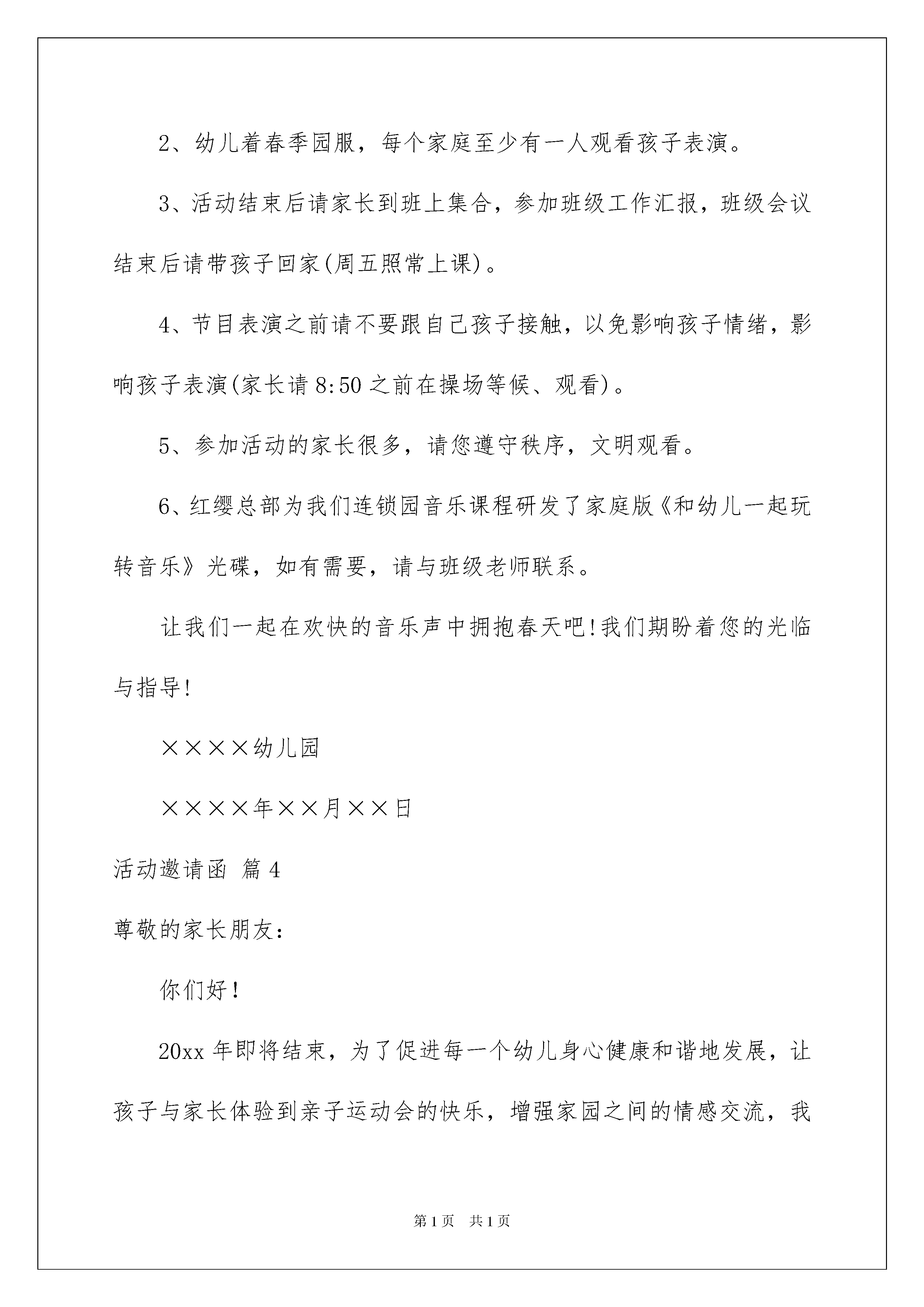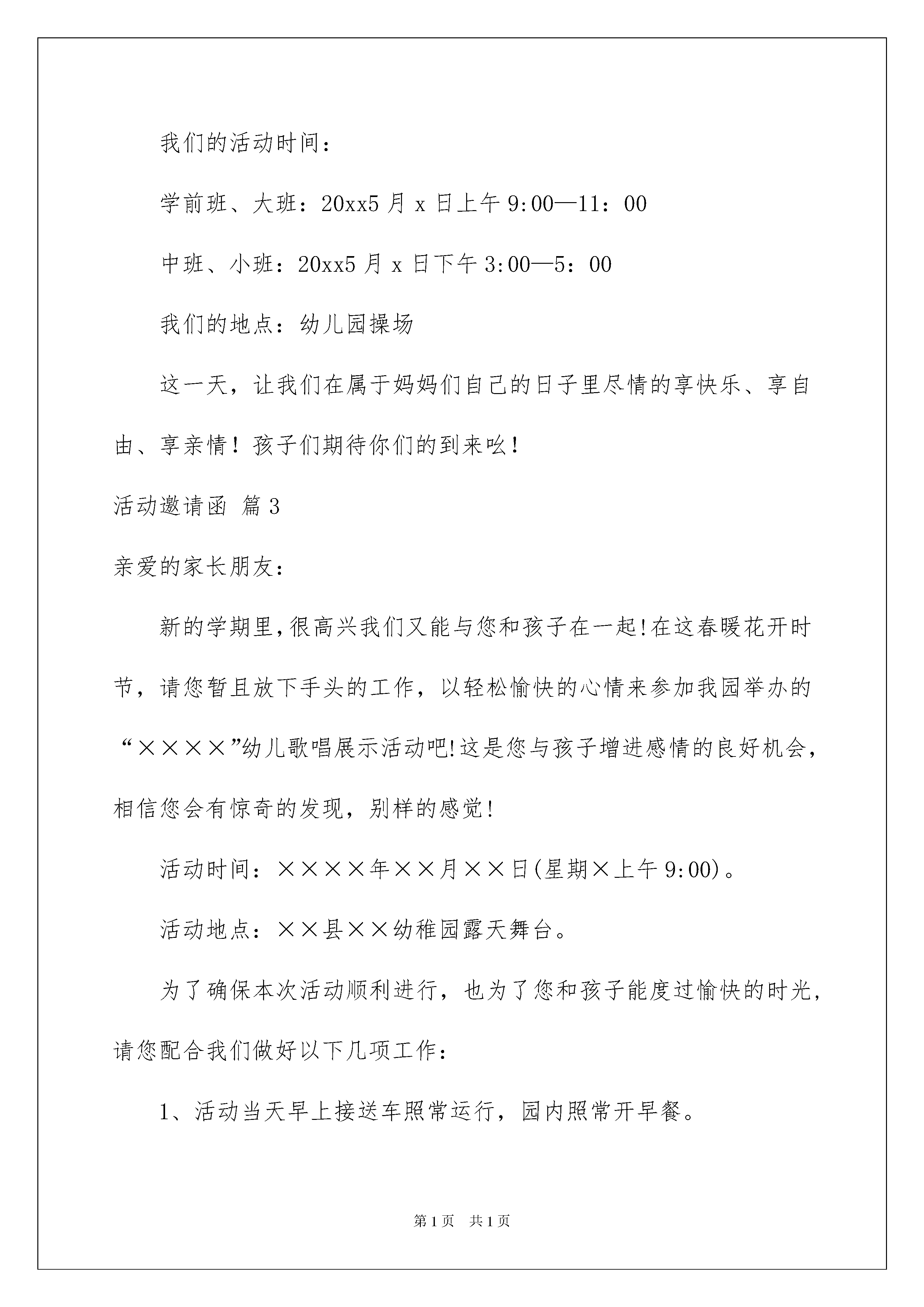 2022关于活动邀请函范文十篇关于活动邀请函范文十篇邀请函书写应该简要精练,大方得体,首尾呼应。在充满活力,日益开放的今天,邀请函在活动中起到的作用越来越大,一起来参考邀请函是怎么写的吧,以下是我整理的活动邀请函10篇,欢迎大家借鉴与参考,希望对大家有所帮助。活动邀请函篇1尊敬的先生/女士:您好!我们很荣幸地邀请您参加将于XX月XX-XX日在北京21世纪饭店举办的第XX届联合国粮食及农业组织亚太地区大会非政府组织磋商会议。本次会议的主题是:从议程到行动继非政府组织粮食主权论坛之后。此次磋商会议由联合国粮农组织(FAO)和国际粮食主权计划委员会亚洲分会(IPC-Asia)主办,中国国际民间组织合作促进会协办。届时,来自亚太地区80多个民间组织的100余名代表将参加会议。本次会议宣言将在XX月XX-XX日召开的XX届联合国粮食及农业组织亚太地区大会上宣读。本次会议的主要议题包括:1.亚太地区粮食和农业领域的非政府组织如何在地区和国家层面执行全球行动议程/公民社会战略。2.亚太地区粮食和农业领域的非政府组织如何根据目前形势确定今后行动的参与者。3.参会机构起草非政府组织建议书提交给第XX届联合国粮食及农业组织亚太地区会议,继续呼吁维护农民的利益。真诚地期待着您的积极支持与参与!活动邀请函篇2亲爱的妈妈们:您好!为了家人忙碌而快乐的您是否知道20xx的5月xx日是什么节日?是的、母亲节到了,让我们在本周五(5月x日)这一天且放下忙碌、停下奔波,一起来参加幼儿园全体孩子们为你们精心准备的“亲子起闯关,开心乐翻天”的母亲节活动吧!那一刻,您将看到不一样的“宝贝”;您将体验属于自己和孩子的快乐;您将收获足以让您放飞“幸福泪水”的惊喜!我们的活动时间:学前班、大班:20xx5月x日上午9:00—11:00中班、小班:20xx5月x日下午3:00—5:00我们的地点:幼儿园操场这一天,让我们在属于妈妈们自己的日子里尽情的享快乐、享自由、享亲情!孩子们期待你们的到来吆!活动邀请函篇3亲爱的家长朋友:新的学期里,很高兴我们又能与您和孩子在一起!在这春暖花开时节,请您暂且放下手头的工作,以轻松愉快的心情来参加我园举办的“××××”幼儿歌唱展示活动吧!这是您与孩子增进感情的良好机会,相信您会有惊奇的发现,别样的感觉!活动时间:××××年××月××日(星期×上午9:00)。活动地点:××县××幼稚园露天舞台。为了确保本次活动顺利进行,也为了您和孩子能度过愉快的时光,请您配合我们做好以下几项工作:1、活动当天早上接送车照常运行,园内照常开早餐。2、幼儿着春季园服,每个家庭至少有一人观看孩子表演。3、活动结束后请家长到班上集合,参加班级工作汇报,班级会议结束后请带孩子回家(周五照常上课)。4、节目表演之前请不要跟自己孩子接触,以免影响孩子情绪,影响孩子表演(家长请8:50之前在操场等候、观看)。5、参加活动的家长很多,请您遵守秩序,文明观看。6、红缨总部为我们连锁园音乐课程研发了家庭版《和幼儿一起玩转音乐》光碟,如有需要,请与班级老师联系。让我们一起在欢快的音乐声中拥抱春天吧!我们期盼着您的光临与指导!××××幼儿园××××年××月××日活动邀请函篇4尊敬的家长朋友:你们好!20xx年即将结束,为了促进每一个幼儿身心健康和谐地发展,让孩子与家长体验到亲子运动会的快乐,增强家园之间的情感交流,我们xx幼儿园将举办"我运动!我健康!我快乐!"亲子运动会。届时,请家长暂且放下手头的工作,以愉快的心情接受我们真诚的.邀请,和孩子们一起真心共享亲子时光的简单快乐!我们不见不散哦,期待你们的到来!运动会具体时间安排表:x月x号(周二)下午15::00—16:40(家长入园时间为:14:30—15:00)运动会年龄段:小班、中班、大班。运动会主题:我运动!我健康!我快乐!会场要求:为了活动能正常有序的进行,请您做好以下事项:1.活动当天请家长穿运动装运动鞋,不带包不带零食(因为要和小孩一起做运动玩游戏)给孩子穿着园内准备的统一服装。2.家长来园后可自行参观幼儿作品展,之后到指定场地等候活动开始,不要进教室探望幼儿,以免影响幼儿情绪。3.活动开始后,请听从主持人统一调配,不要随意走动,幼儿进场后不要跟随幼儿。4.活动时长为一个半小时左右,活动未结束请不要带幼儿离场,活动结束后请跟老师交接好方可带幼儿离开。恭请家长届时准时出席,我们这次活动是家长与小孩之间的亲子互动游戏,家长和小朋友缺一不可,家长再辛苦都是为了孩子能够更幸福更快乐,这次亲子活动就是一次很好的表现机会,因为有你们的参加,你们的孩子会开心一整天,会铭记一辈子
