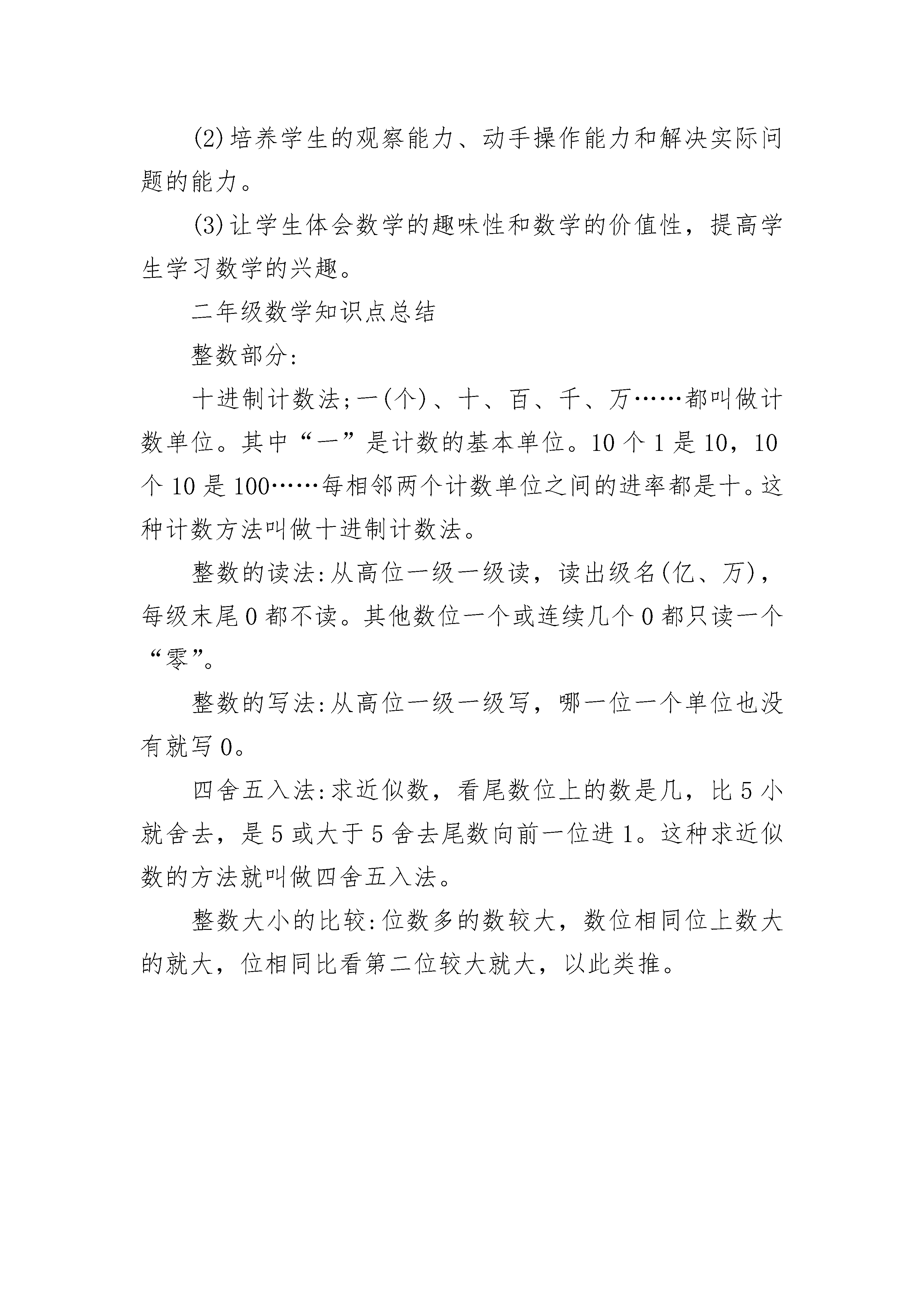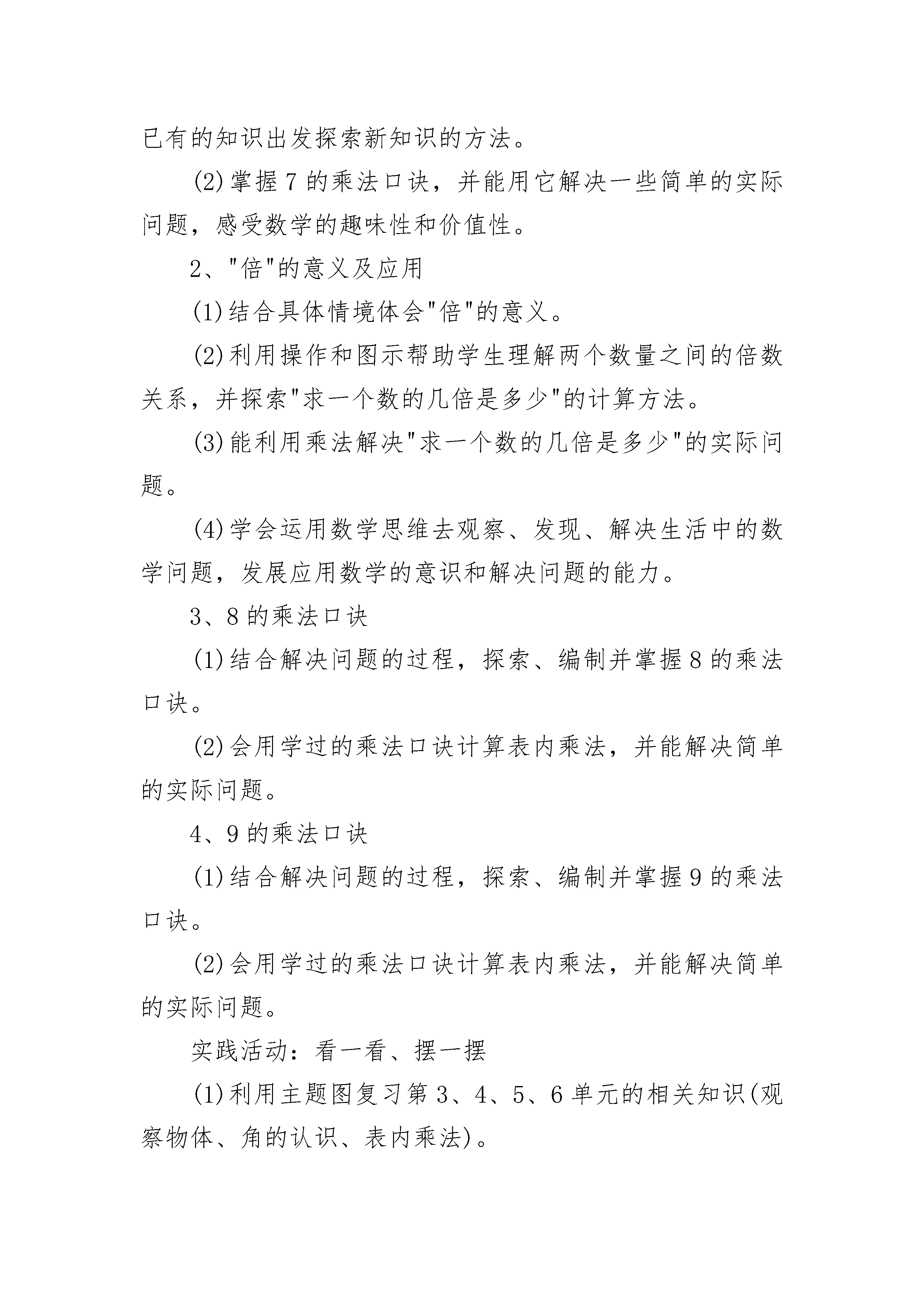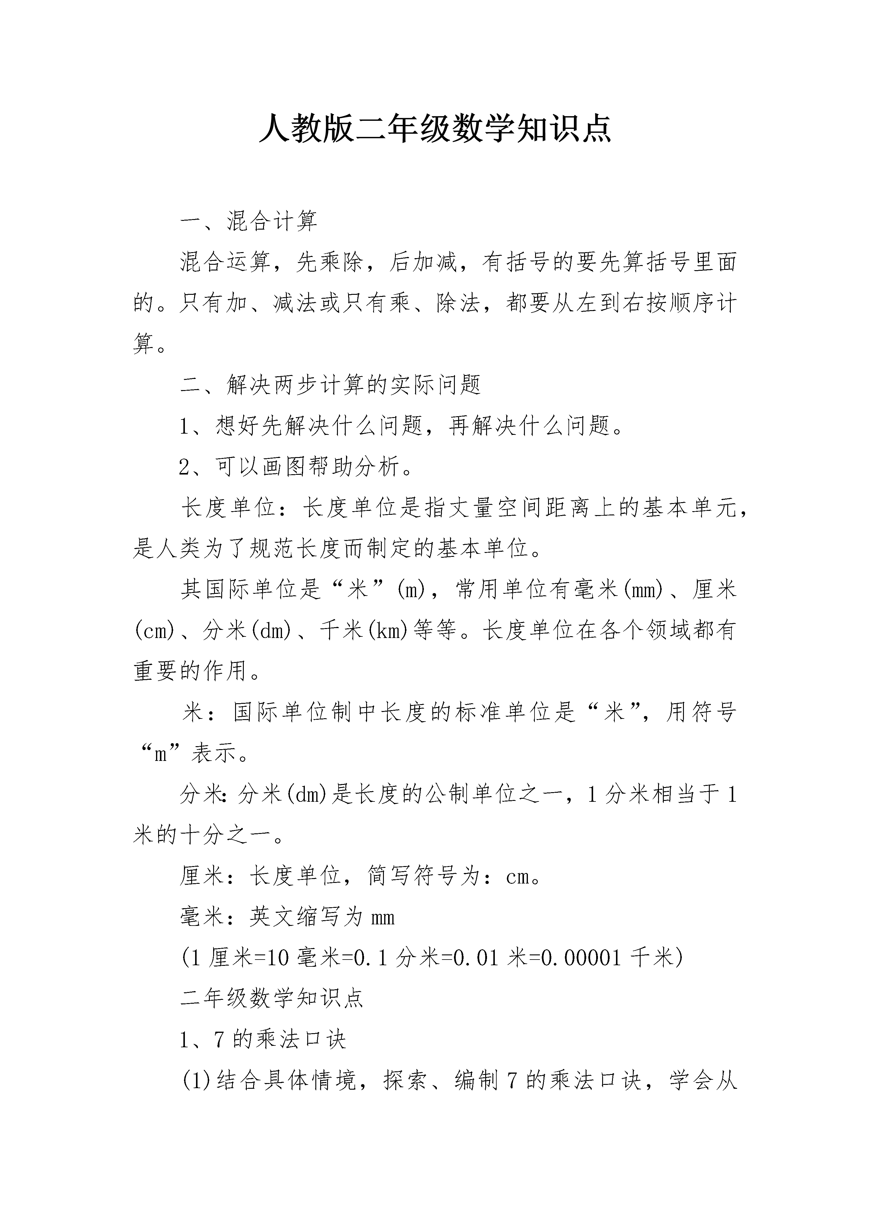 人教版二年级数学知识点一、混合计算混合运算,先乘除,后加减,有括号的要先算括号里面的。只有加、减法或只有乘、除法,都要从左到右按顺序计算。二、解决两步计算的实际问题1、想好先解决什么问题,再解决什么问题。2、可以画图帮助分析。长度单位:长度单位是指丈量空间距离上的基本单元,是人类为了规范长度而制定的基本单位。其国际单位是“米”(m),常用单位有毫米(mm)、厘米(cm)、分米(dm)、千米(km)等等。长度单位在各个领域都有重要的作用。米:国际单位制中长度的标准单位是“米”,用符号“m”表示。分米:分米(dm)是长度的公制单位之一,1分米相当于1米的十分之一。厘米:长度单位,简写符号为:cm。毫米:英文缩写为mm(1厘米=10毫米=0.1分米=0.01米=0.00001千米)二年级数学知识点1、7的乘法口诀(1)结合具体情境,探索、编制7的乘法口诀,学会从已有的知识出发探索新知识的方法。(2)掌握7的乘法口诀,并能用它解决一些简单的实际问题,感受数学的趣味性和价值性。2、"倍"的意义及应用(1)结合具体情境体会"倍"的意义。(2)利用操作和图示帮助学生理解两个数量之间的倍数关系,并探索"求一个数的几倍是多少"的计算方法。(3)能利用乘法解决"求一个数的几倍是多少"的实际问题。(4)学会运用数学思维去观察、发现、解决生活中的数学问题,发展应用数学的意识和解决问题的能力。3、8的乘法口诀(1)结合解决问题的过程,探索、编制并掌握8的乘法口诀。(2)会用学过的乘法口诀计算表内乘法,并能解决简单的实际问题。4、9的乘法口诀(1)结合解决问题的过程,探索、编制并掌握9的乘法口诀。(2)会用学过的乘法口诀计算表内乘法,并能解决简单的实际问题。实践活动:看一看、摆一摆(1)利用主题图复习第3、4、5、6单元的相关知识(观察物体、角的认识、表内乘法)。(2)培养学生的观察能力、动手操作能力和解决实际问题的能力。(3)让学生体会数学的趣味性和数学的价值性,提高学生学习数学的兴趣。二年级数学知识点总结整数部分:十进制计数法;一(个)、十、百、千、万……都叫做计数单位。其中“一”是计数的基本单位。10个1是10,10个10是100……每相邻两个计数单位之间的进率都是十。这种计数方法叫做十进制计数法。整数的读法:从高位一级一级读,读出级名(亿、万),每级末尾0都不读。其他数位一个或连续几个0都只读一个“零”。整数的写法:从高位一级一级写,哪一位一个单位也没有就写0。四舍五入法:求近似数,看尾数位上的数是几,比5小就舍去,是5或大于5舍去尾数向前一位进1。这种求近似数的方法就叫做四舍五入法。整数大小的比较:位数多的数较大,数位相同位上数大的就大,位相同比看第二位较大就大,以此类推。