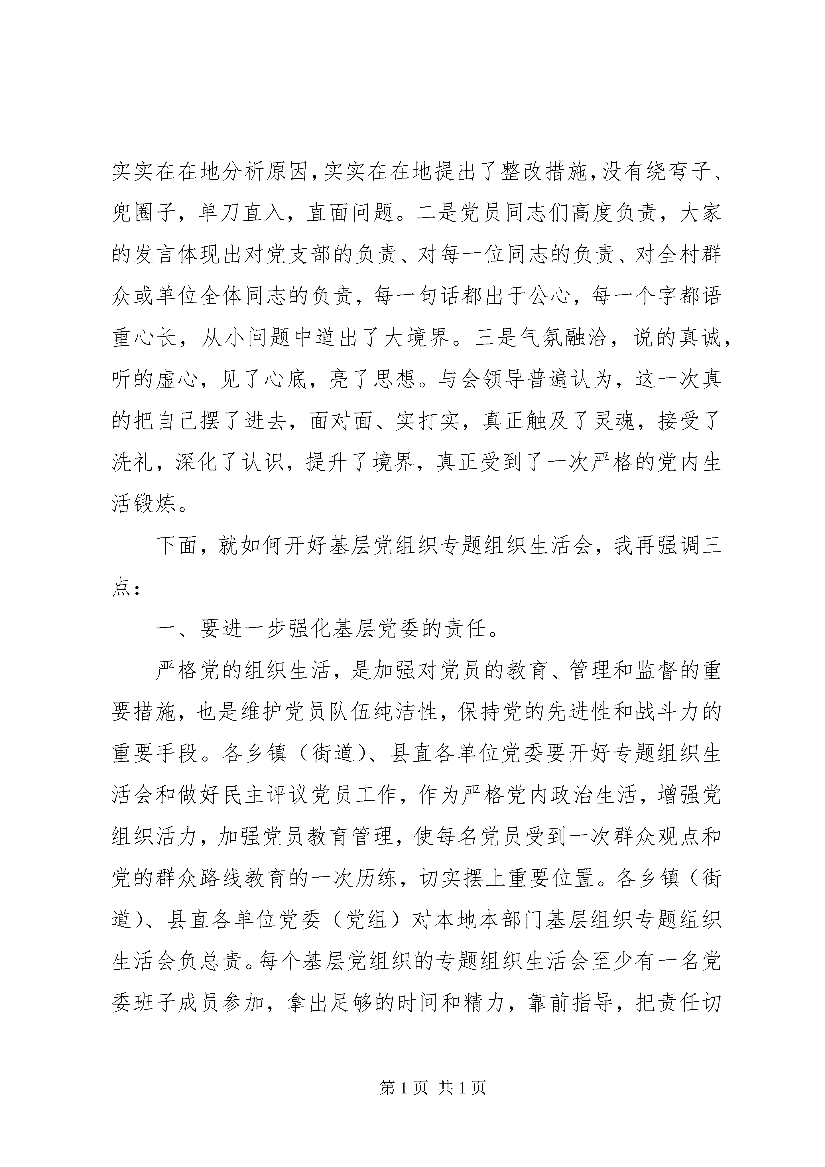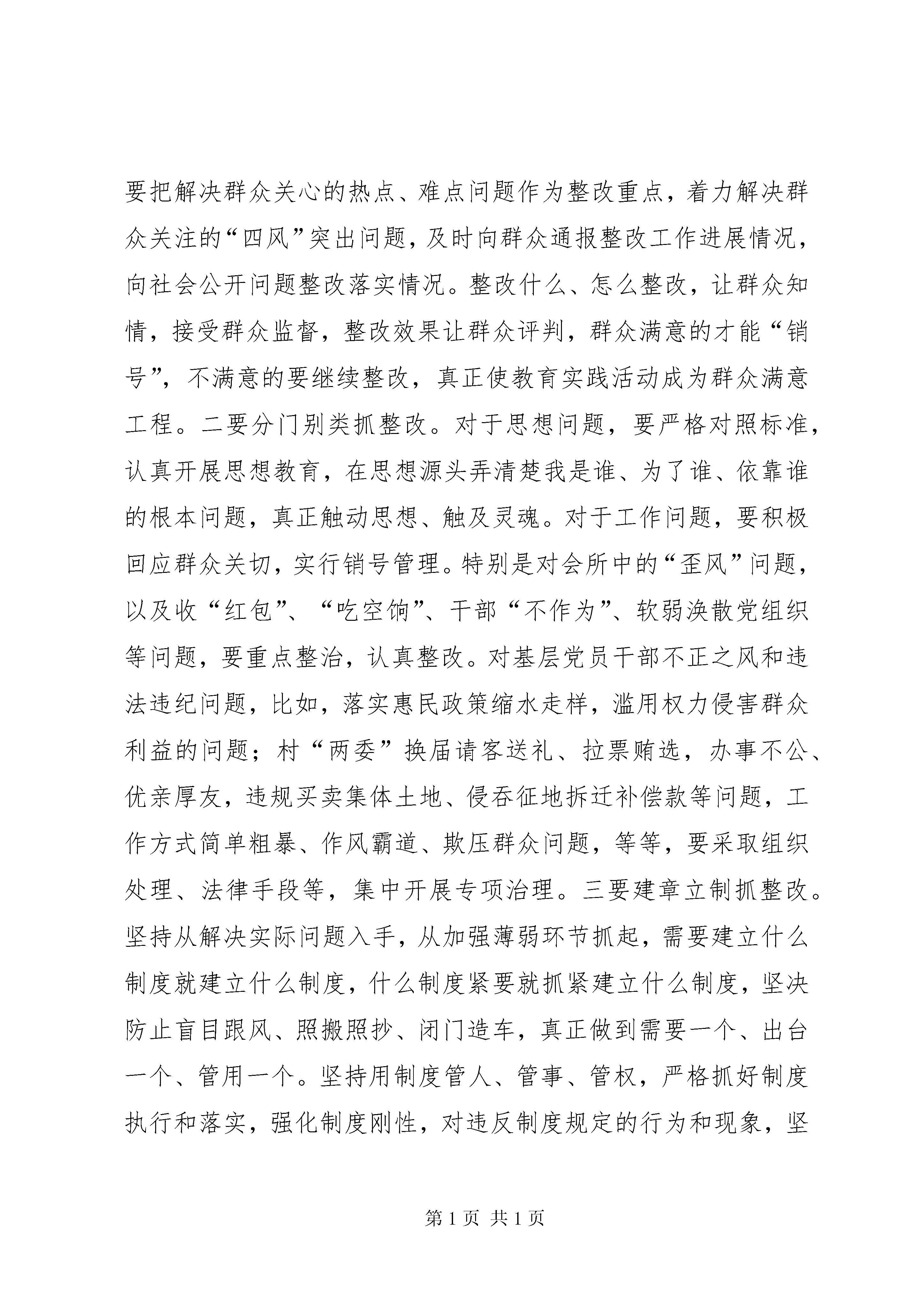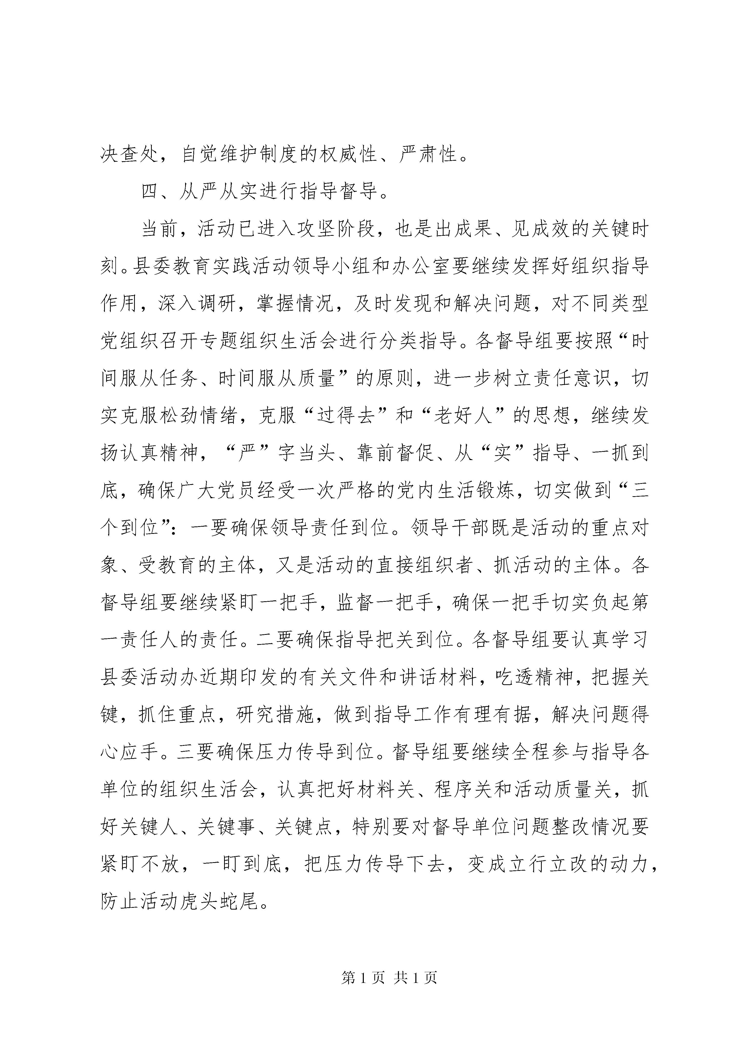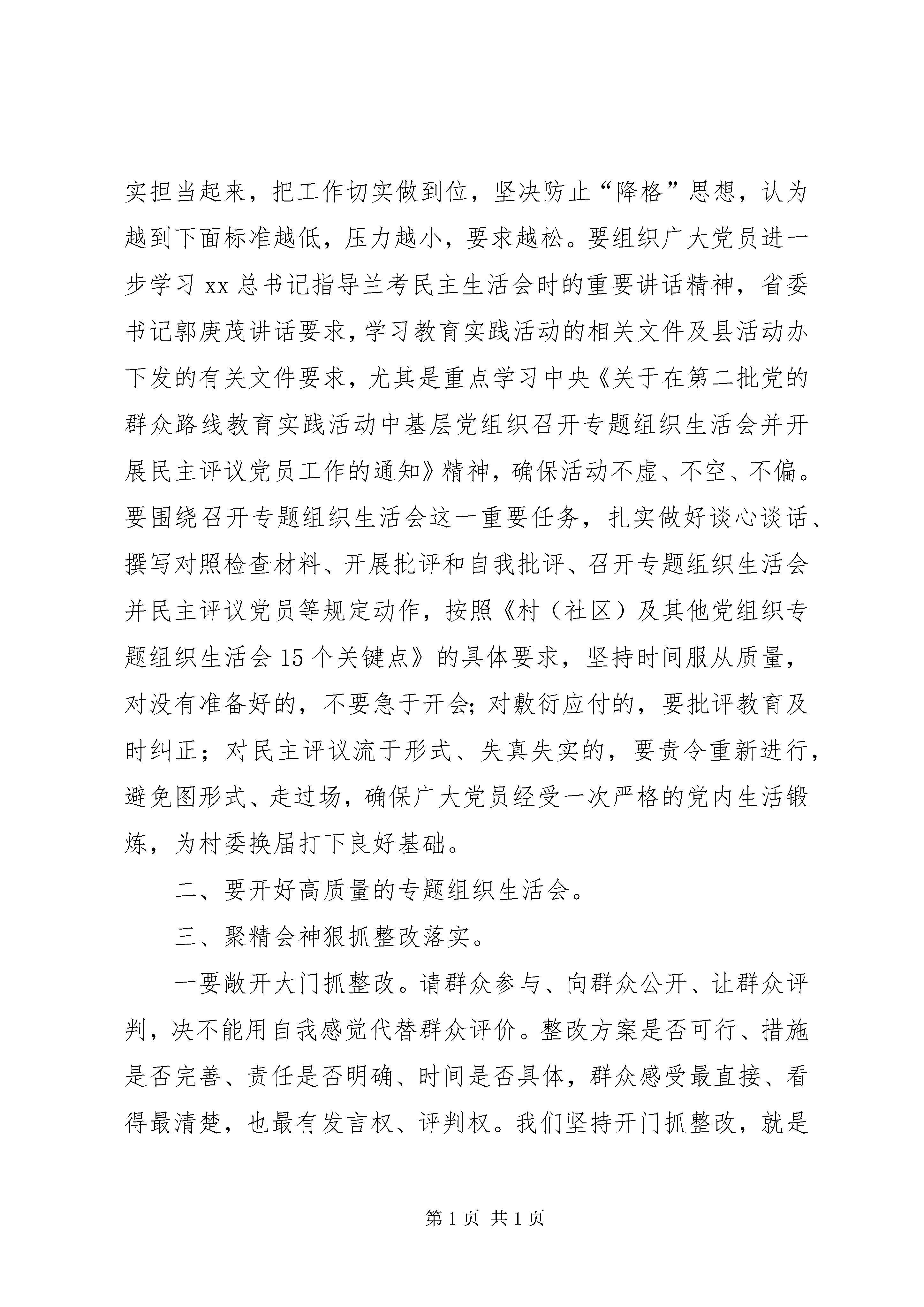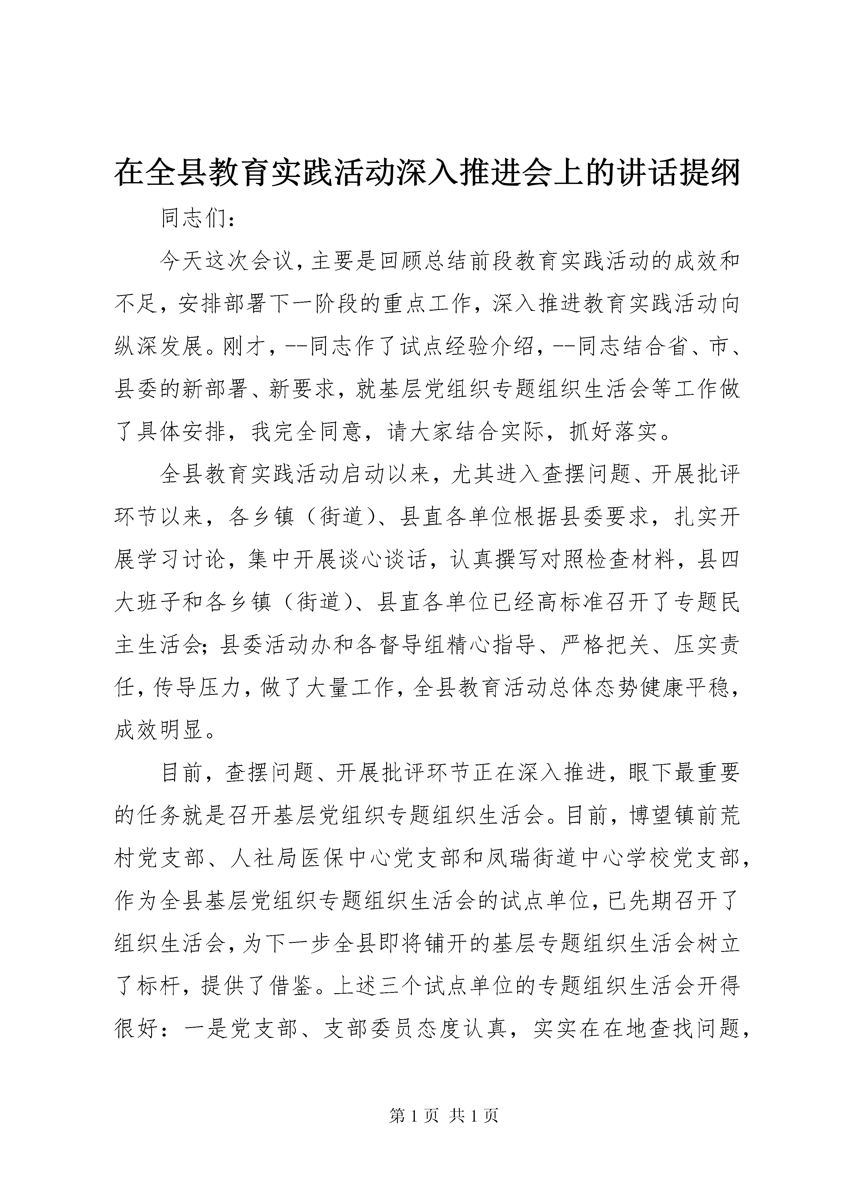 在全县教育实践活动深入推进会上的讲话提纲同志们:今天这次会议,主要是回顾总结前段教育实践活动的成效和不足,安排部署下一阶段的重点工作,深入推进教育实践活动向纵深发展。刚才,--同志作了试点经验介绍,--同志结合省、市、县委的新部署、新要求,就基层党组织专题组织生活会等工作做了具体安排,我完全同意,请大家结合实际,抓好落实。全县教育实践活动启动以来,尤其进入查摆问题、开展批评环节以来,各乡镇(街道)、县直各单位根据县委要求,扎实开展学习讨论,集中开展谈心谈话,认真撰写对照检查材料,县四大班子和各乡镇(街道)、县直各单位已经高标准召开了专题民主生活会;县委活动办和各督导组精心指导、严格把关、压实责任,传导压力,做了大量工作,全县教育活动总体态势健康平稳,成效明显。目前,查摆问题、开展批评环节正在深入推进,眼下最重要的任务就是召开基层党组织专题组织生活会。目前,博望镇前荒村党支部、人社局医保中心党支部和凤瑞街道中心学校党支部,作为全县基层党组织专题组织生活会的试点单位,已先期召开了组织生活会,为下一步全县即将铺开的基层专题组织生活会树立了标杆,提供了借鉴。上述三个试点单位的专题组织生活会开得很好:一是党支部、支部委员态度认真,实实在在地查找问题,实实在在地分析原因,实实在在地提出了整改措施,没有绕弯子、兜圈子,单刀直入,直面问题。二是党员同志们高度负责,大家的发言体现出对党支部的负责、对每一位同志的负责、对全村群众或单位全体同志的负责,每一句话都出于公心,每一个字都语重心长,从小问题中道出了大境界。三是气氛融洽,说的真诚,听的虚心,见了心底,亮了思想。与会领导普遍认为,这一次真的把自己摆了进去,面对面、实打实,真正触及了灵魂,接受了洗礼,深化了认识,提升了境界,真正受到了一次严格的党内生活锻炼。下面,就如何开好基层党组织专题组织生活会,我再强调三点:一、要进一步强化基层党委的责任。严格党的组织生活,是加强对党员的教育、管理和监督的重要措施,也是维护党员队伍纯洁性,保持党的先进性和战斗力的重要手段。各乡镇(街道)、县直各单位党委要开好专题组织生活会和做好民主评议党员工作,作为严格党内政治生活,增强党组织活力,加强党员教育管理,使每名党员受到一次群众观点和党的群众路线教育的一次历练,切实摆上重要位置。各乡镇(街道)、县直各单位党委(党组)对本地本部门基层组织专题组织生活会负总责。每个基层党组织的专题组织生活会至少有一名党委班子成员参加,拿出足够的时间和精力,靠前指导,把责任切实担当起来,把工作切实做到位,坚决防止“降格”思想,认为越到下面标准越低,压力越小,要求越松。要组织广大党员进一步学习xx总书记指导兰考民主生活会时的重要讲话精神,省委书记郭庚茂讲话要求,学习教育实践活动的相关文件及县活动办下发的有关文件要求,尤其是重点学习中央《关于在第二批党的群众路线教育实践活动中基层党组织召开专题组织生活会并开展民主评议党员工作的通知》精神,确保活动不虚、不空、不偏。要围绕召开专题组织生活会这一重要任务,扎实做好谈心谈话、撰写对照检查材料、开展批评和自我批评、召开专题组织生活会并民主评议党员等规定动作,按照《村(社区)及其他党组织专题组织生活会15个关键点》的具体要求,坚持时间服从质量,对没有准备好的,不要急于开会;对敷衍应付的,要批评教育及时纠正;对民主评议流于形式、失真失实的,要责令重新进行,避免图形式、走过场,确保广大党员经受一次严格的党内生活锻炼,为村委换届打下良好基础。二、要开好高质量的专题组织生活会。三、聚精会神狠抓整改落实。一要敞开大门抓整改。请群众参与、向群众公开、让群众评判,决不能用自我感觉代替群众评价。整改方案是否可行、措施是否完善、责任是否明确、时间是否具体,群众感受最直接、看得最清楚,也最有发言权、评判权。我们坚持开门抓整改,就是要把解决群众关心的热点、难点问题作为整改重点,着力解决群众关注的“四风”突出问题,及时向群众通报整改工作进展情况,向社会公开问题整改落实情况。整改什么、怎么整改,让群众知情,接受群众监督,整改效果让群众评判,群众满意的才能“销号”,不满意的要继续整改,真正使教育实践活动成为群众满意工程。二要分门别类抓整改。对于思想问题,要严格对照标准,认真开展思想教育,在思想源头弄清楚我是谁、为了谁、依靠谁的根本问题,真正触动思想、触及灵魂。对于工作问题,要积极回应群众关切,实行销号管理。特别是对会所中的“歪风”问题,以及收“红包”、“吃空饷”、干部“不作为”、软弱涣散党组织等问题,要重点整治,认真整改。对基层党员干部不正之风和违法违纪问题,比如,落实惠民政策缩水走样,滥用权力侵害群众利益的问题;村“两委”换届请客送礼、拉票贿选,办事不公、优亲厚友,违规买卖集体土地、侵吞征地拆迁补偿款