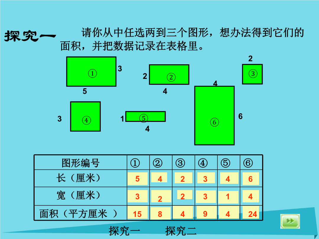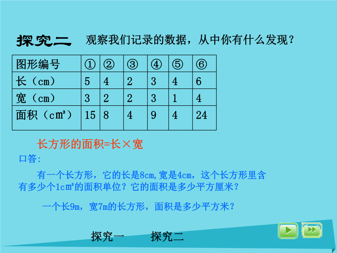 长方形与正方形的面积探究二探究二练习一练习二本课小结