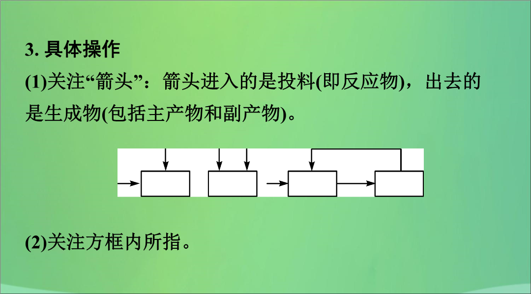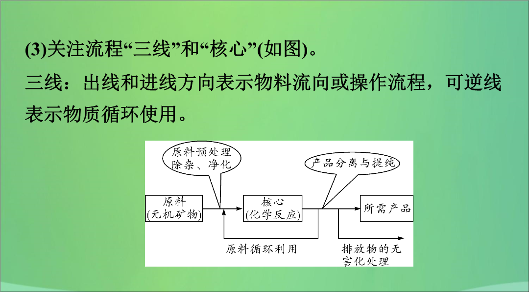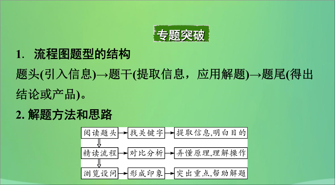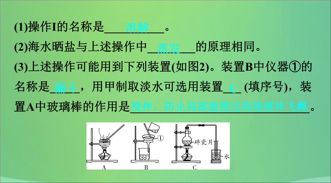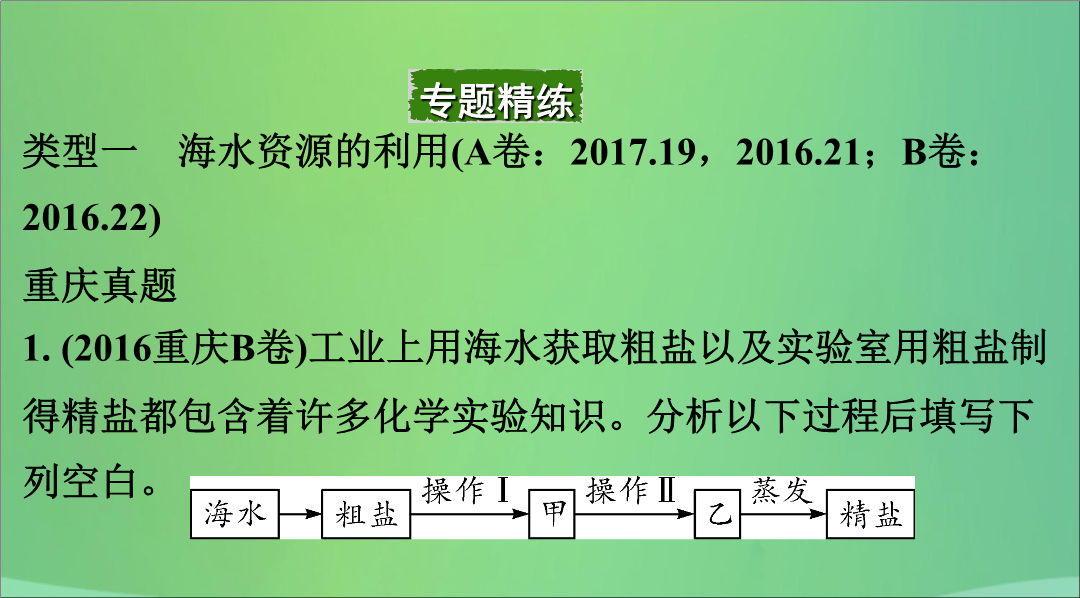 专题突破3.具体操作(1)关注“箭头”:箭头进入的是投料(即反应物),出去的是生成物(包括主产物和副产物)。(2)关注方框内所指。(3)关注流程“三线”和“核心”(如图)。三线:出线和进线方向表示物料流向或操作流程,可逆线表示物质循环使用。专题精练(1)操作Ⅰ的名称是__________。(2)海水晒盐与上述操作中________的原理相同。(3)上述操作可能用到下列装置(如图2)。装置B中仪器①的名称是_____,用甲制取淡水可选用装置___(填序号),装置A中玻璃棒的作用是______________________________。【解析】(1)粗盐提纯要经过溶解、过滤、蒸发的过程完成,故操作Ⅰ为溶解。(2)海水晒盐的原理是将海水中的水分蒸发,然后得到食盐,所以海水晒盐与蒸发的原理相同。(3)装置B中仪器①为漏斗;蒸馏的方法可以将海水淡化,故可选用图中C装置;装置A为蒸发,其玻璃棒的作用是搅拌,使液体均匀受热,防止因局部受热而使液体外溅。2.(2017重庆A卷)常温下,氯酸钾的溶解度较小,在工业上可通过如下转化制得。(2)反应I中,通电时发生的反应方程式为NaCl+3XNaClO3+3H2↑,则X的化学式为______。(3)反应Ⅱ的基本反应类型为______________。(4)该转化中可以循环利用的物质是__________(填名称)。【解析】(1)氯酸钾在二氧化锰的催化作用下分解生成氯化钾和氧气。(2)由反应的化学方程式NaCl+3XNaClO3+3H2↑,应用质量守恒定律的“两个不变”:①化学反应前后元素种类不变,②原子个数不变可知:差值3.(2016重庆A卷)海水中含有丰富的镁,目前世界上生产的镁60%来自于海水。分离出食盐的海水称作苦卤水,其中含有丰富的MgCl2。工业上以苦卤水为原料制取金属镁的流程如下:(1)写出沉淀槽中发生反应的化学方程式________________________________________________,________________________________________________。(2)Y与Z反应后的产物溶于水可得X溶液,从而实现了Y的循环利用,则Z的化学式为________,X溶液的名称是________。(3)烘干后得到的MgCl2中可能含有的杂质是________。【解析】(1)将苦卤水引入沉淀槽,向沉淀槽中分批加入氧化钙,氧化钙与水反应生成氢氧化钙,氢氧化钙溶液与苦卤水中的氯化镁反应生成氢氧化镁白色沉淀和氯化钙,过滤后可得氢氧化镁沉淀,由于氢氧化钙微溶于水,所以过滤后的沉淀中还可能混有氢氧化钙。(2)根据质量守恒定律分析,电解氯化镁后生成金属镁和一种单质,该单质为氯气,氯气与单质Z反应后的产物溶于水得到X溶液,根据氢氧化镁与过量X溶液反应生成氯化镁,可知X溶液是稀盐酸,则单质Z是氢气。(3)由于将沉淀槽中反应后的物质过滤后得到的沉淀中可能混有氢氧化钙,因此向沉淀中加入过量稀盐酸后会产生氯化钙,导致烘干后得到的氯化镁中可能含有氯化钙。好题精练4.(2017绥化)从海水中可制备纯碱和金属镁,其流程如图所示。(2)粗盐水中主要含有CaCl2、MgSO4等可溶性杂质,可加入下列物质:a.适量的盐酸;b.稍过量的Na2CO3溶液;c.稍过量的Ba(OH)2溶液,利用过滤等操作进行除杂,则加入这三种物质的先后顺序为________。(填字母序号)(3)向饱和的氯化钠溶液中通入氨气和二氧化碳,经过一系列变化,最终可制得纯碱。请写出第Ⅲ步反应的化学方程式___________________________________________。(4)第Ⅴ步Mg(OH)2与盐酸的反应________中和反应。(选填“是”或“不是”)【解析】(1)粗盐提纯中每步都用到的玻璃仪器是玻璃棒。(2)除去粗盐中含有氯化钙、硫酸镁等可溶性杂质,根据提供的试剂可知,加入氢氧化钡溶液是为了除去硫酸镁,加入碳酸钠溶液是为了除去氯化钙中的钙离子和过量的钡离子,加入稀盐酸是为了除去过量的碳酸钠溶液和氢氧根离子,因此加入的顺序为先加入稍过量的氢氧化钡溶液,再加入过量的碳酸钠溶液,过滤后再加入稀盐酸。(3)碳酸氢钠加热分解生成碳酸钠、水和二氧化碳。(4)Mg(OH)2属于碱,盐酸属于酸,两者的反应是中和反应。5.(2017郴州)海水中有着丰富的化学资源,人们可以从海水中提取出很多的物质,如:氯化钠、镁等。如图就是利用海水提取氯化钠的大致过程:(1)图中①是________(填“蒸发池”或“冷却池”)。(2)析出晶体后的母液是氯化钠的________(填“饱和溶液”或“不饱和溶液”)。(3)实验室除去粗盐中难溶性杂质的主要实验步骤有:Ⅰ溶解Ⅱ________