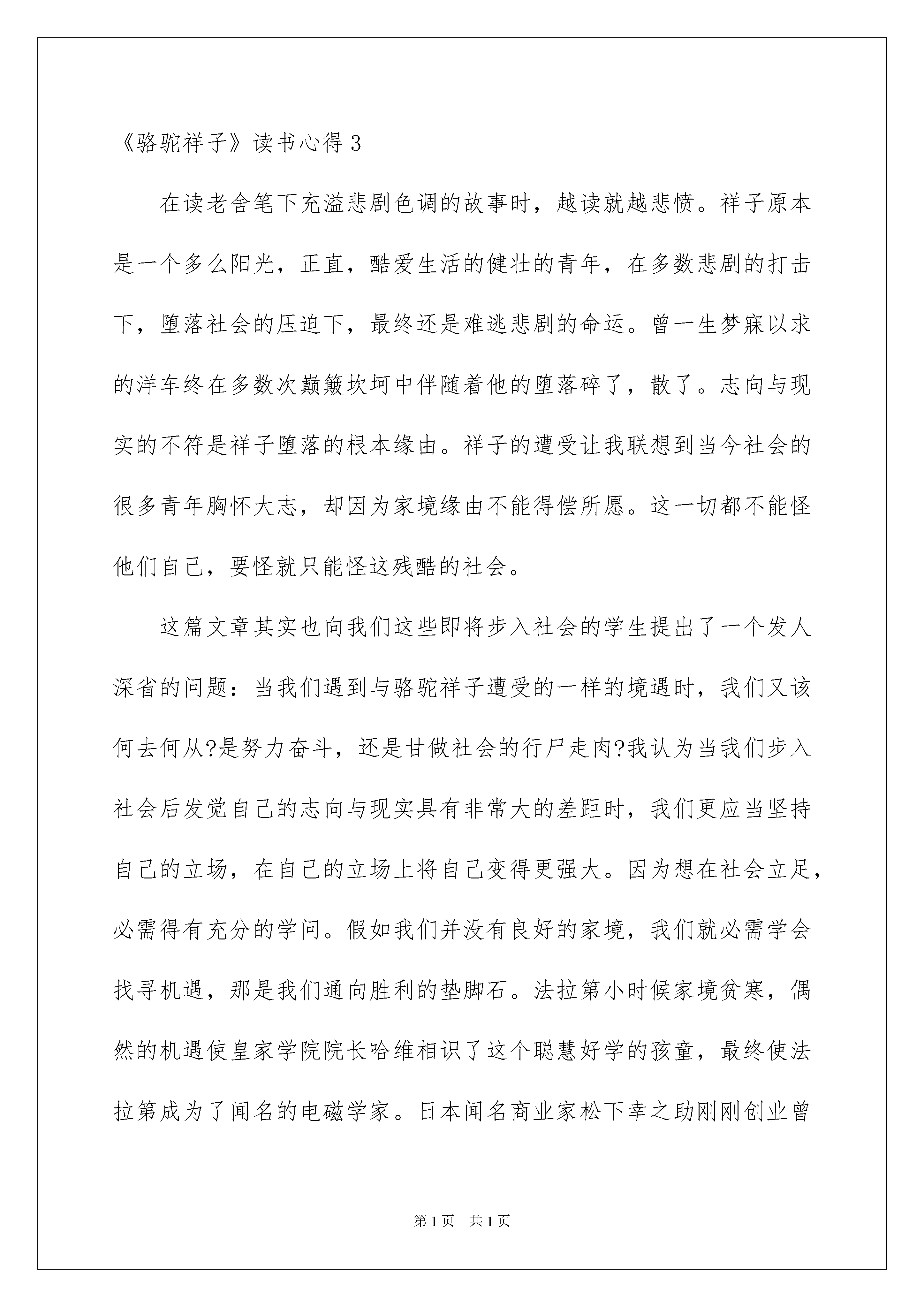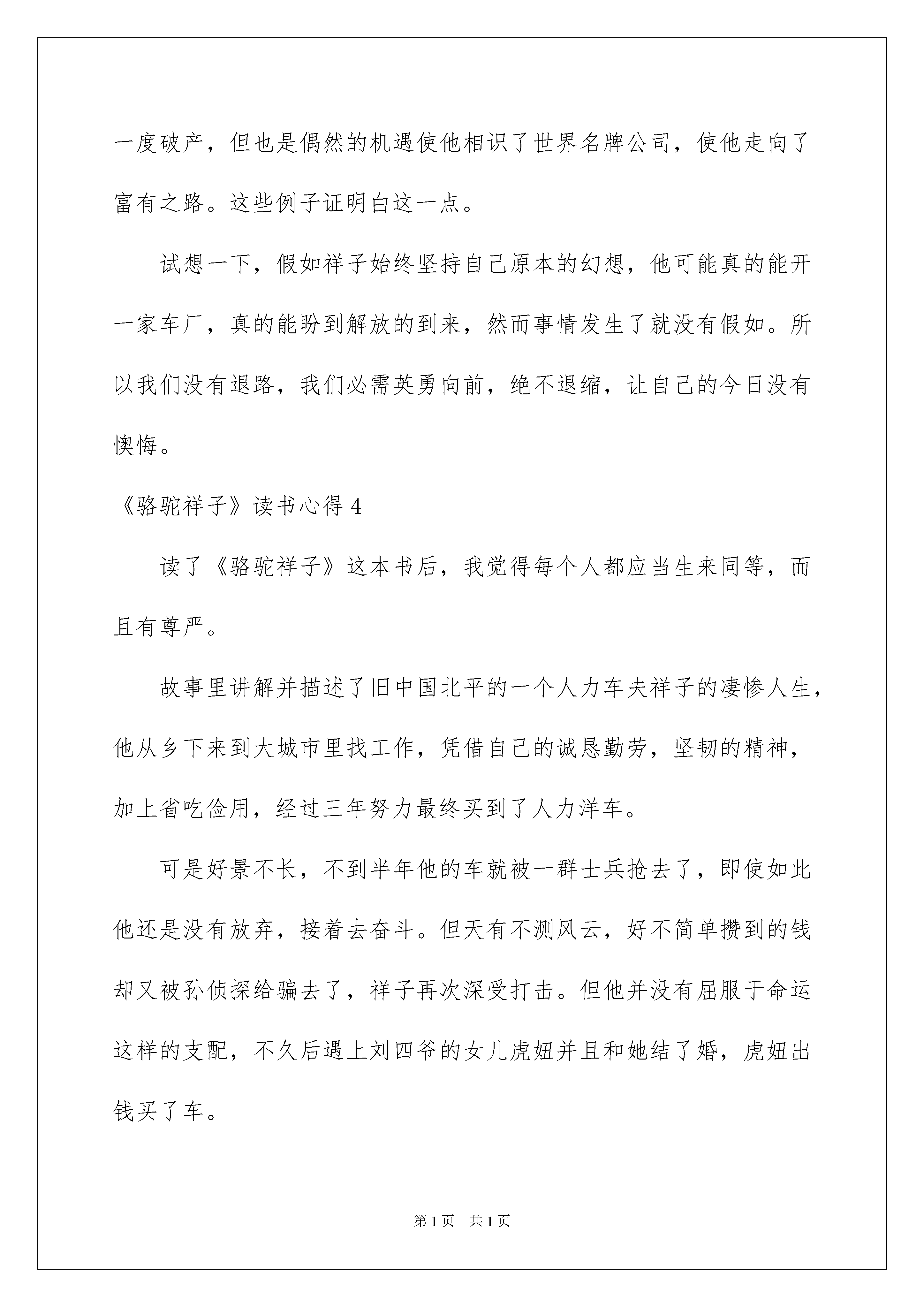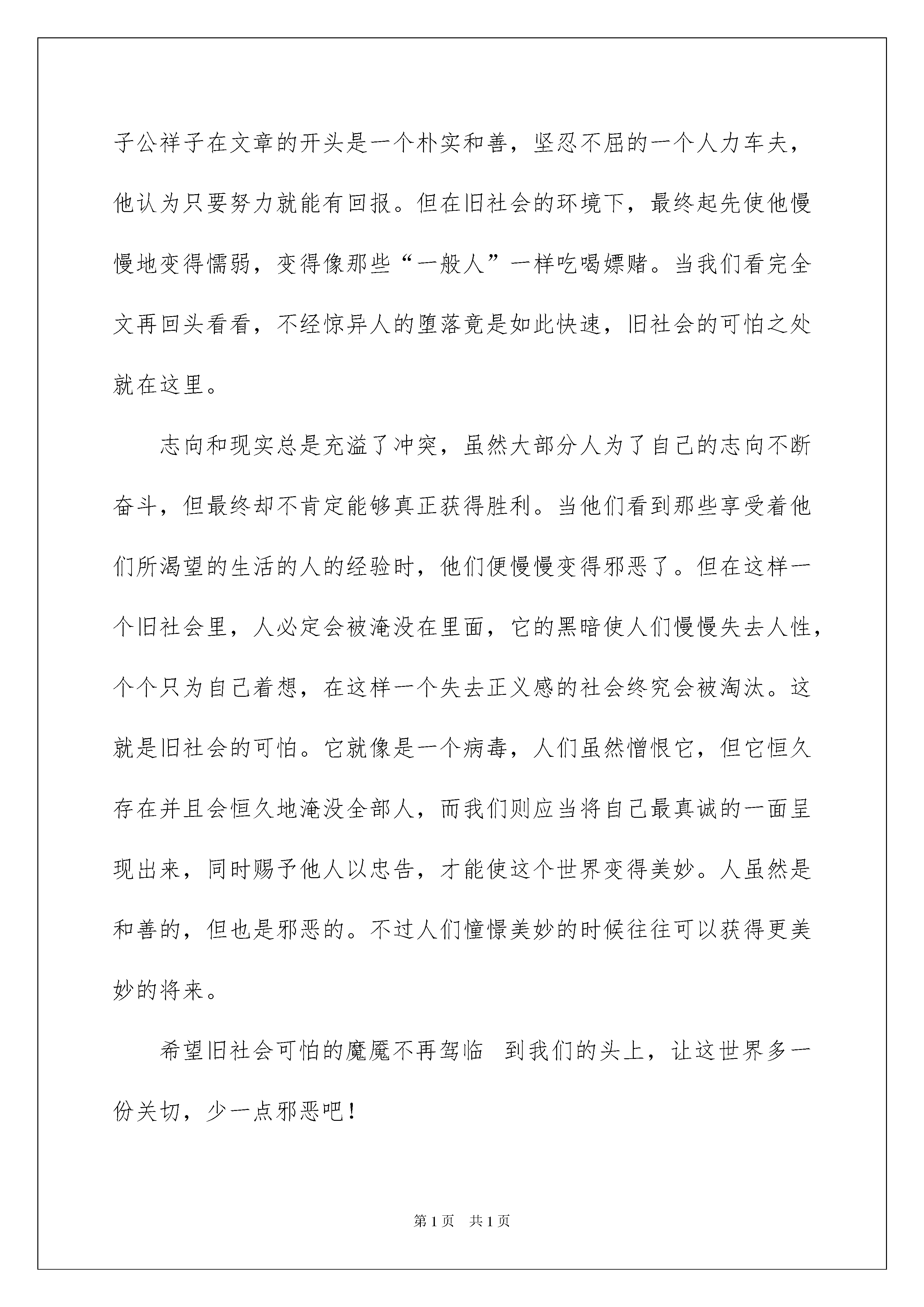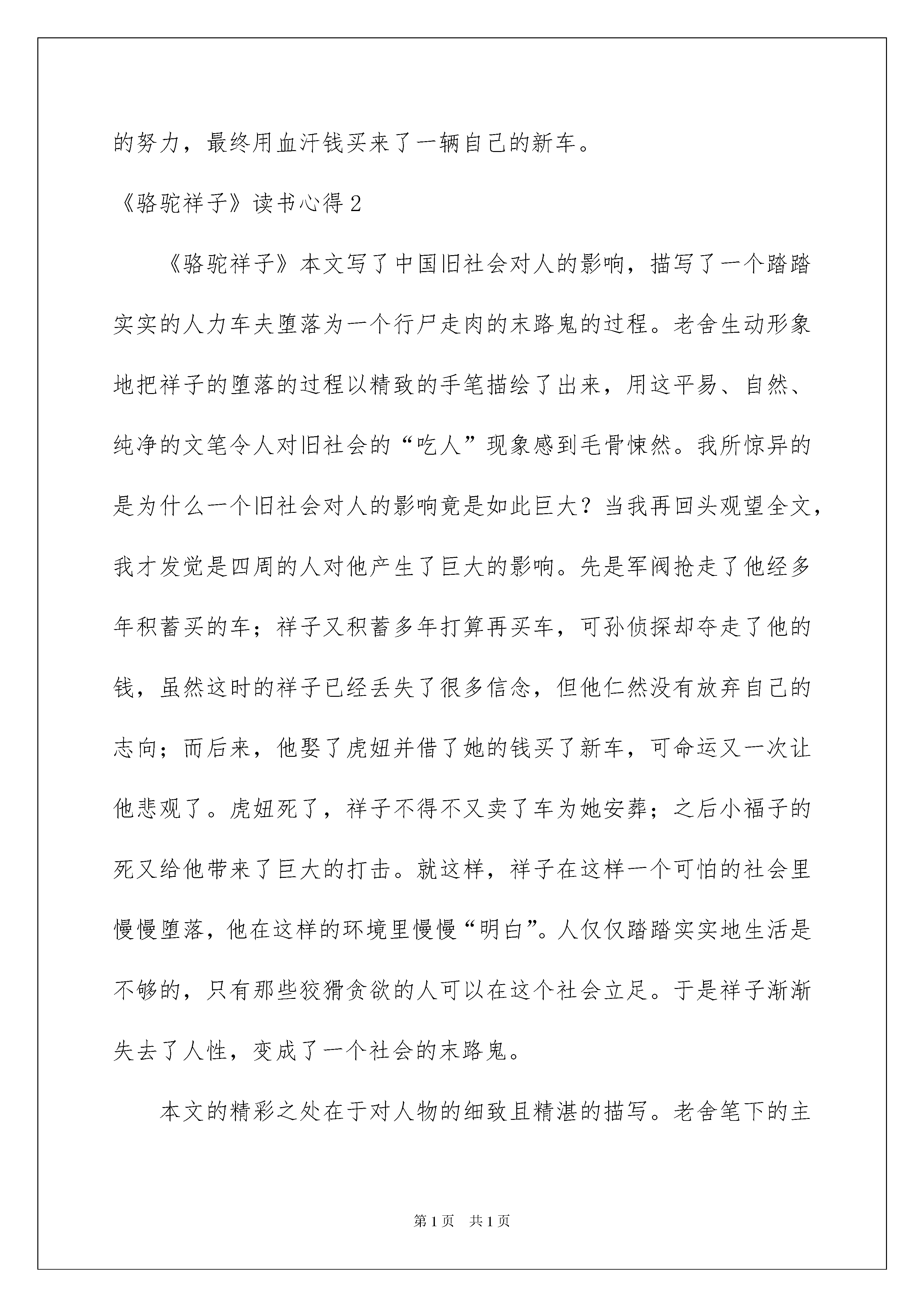 2022《骆驼祥子》读书心得《骆驼祥子》读书心得(合集15篇)当我们备受启迪时,往往会写一篇心得体会,这样可以不断更新自己的想法。那么你知道心得体会如何写吗?下面是我为大家收集的《骆驼祥子》读书心得,欢迎阅读,希望大家能够喜爱。《骆驼祥子》读书心得1近段时间,我读了《骆驼祥子》这本书。这本书主要写了一位人力洋车夫祥子的把凄惨命运,描绘了旧社会是如何把一位正直、和善、诚恳、要强、醇厚并且无任何嗜好的洋车夫祥子变成了个人主义的陌路鬼的。祥子的凄惨命运令人惋惜、怜悯。老舍在描写祥子的悲剧时,从不同方面着力描写了祥子从外貌到内心的美妙东西。但由于命运悲剧接踵而至,导致了他对生活的希望的破灭,他那美妙的品德、性格也渐渐的发生了改变。最终连他的外表、形貌也变得猥琐、肮脏了。祥子由好变坏的过程,是我们更深刻的感受到当时的社会的黑暗,更加激起了我们对祥子凄惨遭受的怜悯。祥子和善纯朴,对生活有骆驼一样的主动和坚韧精神。经过三年的努力,最终用血汗钱买来了一辆自己的新车。《骆驼祥子》读书心得2《骆驼祥子》本文写了中国旧社会对人的影响,描写了一个踏踏实实的人力车夫堕落为一个行尸走肉的末路鬼的过程。老舍生动形象地把祥子的堕落的过程以精致的手笔描绘了出来,用这平易、自然、纯净的文笔令人对旧社会的“吃人”现象感到毛骨悚然。我所惊异的是为什么一个旧社会对人的影响竟是如此巨大?当我再回头观望全文,我才发觉是四周的人对他产生了巨大的影响。先是军阀抢走了他经多年积蓄买的车;祥子又积蓄多年打算再买车,可孙侦探却夺走了他的钱,虽然这时的祥子已经丢失了很多信念,但他仁然没有放弃自己的志向;而后来,他娶了虎妞并借了她的钱买了新车,可命运又一次让他悲观了。虎妞死了,祥子不得不又卖了车为她安葬;之后小福子的死又给他带来了巨大的打击。就这样,祥子在这样一个可怕的社会里慢慢堕落,他在这样的环境里慢慢“明白”。人仅仅踏踏实实地生活是不够的,只有那些狡猾贪欲的人可以在这个社会立足。于是祥子渐渐失去了人性,变成了一个社会的末路鬼。本文的精彩之处在于对人物的细致且精湛的描写。老舍笔下的主子公祥子在文章的开头是一个朴实和善,坚忍不屈的一个人力车夫,他认为只要努力就能有回报。但在旧社会的环境下,最终起先使他慢慢地变得懦弱,变得像那些“一般人”一样吃喝嫖赌。当我们看完全文再回头看看,不经惊异人的堕落竟是如此快速,旧社会的可怕之处就在这里。志向和现实总是充溢了冲突,虽然大部分人为了自己的志向不断奋斗,但最终却不肯定能够真正获得胜利。当他们看到那些享受着他们所渴望的生活的人的经验时,他们便慢慢变得邪恶了。但在这样一个旧社会里,人必定会被淹没在里面,它的黑暗使人们慢慢失去人性,个个只为自己着想,在这样一个失去正义感的社会终究会被淘汰。这就是旧社会的可怕。它就像是一个病毒,人们虽然憎恨它,但它恒久存在并且会恒久地淹没全部人,而我们则应当将自己最真诚的一面呈现出来,同时赐予他人以忠告,才能使这个世界变得美妙。人虽然是和善的,但也是邪恶的。不过人们憧憬美妙的时候往往可以获得更美妙的将来。希望旧社会可怕的魔魇不再驾临到我们的头上,让这世界多一份关切,少一点邪恶吧!《骆驼祥子》读书心得3在读老舍笔下充溢悲剧色调的故事时,越读就越悲愤。祥子原本是一个多么阳光,正直,酷爱生活的健壮的青年,在多数悲剧的打击下,堕落社会的压迫下,最终还是难逃悲剧的命运。曾一生梦寐以求的洋车终在多数次巅簸坎坷中伴随着他的堕落碎了,散了。志向与现实的不符是祥子堕落的根本缘由。祥子的遭受让我联想到当今社会的很多青年胸怀大志,却因为家境缘由不能得偿所愿。这一切都不能怪他们自己,要怪就只能怪这残酷的社会。这篇文章其实也向我们这些即将步入社会的学生提出了一个发人深省的问题:当我们遇到与骆驼祥子遭受的一样的境遇时,我们又该何去何从?是努力奋斗,还是甘做社会的行尸走肉?我认为当我们步入社会后发觉自己的志向与现实具有非常大的差距时,我们更应当坚持自己的立场,在自己的立场上将自己变得更强大。因为想在社会立足,必需得有充分的学问。假如我们并没有良好的家境,我们就必需学会找寻机遇,那是我们通向胜利的垫脚石。法拉第小时候家境贫寒,偶然的机遇使皇家学院院长哈维相识了这个聪慧好学的孩童,最终使法拉第成为了闻名的电磁学家。日本闻名商业家松下幸之助刚刚创业曾一度破产,但也是偶然的机遇使他相识了世界名牌公司,使他走向了富有之路。这些例子证明白这一点。试想一下,假如祥子始终坚持自己原本的幻想,他可能真的能开一家车厂,真的能盼到解放的到来,然而事情发生了就没有假如。所以我们没有退路,我们必需英勇向前,绝不退缩,让自己