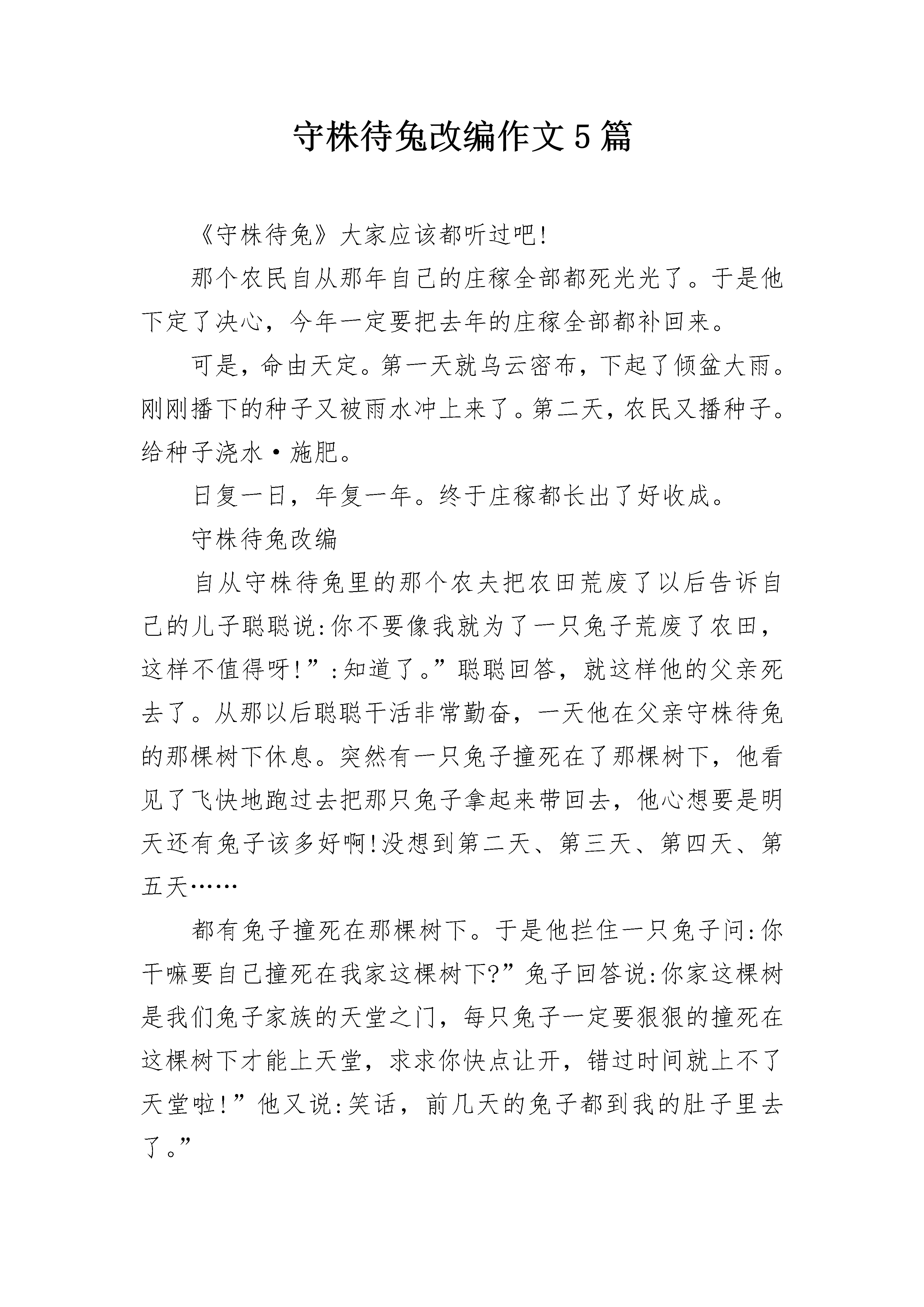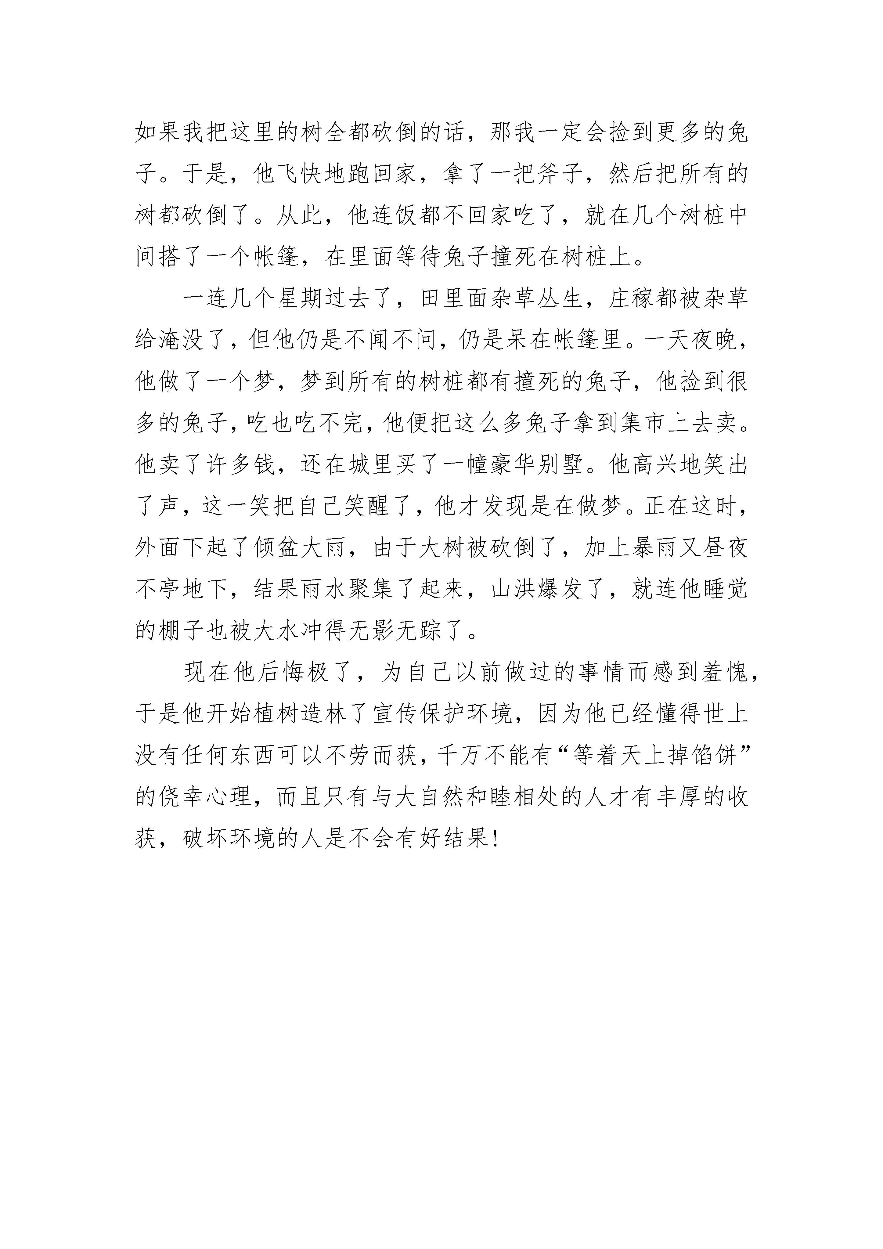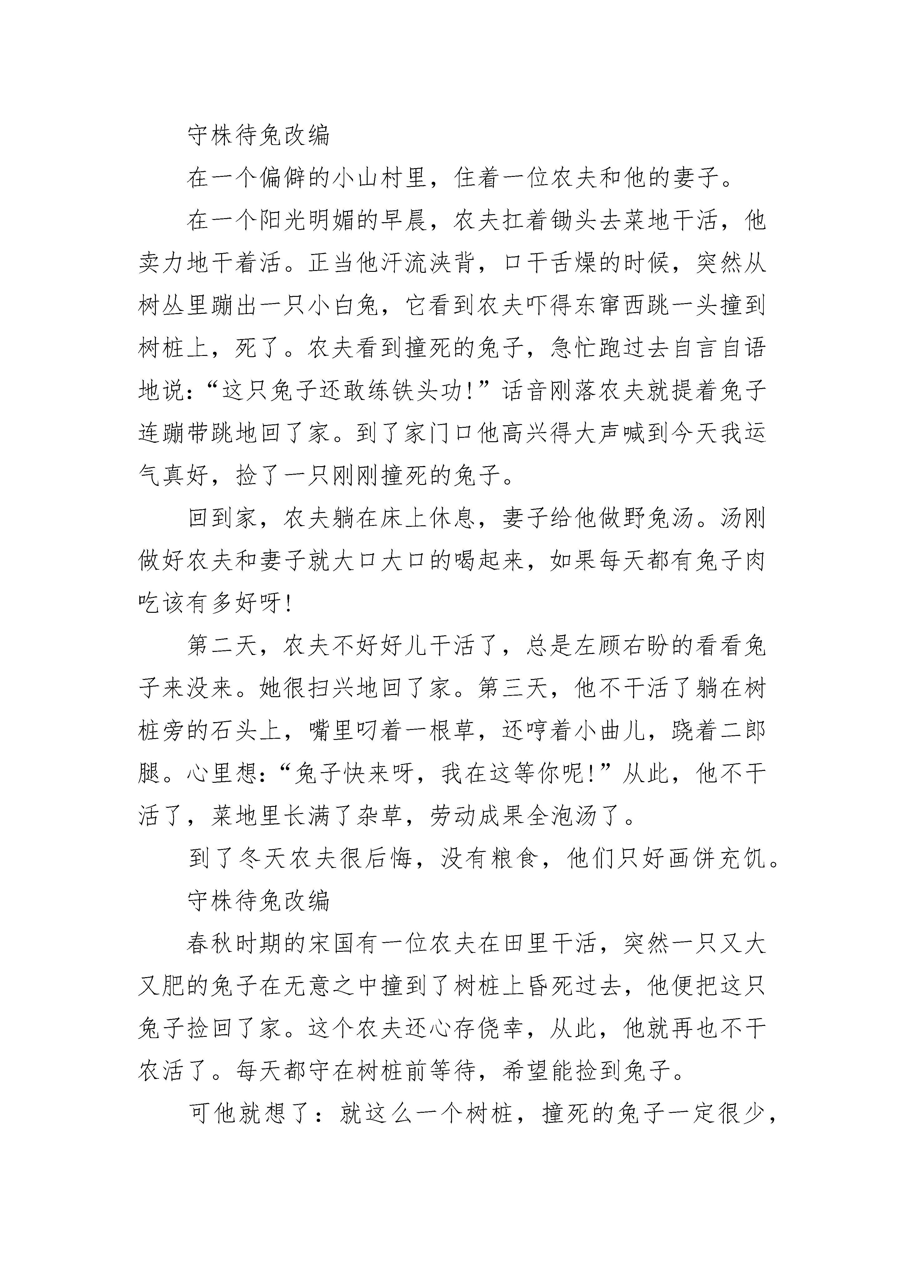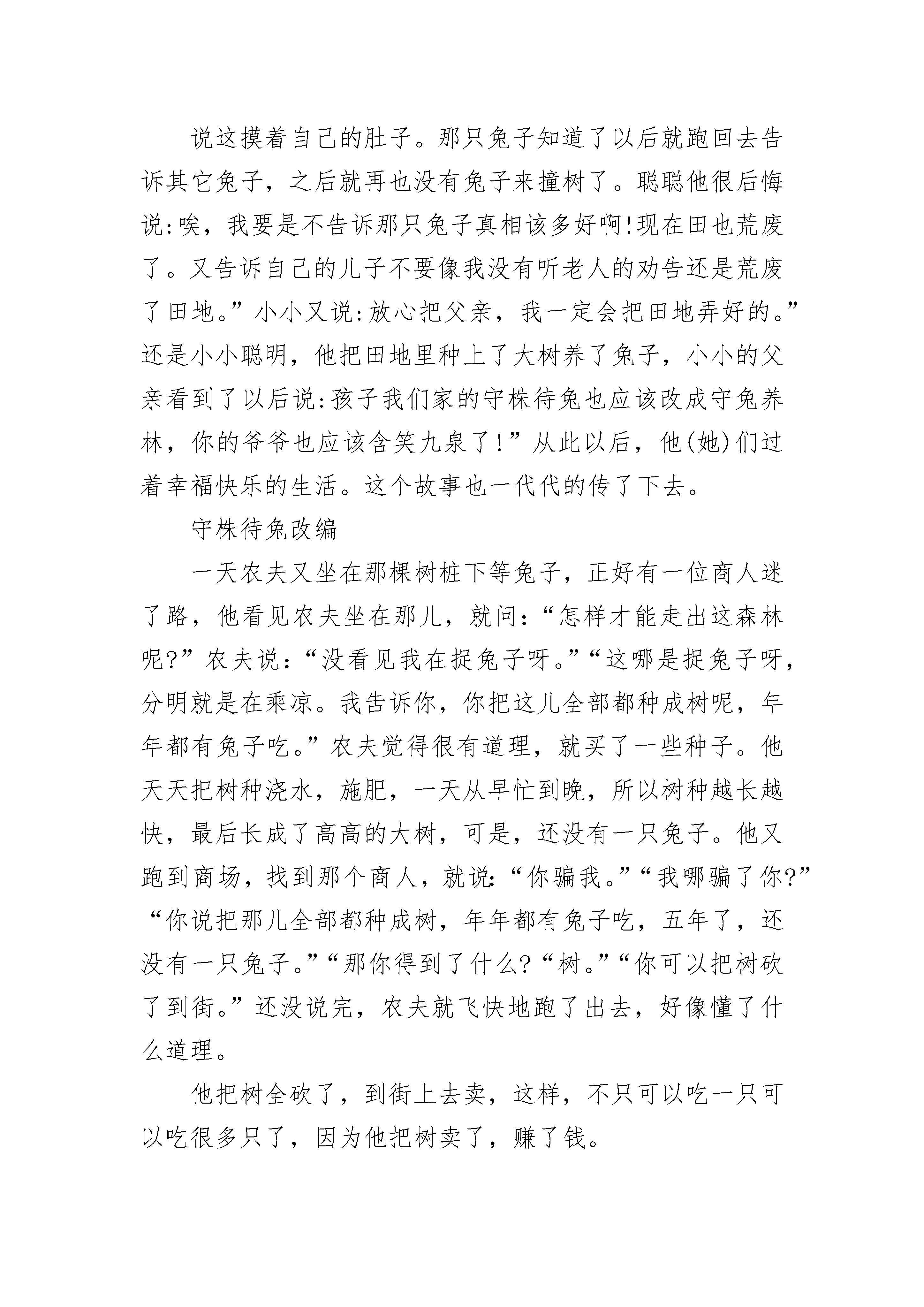 守株待兔改编作文5篇《守株待兔》大家应该都听过吧!那个农民自从那年自己的庄稼全部都死光光了。于是他下定了决心,今年一定要把去年的庄稼全部都补回来。可是,命由天定。第一天就乌云密布,下起了倾盆大雨。刚刚播下的种子又被雨水冲上来了。第二天,农民又播种子。给种子浇水·施肥。日复一日,年复一年。终于庄稼都长出了好收成。守株待兔改编自从守株待兔里的那个农夫把农田荒废了以后告诉自己的儿子聪聪说:你不要像我就为了一只兔子荒废了农田,这样不值得呀!”:知道了。”聪聪回答,就这样他的父亲死去了。从那以后聪聪干活非常勤奋,一天他在父亲守株待兔的那棵树下休息。突然有一只兔子撞死在了那棵树下,他看见了飞快地跑过去把那只兔子拿起来带回去,他心想要是明天还有兔子该多好啊!没想到第二天、第三天、第四天、第五天……都有兔子撞死在那棵树下。于是他拦住一只兔子问:你干嘛要自己撞死在我家这棵树下?”兔子回答说:你家这棵树是我们兔子家族的天堂之门,每只兔子一定要狠狠的撞死在这棵树下才能上天堂,求求你快点让开,错过时间就上不了天堂啦!”他又说:笑话,前几天的兔子都到我的肚子里去了。”说这摸着自己的肚子。那只兔子知道了以后就跑回去告诉其它兔子,之后就再也没有兔子来撞树了。聪聪他很后悔说:唉,我要是不告诉那只兔子真相该多好啊!现在田也荒废了。又告诉自己的儿子不要像我没有听老人的劝告还是荒废了田地。”小小又说:放心把父亲,我一定会把田地弄好的。”还是小小聪明,他把田地里种上了大树养了兔子,小小的父亲看到了以后说:孩子我们家的守株待兔也应该改成守兔养林,你的爷爷也应该含笑九泉了!”从此以后,他(她)们过着幸福快乐的生活。这个故事也一代代的传了下去。守株待兔改编一天农夫又坐在那棵树桩下等兔子,正好有一位商人迷了路,他看见农夫坐在那儿,就问:“怎样才能走出这森林呢?”农夫说:“没看见我在捉兔子呀。”“这哪是捉兔子呀,分明就是在乘凉。我吿诉你,你把这儿全部都种成树呢,年年都有兔子吃。”农夫觉得很有道理,就买了一些种子。他天天把树种浇水,施肥,一天从早忙到晚,所以树种越长越快,最后长成了高高的大树,可是,还没有一只兔子。他又跑到商场,找到那个商人,就说:“你骗我。”“我哪骗了你?”“你说把那儿全部都种成树,年年都有兔子吃,五年了,还没有一只兔子。”“那你得到了什么?“树。”“你可以把树砍了到街。”还没说完,农夫就飞快地跑了出去,好像懂了什么道理。他把树全砍了,到街上去卖,这样,不只可以吃一只可以吃很多只了,因为他把树卖了,赚了钱。守株待兔改编在一个偏僻的小山村里,住着一位农夫和他的妻子。在一个阳光明媚的早晨,农夫扛着锄头去菜地干活,他卖力地干着活。正当他汗流浃背,口干舌燥的时候,突然从树丛里蹦出一只小白兔,它看到农夫吓得东窜西跳一头撞到树桩上,死了。农夫看到撞死的兔子,急忙跑过去自言自语地说:“这只兔子还敢练铁头功!”话音刚落农夫就提着兔子连蹦带跳地回了家。到了家门口他高兴得大声喊到今天我运气真好,捡了一只刚刚撞死的兔子。回到家,农夫躺在床上休息,妻子给他做野兔汤。汤刚做好农夫和妻子就大口大口的喝起来,如果每天都有兔子肉吃该有多好呀!第二天,农夫不好好儿干活了,总是左顾右盼的看看兔子来没来。她很扫兴地回了家。第三天,他不干活了躺在树桩旁的石头上,嘴里叼着一根草,还哼着小曲儿,跷着二郎腿。心里想:“兔子快来呀,我在这等你呢!”从此,他不干活了,菜地里长满了杂草,劳动成果全泡汤了。到了冬天农夫很后悔,没有粮食,他们只好画饼充饥。守株待兔改编春秋时期的宋国有一位农夫在田里干活,突然一只又大又肥的兔子在无意之中撞到了树桩上昏死过去,他便把这只兔子捡回了家。这个农夫还心存侥幸,从此,他就再也不干农活了。每天都守在树桩前等待,希望能捡到兔子。可他就想了:就这么一个树桩,撞死的兔子一定很少,如果我把这里的树全都砍倒的话,那我一定会捡到更多的兔子。于是,他飞快地跑回家,拿了一把斧子,然后把所有的树都砍倒了。从此,他连饭都不回家吃了,就在几个树桩中间搭了一个帐篷,在里面等待兔子撞死在树桩上。一连几个星期过去了,田里面杂草丛生,庄稼都被杂草给淹没了,但他仍是不闻不问,仍是呆在帐篷里。一天夜晚,他做了一个梦,梦到所有的树桩都有撞死的兔子,他捡到很多的兔子,吃也吃不完,他便把这么多兔子拿到集市上去卖。他卖了许多钱,还在城里买了一幢豪华别墅。他高兴地笑出了声,这一笑把自己笑醒了,他才发现是在做梦。正在这时,外面下起了倾盆大雨,由于大树被砍倒了,加上暴雨又昼夜不亭地下,结果雨水聚集了起来,山洪爆发了,就连他睡觉的棚子也被大水冲得无影无踪了。现在他后悔极了,为自己以前做过的事情而感到羞愧,于是他开始植树造林了宣传保护环境,因为他已经懂得世上没有任何东西可以不劳而获,千万不能有“等着天上掉馅饼”的侥幸心理,而且