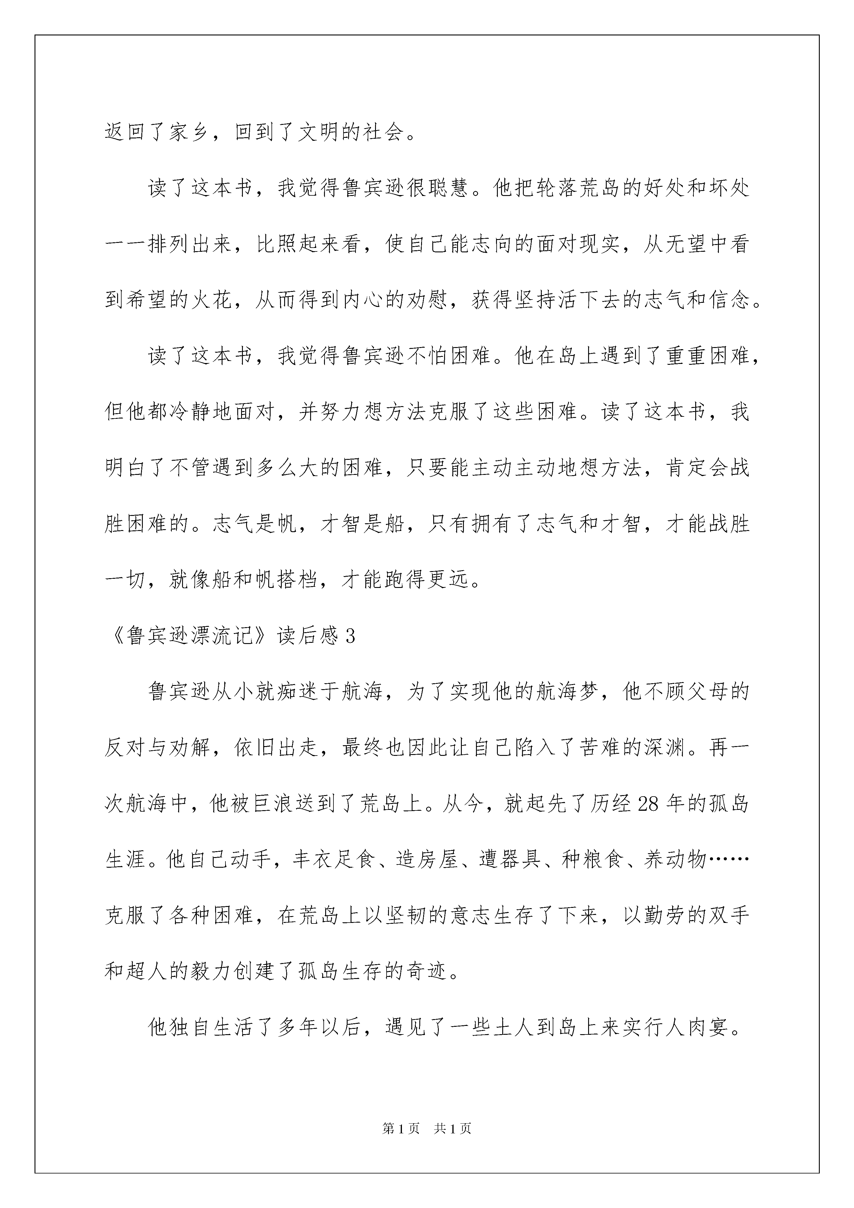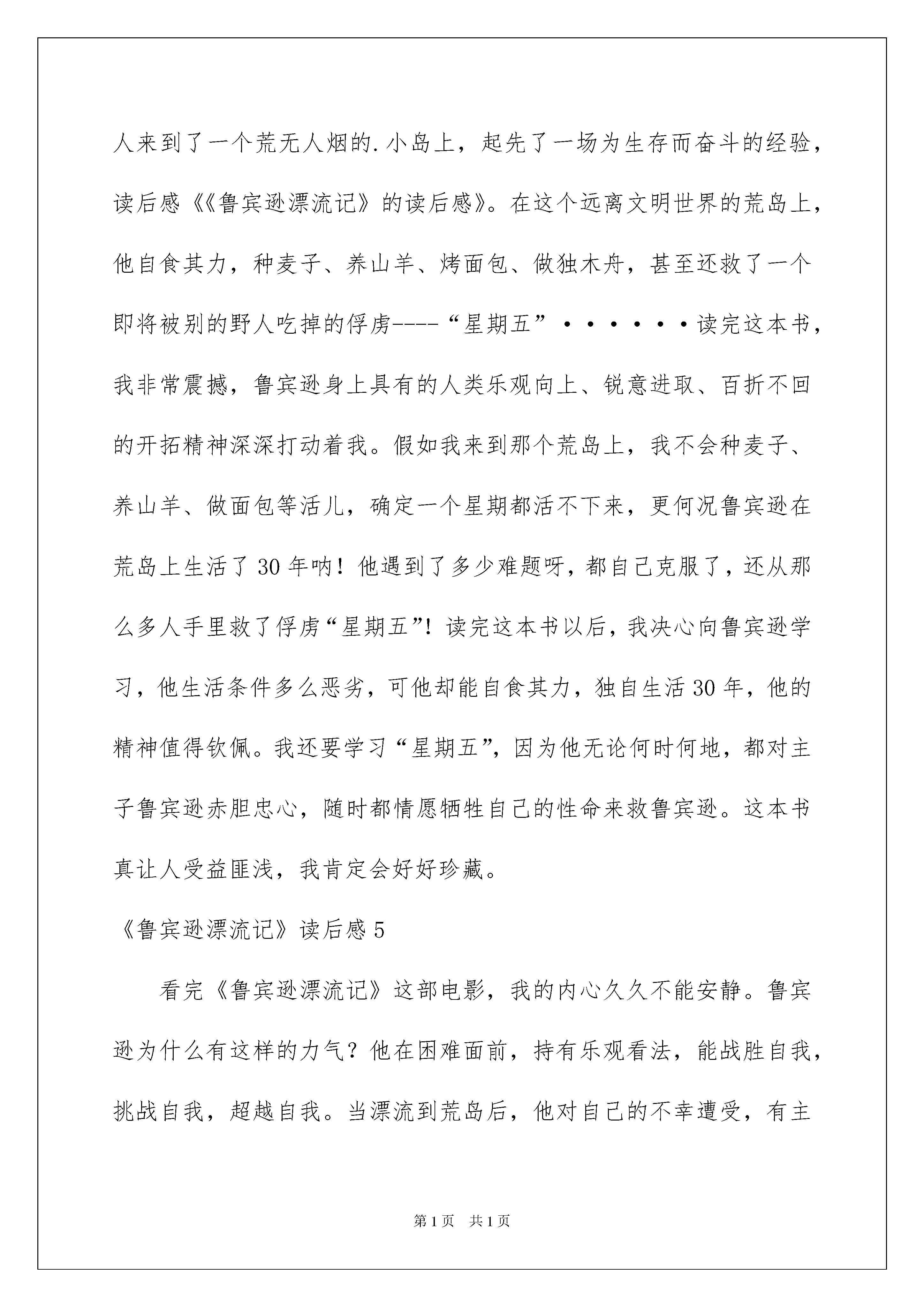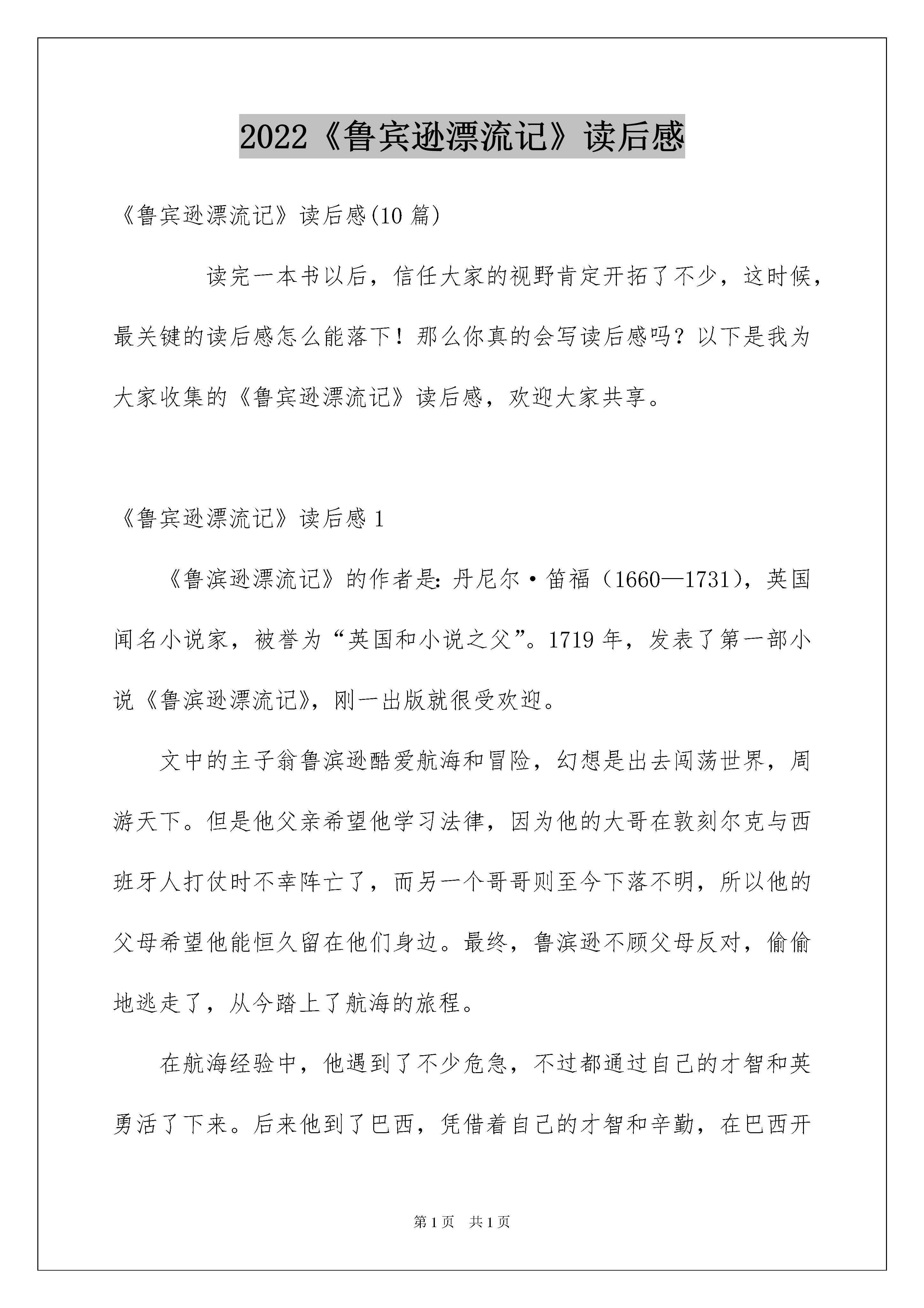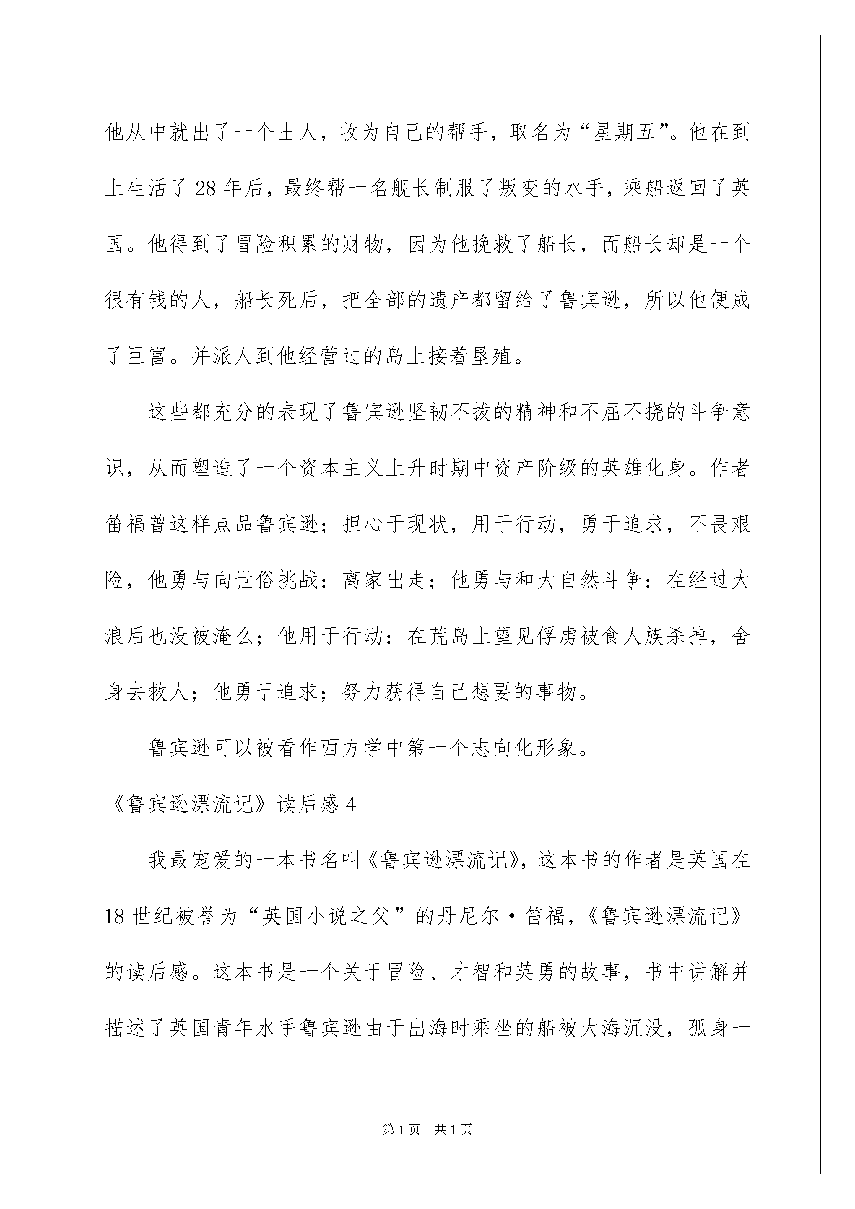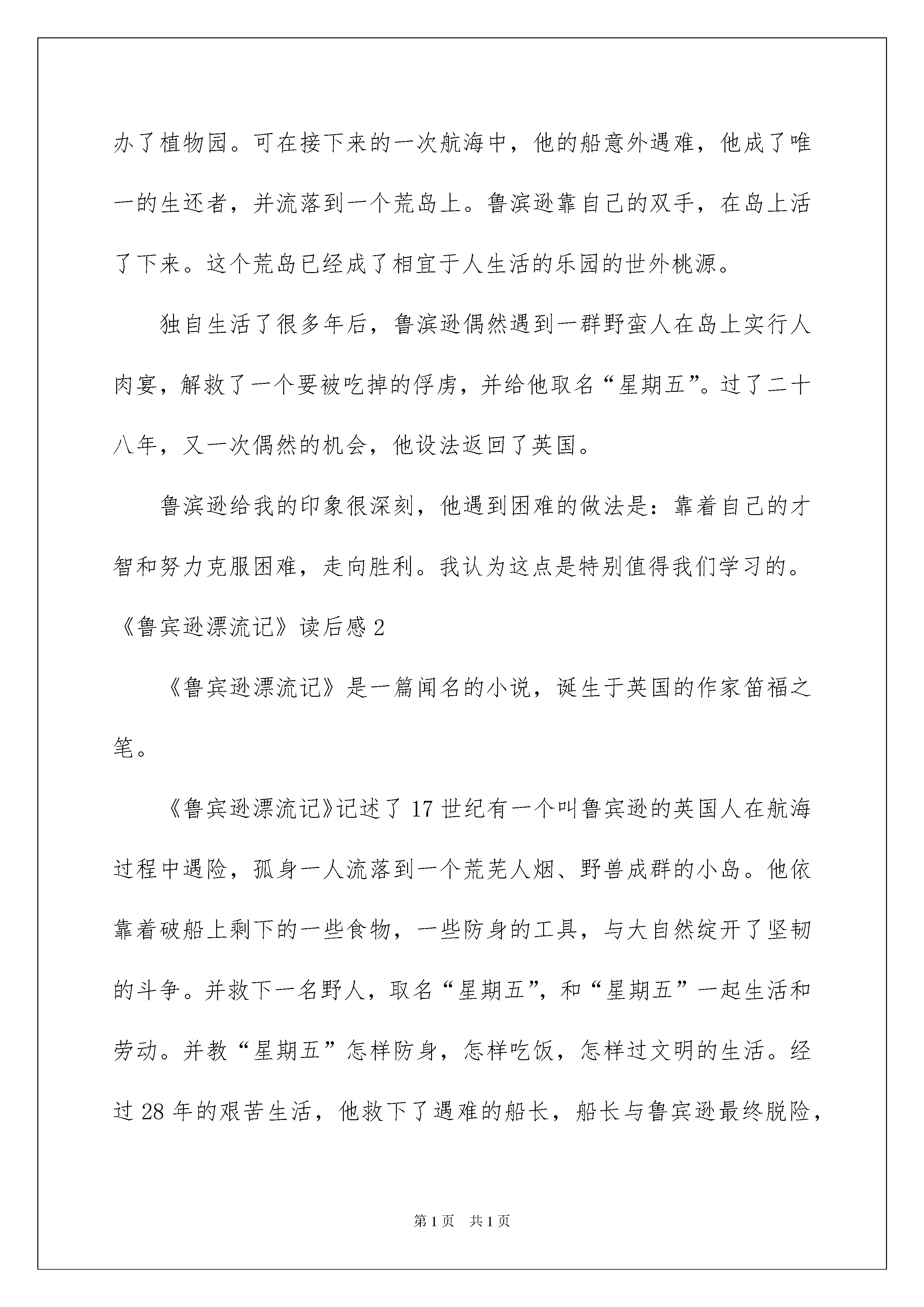 2022《鲁宾逊漂流记》读后感《鲁宾逊漂流记》读后感(10篇)读完一本书以后,信任大家的视野肯定开拓了不少,这时候,最关键的读后感怎么能落下!那么你真的会写读后感吗?以下是我为大家收集的《鲁宾逊漂流记》读后感,欢迎大家共享。《鲁宾逊漂流记》读后感1《鲁滨逊漂流记》的作者是:丹尼尔·笛福(1660—1731),英国闻名小说家,被誉为“英国和小说之父”。1719年,发表了第一部小说《鲁滨逊漂流记》,刚一出版就很受欢迎。文中的主子翁鲁滨逊酷爱航海和冒险,幻想是出去闯荡世界,周游天下。但是他父亲希望他学习法律,因为他的大哥在敦刻尔克与西班牙人打仗时不幸阵亡了,而另一个哥哥则至今下落不明,所以他的父母希望他能恒久留在他们身边。最终,鲁滨逊不顾父母反对,偷偷地逃走了,从今踏上了航海的旅程。在航海经验中,他遇到了不少危急,不过都通过自己的才智和英勇活了下来。后来他到了巴西,凭借着自己的才智和辛勤,在巴西开办了植物园。可在接下来的一次航海中,他的船意外遇难,他成了唯一的生还者,并流落到一个荒岛上。鲁滨逊靠自己的双手,在岛上活了下来。这个荒岛已经成了相宜于人生活的乐园的世外桃源。独自生活了很多年后,鲁滨逊偶然遇到一群野蛮人在岛上实行人肉宴,解救了一个要被吃掉的俘虏,并给他取名“星期五”。过了二十八年,又一次偶然的机会,他设法返回了英国。鲁滨逊给我的印象很深刻,他遇到困难的做法是:靠着自己的才智和努力克服困难,走向胜利。我认为这点是特别值得我们学习的。《鲁宾逊漂流记》读后感2《鲁宾逊漂流记》是一篇闻名的小说,诞生于英国的作家笛福之笔。《鲁宾逊漂流记》记述了17世纪有一个叫鲁宾逊的英国人在航海过程中遇险,孤身一人流落到一个荒芜人烟、野兽成群的小岛。他依靠着破船上剩下的一些食物,一些防身的工具,与大自然绽开了坚韧的斗争。并救下一名野人,取名“星期五”,和“星期五”一起生活和劳动。并教“星期五”怎样防身,怎样吃饭,怎样过文明的生活。经过28年的艰苦生活,他救下了遇难的船长,船长与鲁宾逊最终脱险,返回了家乡,回到了文明的社会。读了这本书,我觉得鲁宾逊很聪慧。他把轮落荒岛的好处和坏处一一排列出来,比照起来看,使自己能志向的面对现实,从无望中看到希望的火花,从而得到内心的劝慰,获得坚持活下去的志气和信念。读了这本书,我觉得鲁宾逊不怕困难。他在岛上遇到了重重困难,但他都冷静地面对,并努力想方法克服了这些困难。读了这本书,我明白了不管遇到多么大的困难,只要能主动主动地想方法,肯定会战胜困难的。志气是帆,才智是船,只有拥有了志气和才智,才能战胜一切,就像船和帆搭档,才能跑得更远。《鲁宾逊漂流记》读后感3鲁宾逊从小就痴迷于航海,为了实现他的航海梦,他不顾父母的反对与劝解,依旧出走,最终也因此让自己陷入了苦难的深渊。再一次航海中,他被巨浪送到了荒岛上。从今,就起先了历经28年的孤岛生涯。他自己动手,丰衣足食、造房屋、遭器具、种粮食、养动物……克服了各种困难,在荒岛上以坚韧的意志生存了下来,以勤劳的双手和超人的毅力创建了孤岛生存的奇迹。他独自生活了多年以后,遇见了一些土人到岛上来实行人肉宴。他从中就出了一个土人,收为自己的帮手,取名为“星期五”。他在到上生活了28年后,最终帮一名舰长制服了叛变的水手,乘船返回了英国。他得到了冒险积累的财物,因为他挽救了船长,而船长却是一个很有钱的人,船长死后,把全部的遗产都留给了鲁宾逊,所以他便成了巨富。并派人到他经营过的岛上接着垦殖。这些都充分的表现了鲁宾逊坚韧不拔的精神和不屈不挠的斗争意识,从而塑造了一个资本主义上升时期中资产阶级的英雄化身。作者笛福曾这样点品鲁宾逊;担心于现状,用于行动,勇于追求,不畏艰险,他勇与向世俗挑战:离家出走;他勇与和大自然斗争:在经过大浪后也没被淹么;他用于行动:在荒岛上望见俘虏被食人族杀掉,舍身去救人;他勇于追求;努力获得自己想要的事物。鲁宾逊可以被看作西方学中第一个志向化形象。《鲁宾逊漂流记》读后感4我最宠爱的一本书名叫《鲁宾逊漂流记》,这本书的作者是英国在18世纪被誉为“英国小说之父”的丹尼尔·笛福,《鲁宾逊漂流记》的读后感。这本书是一个关于冒险、才智和英勇的故事,书中讲解并描述了英国青年水手鲁宾逊由于出海时乘坐的船被大海沉没,孤身一人来到了一个荒无人烟的.小岛上,起先了一场为生存而奋斗的经验,读后感《《鲁宾逊漂流记》的读后感》。在这个远离文明世界的荒岛上,他自食其力,种麦子、养山羊、烤面包、做独木舟,甚至还救了一个即将被别的野人吃掉的俘虏----“星期五”······读完这本书,我非常震撼,鲁宾逊身上具有的人类乐观向上、锐意进取、百折不回的开