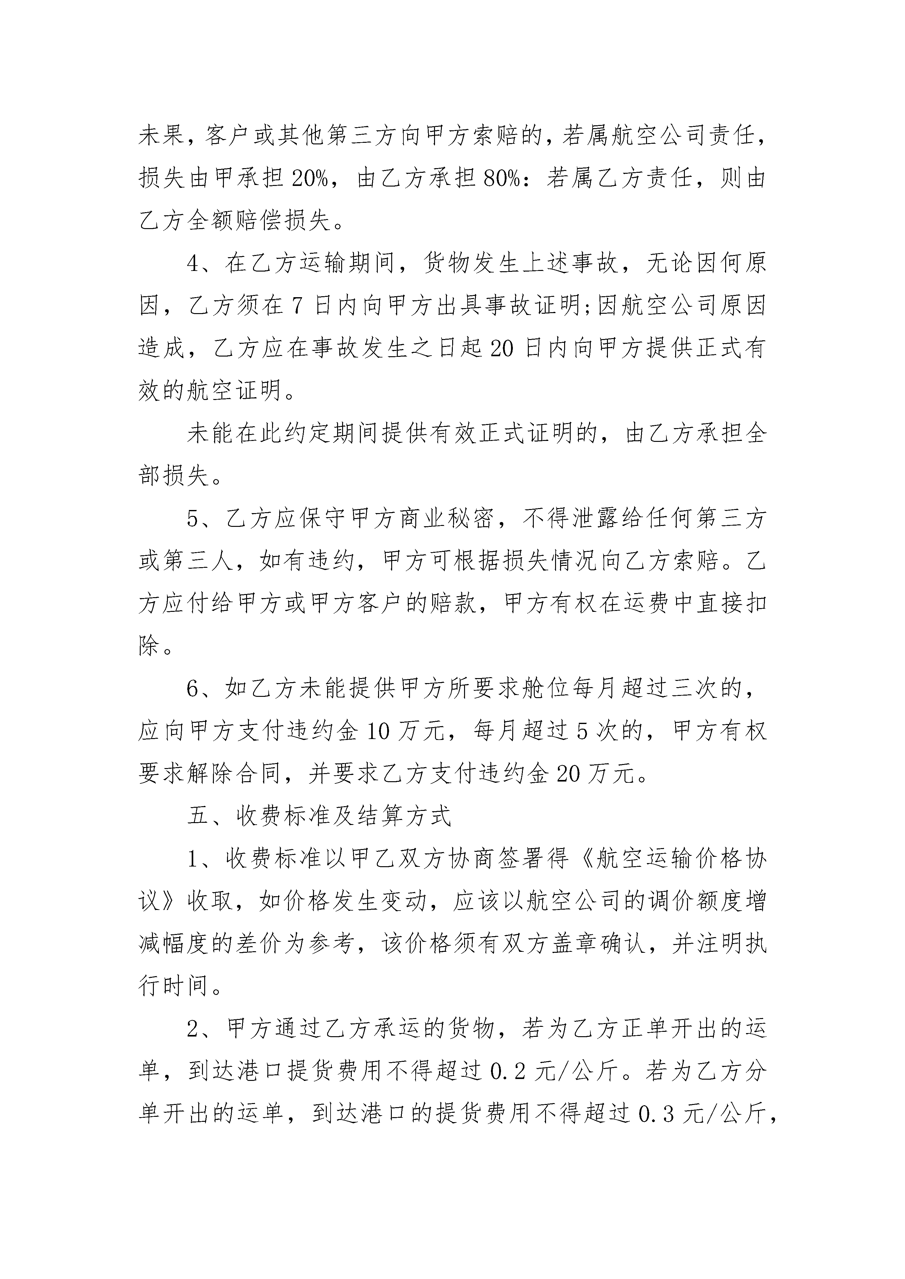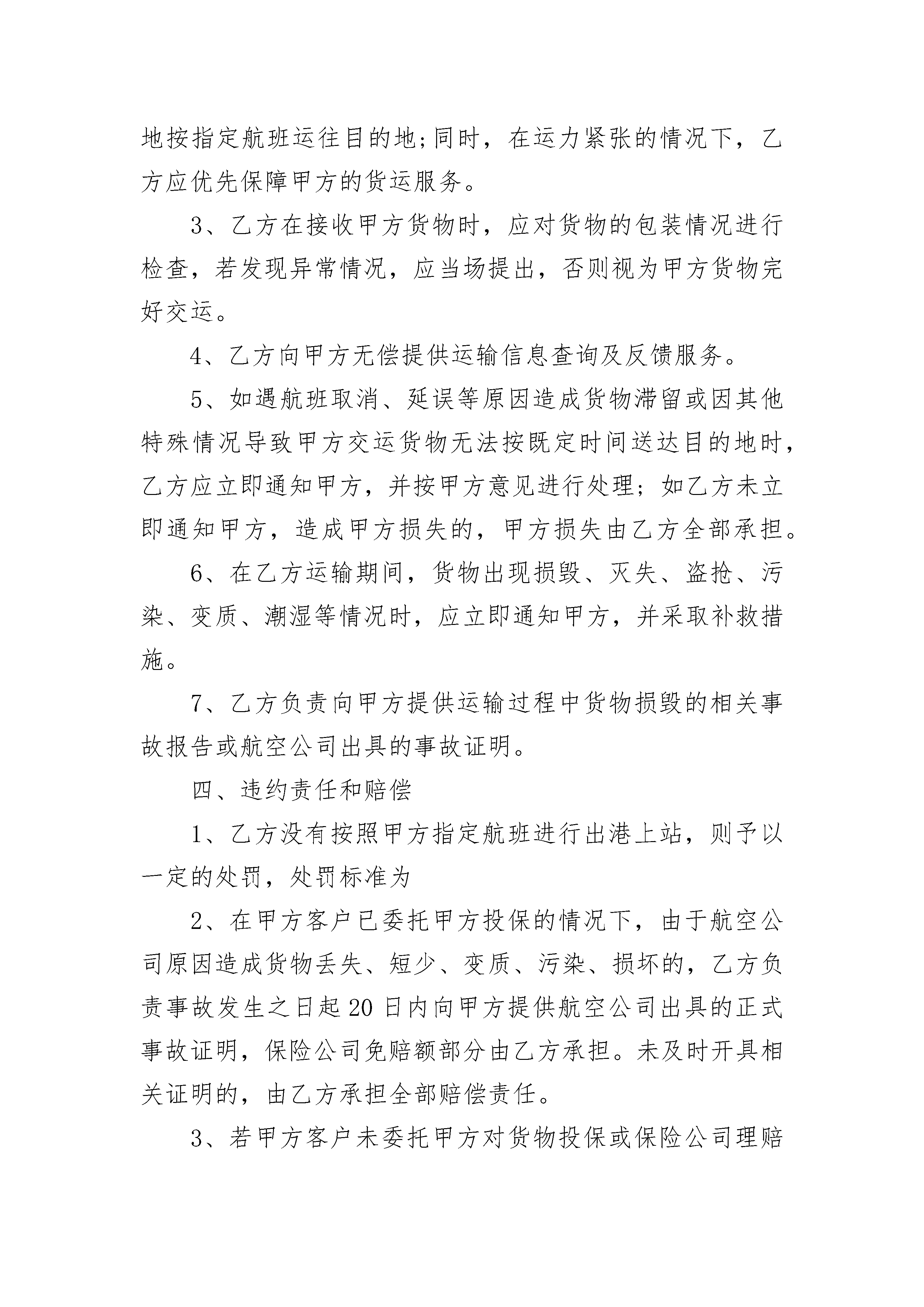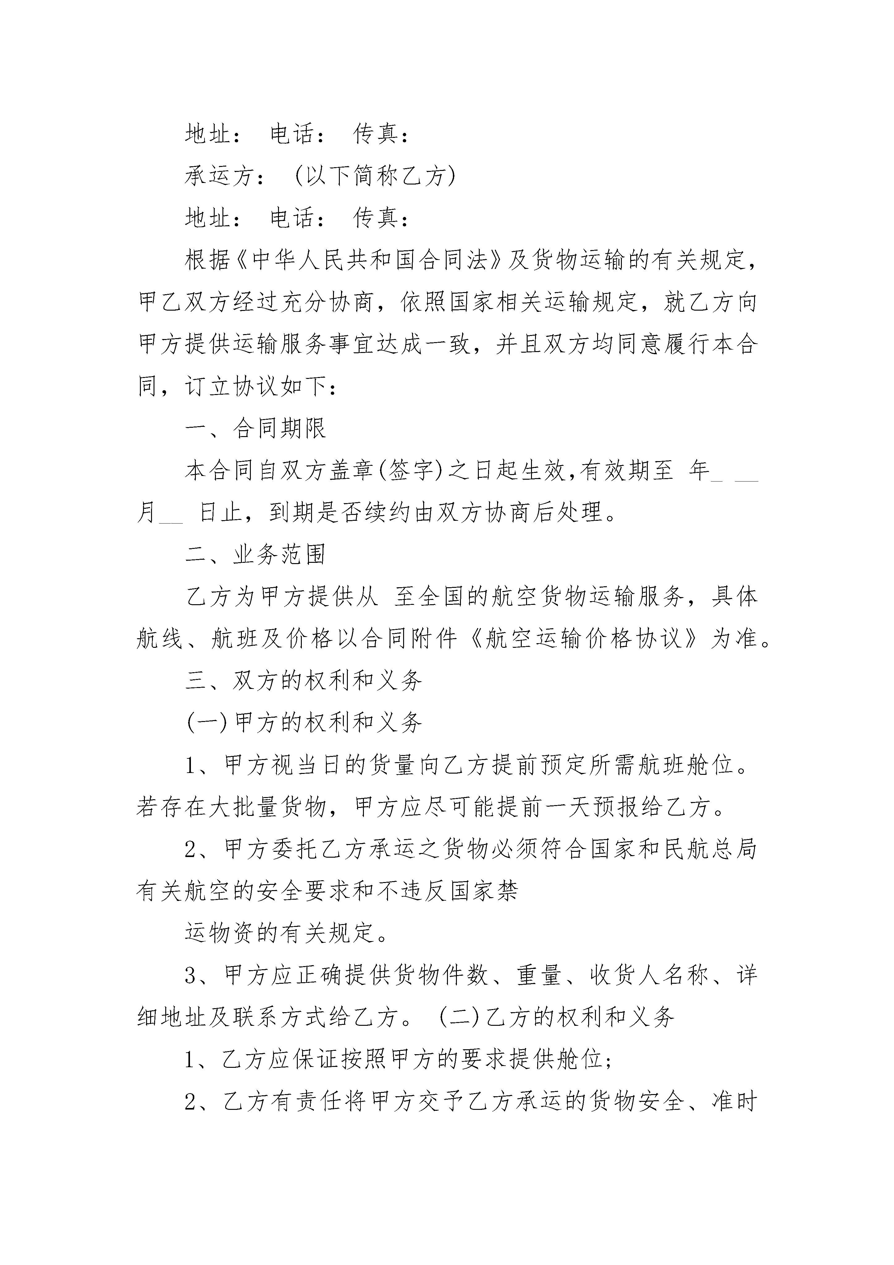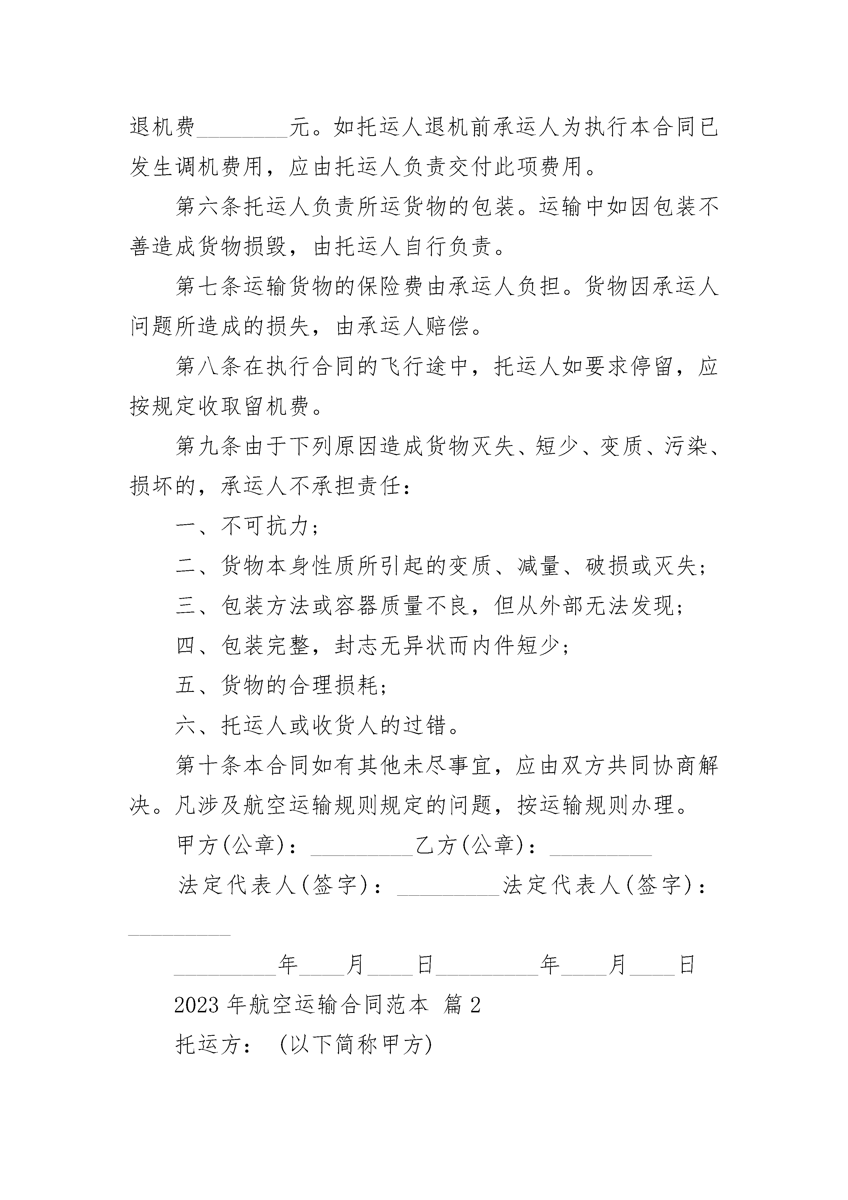 2023年航空运输合同范本2023年航空运输合同范本(精选19篇)2023年航空运输合同范本篇1托运人(姓名)__________与中国民用航空__________航空公司(以下简称承运人)协商空运__________(货物名称)到__________(到达地名),特签订本合同,并共同遵守下列条款:第一条托运人于__________月__________日起需用__________型飞机__________架次运送__________(货物名称),其航程如下:________月________日自________至________,停留________日;________月________日自________至________,停留________日;运输费用总计人民币________元。第二条根据飞机航程及经停站,可供托运人使用的载量为________公斤(内含客座)。如因天气或其他特殊原因需增加空勤人员或燃油时,载量照减。第三条飞机吨位如托运人未充分利用,民航可以利用空隙吨位。第四条承运人除因气象、政府禁令等原因外,应依期飞行。第五条托运人签订本合同后要求取消飞机班次,应交付退机费________元。如托运人退机前承运人为执行本合同已发生调机费用,应由托运人负责交付此项费用。第六条托运人负责所运货物的包装。运输中如因包装不善造成货物损毁,由托运人自行负责。第七条运输货物的保险费由承运人负担。货物因承运人问题所造成的损失,由承运人赔偿。第八条在执行合同的飞行途中,托运人如要求停留,应按规定收取留机费。第九条由于下列原因造成货物灭失、短少、变质、污染、损坏的,承运人不承担责任:一、不可抗力;二、货物本身性质所引起的变质、减量、破损或灭失;三、包装方法或容器质量不良,但从外部无法发现;四、包装完整,封志无异状而内件短少;五、货物的合理损耗;六、托运人或收货人的过错。第十条本合同如有其他未尽事宜,应由双方共同协商解决。凡涉及航空运输规则规定的问题,按运输规则办理。甲方(公章):_________乙方(公章):_________法定代表人(签字):_________法定代表人(签字):__________________年____月____日_________年____月____日2023年航空运输合同范本篇2托运方:(以下简称甲方)地址:电话:传真:承运方:(以下简称乙方)地址:电话:传真:根据《中华人民共和国合同法》及货物运输的有关规定,甲乙双方经过充分协商,依照国家相关运输规定,就乙方向甲方提供运输服务事宜达成一致,并且双方均同意履行本合同,订立协议如下:一、合同期限本合同自双方盖章(签字)之日起生效,有效期至年___月__日止,到期是否续约由双方协商后处理。二、业务范围乙方为甲方提供从至全国的航空货物运输服务,具体航线、航班及价格以合同附件《航空运输价格协议》为准。三、双方的权利和义务(一)甲方的权利和义务1、甲方视当日的货量向乙方提前预定所需航班舱位。若存在大批量货物,甲方应尽可能提前一天预报给乙方。2、甲方委托乙方承运之货物必须符合国家和民航总局有关航空的安全要求和不违反国家禁运物资的有关规定。3、甲方应正确提供货物件数、重量、收货人名称、详细地址及联系方式给乙方。(二)乙方的权利和义务1、乙方应保证按照甲方的要求提供舱位;2、乙方有责任将甲方交予乙方承运的货物安全、准时地按指定航班运往目的地;同时,在运力紧张的情况下,乙方应优先保障甲方的货运服务。3、乙方在接收甲方货物时,应对货物的包装情况进行检查,若发现异常情况,应当场提出,否则视为甲方货物完好交运。4、乙方向甲方无偿提供运输信息查询及反馈服务。5、如遇航班取消、延误等原因造成货物滞留或因其他特殊情况导致甲方交运货物无法按既定时间送达目的地时,乙方应立即通知甲方,并按甲方意见进行处理;如乙方未立即通知甲方,造成甲方损失的,甲方损失由乙方全部承担。6、在乙方运输期间,货物出现损毁、灭失、盗抢、污染、变质、潮湿等情况时,应立即通知甲方,并采取补救措施。7、乙方负责向甲方提供运输过程中货物损毁的相关事故报告或航空公司出具的事故证明。四、违约责任和赔偿1、乙方没有按照甲方指定航班进行出港上站,则予以一定的处罚,处罚标准为2、在甲方客户已委托甲方投保的情况下,由于航空公司原因造成货物丢失、短少、变质、污染、损坏的,乙方负责事故发生之日起20日内向甲方提供航空公司出具的正式事故证明,保险公司免赔额部分由乙方承担。未及时开具相关证明的,由乙方承担全部赔偿责任。3、若甲方客户未委托甲方对货物投保或保险公司理赔未果,客户或其他第三方向甲方索赔的,若属航空公司责任,损失由甲承担20%,由乙方承担80%:若属乙方责任,则由乙方全额赔偿损失。4、在乙方运输期间,货物发生上述事故,无论因