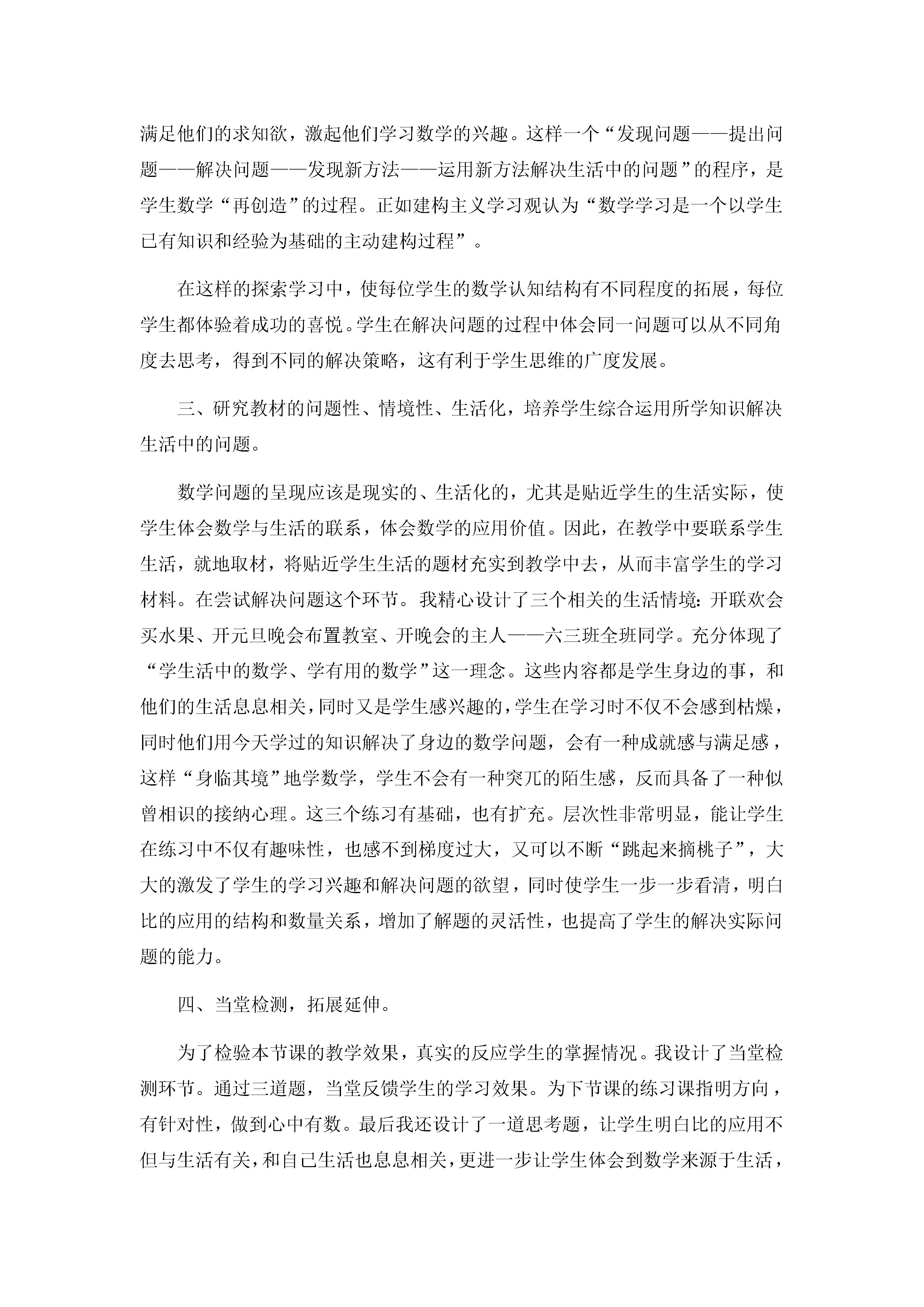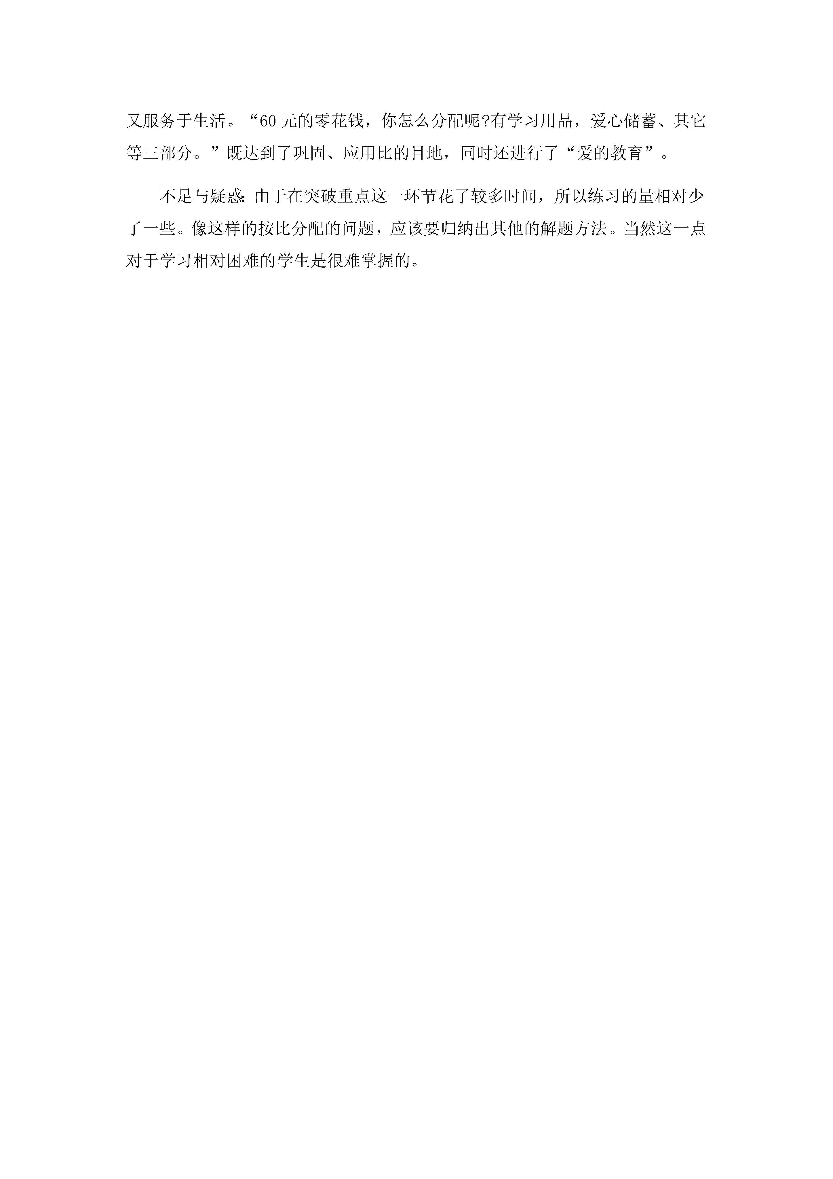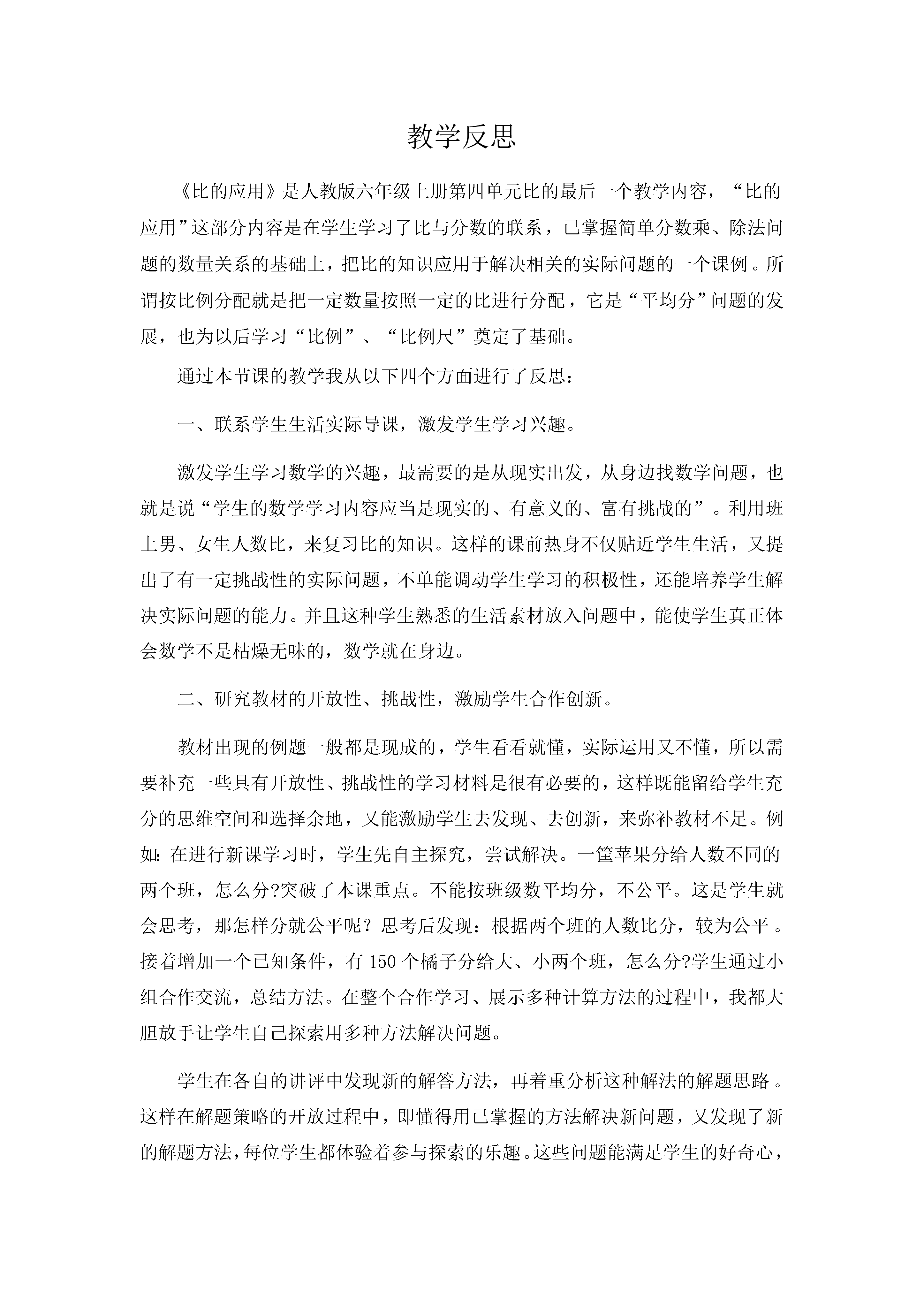 教学反思《比的应用》是人教版六年级上册第四单元比的最后一个教学内容,“比的应用”这部分内容是在学生学习了比与分数的联系,已掌握简单分数乘、除法问题的数量关系的基础上,把比的知识应用于解决相关的实际问题的一个课例。所谓按比例分配就是把一定数量按照一定的比进行分配,它是“平均分”问题的发展,也为以后学习“比例”、“比例尺”奠定了基础。通过本节课的教学我从以下四个方面进行了反思:一、联系学生生活实际导课,激发学生学习兴趣。激发学生学习数学的兴趣,最需要的是从现实出发,从身边找数学问题,也就是说“学生的数学学习内容应当是现实的、有意义的、富有挑战的”。利用班上男、女生人数比,来复习比的知识。这样的课前热身不仅贴近学生生活,又提出了有一定挑战性的实际问题,不单能调动学生学习的积极性,还能培养学生解决实际问题的能力。并且这种学生熟悉的生活素材放入问题中,能使学生真正体会数学不是枯燥无味的,数学就在身边。二、研究教材的开放性、挑战性,激励学生合作创新。教材出现的例题一般都是现成的,学生看看就懂,实际运用又不懂,所以需要补充一些具有开放性、挑战性的学习材料是很有必要的,这样既能留给学生充分的思维空间和选择余地,又能激励学生去发现、去创新,来弥补教材不足。例如:在进行新课学习时,学生先自主探究,尝试解决。一筐苹果分给人数不同的两个班,怎么分?突破了本课重点。不能按班级数平均分,不公平。这是学生就会思考,那怎样分就公平呢?思考后发现:根据两个班的人数比分,较为公平。接着增加一个已知条件,有150个橘子分给大、小两个班,怎么分?学生通过小组合作交流,总结方法。在整个合作学习、展示多种计算方法的过程中,我都大胆放手让学生自己探索用多种方法解决问题。学生在各自的讲评中发现新的解答方法,再着重分析这种解法的解题思路。这样在解题策略的开放过程中,即懂得用已掌握的方法解决新问题,又发现了新的解题方法,每位学生都体验着参与探索的乐趣。这些问题能满足学生的好奇心,满足他们的求知欲,激起他们学习数学的兴趣。这样一个“发现问题——提出问题——解决问题——发现新方法——运用新方法解决生活中的问题”的程序,是学生数学“再创造”的过程。正如建构主义学习观认为“数学学习是一个以学生已有知识和经验为基础的主动建构过程”。在这样的探索学习中,使每位学生的数学认知结构有不同程度的拓展,每位学生都体验着成功的喜悦。学生在解决问题的过程中体会同一问题可以从不同角度去思考,得到不同的解决策略,这有利于学生思维的广度发展。三、研究教材的问题性、情境性、生活化,培养学生综合运用所学知识解决生活中的问题。数学问题的呈现应该是现实的、生活化的,尤其是贴近学生的生活实际,使学生体会数学与生活的联系,体会数学的应用价值。因此,在教学中要联系学生生活,就地取材,将贴近学生生活的题材充实到教学中去,从而丰富学生的学习材料。在尝试解决问题这个环节。我精心设计了三个相关的生活情境:开联欢会买水果、开元旦晚会布置教室、开晚会的主人——六三班全班同学。充分体现了“学生活中的数学、学有用的数学”这一理念。这些内容都是学生身边的事,和他们的生活息息相关,同时又是学生感兴趣的,学生在学习时不仅不会感到枯燥,同时他们用今天学过的知识解决了身边的数学问题,会有一种成就感与满足感,这样“身临其境”地学数学,学生不会有一种突兀的陌生感,反而具备了一种似曾相识的接纳心理。这三个练习有基础,也有扩充。层次性非常明显,能让学生在练习中不仅有趣味性,也感不到梯度过大,又可以不断“跳起来摘桃子”,大大的激发了学生的学习兴趣和解决问题的欲望,同时使学生一步一步看清,明白比的应用的结构和数量关系,增加了解题的灵活性,也提高了学生的解决实际问题的能力。四、当堂检测,拓展延伸。为了检验本节课的教学效果,真实的反应学生的掌握情况。我设计了当堂检测环节。通过三道题,当堂反馈学生的学习效果。为下节课的练习课指明方向,有针对性,做到心中有数。最后我还设计了一道思考题,让学生明白比的应用不但与生活有关,和自己生活也息息相关,更进一步让学生体会到数学来源于生活,又服务于生活。“60元的零花钱,你怎么分配呢?有学习用品,爱心储蓄、其它等三部分。”既达到了巩固、应用比的目地,同时还进行了“爱的教育”。不足与疑惑:由于在突破重点这一环节花了较多时间,所以练习的量相对少了一些。像这样的按比分配的问题,应该要归纳出其他的解题方法。当然这一点对于学习相对困难的学生是很难掌握的。