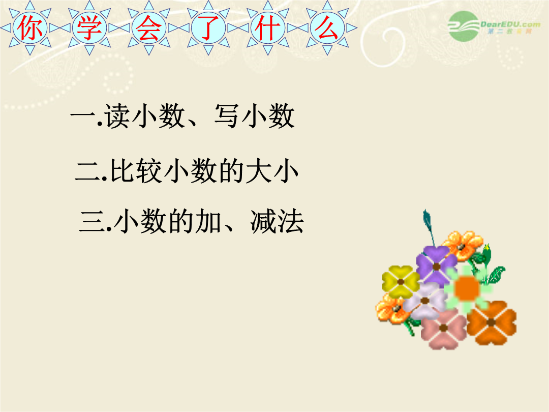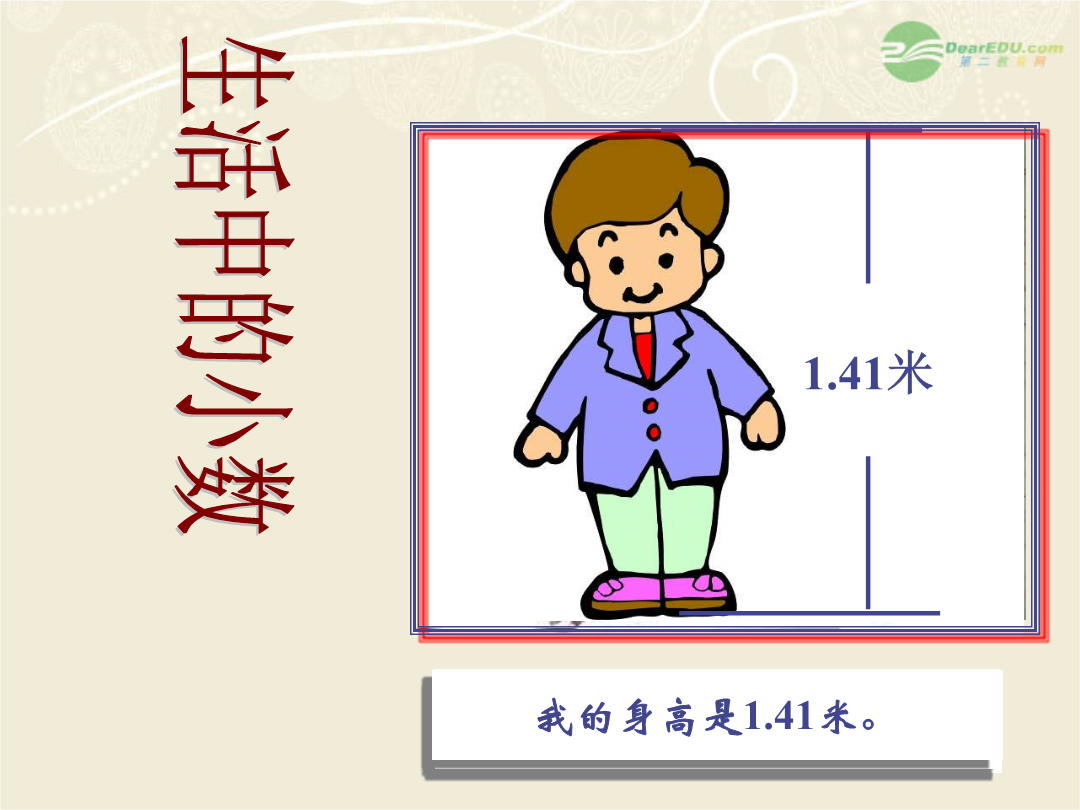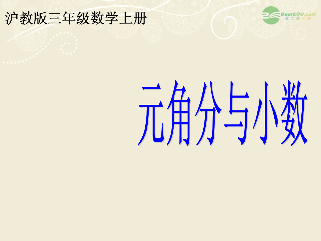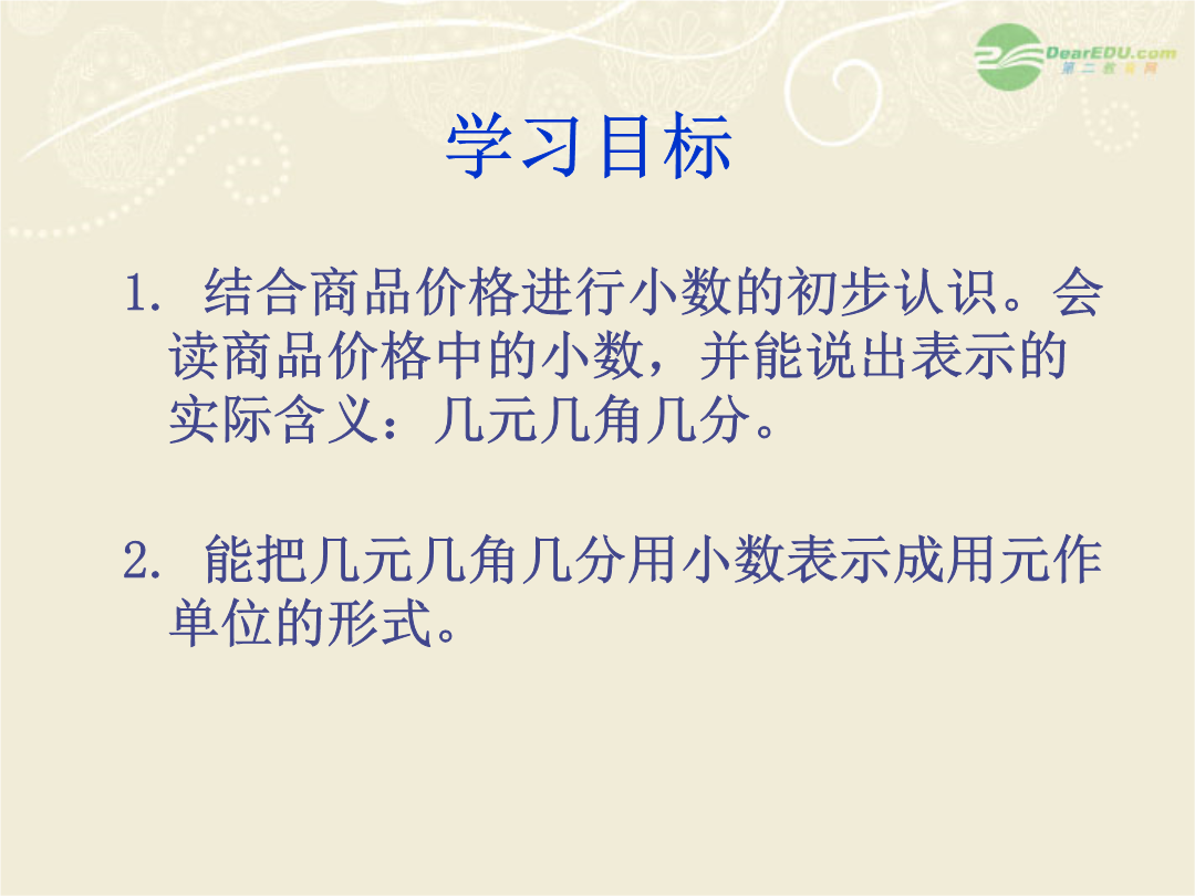 元角分与小数学习目标直接说得数。元、角、分你0.35元读作:0.07吨读作:89.89厘米读作:104.46米读作:填想一想:2.45○1.832.68○2.077.09○7.036.01○6.106.50元○6.5元0.93元○0.39元2.05元○205分0.5元○0.49元今天我来当老师:1.买一个玻璃杯和一个塑料杯共多少元?3.三种杯各买一个,30元够吗?你能提出哪些问题?一步计算的:两步计算的:种类单位(元)自我介绍今天收获可真多,快和大家说一说。知识共同来分享,我们心里多快活!