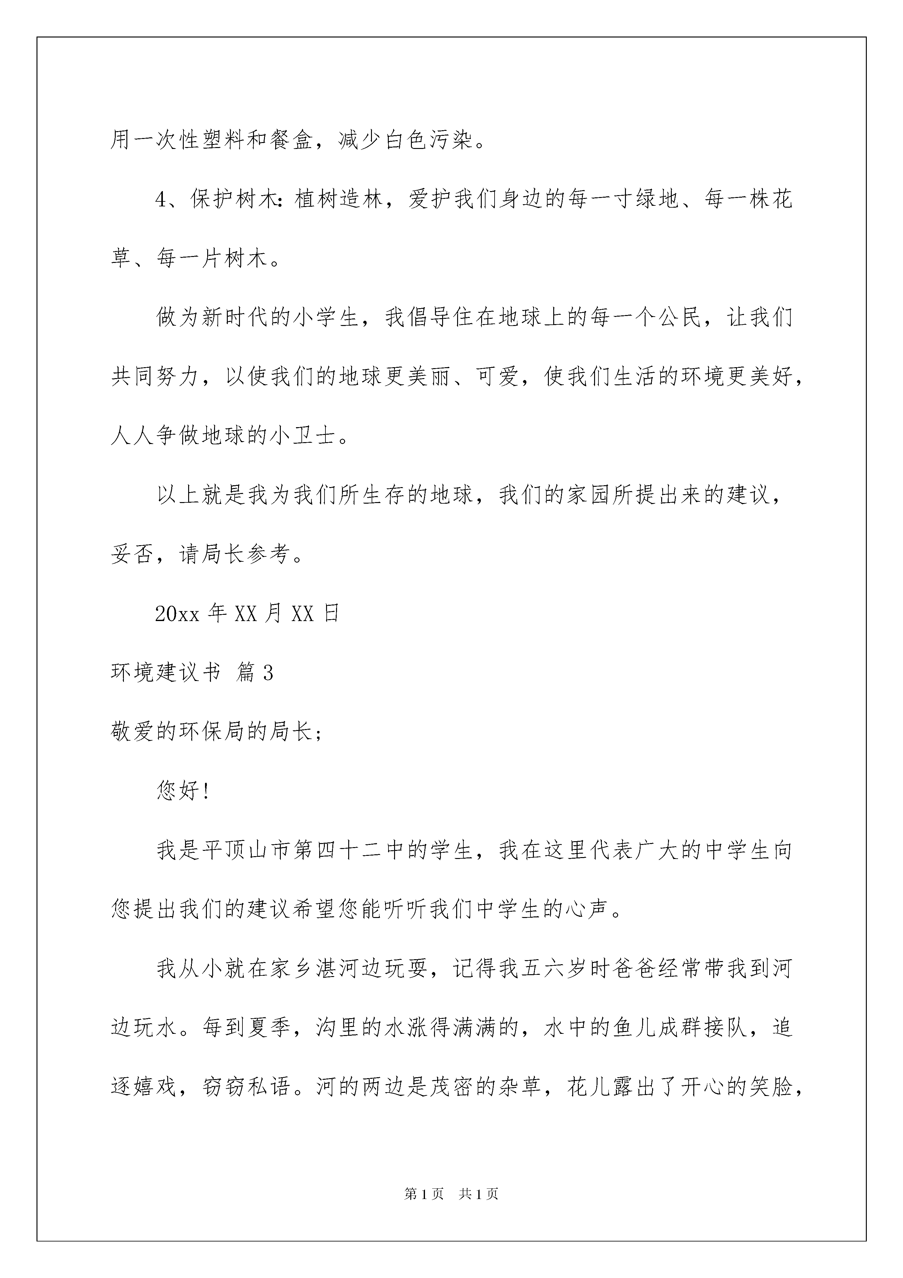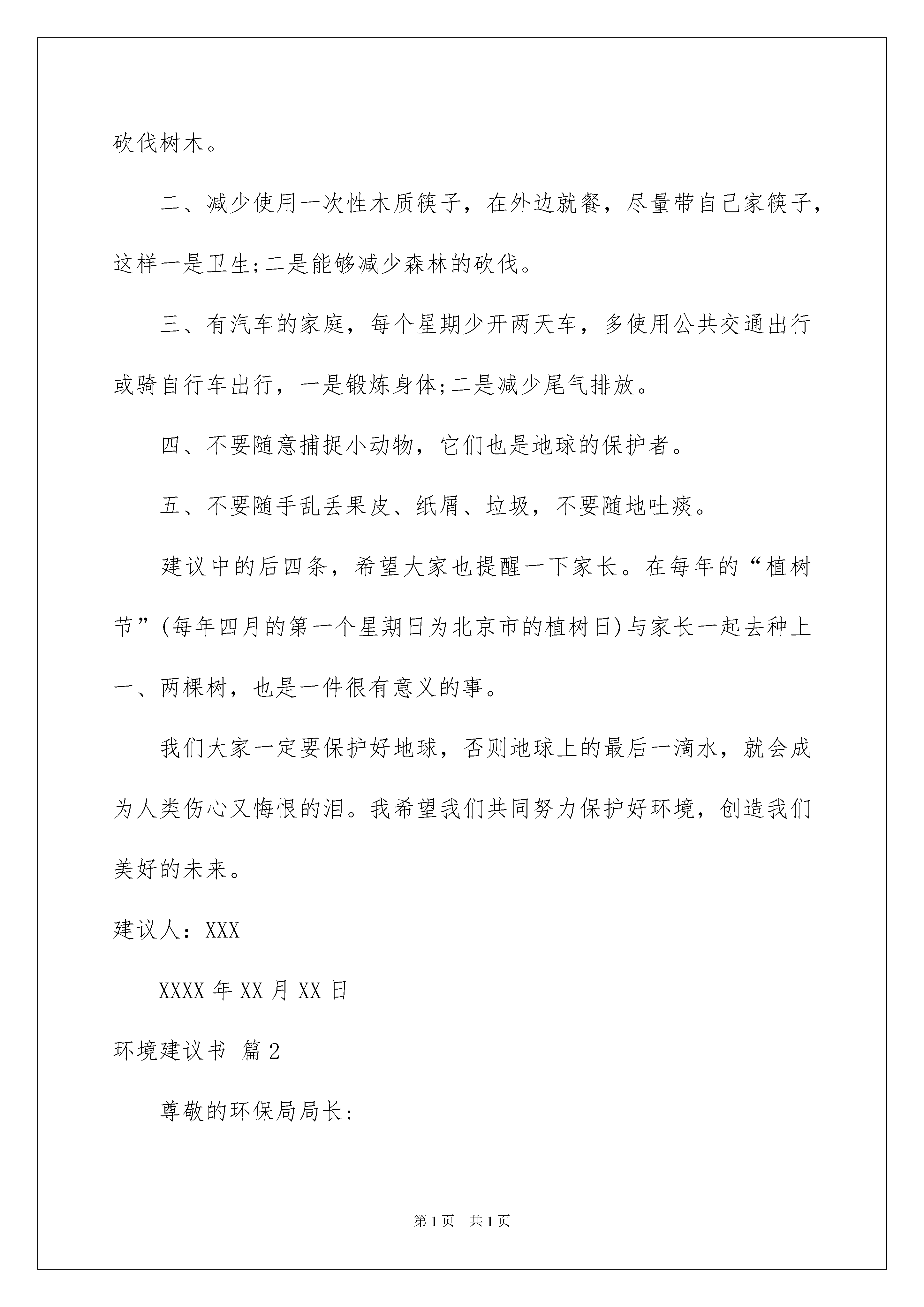 2022关于环境建议书集锦六篇关于环境建议书集锦六篇在日常生活和工作中,建议书对我们的作用越来越大,建议书是人们发表意见,提供建议的一种工具。写起建议书来就毫无头绪?下面是我帮大家整理的环境建议书6篇,欢迎阅读,希望大家能够喜欢。环境建议书篇1同学们:你们都知道,现在黄沙满天,植物稀少、大雾弥漫、全球气候变暖,二氧化碳到处都是,臭氧层逐渐稀薄,身边环境越来越糟,原因何在?我给大家举例说明:原来下雪,那雪都能吃,现在呢?谁还敢吃啊!脏脏的。还有,我家的楼下,本来前几年绿化的很好,绿植繁多,夏天舒适凉爽。近两年,由于没人管理,草地变成了光秃秃的遛狗场和水泥地,一些人还在绿地里种上了葫芦、豆角、丝瓜等等,夏天还可以,秋天以后那绿地就没法看了。为了更好地保护我们的环境,我提出以下建议:一、多种绿色植被,依法按照科学的规律,更新树木,不许随意砍伐树木。二、减少使用一次性木质筷子,在外边就餐,尽量带自己家筷子,这样一是卫生;二是能够减少森林的砍伐。三、有汽车的家庭,每个星期少开两天车,多使用公共交通出行或骑自行车出行,一是锻炼身体;二是减少尾气排放。四、不要随意捕捉小动物,它们也是地球的保护者。五、不要随手乱丢果皮、纸屑、垃圾,不要随地吐痰。建议中的后四条,希望大家也提醒一下家长。在每年的“植树节”(每年四月的第一个星期日为北京市的植树日)与家长一起去种上一、两棵树,也是一件很有意义的事。我们大家一定要保护好地球,否则地球上的最后一滴水,就会成为人类伤心又悔恨的泪。我希望我们共同努力保护好环境,创造我们美好的未来。建议人:XXXXXXX年XX月XX日环境建议书篇2尊敬的环保局局长:您好!地球妈妈用甘甜的乳汁哺育了无数代炎黄子孙。原来的她经无数仁人志士的努力,祖国河山到处锦绣繁荣。可是,现在人类为了自身的利益,将她折磨得随处可见千疮百孔。人类只有一个地球;而地球正面临着严峻的环境危机。“救救地球”已成为世界各国人民最强烈的呼声。我通过在书刊、报纸、互联网大量收集、整理资料证明:环境问题是因为人类不合理地开发和利用自然资源所造成的。一个个铁一样的事实告诉我们:环境污染像恶魔般无情地吞噬着人类的生命。它威胁着生态平衡,危害着人体健康,制约着经济和社会的可持续发展,它让人类陷入了困境。为此,为了我们要时刻不忘保护环境的意识,有依法治理环境,保护环境的意识,特提出如下建议:1、节约资源:节水为荣,随时关上水龙头,千万不能浪费我们的水资源。2、分类回收:不乱丢弃废电池、废塑料等垃圾、废物。3、重复使用:尽量少使用一次性用品,多使用耐用品。如不使用一次性塑料和餐盒,减少白色污染。4、保护树木:植树造林,爱护我们身边的每一寸绿地、每一株花草、每一片树木。做为新时代的小学生,我倡导住在地球上的每一个公民,让我们共同努力,以使我们的地球更美丽、可爱,使我们生活的环境更美好,人人争做地球的小卫士。以上就是我为我们所生存的地球,我们的家园所提出来的建议,妥否,请局长参考。20xx年XX月XX日环境建议书篇3敬爱的环保局的局长;您好!我是平顶山市第四十二中的学生,我在这里代表广大的中学生向您提出我们的建议希望您能听听我们中学生的心声。我从小就在家乡湛河边玩耍,记得我五六岁时爸爸经常带我到河边玩水。每到夏季,沟里的水涨得满满的,水中的鱼儿成群接队,追逐嬉戏,窃窃私语。河的两边是茂密的杂草,花儿露出了开心的笑脸,小草随着风婀娜着身子,鸭子喜欢在草丛中穿来穿去,仿佛在捉迷藏,每天一早,当杂草上闪烁着露珠,鸭子就歌唱起来了。清澈的沟水哗哗地向东流去,似乎也在欢乐地合唱着,每天下午,这里简直成了我们小朋友的乐园。现在,在不知不觉中,沟水变的又脏又臭,连一条小鱼也少了许多,各色的塑料袋,树叶禾杆,饮料罐……原来,近几年,城市的废水没有经过处理就直接排进这条水沟,人们也随便往沟里倒垃圾,丢砖头……现在,湛河两边虽然经过了治理,但鸟儿却不再在这里搭巢,鸭子不在这里歌唱,柳树也失去了昔日的生机。如今,愚昧无知的人类却无止镜地把工厂的废气、废液和烟尘大量地排放到地球妈妈的皮肤上、血液里,排放到地球妈妈哺养人类的乳汁中,那一团团废气、烟尘,那一股股废液、污水,像群群癌细胞张牙舞爪地向地球扑来,侵袭着地球的身体健康,甚至还把保护地球妈妈和我们的臭氧层面纱撕了两个打洞,使紫外线无情地灼伤了地球妈妈的皮肤,严重危害着我们的'生存。你看,我们常把天空比喻是蔚蓝的海洋、白云比喻是洁白的棉花,草地比喻成绿色的地毯,而实际却一切都变成灰色的,这些环境的变化,令我伤心,让我落泪。于是我提出如下建议:1、提醒周围的人们买菜时不用塑料方便袋,以减少白