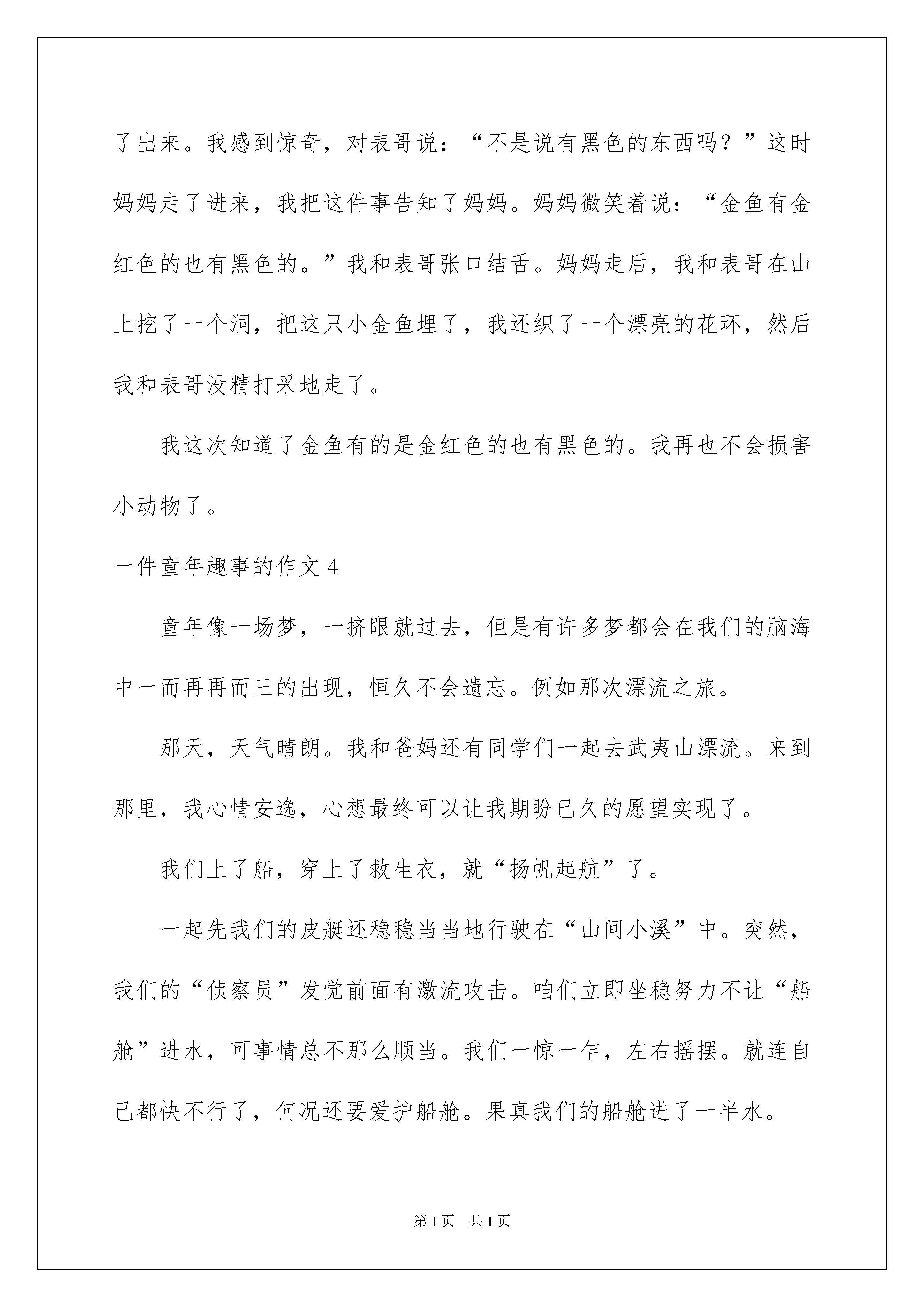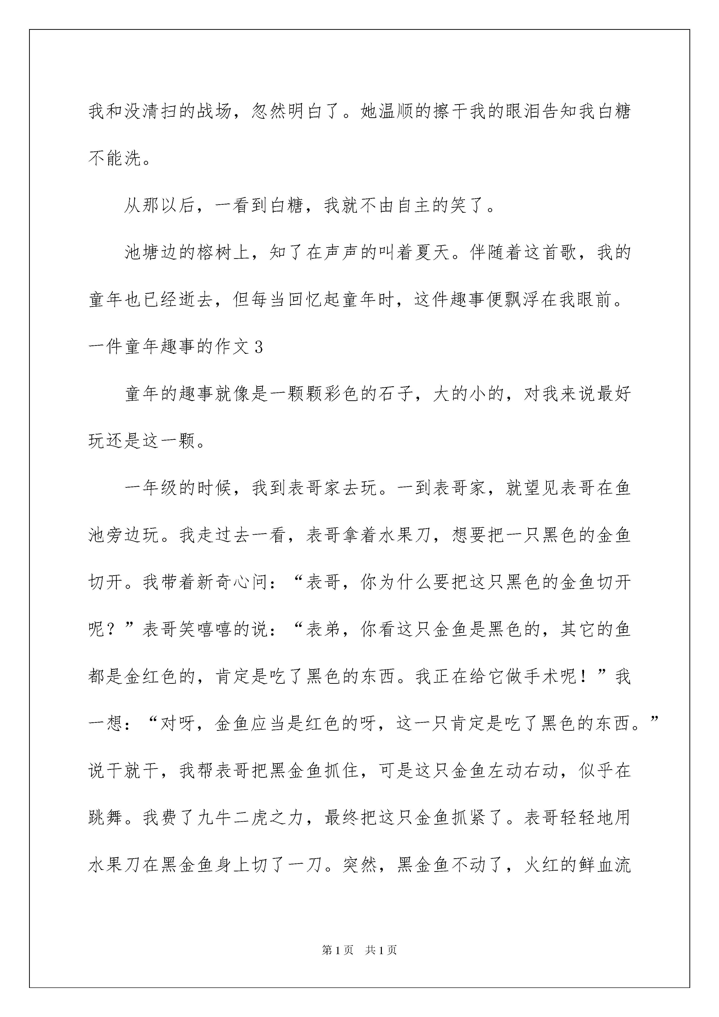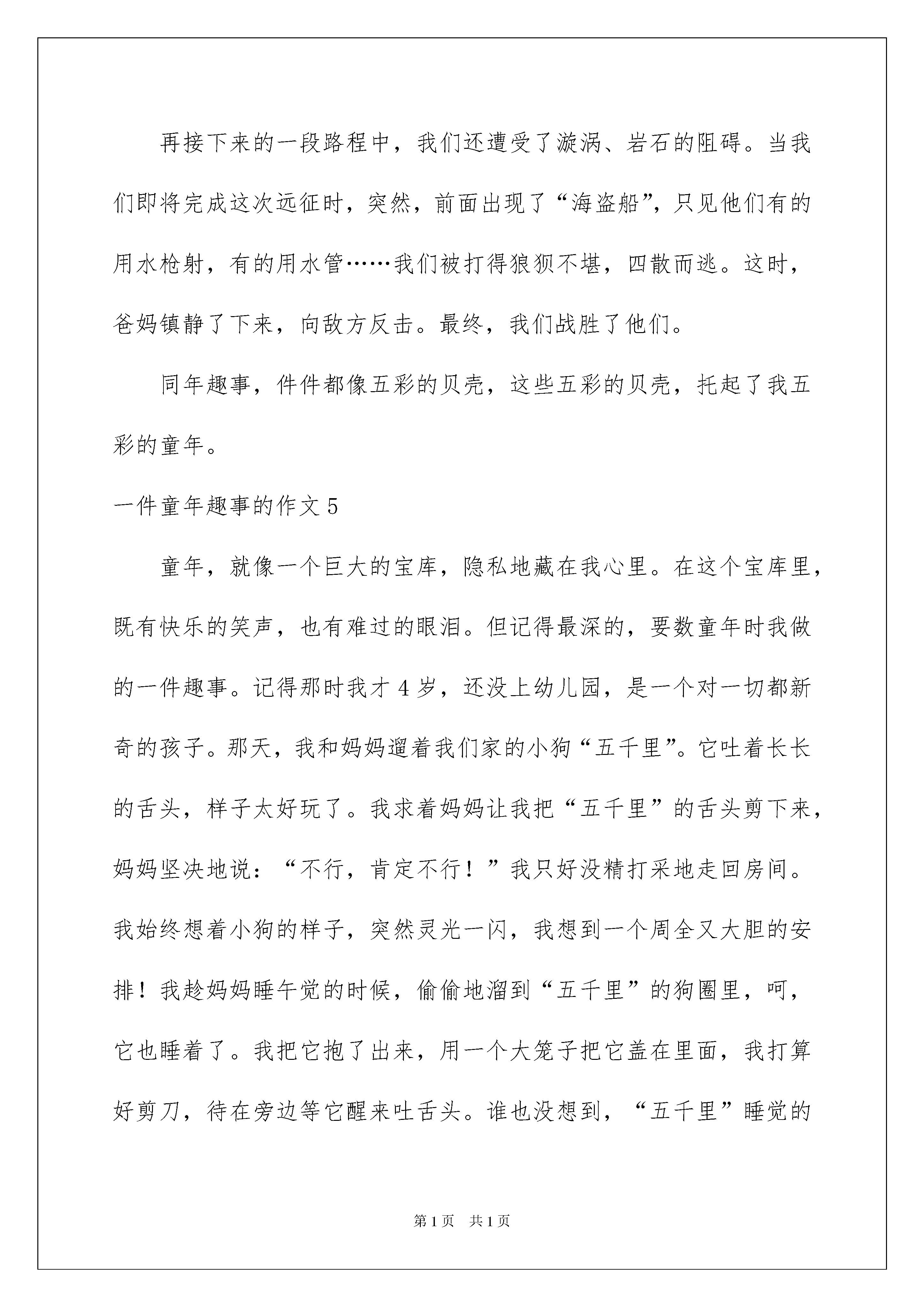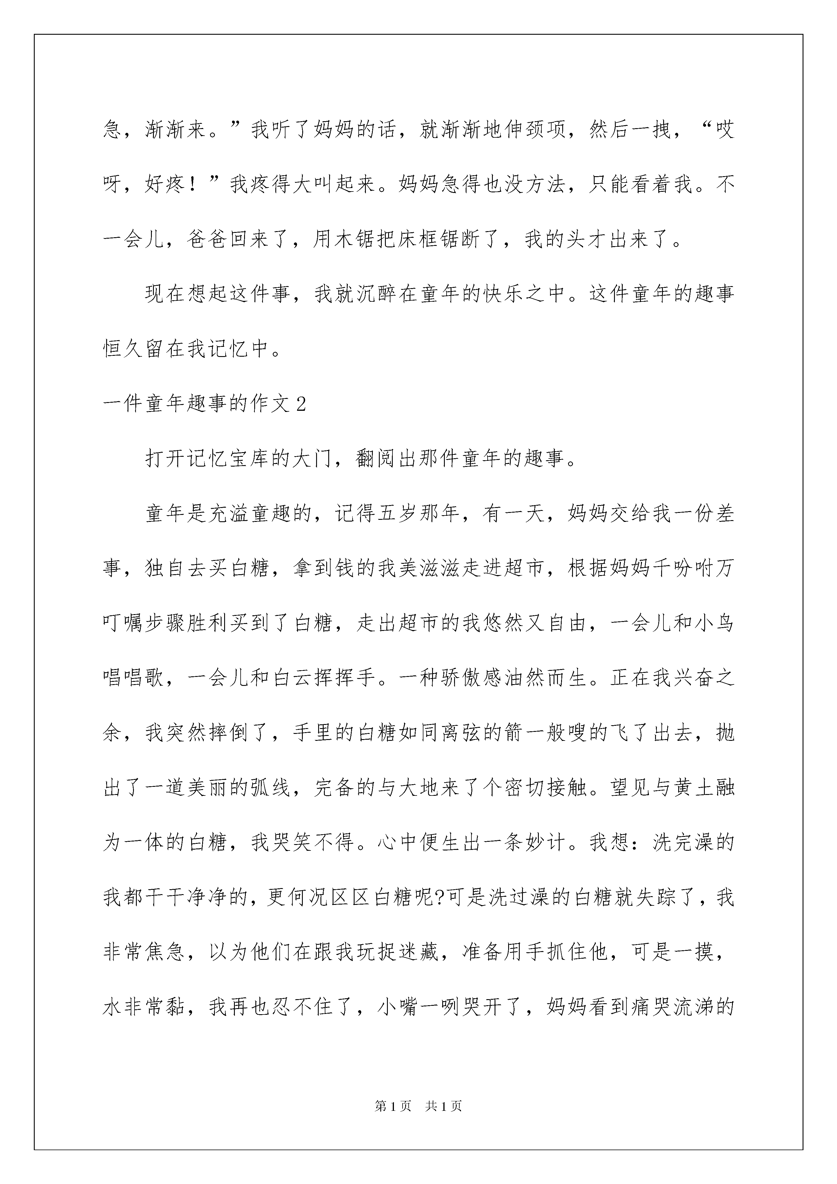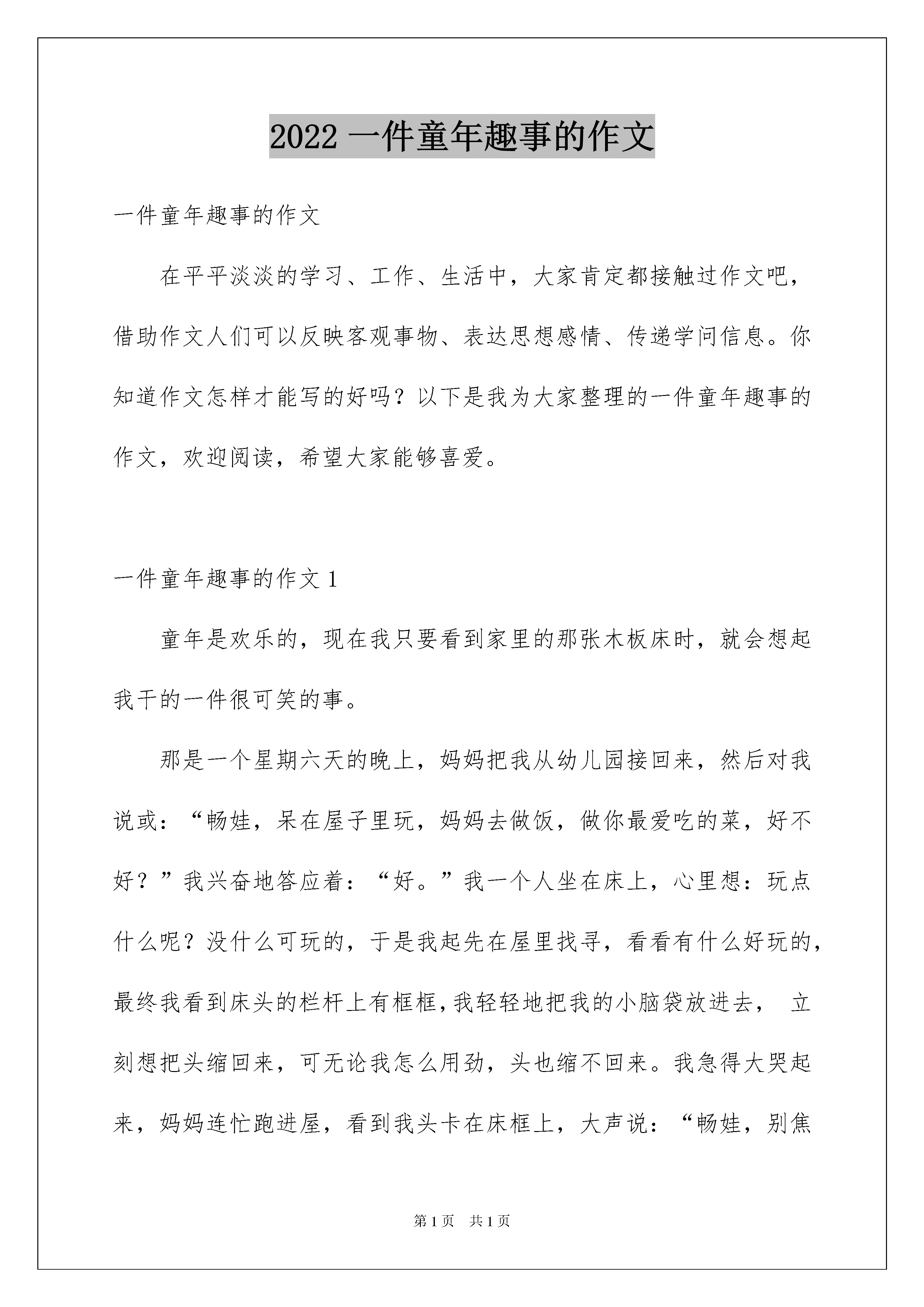 2022一件童年趣事的作文一件童年趣事的作文在平平淡淡的学习、工作、生活中,大家肯定都接触过作文吧,借助作文人们可以反映客观事物、表达思想感情、传递学问信息。你知道作文怎样才能写的好吗?以下是我为大家整理的一件童年趣事的作文,欢迎阅读,希望大家能够喜爱。一件童年趣事的作文1童年是欢乐的,现在我只要看到家里的那张木板床时,就会想起我干的一件很可笑的事。那是一个星期六天的晚上,妈妈把我从幼儿园接回来,然后对我说或:“畅娃,呆在屋子里玩,妈妈去做饭,做你最爱吃的菜,好不好?”我兴奋地答应着:“好。”我一个人坐在床上,心里想:玩点什么呢?没什么可玩的,于是我起先在屋里找寻,看看有什么好玩的,最终我看到床头的栏杆上有框框,我轻轻地把我的小脑袋放进去,立刻想把头缩回来,可无论我怎么用劲,头也缩不回来。我急得大哭起来,妈妈连忙跑进屋,看到我头卡在床框上,大声说:“畅娃,别焦急,渐渐来。”我听了妈妈的话,就渐渐地伸颈项,然后一拽,“哎呀,好疼!”我疼得大叫起来。妈妈急得也没方法,只能看着我。不一会儿,爸爸回来了,用木锯把床框锯断了,我的头才出来了。现在想起这件事,我就沉醉在童年的快乐之中。这件童年的趣事恒久留在我记忆中。一件童年趣事的作文2打开记忆宝库的大门,翻阅出那件童年的趣事。童年是充溢童趣的,记得五岁那年,有一天,妈妈交给我一份差事,独自去买白糖,拿到钱的我美滋滋走进超市,根据妈妈千吩咐万叮嘱步骤胜利买到了白糖,走出超市的我悠然又自由,一会儿和小鸟唱唱歌,一会儿和白云挥挥手。一种骄傲感油然而生。正在我兴奋之余,我突然摔倒了,手里的白糖如同离弦的箭一般嗖的飞了出去,抛出了一道美丽的弧线,完备的与大地来了个密切接触。望见与黄土融为一体的白糖,我哭笑不得。心中便生出一条妙计。我想:洗完澡的我都干干净净的,更何况区区白糖呢?可是洗过澡的白糖就失踪了,我非常焦急,以为他们在跟我玩捉迷藏,准备用手抓住他,可是一摸,水非常黏,我再也忍不住了,小嘴一咧哭开了,妈妈看到痛哭流涕的我和没清扫的战场,忽然明白了。她温顺的擦干我的眼泪告知我白糖不能洗。从那以后,一看到白糖,我就不由自主的笑了。池塘边的榕树上,知了在声声的叫着夏天。伴随着这首歌,我的童年也已经逝去,但每当回忆起童年时,这件趣事便飘浮在我眼前。一件童年趣事的作文3童年的趣事就像是一颗颗彩色的石子,大的小的,对我来说最好玩还是这一颗。一年级的时候,我到表哥家去玩。一到表哥家,就望见表哥在鱼池旁边玩。我走过去一看,表哥拿着水果刀,想要把一只黑色的金鱼切开。我带着新奇心问:“表哥,你为什么要把这只黑色的金鱼切开呢?”表哥笑嘻嘻的说:“表弟,你看这只金鱼是黑色的,其它的鱼都是金红色的,肯定是吃了黑色的东西。我正在给它做手术呢!”我一想:“对呀,金鱼应当是红色的呀,这一只肯定是吃了黑色的东西。”说干就干,我帮表哥把黑金鱼抓住,可是这只金鱼左动右动,似乎在跳舞。我费了九牛二虎之力,最终把这只金鱼抓紧了。表哥轻轻地用水果刀在黑金鱼身上切了一刀。突然,黑金鱼不动了,火红的鲜血流了出来。我感到惊奇,对表哥说:“不是说有黑色的东西吗?”这时妈妈走了进来,我把这件事告知了妈妈。妈妈微笑着说:“金鱼有金红色的也有黑色的。”我和表哥张口结舌。妈妈走后,我和表哥在山上挖了一个洞,把这只小金鱼埋了,我还织了一个漂亮的花环,然后我和表哥没精打采地走了。我这次知道了金鱼有的是金红色的也有黑色的。我再也不会损害小动物了。一件童年趣事的作文4童年像一场梦,一挤眼就过去,但是有许多梦都会在我们的脑海中一而再再而三的出现,恒久不会遗忘。例如那次漂流之旅。那天,天气晴朗。我和爸妈还有同学们一起去武夷山漂流。来到那里,我心情安逸,心想最终可以让我期盼已久的愿望实现了。我们上了船,穿上了救生衣,就“扬帆起航”了。一起先我们的皮艇还稳稳当当地行驶在“山间小溪”中。突然,我们的“侦察员”发觉前面有激流攻击。咱们立即坐稳努力不让“船舱”进水,可事情总不那么顺当。我们一惊一乍,左右摇摆。就连自己都快不行了,何况还要爱护船舱。果真我们的船舱进了一半水。再接下来的一段路程中,我们还遭受了漩涡、岩石的阻碍。当我们即将完成这次远征时,突然,前面出现了“海盗船”,只见他们有的用水枪射,有的用水管……我们被打得狼狈不堪,四散而逃。这时,爸妈镇静了下来,向敌方反击。最终,我们战胜了他们。同年趣事,件件都像五彩的贝壳,这些五彩的贝壳,托起了我五彩的童年。一件童年趣事的作文5童年,就像一个巨大的宝库,隐私地藏在我心里。在这个宝库里,既有快乐的笑声,也有难过的眼泪。但记得最深的,要数童年时我做的一件趣事。记得那时我才
