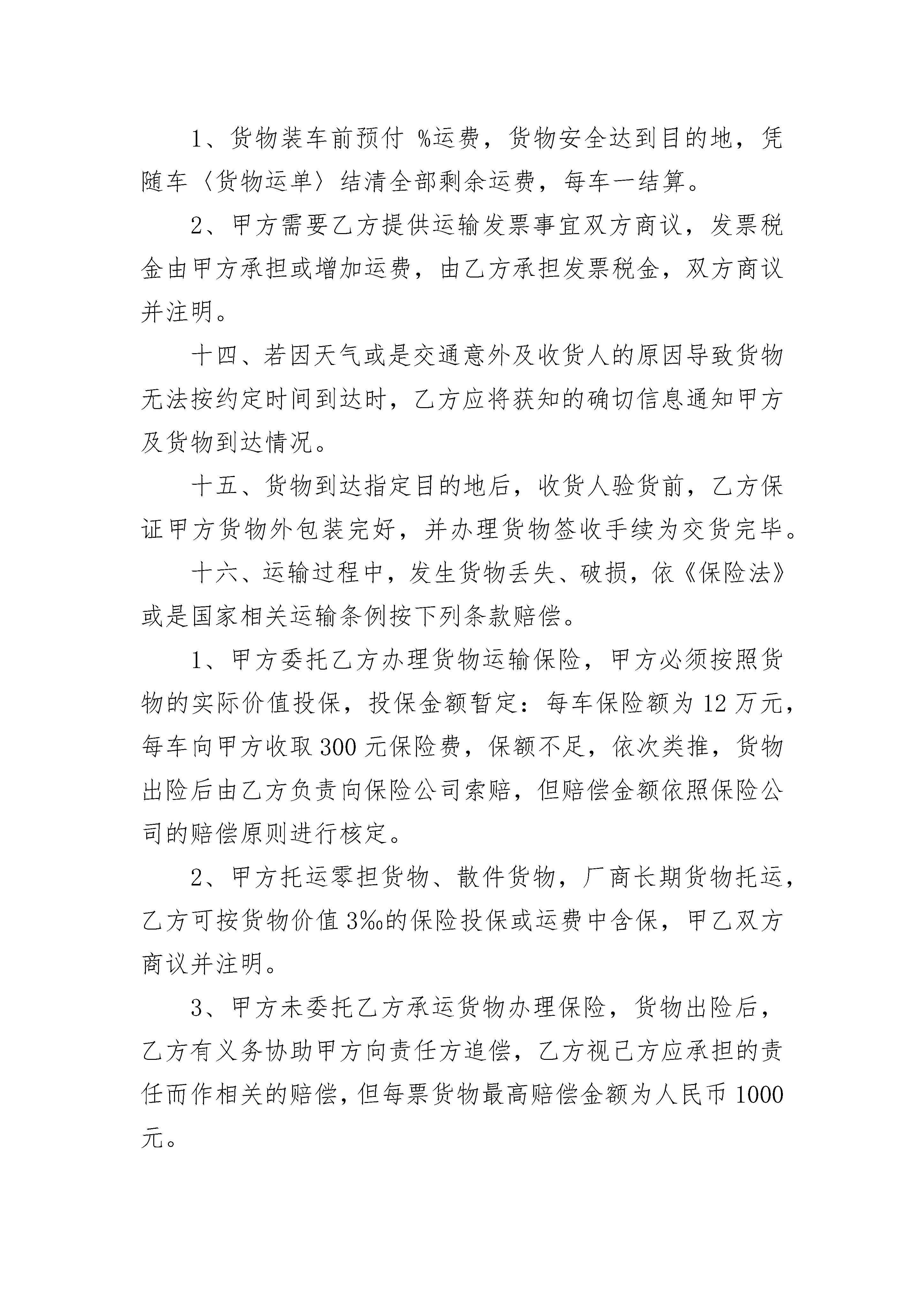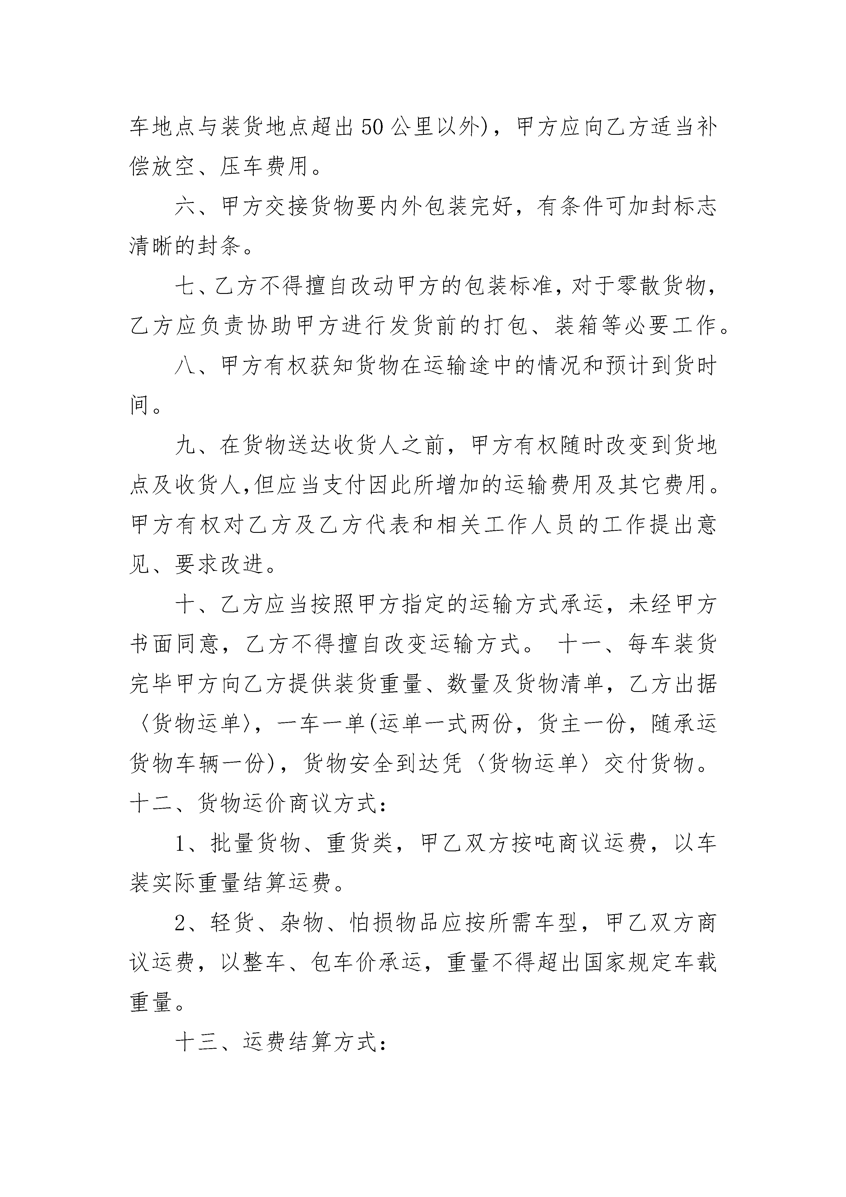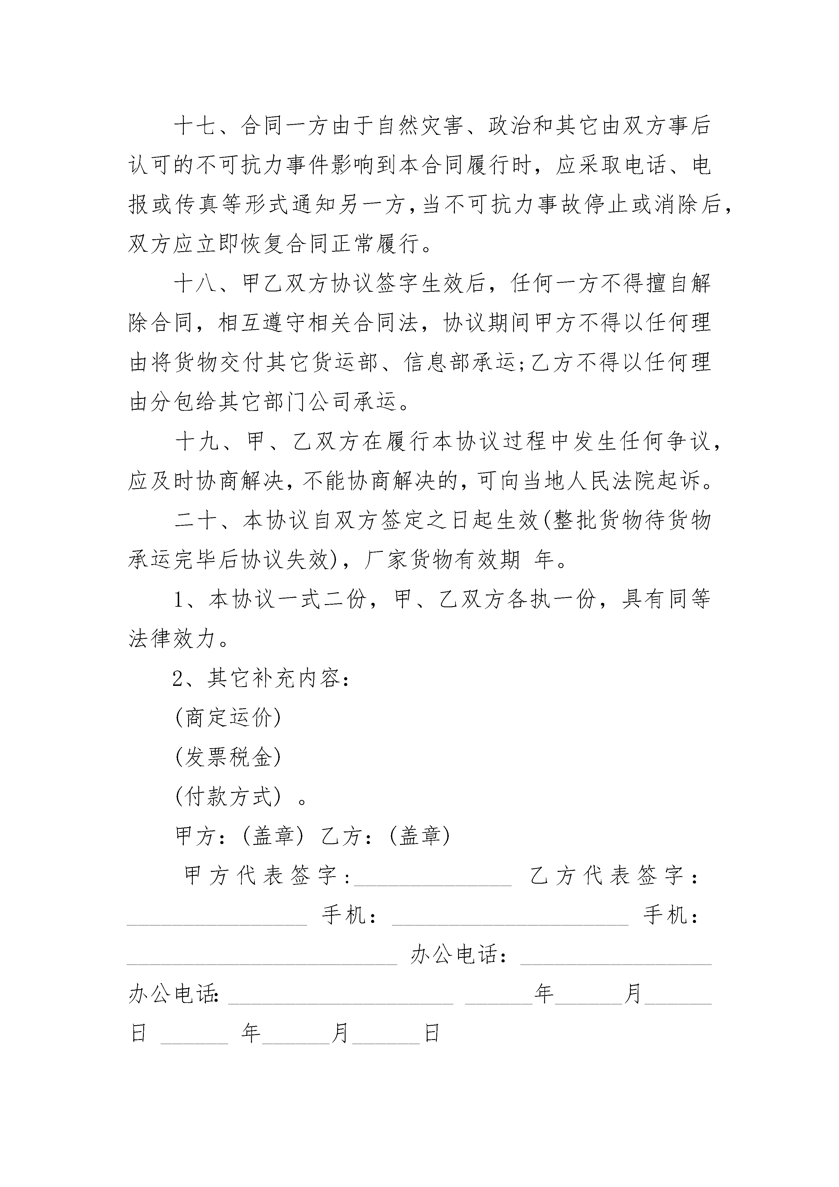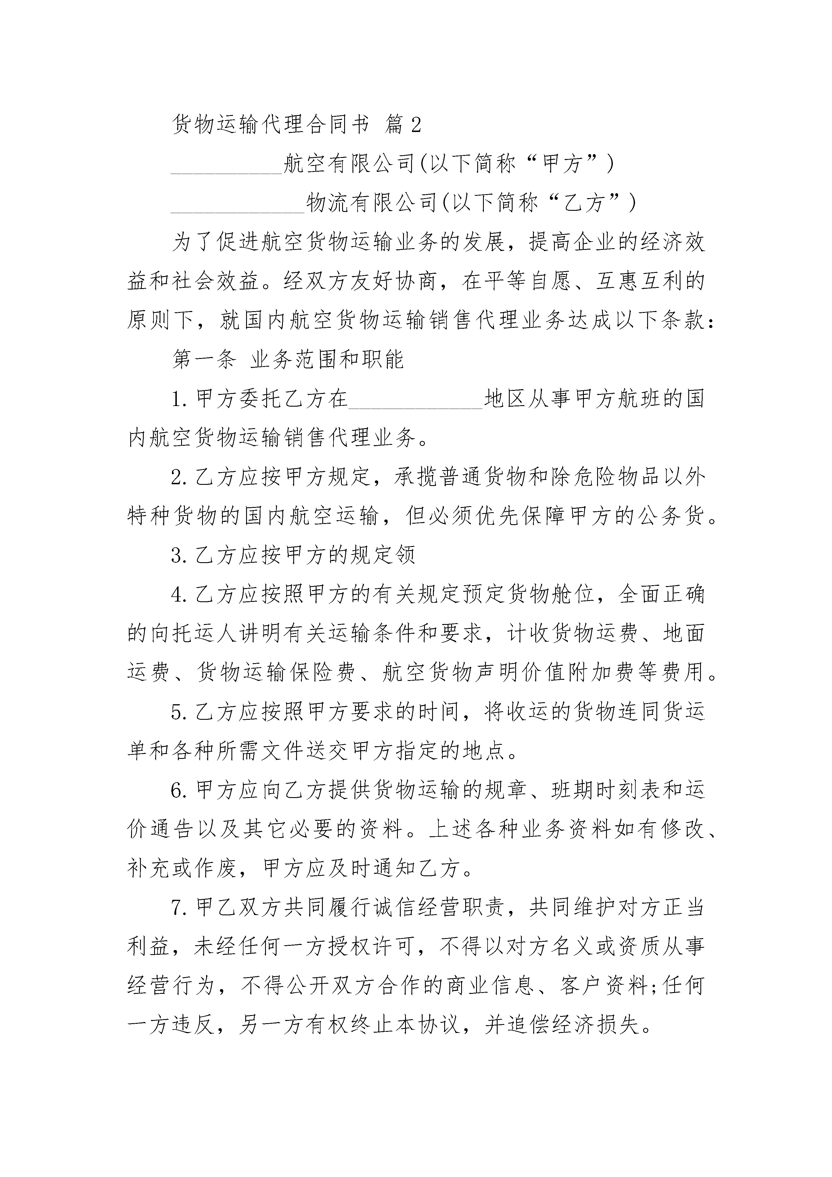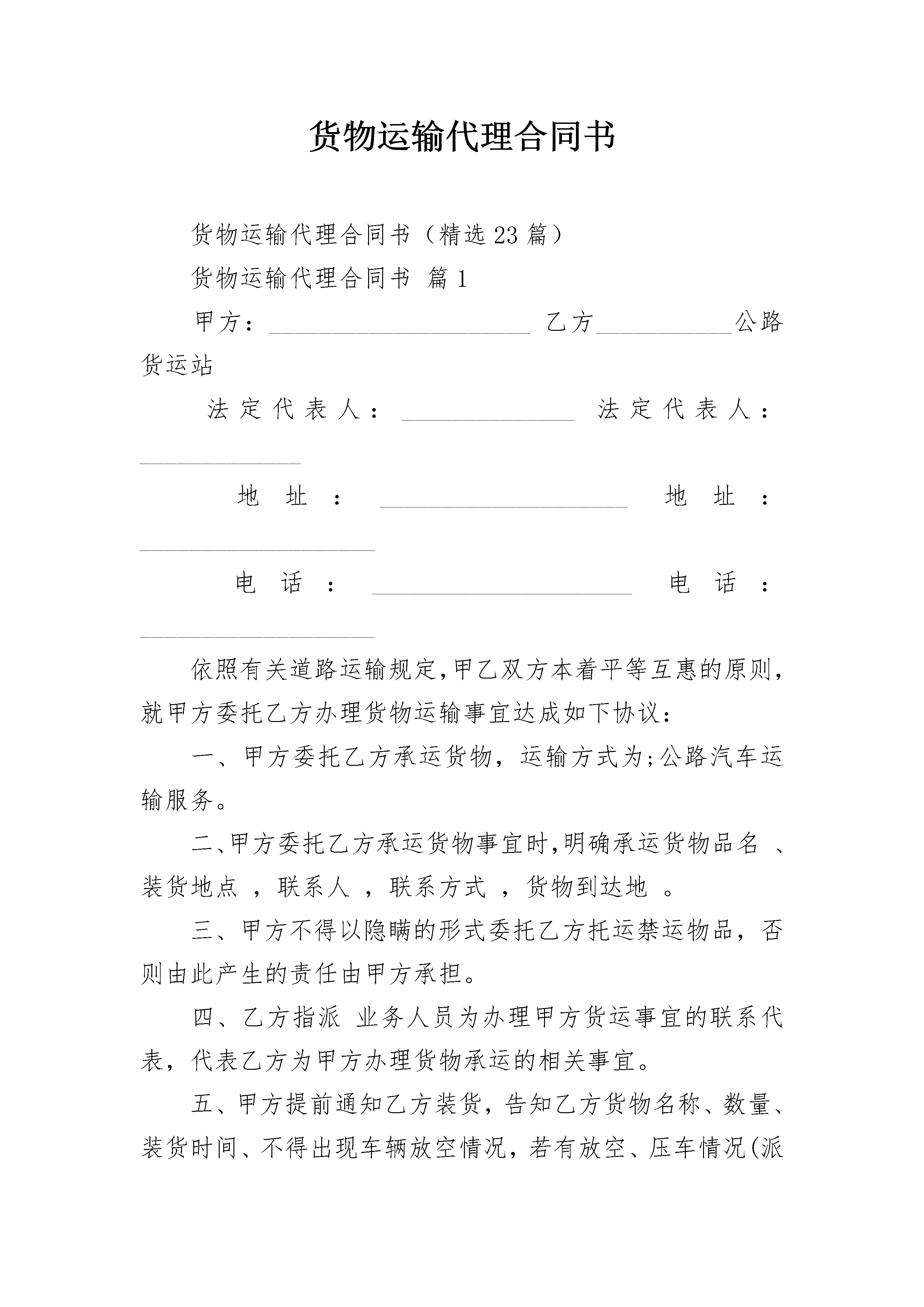 货物运输代理合同书货物运输代理合同书(精选23篇)货物运输代理合同书篇1甲方:_____________________乙方___________公路货运站法定代表人:______________法定代表人:_____________地址:____________________地址:___________________电话:_____________________电话:___________________依照有关道路运输规定,甲乙双方本着平等互惠的原则,就甲方委托乙方办理货物运输事宜达成如下协议:一、甲方委托乙方承运货物,运输方式为;公路汽车运输服务。二、甲方委托乙方承运货物事宜时,明确承运货物品名、装货地点,联系人,联系方式,货物到达地。三、甲方不得以隐瞒的形式委托乙方托运禁运物品,否则由此产生的责任由甲方承担。四、乙方指派业务人员为办理甲方货运事宜的联系代表,代表乙方为甲方办理货物承运的相关事宜。五、甲方提前通知乙方装货,告知乙方货物名称、数量、装货时间、不得出现车辆放空情况,若有放空、压车情况(派车地点与装货地点超出50公里以外),甲方应向乙方适当补偿放空、压车费用。六、甲方交接货物要内外包装完好,有条件可加封标志清晰的封条。七、乙方不得擅自改动甲方的包装标准,对于零散货物,乙方应负责协助甲方进行发货前的打包、装箱等必要工作。八、甲方有权获知货物在运输途中的情况和预计到货时间。九、在货物送达收货人之前,甲方有权随时改变到货地点及收货人,但应当支付因此所增加的运输费用及其它费用。甲方有权对乙方及乙方代表和相关工作人员的工作提出意见、要求改进。十、乙方应当按照甲方指定的运输方式承运,未经甲方书面同意,乙方不得擅自改变运输方式。十一、每车装货完毕甲方向乙方提供装货重量、数量及货物清单,乙方出据〈货物运单〉,一车一单(运单一式两份,货主一份,随承运货物车辆一份),货物安全到达凭〈货物运单〉交付货物。十二、货物运价商议方式:1、批量货物、重货类,甲乙双方按吨商议运费,以车装实际重量结算运费。2、轻货、杂物、怕损物品应按所需车型,甲乙双方商议运费,以整车、包车价承运,重量不得超出国家规定车载重量。十三、运费结算方式:1、货物装车前预付%运费,货物安全达到目的地,凭随车〈货物运单〉结清全部剩余运费,每车一结算。2、甲方需要乙方提供运输发票事宜双方商议,发票税金由甲方承担或增加运费,由乙方承担发票税金,双方商议并注明。十四、若因天气或是交通意外及收货人的原因导致货物无法按约定时间到达时,乙方应将获知的确切信息通知甲方及货物到达情况。十五、货物到达指定目的地后,收货人验货前,乙方保证甲方货物外包装完好,并办理货物签收手续为交货完毕。十六、运输过程中,发生货物丢失、破损,依《保险法》或是国家相关运输条例按下列条款赔偿。1、甲方委托乙方办理货物运输保险,甲方必须按照货物的实际价值投保,投保金额暂定:每车保险额为12万元,每车向甲方收取300元保险费,保额不足,依次类推,货物出险后由乙方负责向保险公司索赔,但赔偿金额依照保险公司的赔偿原则进行核定。2、甲方托运零担货物、散件货物,厂商长期货物托运,乙方可按货物价值3‰的保险投保或运费中含保,甲乙双方商议并注明。3、甲方未委托乙方承运货物办理保险,货物出险后,乙方有义务协助甲方向责任方追偿,乙方视己方应承担的责任而作相关的赔偿,但每票货物最高赔偿金额为人民币1000元。十七、合同一方由于自然灾害、政治和其它由双方事后认可的不可抗力事件影响到本合同履行时,应采取电话、电报或传真等形式通知另一方,当不可抗力事故停止或消除后,双方应立即恢复合同正常履行。十八、甲乙双方协议签字生效后,任何一方不得擅自解除合同,相互遵守相关合同法,协议期间甲方不得以任何理由将货物交付其它货运部、信息部承运;乙方不得以任何理由分包给其它部门公司承运。十九、甲、乙双方在履行本协议过程中发生任何争议,应及时协商解决,不能协商解决的,可向当地人民法院起诉。二十、本协议自双方签定之日起生效(整批货物待货物承运完毕后协议失效),厂家货物有效期年。1、本协议一式二份,甲、乙双方各执一份,具有同等法律效力。2、其它补充内容:(商定运价)(发票税金)(付款方式)。甲方:(盖章)乙方:(盖章)甲方代表签字:______________乙方代表签字:________________手机:_____________________手机:________________________办公电话:_________________办公电话:__________________________年______月______日______年______月______日货物运输代理合同书篇2__________航空有限公司(以下简称“甲方”)__
