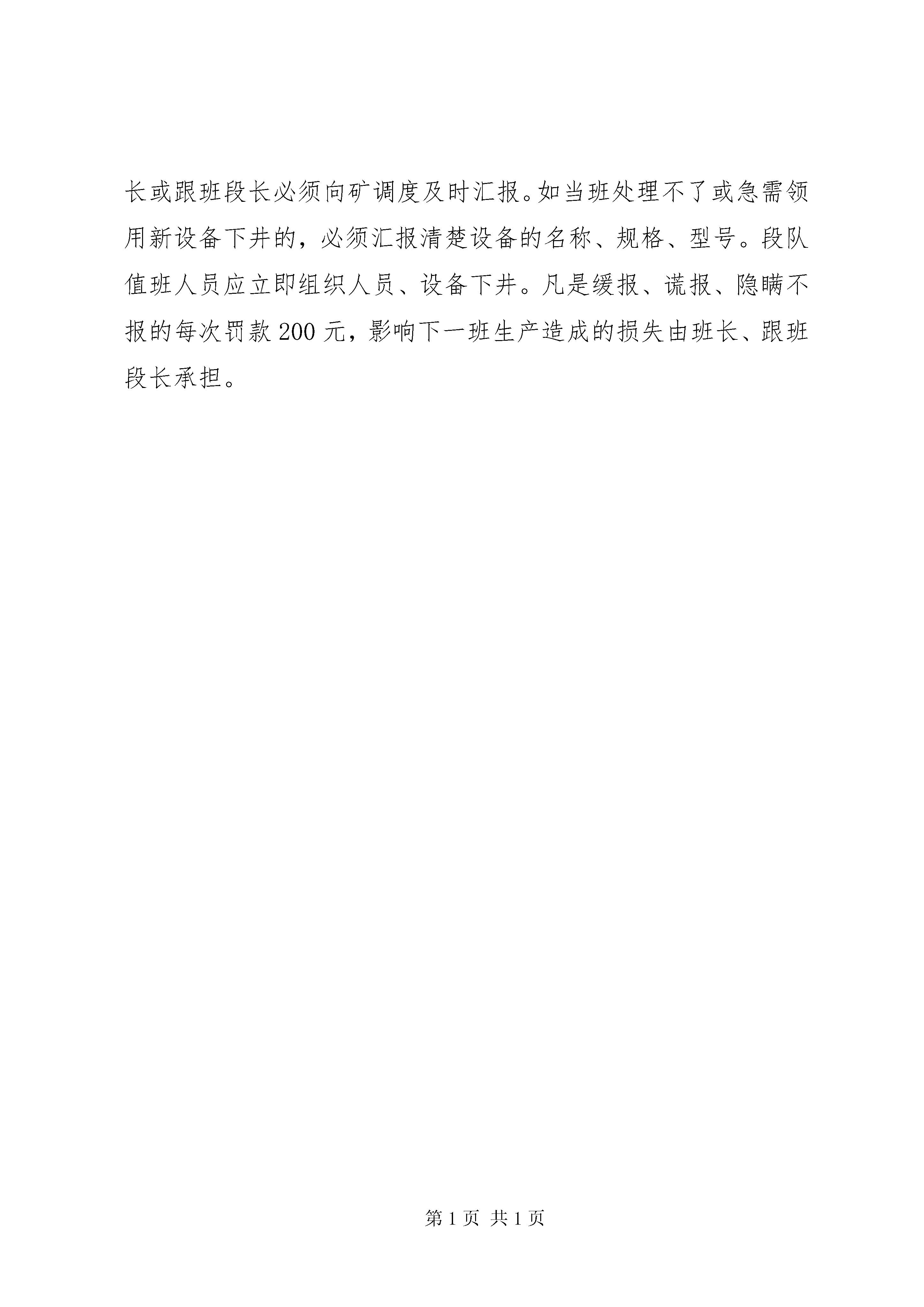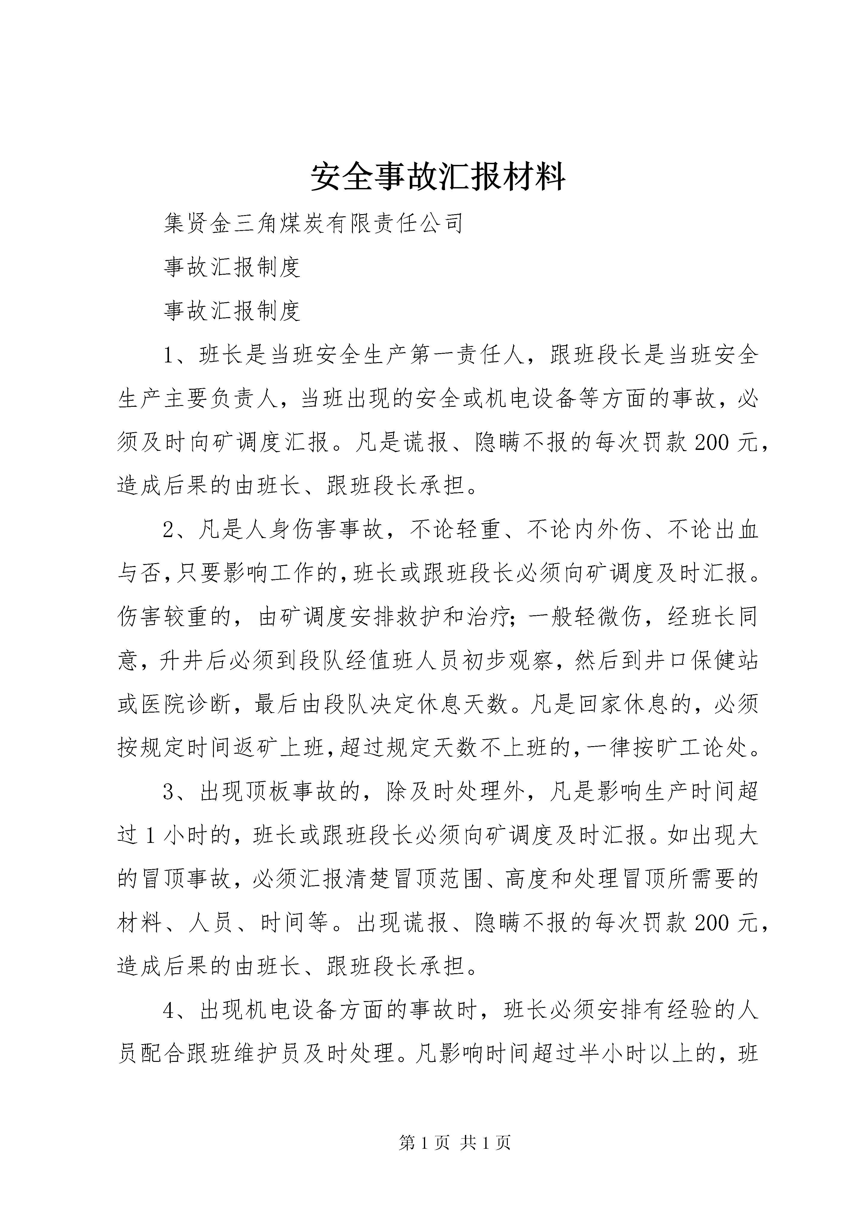 安全事故汇报材料集贤金三角煤炭有限责任公司事故汇报制度事故汇报制度1、班长是当班安全生产第一责任人,跟班段长是当班安全生产主要负责人,当班出现的安全或机电设备等方面的事故,必须及时向矿调度汇报。凡是谎报、隐瞒不报的每次罚款200元,造成后果的由班长、跟班段长承担。2、凡是人身伤害事故,不论轻重、不论内外伤、不论出血与否,只要影响工作的,班长或跟班段长必须向矿调度及时汇报。伤害较重的,由矿调度安排救护和治疗;一般轻微伤,经班长同意,升井后必须到段队经值班人员初步观察,然后到井口保健站或医院诊断,最后由段队决定休息天数。凡是回家休息的,必须按规定时间返矿上班,超过规定天数不上班的,一律按旷工论处。3、出现顶板事故的,除及时处理外,凡是影响生产时间超过1小时的,班长或跟班段长必须向矿调度及时汇报。如出现大的冒顶事故,必须汇报清楚冒顶范围、高度和处理冒顶所需要的材料、人员、时间等。出现谎报、隐瞒不报的每次罚款200元,造成后果的由班长、跟班段长承担。4、出现机电设备方面的事故时,班长必须安排有经验的人员配合跟班维护员及时处理。凡影响时间超过半小时以上的,班长或跟班段长必须向矿调度及时汇报。如当班处理不了或急需领用新设备下井的,必须汇报清楚设备的名称、规格、型号。段队值班人员应立即组织人员、设备下井。凡是缓报、谎报、隐瞒不报的每次罚款200元,影响下一班生产造成的损失由班长、跟班段长承担。