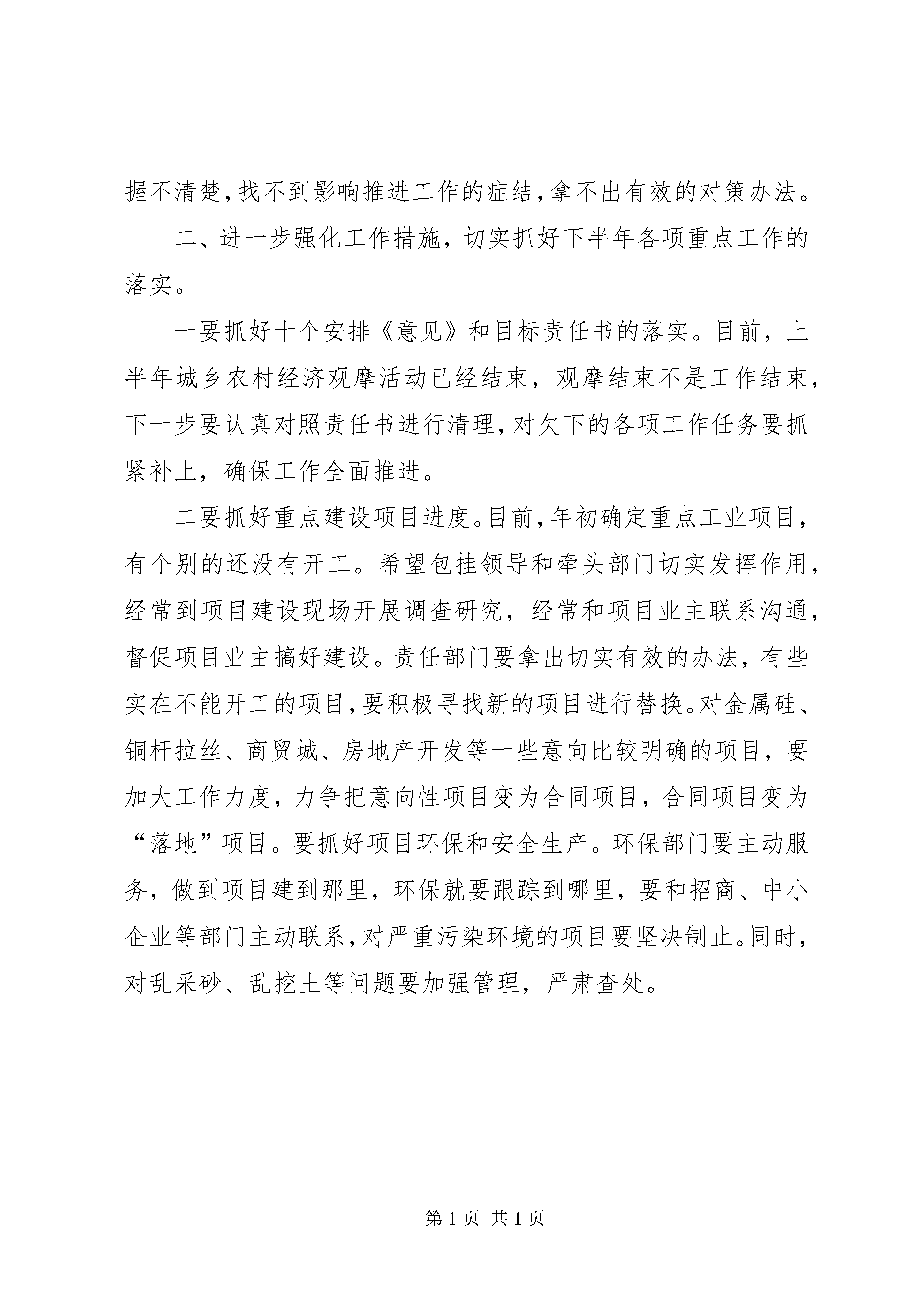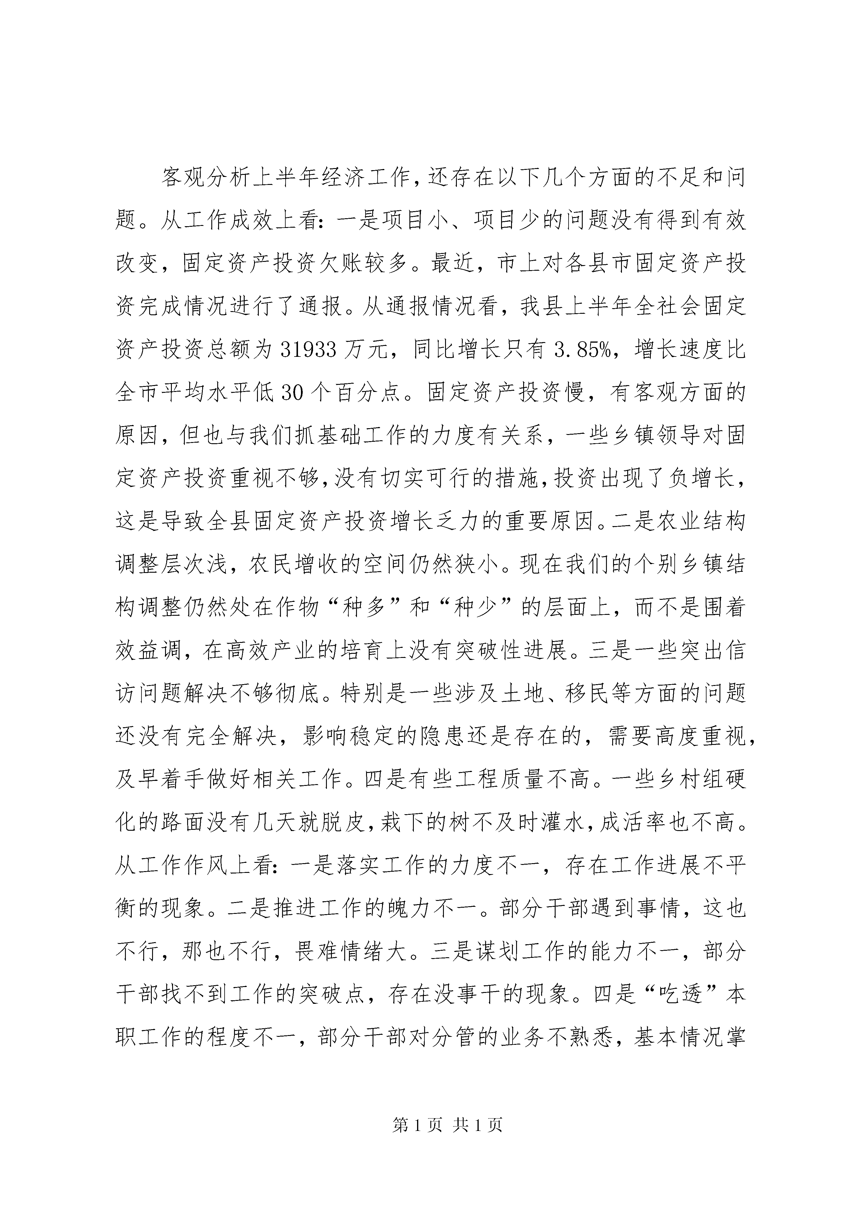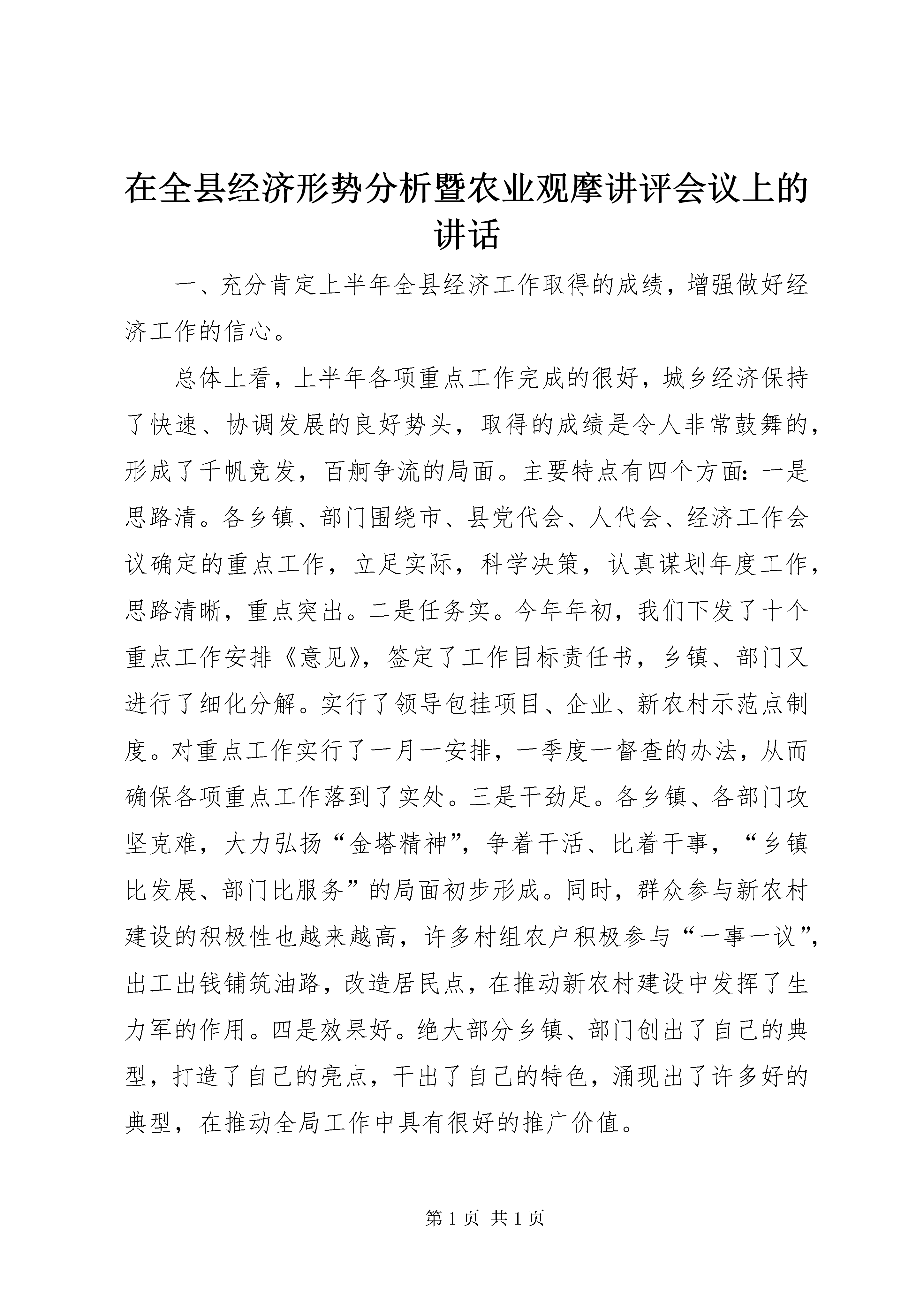 在全县经济形势分析暨农业观摩讲评会议上的讲话一、充分肯定上半年全县经济工作取得的成绩,增强做好经济工作的信心。总体上看,上半年各项重点工作完成的很好,城乡经济保持了快速、协调发展的良好势头,取得的成绩是令人非常鼓舞的,形成了千帆竞发,百舸争流的局面。主要特点有四个方面:一是思路清。各乡镇、部门围绕市、县党代会、人代会、经济工作会议确定的重点工作,立足实际,科学决策,认真谋划年度工作,思路清晰,重点突出。二是任务实。今年年初,我们下发了十个重点工作安排《意见》,签定了工作目标责任书,乡镇、部门又进行了细化分解。实行了领导包挂项目、企业、新农村示范点制度。对重点工作实行了一月一安排,一季度一督查的办法,从而确保各项重点工作落到了实处。三是干劲足。各乡镇、各部门攻坚克难,大力弘扬“金塔精神”,争着干活、比着干事,“乡镇比发展、部门比服务”的局面初步形成。同时,群众参与新农村建设的积极性也越来越高,许多村组农户积极参与“一事一议”,出工出钱铺筑油路,改造居民点,在推动新农村建设中发挥了生力军的作用。四是效果好。绝大部分乡镇、部门创出了自己的典型,打造了自己的亮点,干出了自己的特色,涌现出了许多好的典型,在推动全局工作中具有很好的推广价值。客观分析上半年经济工作,还存在以下几个方面的不足和问题。从工作成效上看:一是项目小、项目少的问题没有得到有效改变,固定资产投资欠账较多。最近,市上对各县市固定资产投资完成情况进行了通报。从通报情况看,我县上半年全社会固定资产投资总额为31933万元,同比增长只有3.85%,增长速度比全市平均水平低30个百分点。固定资产投资慢,有客观方面的原因,但也与我们抓基础工作的力度有关系,一些乡镇领导对固定资产投资重视不够,没有切实可行的措施,投资出现了负增长,这是导致全县固定资产投资增长乏力的重要原因。二是农业结构调整层次浅,农民增收的空间仍然狭小。现在我们的个别乡镇结构调整仍然处在作物“种多”和“种少”的层面上,而不是围着效益调,在高效产业的培育上没有突破性进展。三是一些突出信访问题解决不够彻底。特别是一些涉及土地、移民等方面的问题还没有完全解决,影响稳定的隐患还是存在的,需要高度重视,及早着手做好相关工作。四是有些工程质量不高。一些乡村组硬化的路面没有几天就脱皮,栽下的树不及时灌水,成活率也不高。从工作作风上看:一是落实工作的力度不一,存在工作进展不平衡的现象。二是推进工作的魄力不一。部分干部遇到事情,这也不行,那也不行,畏难情绪大。三是谋划工作的能力不一,部分干部找不到工作的突破点,存在没事干的现象。四是“吃透”本职工作的程度不一,部分干部对分管的业务不熟悉,基本情况掌握不清楚,找不到影响推进工作的症结,拿不出有效的对策办法。二、进一步强化工作措施,切实抓好下半年各项重点工作的落实。一要抓好十个安排《意见》和目标责任书的落实。目前,上半年城乡农村经济观摩活动已经结束,观摩结束不是工作结束,下一步要认真对照责任书进行清理,对欠下的各项工作任务要抓紧补上,确保工作全面推进。二要抓好重点建设项目进度。目前,年初确定重点工业项目,有个别的还没有开工。希望包挂领导和牵头部门切实发挥作用,经常到项目建设现场开展调查研究,经常和项目业主联系沟通,督促项目业主搞好建设。责任部门要拿出切实有效的办法,有些实在不能开工的项目,要积极寻找新的项目进行替换。对金属硅、铜杆拉丝、商贸城、房地产开发等一些意向比较明确的项目,要加大工作力度,力争把意向性项目变为合同项目,合同项目变为“落地”项目。要抓好项目环保和安全生产。环保部门要主动服务,做到项目建到那里,环保就要跟踪到哪里,要和招商、中小企业等部门主动联系,对严重污染环境的项目要坚决制止。同时,对乱采砂、乱挖土等问题要加强管理,严肃查处。