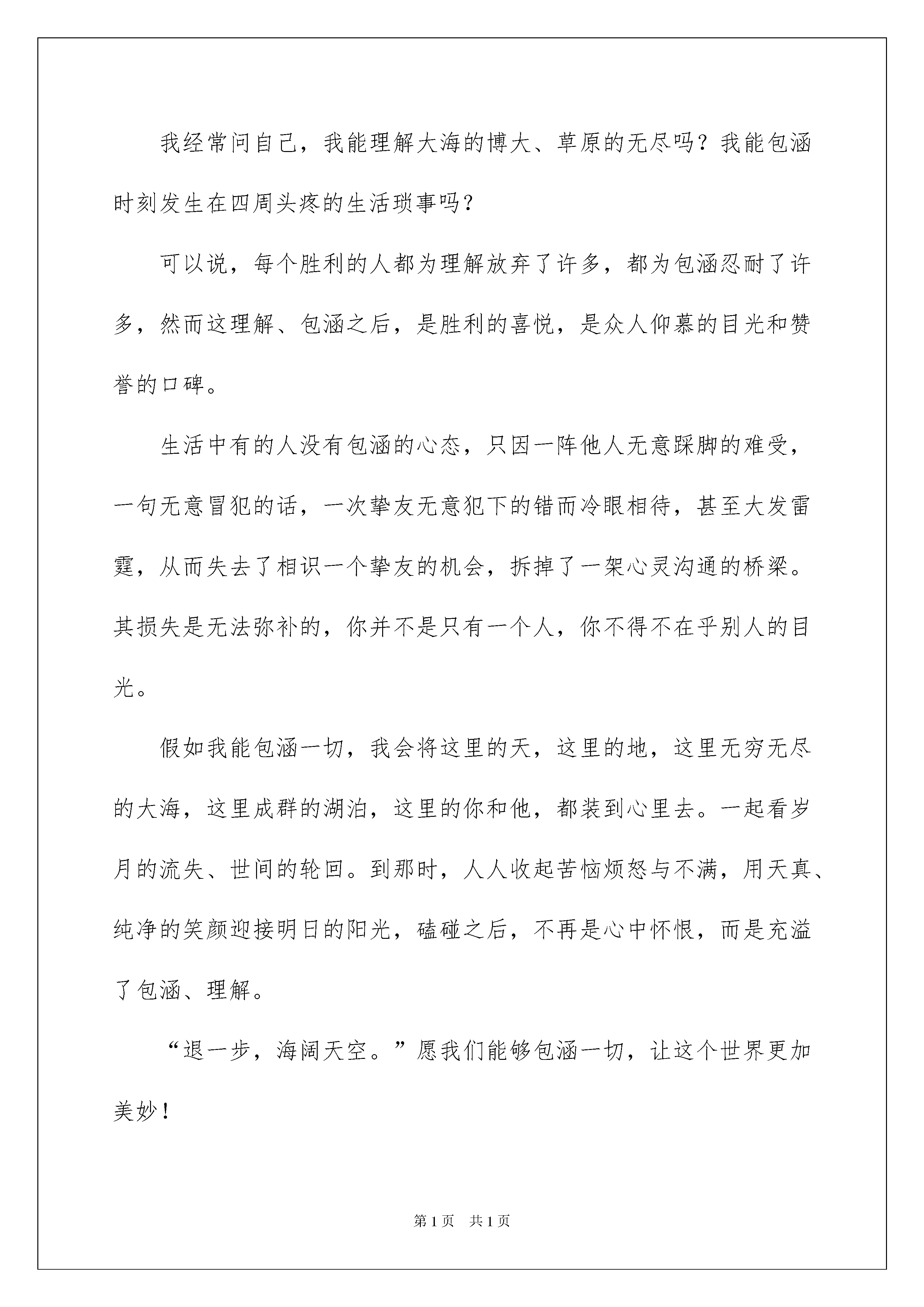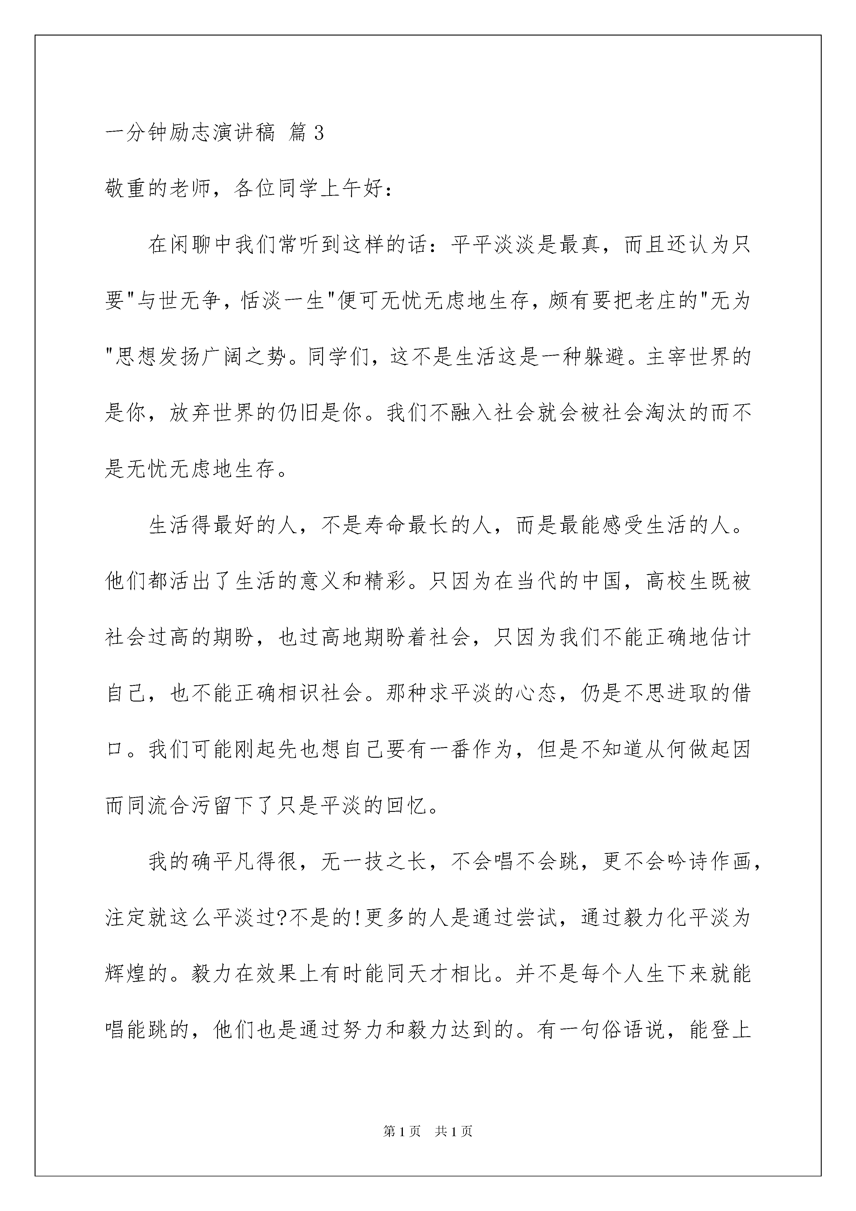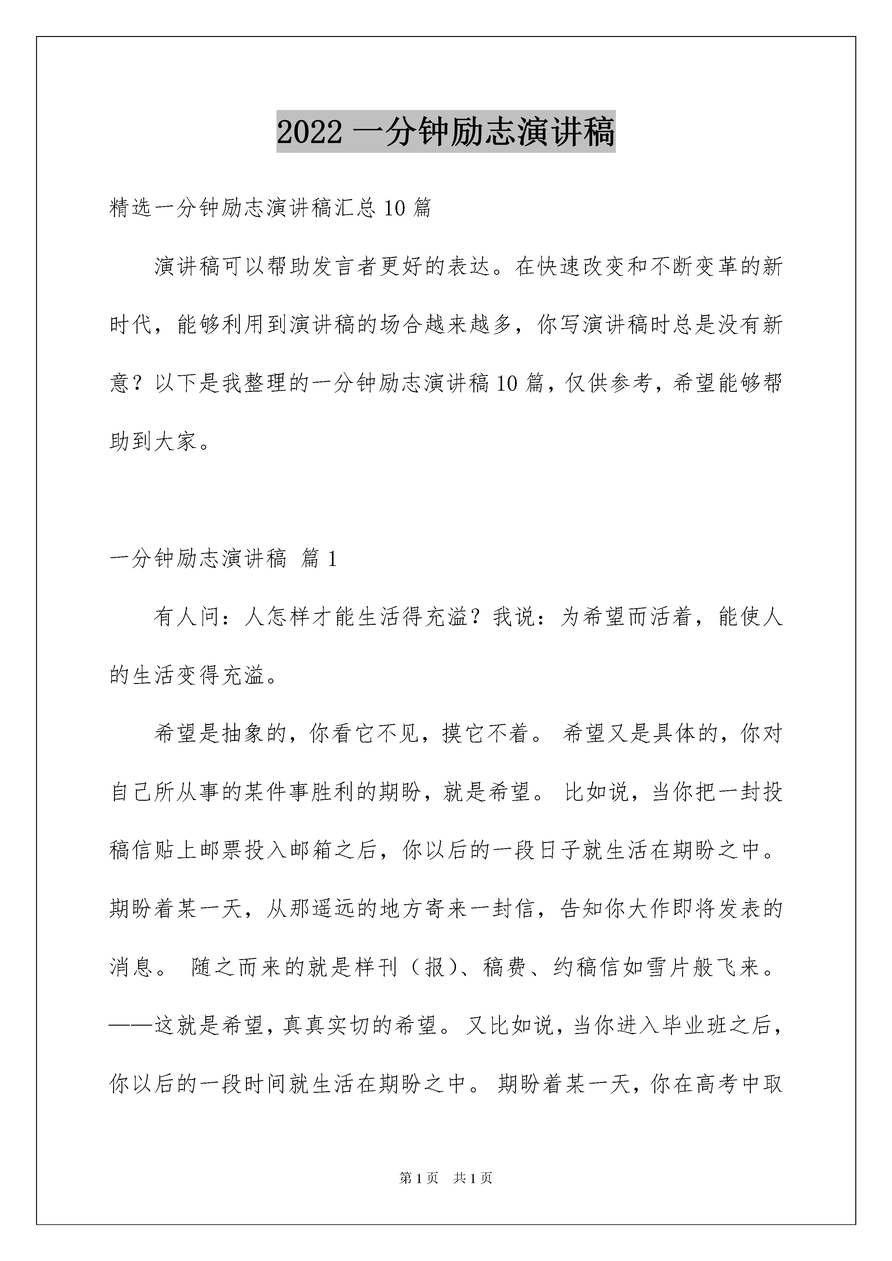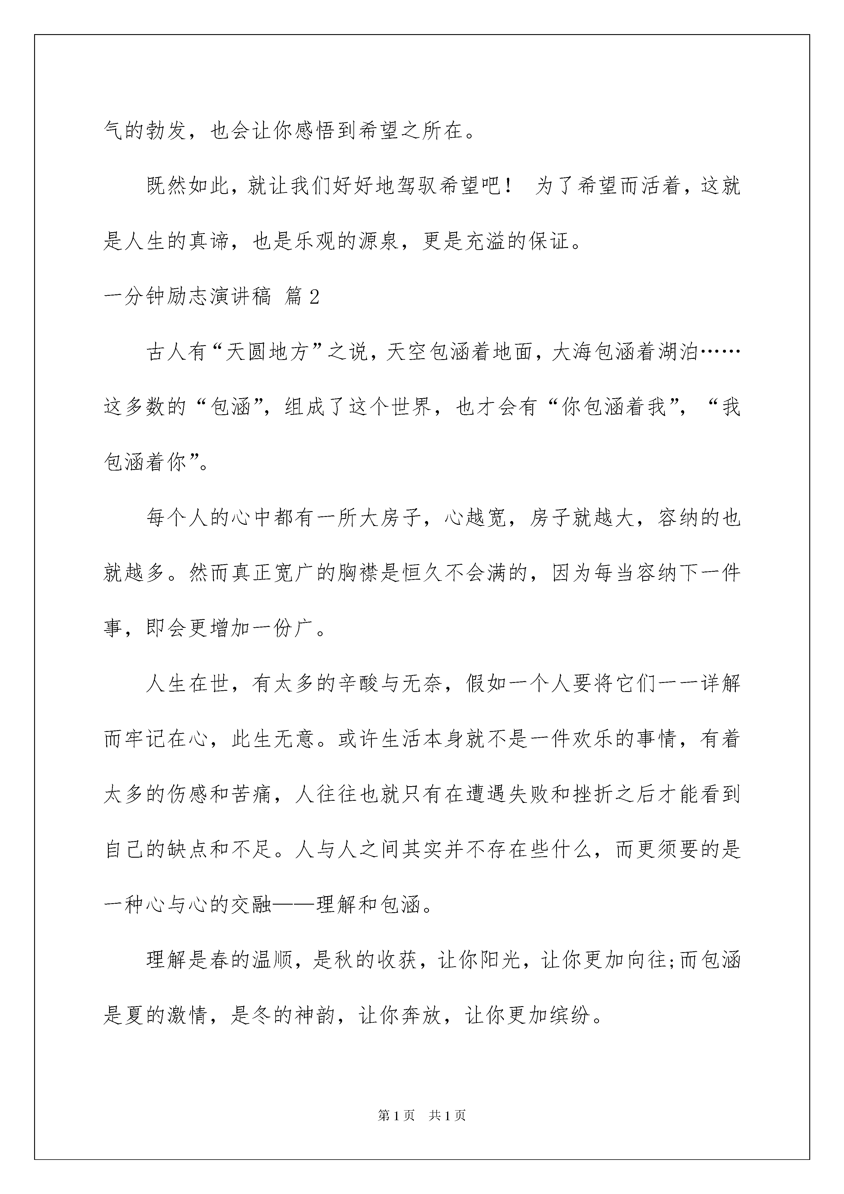 2022一分钟励志演讲稿精选一分钟励志演讲稿汇总10篇演讲稿可以帮助发言者更好的表达。在快速改变和不断变革的新时代,能够利用到演讲稿的场合越来越多,你写演讲稿时总是没有新意?以下是我整理的一分钟励志演讲稿10篇,仅供参考,希望能够帮助到大家。一分钟励志演讲稿篇1有人问:人怎样才能生活得充溢?我说:为希望而活着,能使人的生活变得充溢。希望是抽象的,你看它不见,摸它不着。希望又是具体的,你对自己所从事的某件事胜利的期盼,就是希望。比如说,当你把一封投稿信贴上邮票投入邮箱之后,你以后的一段日子就生活在期盼之中。期盼着某一天,从那遥远的地方寄来一封信,告知你大作即将发表的消息。随之而来的就是样刊(报)、稿费、约稿信如雪片般飞来。——这就是希望,真真实切的希望。又比如说,当你进入毕业班之后,你以后的一段时间就生活在期盼之中。期盼着某一天,你在高考中取得了好成果,怀揣着重点高校的录用通知书迈进高校的校门。——这就是希望,实实在在的希望。假如你始终生活在这样的希望当中,你的精神生活肯定是充溢的。假如你始终生活在这样的希望当中,你的人生看法肯定是主动的。假如你始终生活在这样的希望当中,你的事业前程肯定是美妙的。假如投稿后得到的只是石沉大海,或一纸退稿信;假如你在高考中失利;假如灾难在你落拓的时候雪上加霜,你又该如何对待呢?我说,千万不要丢失希望。因为这个希望落空了,你还可以去找寻另一个希望。只要你心中的希望之火不灭,总有一天你会品尝到希望的甜果。假如一个人没有了希望,又会怎么样呢?他会像一只无头的苍蝇,到处碰壁。他会像一匹被蒙住眼睛的马,只能围着磨台瞎转悠。他会像狂风中的一朵鲜花,尚未完全开放便香消玉殒。祥林嫂死前逢人便说“我真傻”,那是因为她的生活中没有了希望。夏四奶奶听到坟场的乌鸦的叫声而胆战心惊,也是因为她的生活中没有了希望。焦仲卿和刘兰芝一个“自挂东南枝”,一个“举身赴清池”,更是因为他们的生活中没有了希望。希望其实是无处不在的。有时,人家的一个眼神、一句话语、一个动作,也会让你看到希望之所在。有时,大自然中一个新生命的诞生,一朵鲜花的开放,一种生气的勃发,也会让你感悟到希望之所在。既然如此,就让我们好好地驾驭希望吧!为了希望而活着,这就是人生的真谛,也是乐观的源泉,更是充溢的保证。一分钟励志演讲稿篇2古人有“天圆地方”之说,天空包涵着地面,大海包涵着湖泊……这多数的“包涵”,组成了这个世界,也才会有“你包涵着我”,“我包涵着你”。每个人的心中都有一所大房子,心越宽,房子就越大,容纳的也就越多。然而真正宽广的胸襟是恒久不会满的,因为每当容纳下一件事,即会更增加一份广。人生在世,有太多的辛酸与无奈,假如一个人要将它们一一详解而牢记在心,此生无意。或许生活本身就不是一件欢乐的事情,有着太多的伤感和苦痛,人往往也就只有在遭遇失败和挫折之后才能看到自己的缺点和不足。人与人之间其实并不存在些什么,而更须要的是一种心与心的交融——理解和包涵。理解是春的温顺,是秋的收获,让你阳光,让你更加向往;而包涵是夏的激情,是冬的神韵,让你奔放,让你更加缤纷。我经常问自己,我能理解大海的博大、草原的无尽吗?我能包涵时刻发生在四周头疼的生活琐事吗?可以说,每个胜利的人都为理解放弃了许多,都为包涵忍耐了许多,然而这理解、包涵之后,是胜利的喜悦,是众人仰慕的目光和赞誉的口碑。生活中有的人没有包涵的心态,只因一阵他人无意踩脚的难受,一句无意冒犯的话,一次挚友无意犯下的错而冷眼相待,甚至大发雷霆,从而失去了相识一个挚友的机会,拆掉了一架心灵沟通的桥梁。其损失是无法弥补的,你并不是只有一个人,你不得不在乎别人的目光。假如我能包涵一切,我会将这里的天,这里的地,这里无穷无尽的大海,这里成群的湖泊,这里的你和他,都装到心里去。一起看岁月的流失、世间的轮回。到那时,人人收起苦恼烦怒与不满,用天真、纯净的笑颜迎接明日的阳光,磕碰之后,不再是心中怀恨,而是充溢了包涵、理解。“退一步,海阔天空。”愿我们能够包涵一切,让这个世界更加美妙!一分钟励志演讲稿篇3敬重的老师,各位同学上午好:在闲聊中我们常听到这样的话:平平淡淡是最真,而且还认为只要"与世无争,恬淡一生"便可无忧无虑地生存,颇有要把老庄的"无为"思想发扬广阔之势。同学们,这不是生活这是一种躲避。主宰世界的是你,放弃世界的仍旧是你。我们不融入社会就会被社会淘汰的而不是无忧无虑地生存。生活得最好的人,不是寿命最长的人,而是最能感受生活的人。他们都活出了生活的意义和精彩。只因为在当代的中国,高校生既被社会过高的期盼,也过高地期盼着社会,只因为我们不能正确地估计自己,也不能正确相