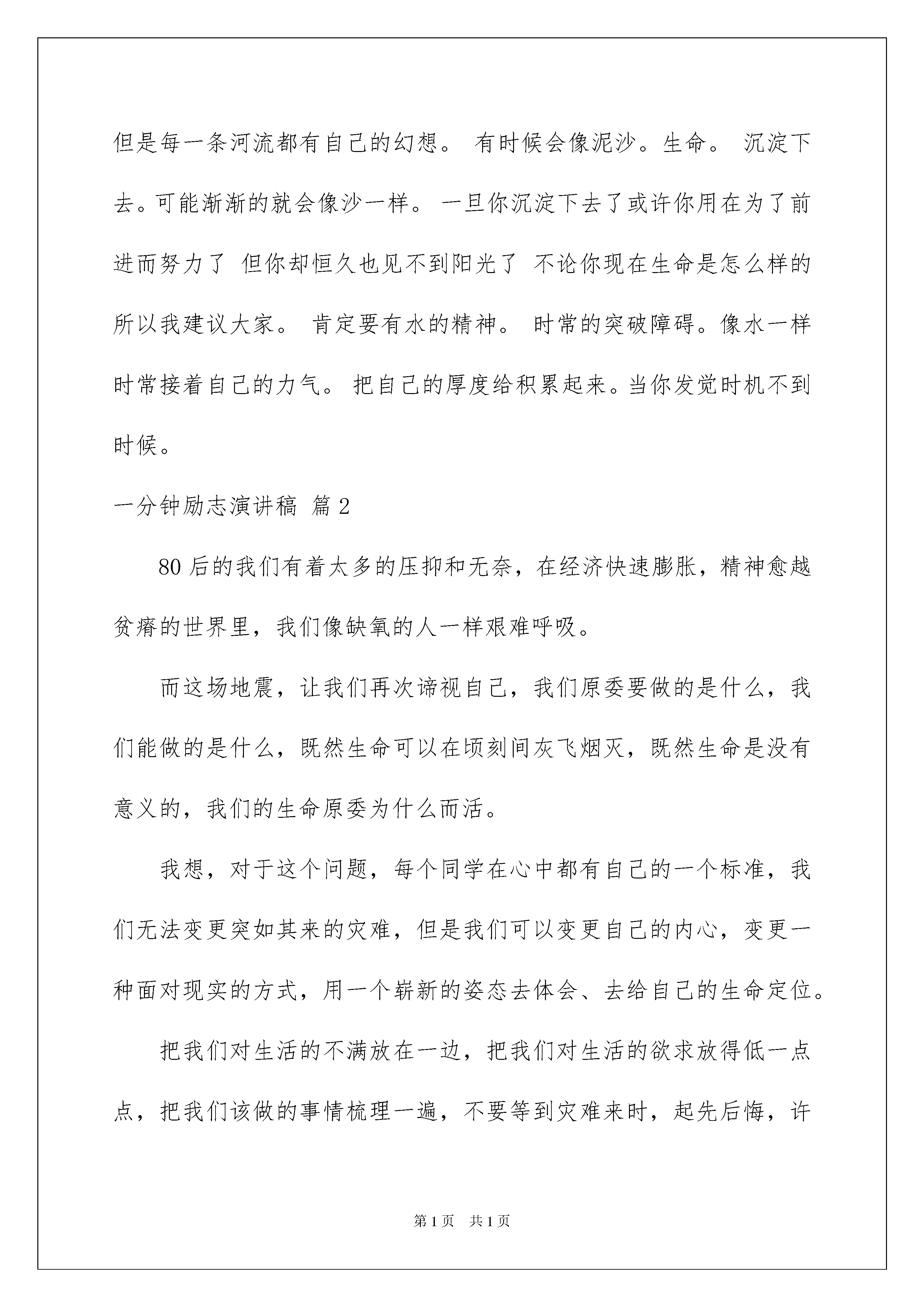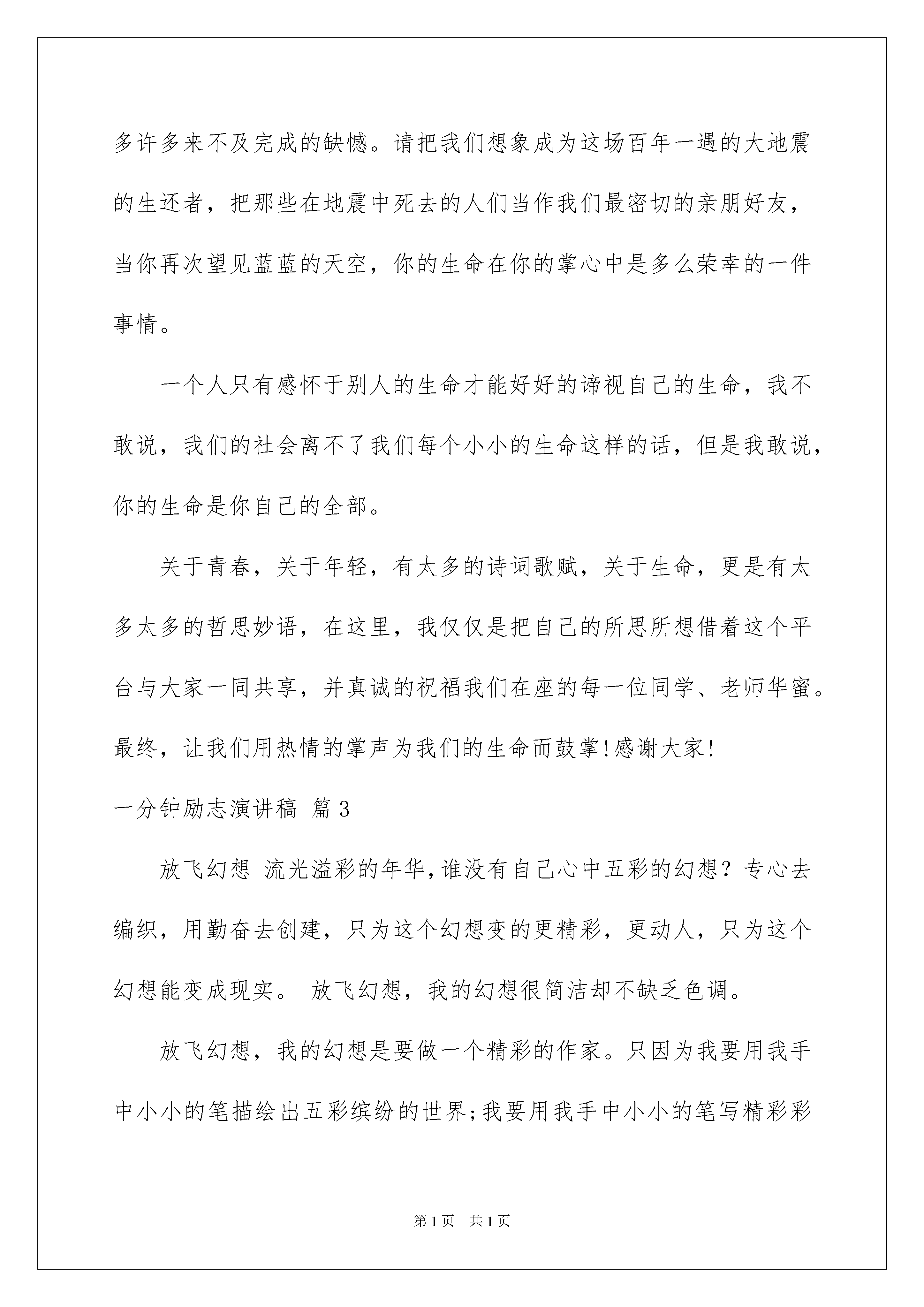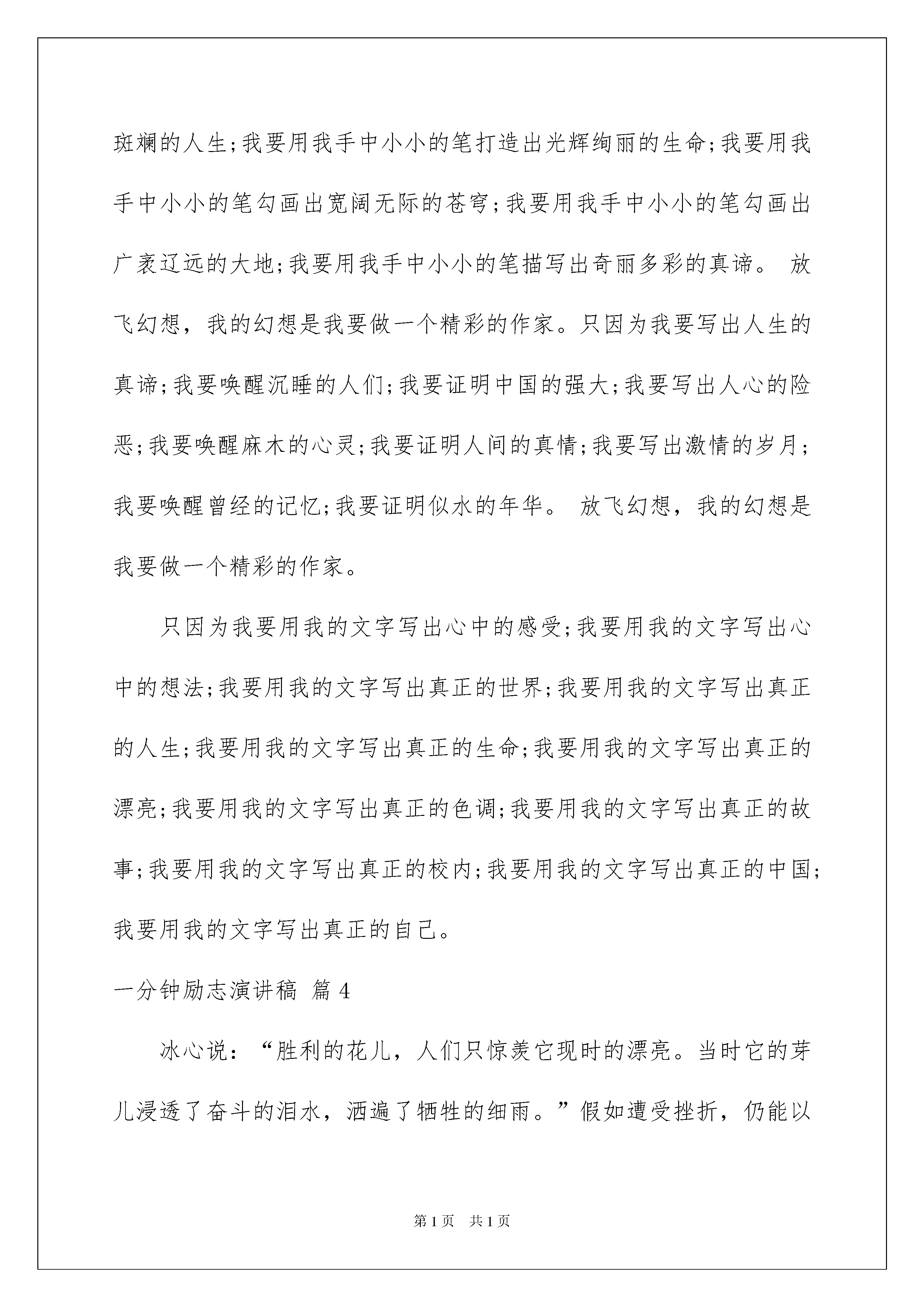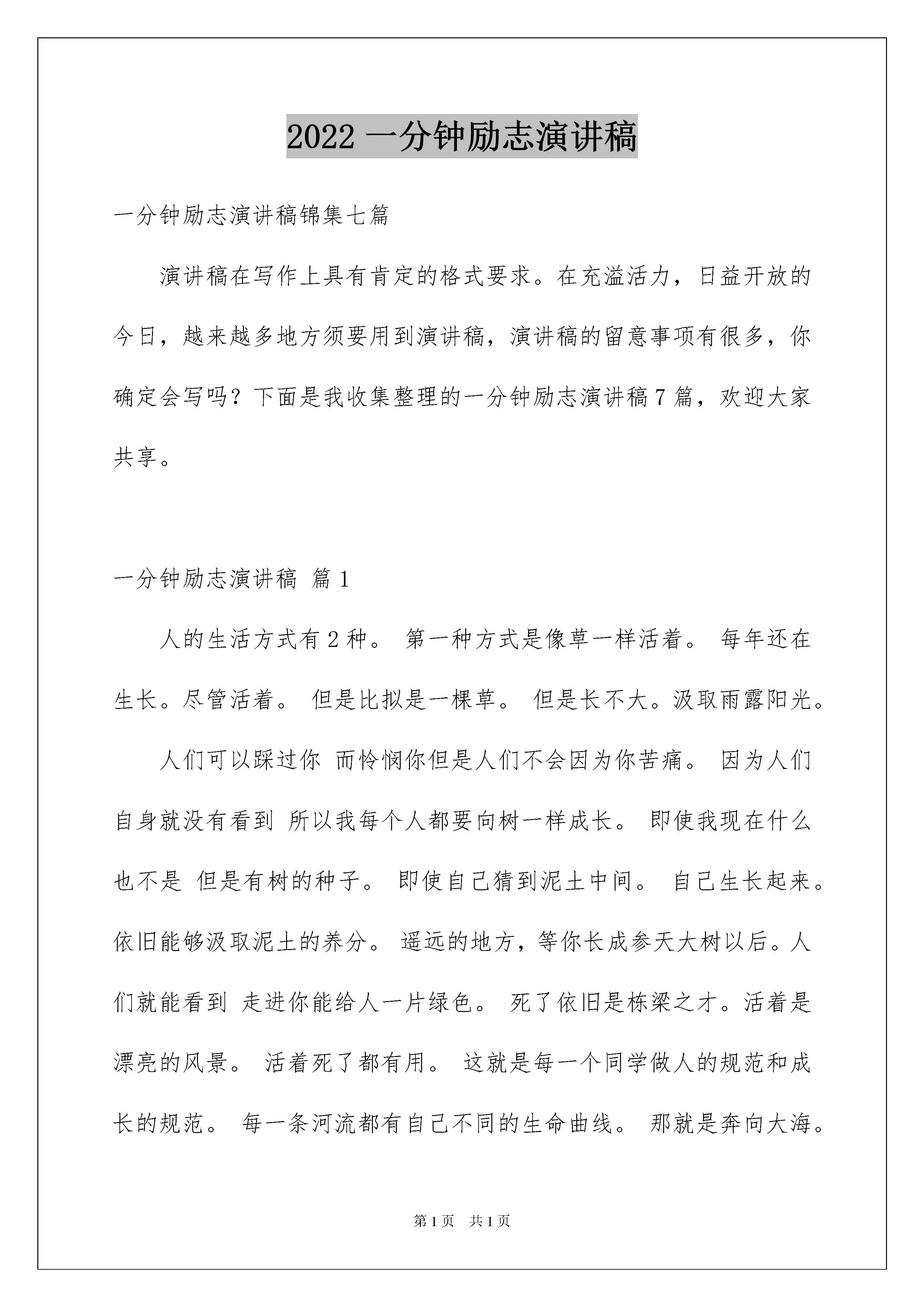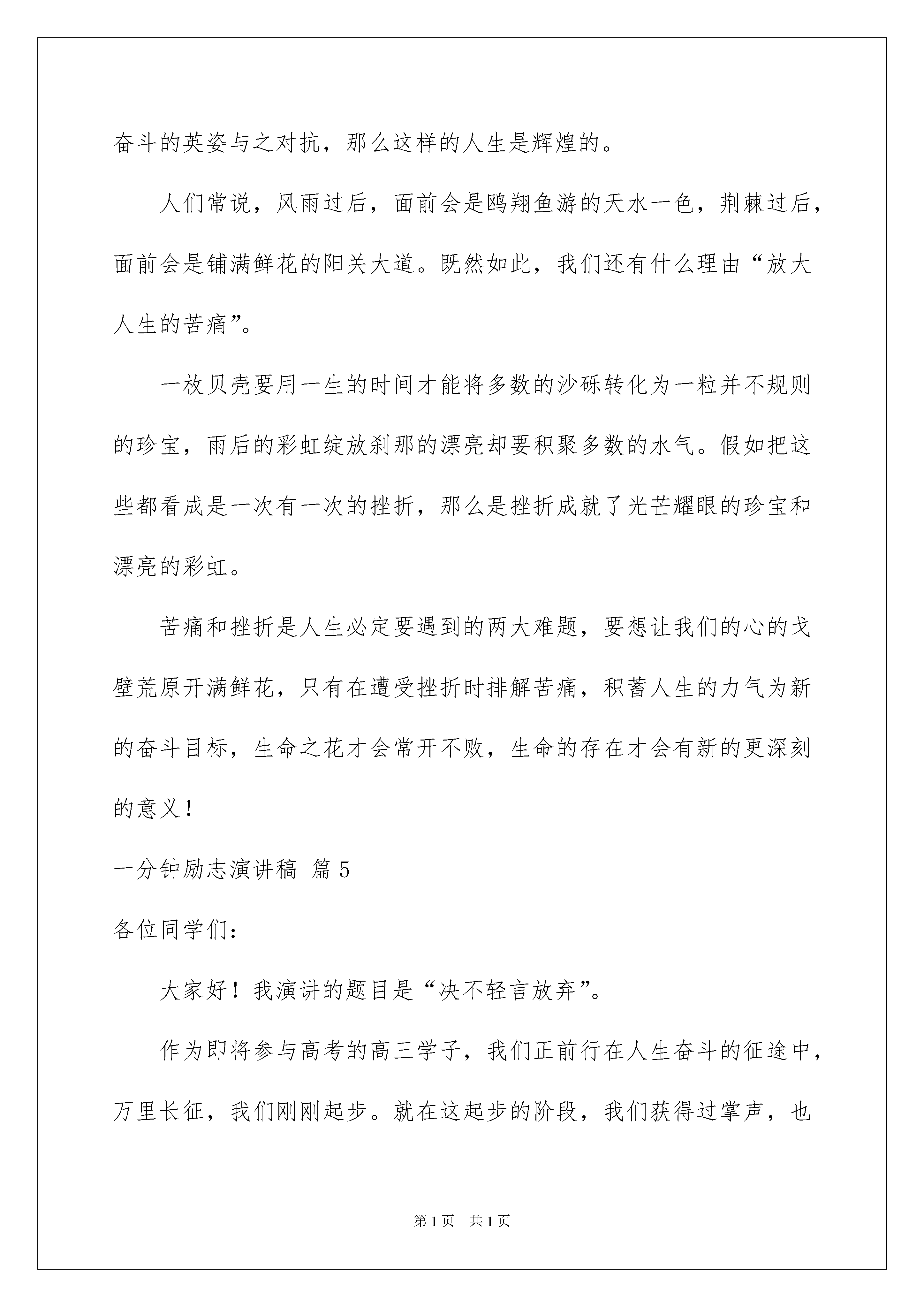 2022一分钟励志演讲稿一分钟励志演讲稿锦集七篇演讲稿在写作上具有肯定的格式要求。在充溢活力,日益开放的今日,越来越多地方须要用到演讲稿,演讲稿的留意事项有很多,你确定会写吗?下面是我收集整理的一分钟励志演讲稿7篇,欢迎大家共享。一分钟励志演讲稿篇1人的生活方式有2种。第一种方式是像草一样活着。每年还在生长。尽管活着。但是比拟是一棵草。但是长不大。汲取雨露阳光。人们可以踩过你而怜悯你但是人们不会因为你苦痛。因为人们自身就没有看到所以我每个人都要向树一样成长。即使我现在什么也不是但是有树的种子。即使自己猜到泥土中间。自己生长起来。依旧能够汲取泥土的养分。遥远的地方,等你长成参天大树以后。人们就能看到走进你能给人一片绿色。死了依旧是栋梁之才。活着是漂亮的风景。活着死了都有用。这就是每一个同学做人的规范和成长的规范。每一条河流都有自己不同的生命曲线。那就是奔向大海。但是每一条河流都有自己的幻想。有时候会像泥沙。生命。沉淀下去。可能渐渐的就会像沙一样。一旦你沉淀下去了或许你用在为了前进而努力了但你却恒久也见不到阳光了不论你现在生命是怎么样的所以我建议大家。肯定要有水的精神。时常的突破障碍。像水一样时常接着自己的力气。把自己的厚度给积累起来。当你发觉时机不到时候。一分钟励志演讲稿篇280后的我们有着太多的压抑和无奈,在经济快速膨胀,精神愈越贫瘠的世界里,我们像缺氧的人一样艰难呼吸。而这场地震,让我们再次谛视自己,我们原委要做的是什么,我们能做的是什么,既然生命可以在顷刻间灰飞烟灭,既然生命是没有意义的,我们的生命原委为什么而活。我想,对于这个问题,每个同学在心中都有自己的一个标准,我们无法变更突如其来的灾难,但是我们可以变更自己的内心,变更一种面对现实的方式,用一个崭新的姿态去体会、去给自己的生命定位。把我们对生活的不满放在一边,把我们对生活的欲求放得低一点点,把我们该做的事情梳理一遍,不要等到灾难来时,起先后悔,许多许多来不及完成的缺憾。请把我们想象成为这场百年一遇的大地震的生还者,把那些在地震中死去的人们当作我们最密切的亲朋好友,当你再次望见蓝蓝的天空,你的生命在你的掌心中是多么荣幸的一件事情。一个人只有感怀于别人的生命才能好好的谛视自己的生命,我不敢说,我们的社会离不了我们每个小小的生命这样的话,但是我敢说,你的生命是你自己的全部。关于青春,关于年轻,有太多的诗词歌赋,关于生命,更是有太多太多的哲思妙语,在这里,我仅仅是把自己的所思所想借着这个平台与大家一同共享,并真诚的祝福我们在座的每一位同学、老师华蜜。最终,让我们用热情的掌声为我们的生命而鼓掌!感谢大家!一分钟励志演讲稿篇3放飞幻想流光溢彩的年华,谁没有自己心中五彩的幻想?专心去编织,用勤奋去创建,只为这个幻想变的更精彩,更动人,只为这个幻想能变成现实。放飞幻想,我的幻想很简洁却不缺乏色调。放飞幻想,我的幻想是要做一个精彩的作家。只因为我要用我手中小小的笔描绘出五彩缤纷的世界;我要用我手中小小的笔写精彩彩斑斓的人生;我要用我手中小小的笔打造出光辉绚丽的生命;我要用我手中小小的笔勾画出宽阔无际的苍穹;我要用我手中小小的笔勾画出广袤辽远的大地;我要用我手中小小的笔描写出奇丽多彩的真谛。放飞幻想,我的幻想是我要做一个精彩的作家。只因为我要写出人生的真谛;我要唤醒沉睡的人们;我要证明中国的强大;我要写出人心的险恶;我要唤醒麻木的心灵;我要证明人间的真情;我要写出激情的岁月;我要唤醒曾经的记忆;我要证明似水的年华。放飞幻想,我的幻想是我要做一个精彩的作家。只因为我要用我的文字写出心中的感受;我要用我的文字写出心中的想法;我要用我的文字写出真正的世界;我要用我的文字写出真正的人生;我要用我的文字写出真正的生命;我要用我的文字写出真正的漂亮;我要用我的文字写出真正的色调;我要用我的文字写出真正的故事;我要用我的文字写出真正的校内;我要用我的文字写出真正的中国;我要用我的文字写出真正的自己。一分钟励志演讲稿篇4冰心说:“胜利的花儿,人们只惊羡它现时的漂亮。当时它的芽儿浸透了奋斗的泪水,洒遍了牺牲的细雨。”假如遭受挫折,仍能以奋斗的英姿与之对抗,那么这样的人生是辉煌的。人们常说,风雨过后,面前会是鸥翔鱼游的天水一色,荆棘过后,面前会是铺满鲜花的阳关大道。既然如此,我们还有什么理由“放大人生的苦痛”。一枚贝壳要用一生的时间才能将多数的沙砾转化为一粒并不规则的珍宝,雨后的彩虹绽放刹那的漂亮却要积聚多数的水气。假如把这些都看成是一次有一次的挫折,那么是挫折成就了光芒耀眼的珍宝和漂亮的彩虹。苦痛和挫折是人生必定要遇到的两大难题,要想让我们的心的戈