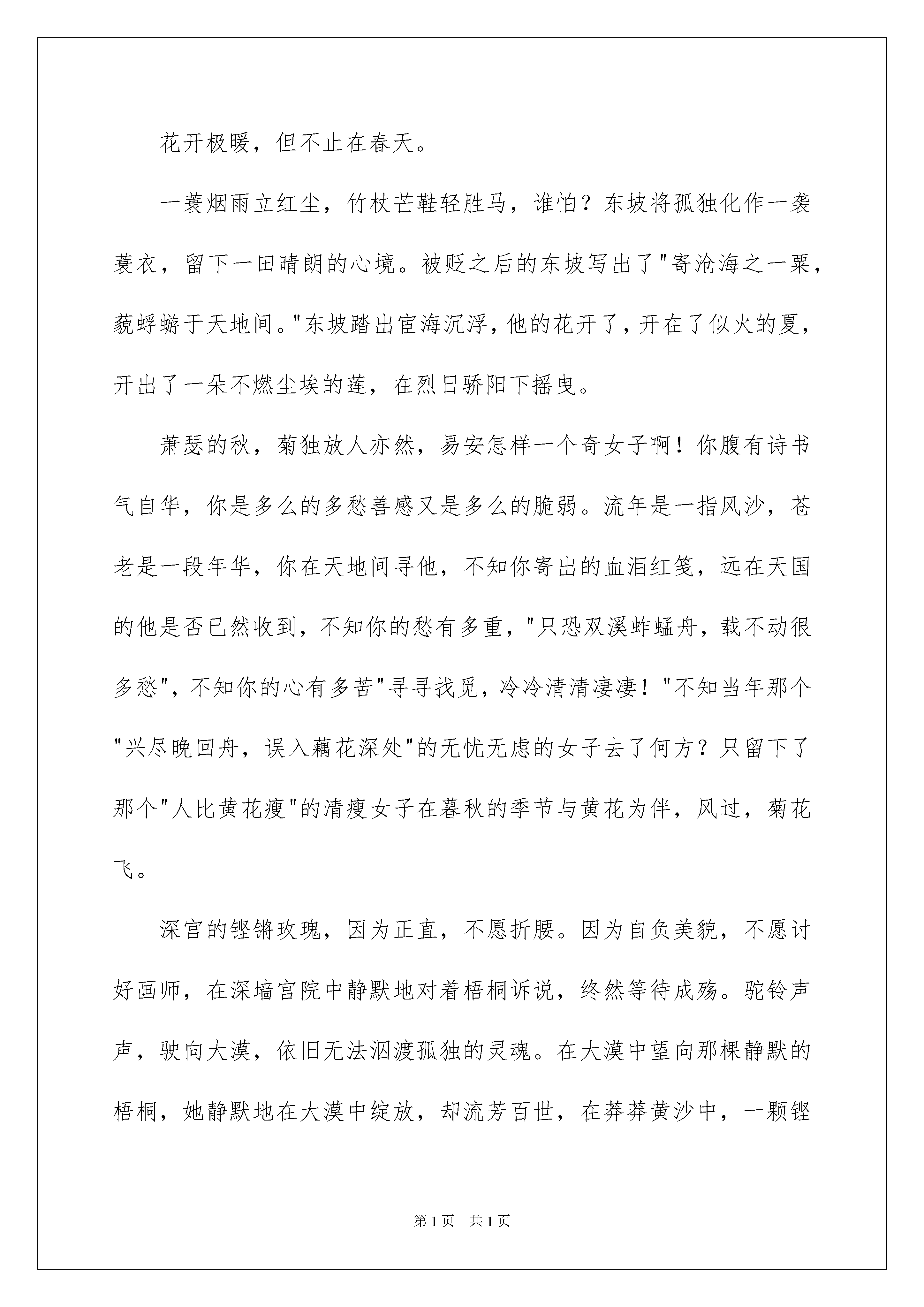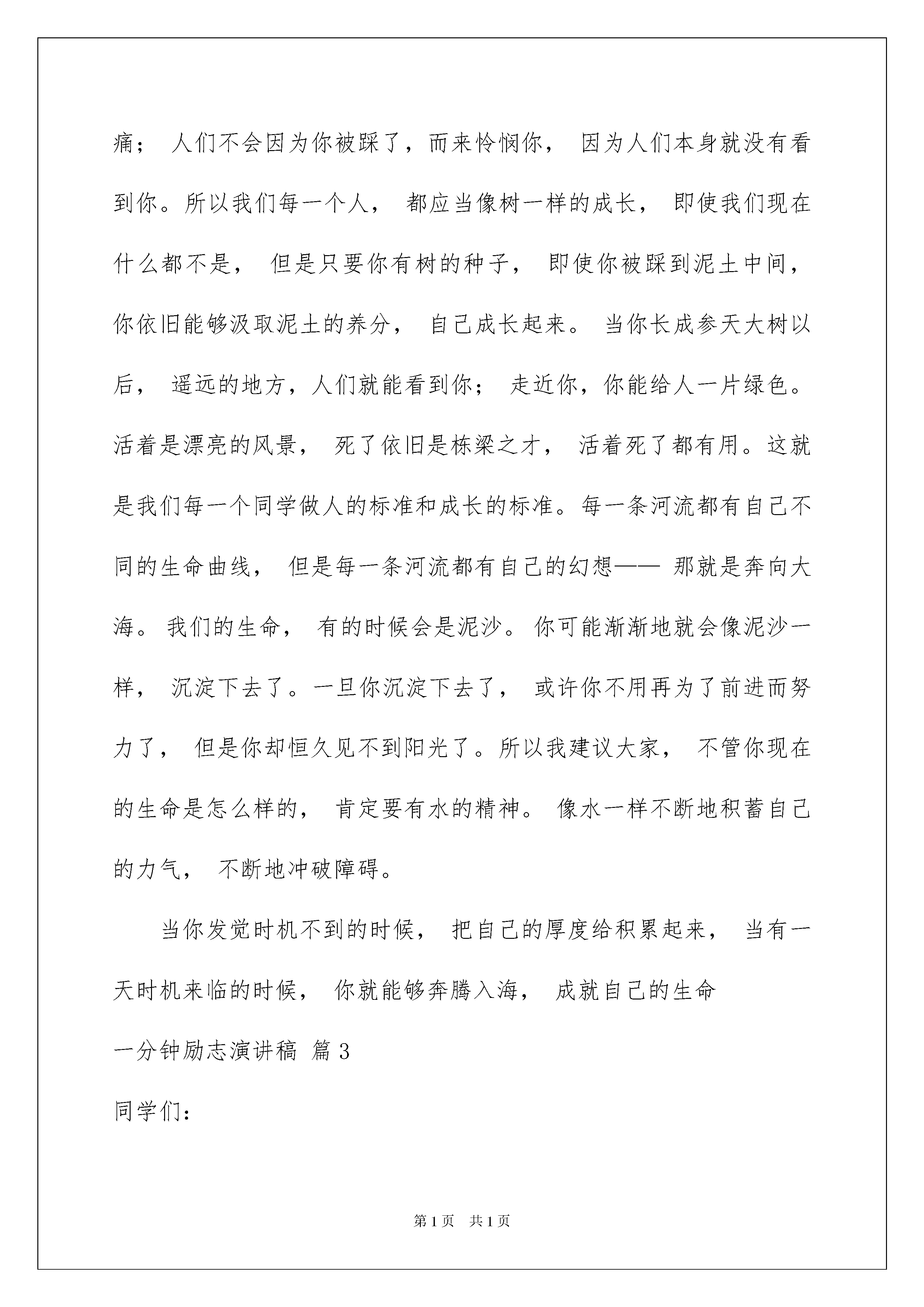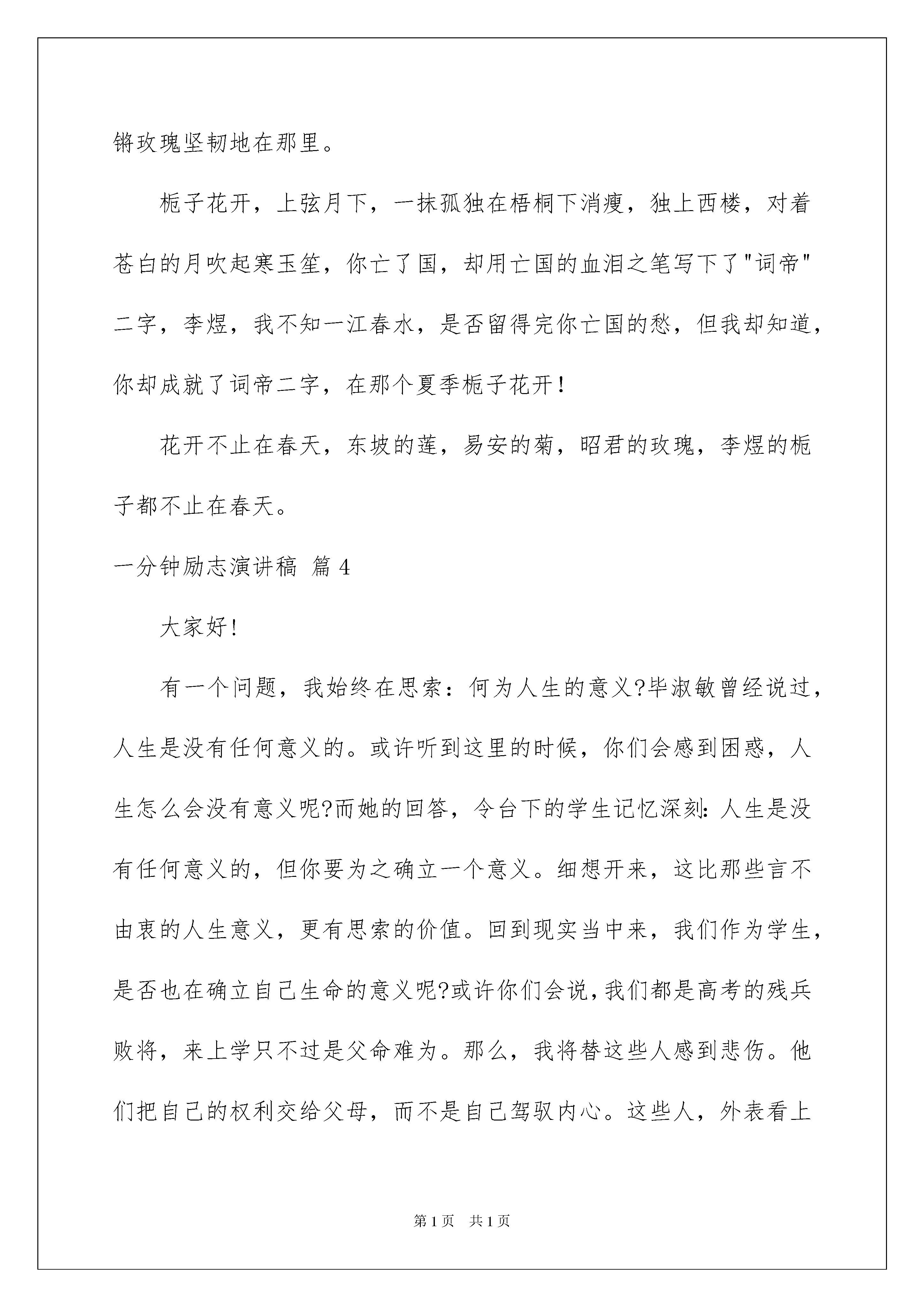 2022一分钟励志演讲稿关于一分钟励志演讲稿范文集锦七篇演讲稿以发表看法,表达观点为主,是为演讲而事先打算好的文稿。在学习、工作生活中,演讲稿在演讲中起到的作用越来越大,你知道演讲稿怎样才能写的好吗?下面是我为大家整理的一分钟励志演讲稿7篇,仅供参考,希望能够帮助到大家。一分钟励志演讲稿篇1一蓑烟雨立红尘,竹杖芒鞋轻胜马,谁怕?东坡将孤独化作一袭蓑衣,留下一田晴朗的心境。被贬之后的东坡写出了"寄沧海之一粟,藐蜉蝣于天地间。"东坡踏出宦海沉浮,他的花开了,开在了似火的夏,开出了一朵不燃尘埃的莲,在烈日骄阳下摇曳。萧瑟的秋,菊独放人亦然,易安怎样一个奇女子啊!你腹有诗书气自华,你是多么的多愁善感又是多么的脆弱。流年是一指风沙,苍老是一段年华,你在天地间寻他,不知你寄出的血泪红笺,远在天国的他是否已然收到,不知你的愁有多重,"只恐双溪蚱蜢舟,载不动很多愁",不知你的心有多苦"寻寻找觅,冷冷清清凄凄!"不知当年那个"兴尽晚回舟,误入藕花深处"的无忧无虑的女子去了何方?只留下了那个"人比黄花瘦"的清瘦女子在暮秋的季节与黄花为伴,风过,菊花飞。深宫的铿锵玫瑰,因为正直,不愿折腰。因为自负美貌,不愿讨好画师,在深墙宫院中静默地对着梧桐诉说,终然等待成殇。驼铃声声,驶向大漠,依旧无法泅渡孤独的灵魂。在大漠中望向那棵静默的梧桐,她静默地在大漠中绽放,却流芳百世,在莽莽黄沙中,一颗铿锵玫瑰坚韧地在那里。栀子花开,上弦月下,一抹孤独在梧桐下消瘦,独上西楼,对着苍白的月吹起寒玉笙,你亡了国,却用亡国的血泪之笔写下了"词帝"二字,李煜,我不知一江春水,是否留得完你亡国的愁,但我却知道,你却成就了词帝二字,在那个夏季栀子花开!花开不止在春天,东坡的莲,易安的菊,昭君的玫瑰,李煜的栀子都不止在春天。一分钟励志演讲稿篇2人的生活方式有两种,第一种方式是像草一样活着,你尽管活着,每年还在成长,但是你终归是一棵草,你汲取雨露阳光,但是长不大。人们可以踩过你,但是人们不会因为你的苦痛,而产生苦痛;人们不会因为你被踩了,而来怜悯你,因为人们本身就没有看到你。所以我们每一个人,都应当像树一样的成长,即使我们现在什么都不是,但是只要你有树的种子,即使你被踩到泥土中间,你依旧能够汲取泥土的养分,自己成长起来。当你长成参天大树以后,遥远的地方,人们就能看到你;走近你,你能给人一片绿色。活着是漂亮的风景,死了依旧是栋梁之才,活着死了都有用。这就是我们每一个同学做人的标准和成长的标准。每一条河流都有自己不同的生命曲线,但是每一条河流都有自己的幻想——那就是奔向大海。我们的生命,有的时候会是泥沙。你可能渐渐地就会像泥沙一样,沉淀下去了。一旦你沉淀下去了,或许你不用再为了前进而努力了,但是你却恒久见不到阳光了。所以我建议大家,不管你现在的生命是怎么样的,肯定要有水的精神。像水一样不断地积蓄自己的力气,不断地冲破障碍。当你发觉时机不到的时候,把自己的厚度给积累起来,当有一天时机来临的时候,你就能够奔腾入海,成就自己的生命一分钟励志演讲稿篇3同学们:花开极暖,但不止在春天。一蓑烟雨立红尘,竹杖芒鞋轻胜马,谁怕?东坡将孤独化作一袭蓑衣,留下一田晴朗的心境。被贬之后的东坡写出了"寄沧海之一粟,藐蜉蝣于天地间。"东坡踏出宦海沉浮,他的花开了,开在了似火的夏,开出了一朵不燃尘埃的莲,在烈日骄阳下摇曳。萧瑟的秋,菊独放人亦然,易安怎样一个奇女子啊!你腹有诗书气自华,你是多么的多愁善感又是多么的脆弱。流年是一指风沙,苍老是一段年华,你在天地间寻他,不知你寄出的血泪红笺,远在天国的他是否已然收到,不知你的愁有多重,"只恐双溪蚱蜢舟,载不动很多愁",不知你的心有多苦"寻寻找觅,冷冷清清凄凄!"不知当年那个"兴尽晚回舟,误入藕花深处"的无忧无虑的女子去了何方?只留下了那个"人比黄花瘦"的清瘦女子在暮秋的季节与黄花为伴,风过,菊花飞。深宫的铿锵玫瑰,因为正直,不愿折腰。因为自负美貌,不愿讨好画师,在深墙宫院中静默地对着梧桐诉说,终然等待成殇。驼铃声声,驶向大漠,依旧无法泅渡孤独的灵魂。在大漠中望向那棵静默的梧桐,她静默地在大漠中绽放,却流芳百世,在莽莽黄沙中,一颗铿锵玫瑰坚韧地在那里。栀子花开,上弦月下,一抹孤独在梧桐下消瘦,独上西楼,对着苍白的月吹起寒玉笙,你亡了国,却用亡国的血泪之笔写下了"词帝"二字,李煜,我不知一江春水,是否留得完你亡国的愁,但我却知道,你却成就了词帝二字,在那个夏季栀子花开!花开不止在春天,东坡的莲,易安的菊,昭君的玫瑰,李煜的栀子都不止在春天。一分钟励志演讲稿篇4大家好!有一个问题,我始终在思索:何为人生的意义?毕淑敏曾经