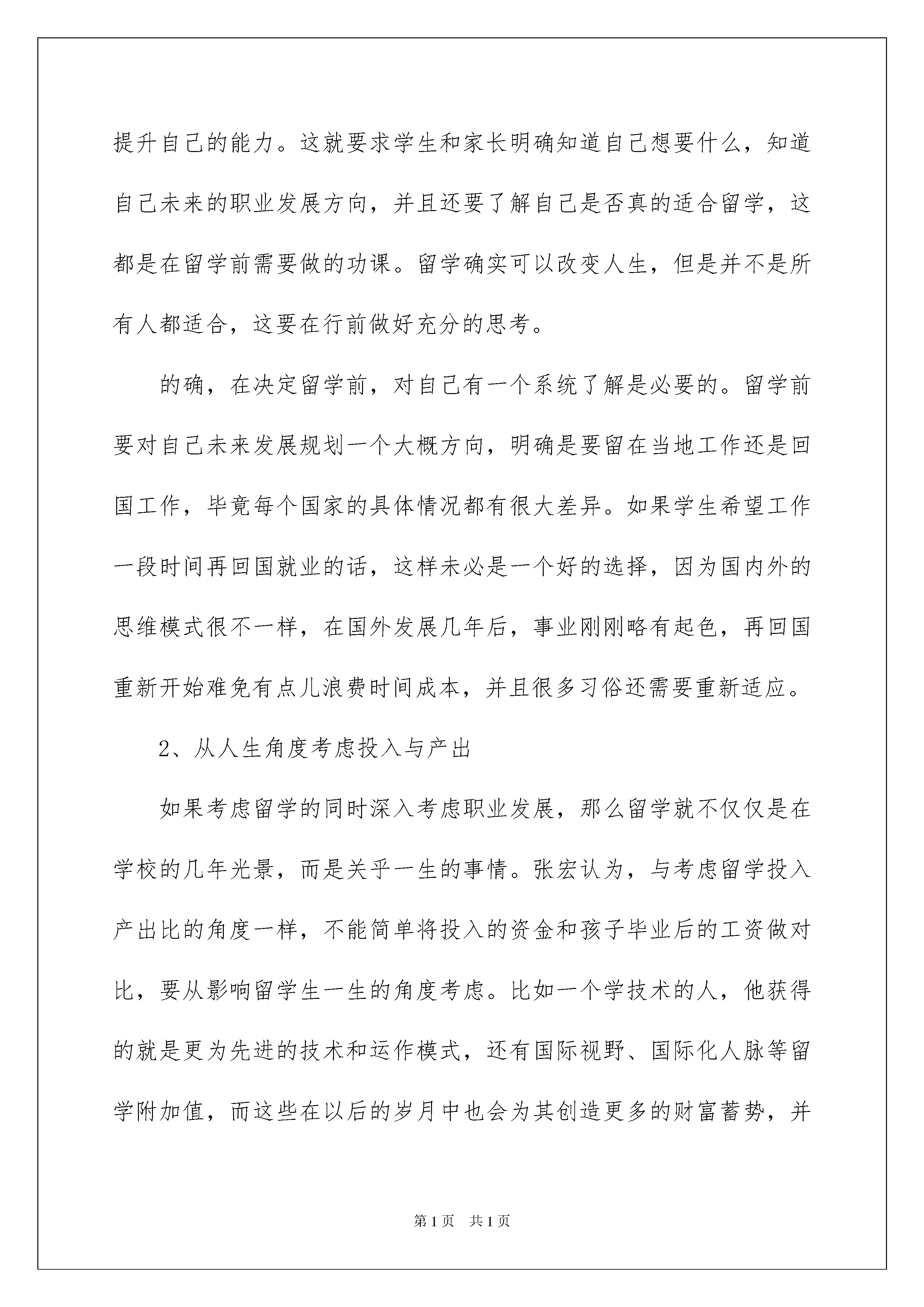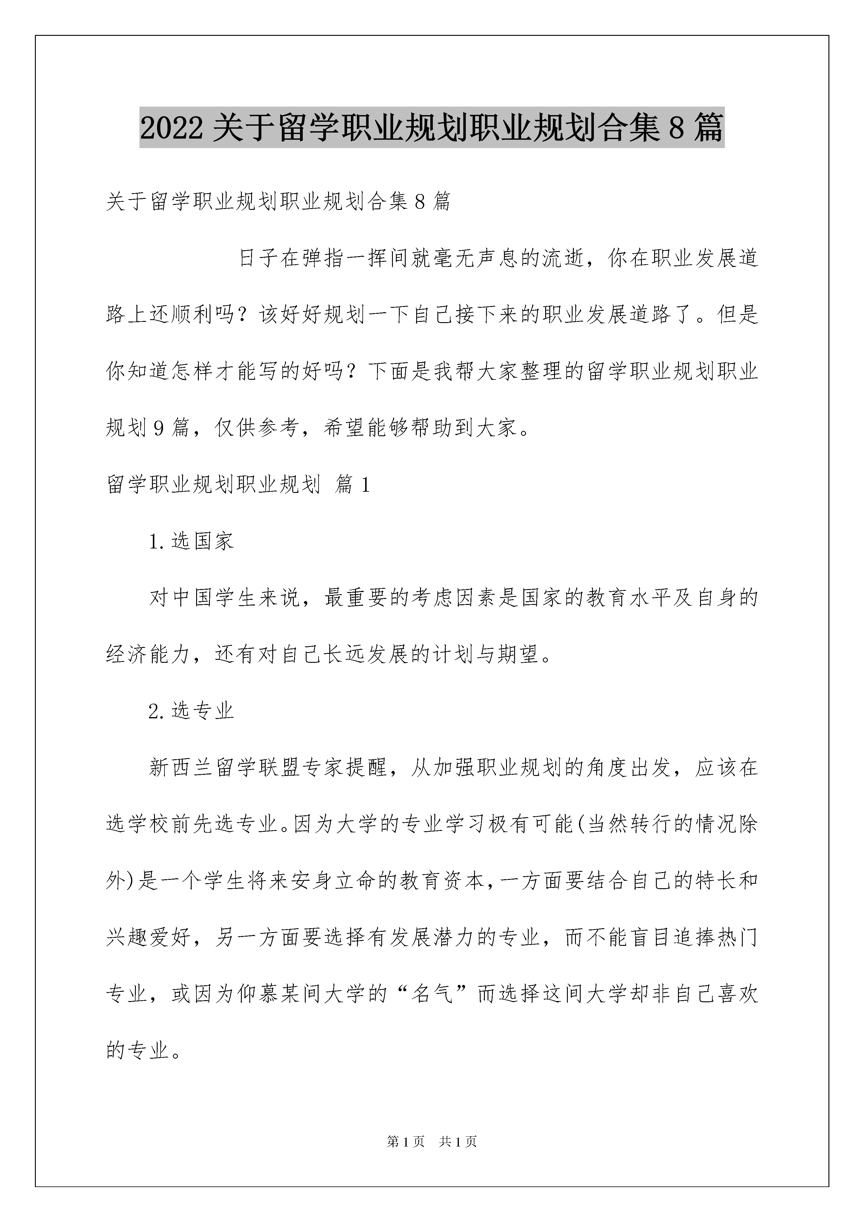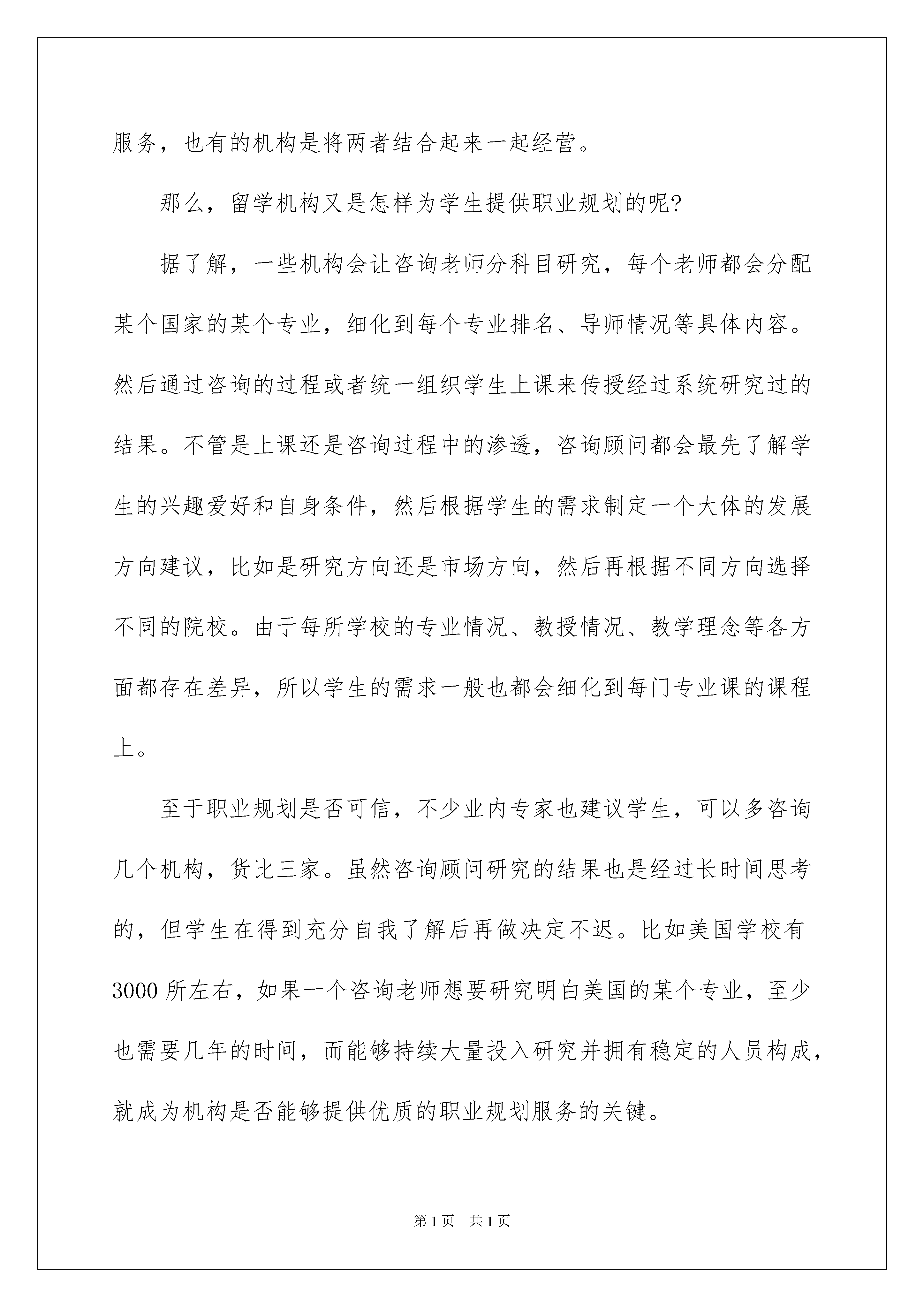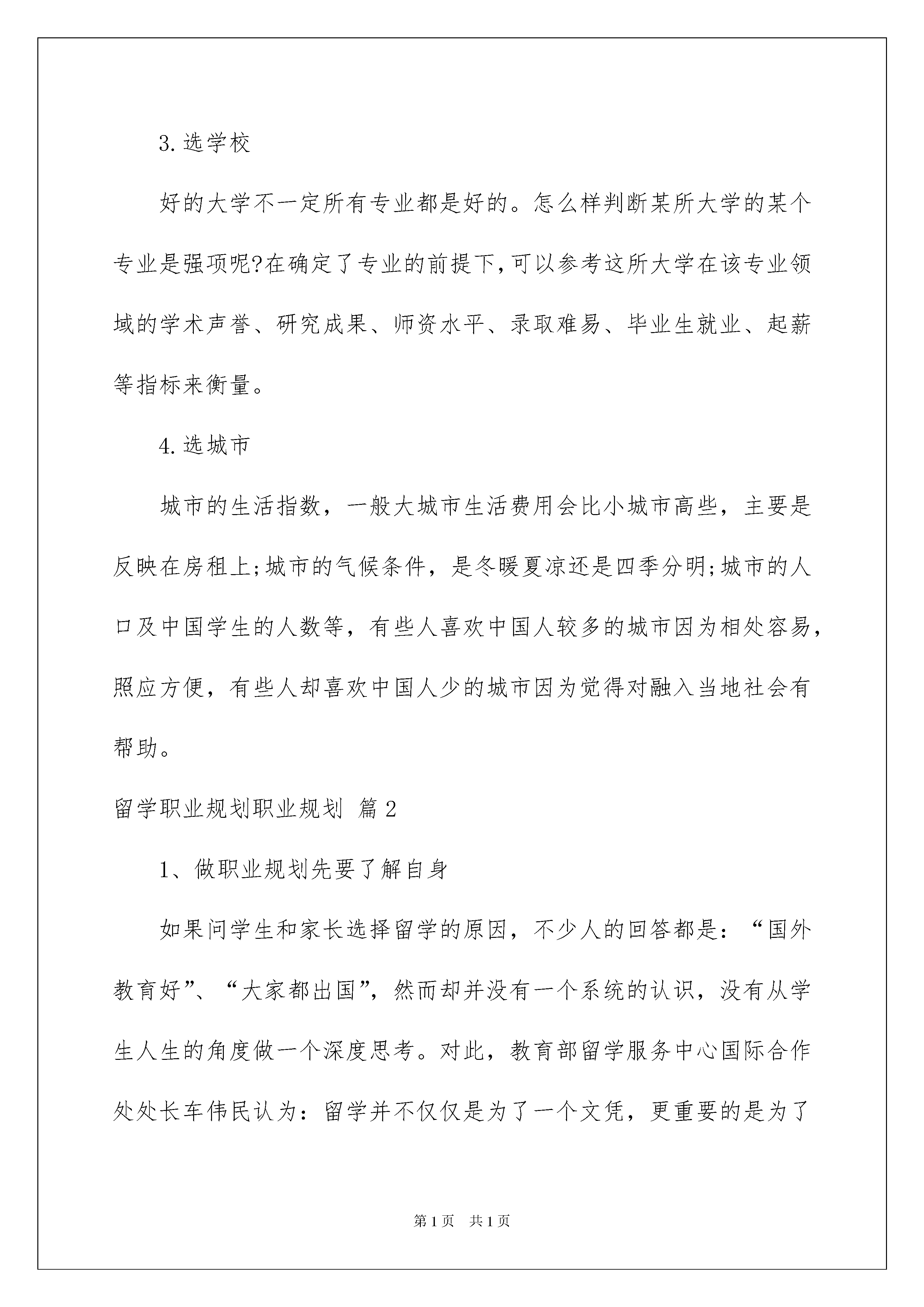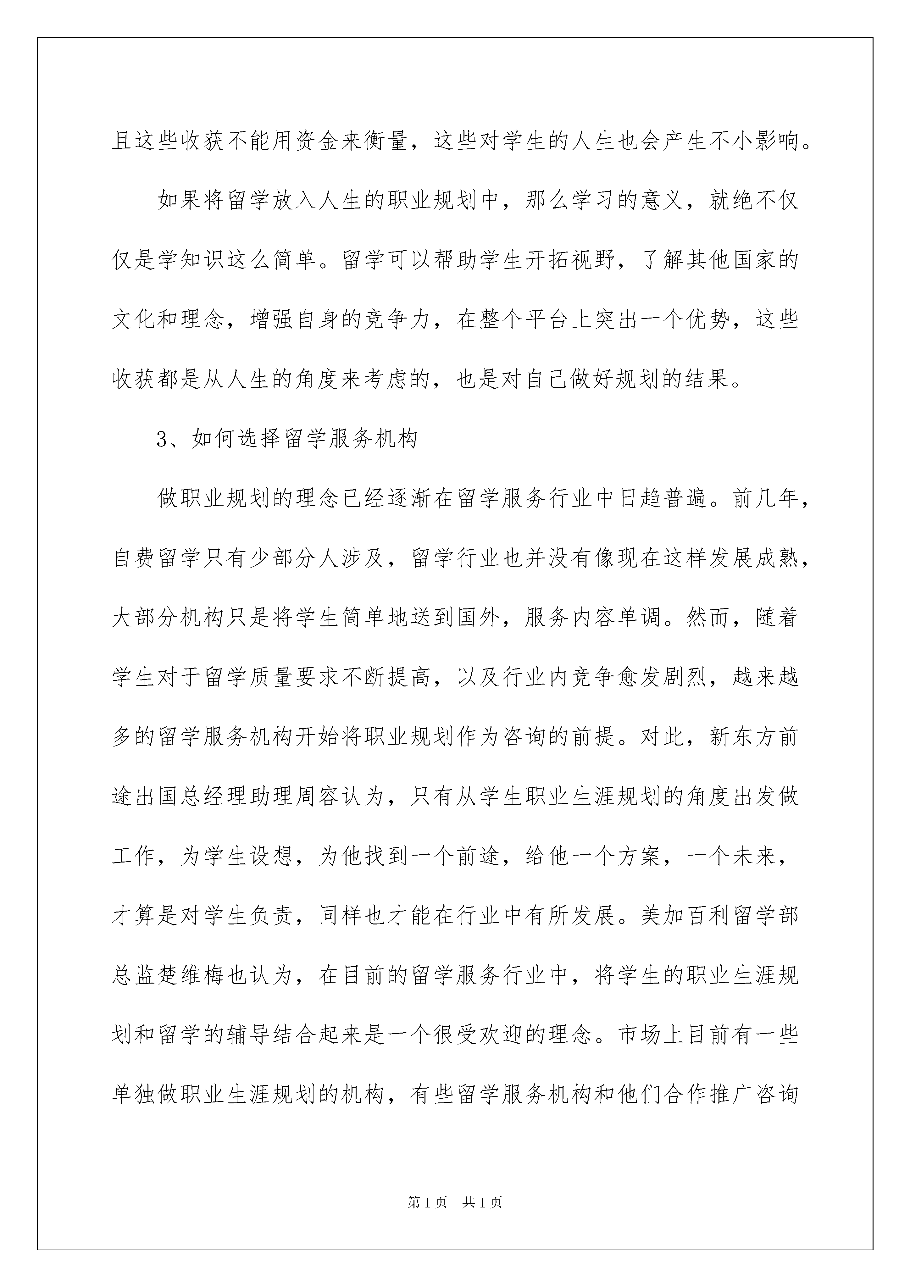 2022关于留学职业规划职业规划合集8篇关于留学职业规划职业规划合集8篇日子在弹指一挥间就毫无声息的流逝,你在职业发展道路上还顺利吗?该好好规划一下自己接下来的职业发展道路了。但是你知道怎样才能写的好吗?下面是我帮大家整理的留学职业规划职业规划9篇,仅供参考,希望能够帮助到大家。留学职业规划职业规划篇11.选国家对中国学生来说,最重要的考虑因素是国家的教育水平及自身的经济能力,还有对自己长远发展的计划与期望。2.选专业新西兰留学联盟专家提醒,从加强职业规划的角度出发,应该在选学校前先选专业。因为大学的专业学习极有可能(当然转行的情况除外)是一个学生将来安身立命的教育资本,一方面要结合自己的特长和兴趣爱好,另一方面要选择有发展潜力的专业,而不能盲目追捧热门专业,或因为仰慕某间大学的“名气”而选择这间大学却非自己喜欢的专业。3.选学校好的大学不一定所有专业都是好的。怎么样判断某所大学的某个专业是强项呢?在确定了专业的前提下,可以参考这所大学在该专业领域的学术声誉、研究成果、师资水平、录取难易、毕业生就业、起薪等指标来衡量。4.选城市城市的生活指数,一般大城市生活费用会比小城市高些,主要是反映在房租上;城市的气候条件,是冬暖夏凉还是四季分明;城市的人口及中国学生的人数等,有些人喜欢中国人较多的城市因为相处容易,照应方便,有些人却喜欢中国人少的城市因为觉得对融入当地社会有帮助。留学职业规划职业规划篇21、做职业规划先要了解自身如果问学生和家长选择留学的原因,不少人的回答都是:“国外教育好”、“大家都出国”,然而却并没有一个系统的认识,没有从学生人生的角度做一个深度思考。对此,教育部留学服务中心国际合作处处长车伟民认为:留学并不仅仅是为了一个文凭,更重要的是为了提升自己的能力。这就要求学生和家长明确知道自己想要什么,知道自己未来的职业发展方向,并且还要了解自己是否真的适合留学,这都是在留学前需要做的功课。留学确实可以改变人生,但是并不是所有人都适合,这要在行前做好充分的思考。的确,在决定留学前,对自己有一个系统了解是必要的。留学前要对自己未来发展规划一个大概方向,明确是要留在当地工作还是回国工作,毕竟每个国家的具体情况都有很大差异。如果学生希望工作一段时间再回国就业的话,这样未必是一个好的选择,因为国内外的思维模式很不一样,在国外发展几年后,事业刚刚略有起色,再回国重新开始难免有点儿浪费时间成本,并且很多习俗还需要重新适应。2、从人生角度考虑投入与产出如果考虑留学的同时深入考虑职业发展,那么留学就不仅仅是在学校的几年光景,而是关乎一生的事情。张宏认为,与考虑留学投入产出比的角度一样,不能简单将投入的资金和孩子毕业后的工资做对比,要从影响留学生一生的角度考虑。比如一个学技术的人,他获得的就是更为先进的技术和运作模式,还有国际视野、国际化人脉等留学附加值,而这些在以后的岁月中也会为其创造更多的财富蓄势,并且这些收获不能用资金来衡量,这些对学生的人生也会产生不小影响。如果将留学放入人生的职业规划中,那么学习的意义,就绝不仅仅是学知识这么简单。留学可以帮助学生开拓视野,了解其他国家的文化和理念,增强自身的竞争力,在整个平台上突出一个优势,这些收获都是从人生的角度来考虑的,也是对自己做好规划的结果。3、如何选择留学服务机构做职业规划的理念已经逐渐在留学服务行业中日趋普遍。前几年,自费留学只有少部分人涉及,留学行业也并没有像现在这样发展成熟,大部分机构只是将学生简单地送到国外,服务内容单调。然而,随着学生对于留学质量要求不断提高,以及行业内竞争愈发剧烈,越来越多的留学服务机构开始将职业规划作为咨询的前提。对此,新东方前途出国总经理助理周容认为,只有从学生职业生涯规划的角度出发做工作,为学生设想,为他找到一个前途,给他一个方案,一个未来,才算是对学生负责,同样也才能在行业中有所发展。美加百利留学部总监楚维梅也认为,在目前的留学服务行业中,将学生的职业生涯规划和留学的辅导结合起来是一个很受欢迎的理念。市场上目前有一些单独做职业生涯规划的机构,有些留学服务机构和他们合作推广咨询服务,也有的机构是将两者结合起来一起经营。那么,留学机构又是怎样为学生提供职业规划的呢?据了解,一些机构会让咨询老师分科目研究,每个老师都会分配某个国家的某个专业,细化到每个专业排名、导师情况等具体内容。然后通过咨询的过程或者统一组织学生上课来传授经过系统研究过的结果。不管是上课还是咨询过程中的渗透,咨询顾问都会最先了解学生的兴趣爱好和自身条件,然后根据学生的需求制定一个大体的发展方向建议,比如是研究方向还是市场方向,然后再根