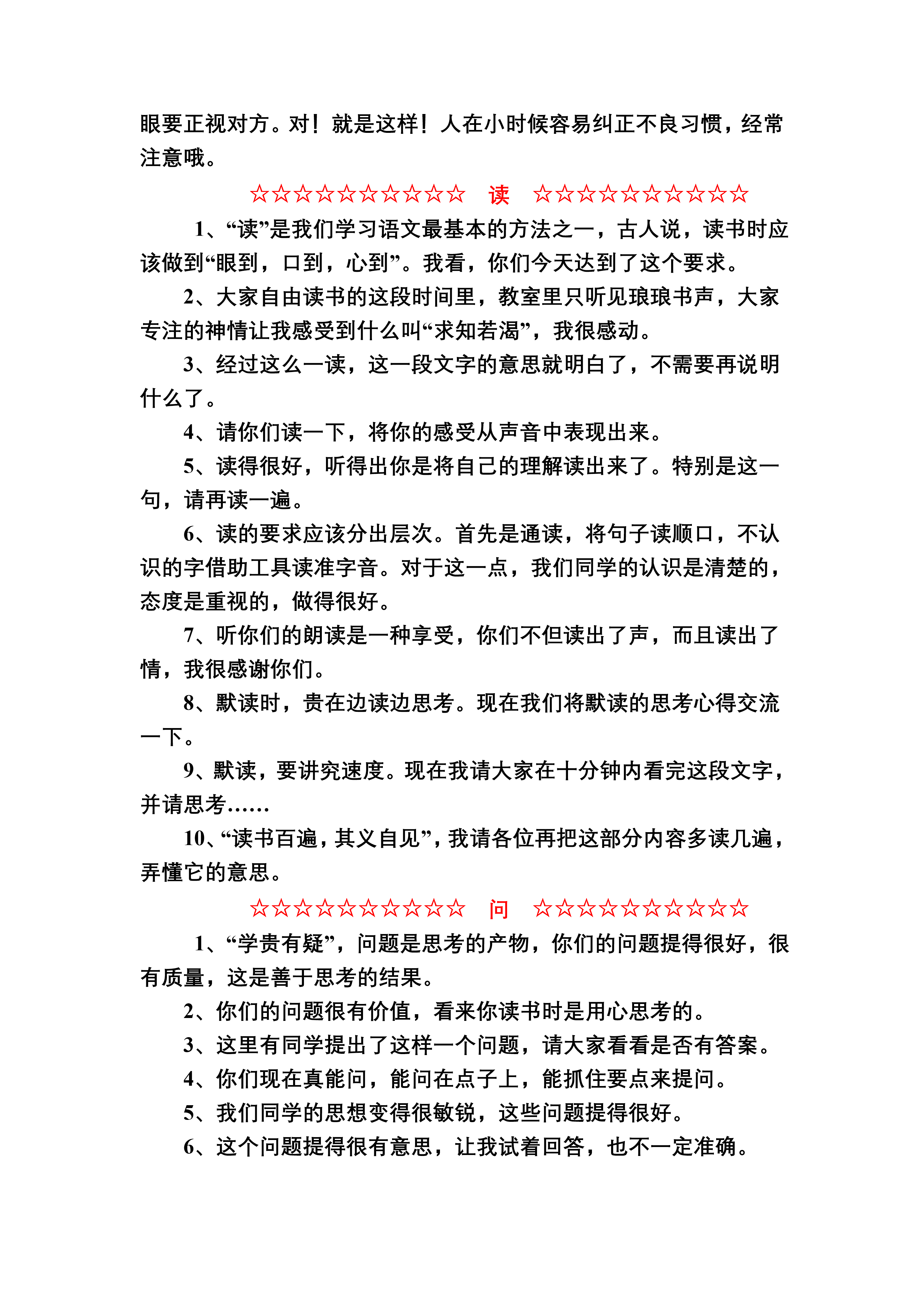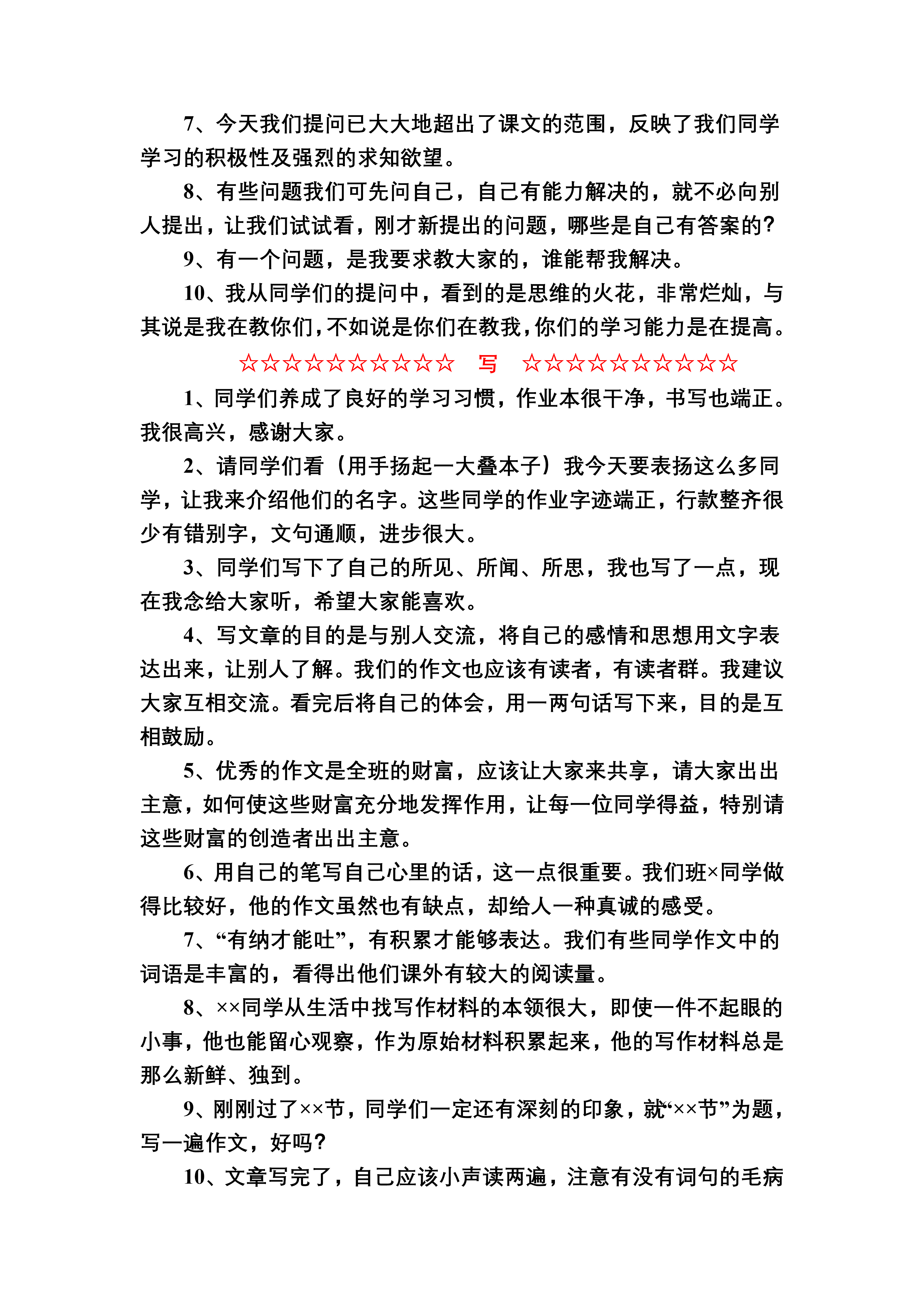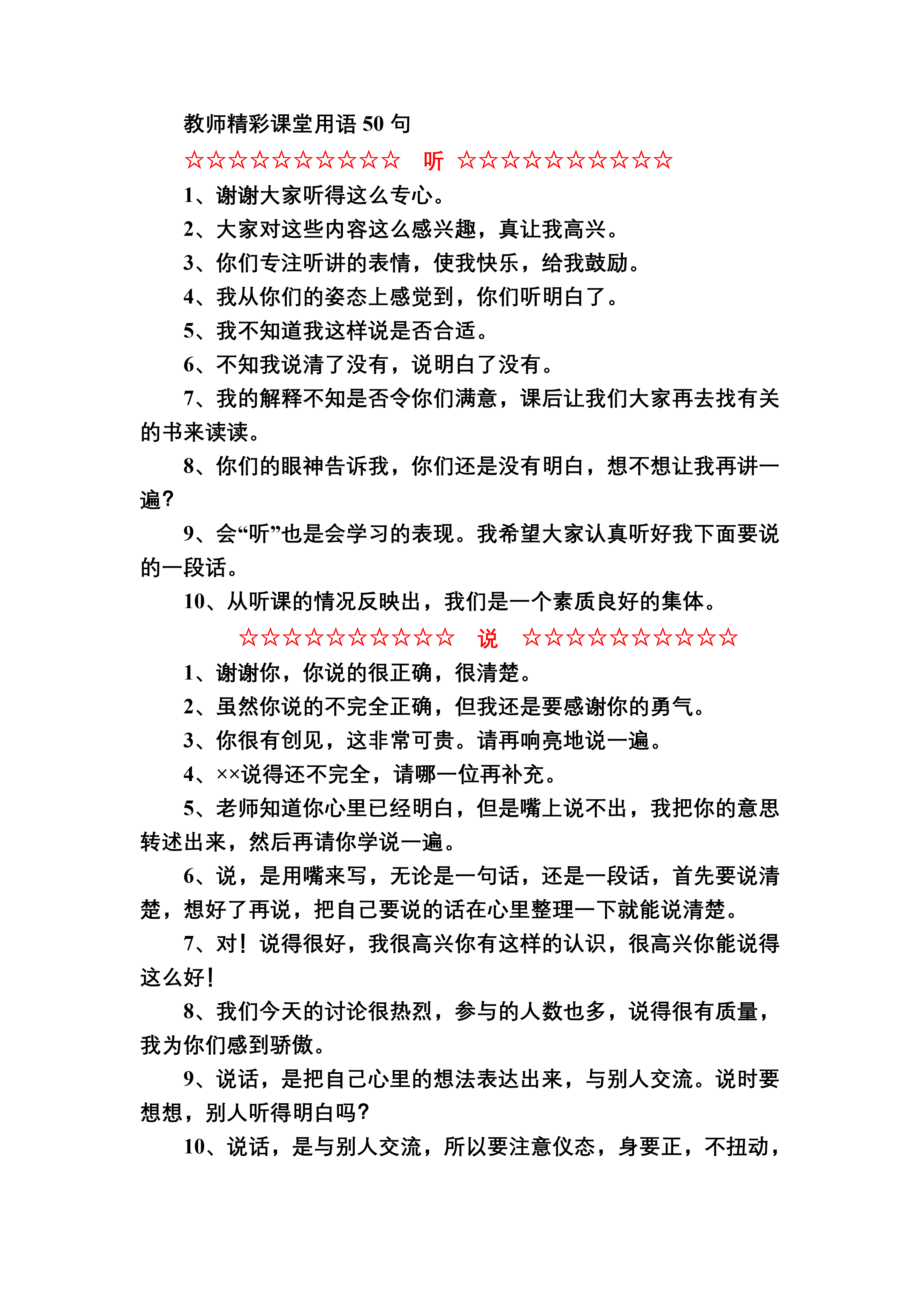 教师精彩课堂用语50句☆☆☆☆☆☆☆☆☆☆听☆☆☆☆☆☆☆☆☆☆1、谢谢大家听得这么专心。2、大家对这些内容这么感兴趣,真让我高兴。3、你们专注听讲的表情,使我快乐,给我鼓励。4、我从你们的姿态上感觉到,你们听明白了。5、我不知道我这样说是否合适。6、不知我说清了没有,说明白了没有。7、我的解释不知是否令你们满意,课后让我们大家再去找有关的书来读读。8、你们的眼神告诉我,你们还是没有明白,想不想让我再讲一遍?9、会“听”也是会学习的表现。我希望大家认真听好我下面要说的一段话。10、从听课的情况反映出,我们是一个素质良好的集体。☆☆☆☆☆☆☆☆☆☆说☆☆☆☆☆☆☆☆☆☆1、谢谢你,你说的很正确,很清楚。2、虽然你说的不完全正确,但我还是要感谢你的勇气。3、你很有创见,这非常可贵。请再响亮地说一遍。4、××说得还不完全,请哪一位再补充。5、老师知道你心里已经明白,但是嘴上说不出,我把你的意思转述出来,然后再请你学说一遍。6、说,是用嘴来写,无论是一句话,还是一段话,首先要说清楚,想好了再说,把自己要说的话在心里整理一下就能说清楚。7、对!说得很好,我很高兴你有这样的认识,很高兴你能说得这么好!8、我们今天的讨论很热烈,参与的人数也多,说得很有质量,我为你们感到骄傲。9、说话,是把自己心里的想法表达出来,与别人交流。说时要想想,别人听得明白吗?10、说话,是与别人交流,所以要注意仪态,身要正,不扭动,眼要正视对方。对!就是这样!人在小时候容易纠正不良习惯,经常注意哦。☆☆☆☆☆☆☆☆☆☆读☆☆☆☆☆☆☆☆☆☆1、“读”是我们学习语文最基本的方法之一,古人说,读书时应该做到“眼到,口到,心到”。我看,你们今天达到了这个要求。2、大家自由读书的这段时间里,教室里只听见琅琅书声,大家专注的神情让我感受到什么叫“求知若渴”,我很感动。3、经过这么一读,这一段文字的意思就明白了,不需要再说明什么了。4、请你们读一下,将你的感受从声音中表现出来。5、读得很好,听得出你是将自己的理解读出来了。特别是这一句,请再读一遍。6、读的要求应该分出层次。首先是通读,将句子读顺口,不认识的字借助工具读准字音。对于这一点,我们同学的认识是清楚的,态度是重视的,做得很好。7、听你们的朗读是一种享受,你们不但读出了声,而且读出了情,我很感谢你们。8、默读时,贵在边读边思考。现在我们将默读的思考心得交流一下。9、默读,要讲究速度。现在我请大家在十分钟内看完这段文字,并请思考……10、“读书百遍,其义自见”,我请各位再把这部分内容多读几遍,弄懂它的意思。☆☆☆☆☆☆☆☆☆☆问☆☆☆☆☆☆☆☆☆☆1、“学贵有疑”,问题是思考的产物,你们的问题提得很好,很有质量,这是善于思考的结果。2、你们的问题很有价值,看来你读书时是用心思考的。3、这里有同学提出了这样一个问题,请大家看看是否有答案。4、你们现在真能问,能问在点子上,能抓住要点来提问。5、我们同学的思想变得很敏锐,这些问题提得很好。6、这个问题提得很有意思,让我试着回答,也不一定准确。7、今天我们提问已大大地超出了课文的范围,反映了我们同学学习的积极性及强烈的求知欲望。8、有些问题我们可先问自己,自己有能力解决的,就不必向别人提出,让我们试试看,刚才新提出的问题,哪些是自己有答案的?9、有一个问题,是我要求教大家的,谁能帮我解决。10、我从同学们的提问中,看到的是思维的火花,非常烂灿,与其说是我在教你们,不如说是你们在教我,你们的学习能力是在提高。☆☆☆☆☆☆☆☆☆☆写☆☆☆☆☆☆☆☆☆☆1、同学们养成了良好的学习习惯,作业本很干净,书写也端正。我很高兴,感谢大家。2、请同学们看(用手扬起一大叠本子)我今天要表扬这么多同学,让我来介绍他们的名字。这些同学的作业字迹端正,行款整齐很少有错别字,文句通顺,进步很大。3、同学们写下了自己的所见、所闻、所思,我也写了一点,现在我念给大家听,希望大家能喜欢。4、写文章的目的是与别人交流,将自己的感情和思想用文字表达出来,让别人了解。我们的作文也应该有读者,有读者群。我建议大家互相交流。看完后将自己的体会,用一两句话写下来,目的是互相鼓励。5、优秀的作文是全班的财富,应该让大家来共享,请大家出出主意,如何使这些财富充分地发挥作用,让每一位同学得益,特别请这些财富的创造者出出主意。6、用自己的笔写自己心里的话,这一点很重要。我们班×同学做得比较好,他的作文虽然也有缺点,却给人一种真诚的感受。7、“有纳才能吐”,有积累才能够表达。我们有些同学作文中的词语是丰富的,看得出他们课外有较大的阅读量。8、××同学从生活中找写作材料的本领很大,即使一件不起眼的小事,他也能留心观察,作为原始材