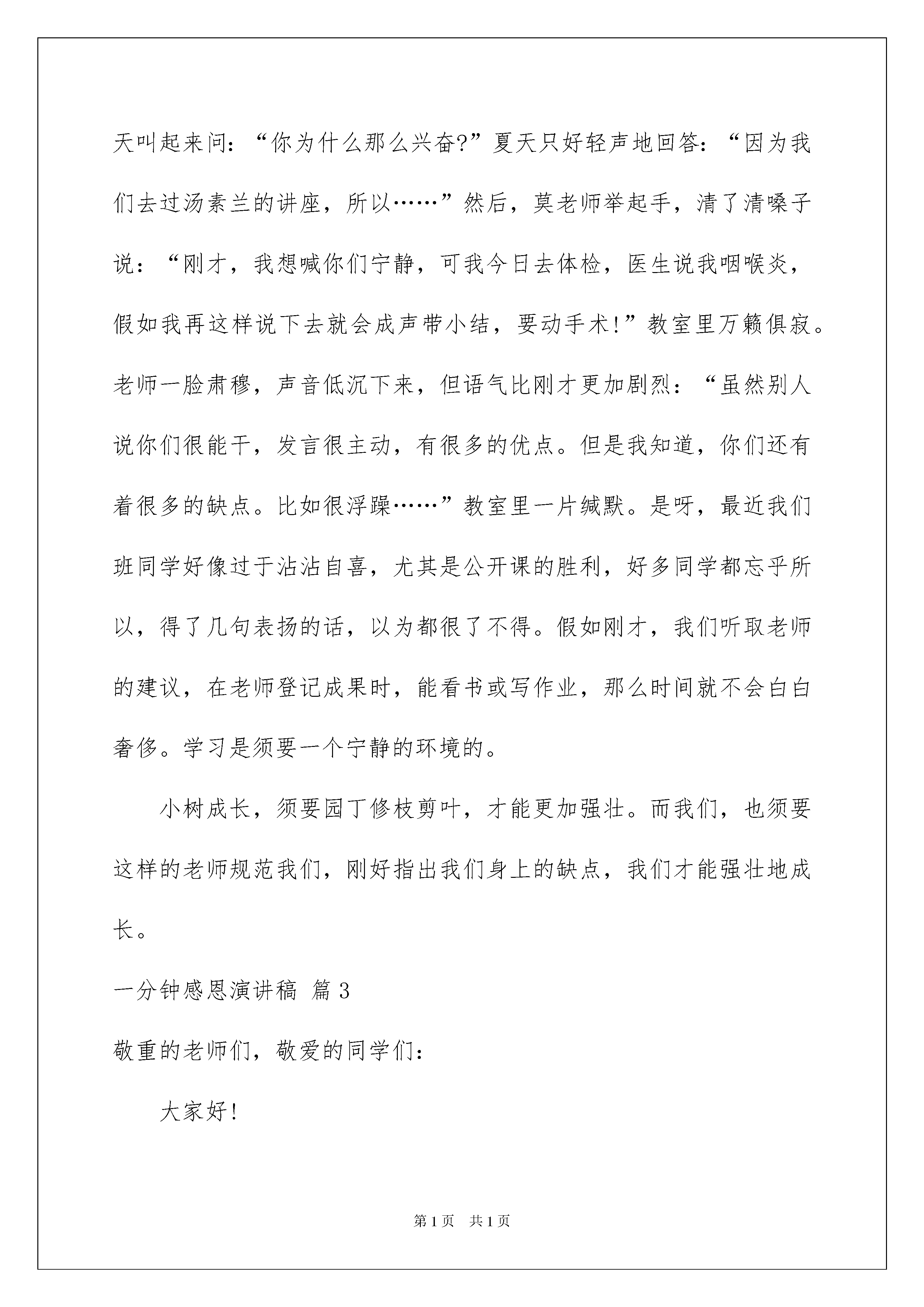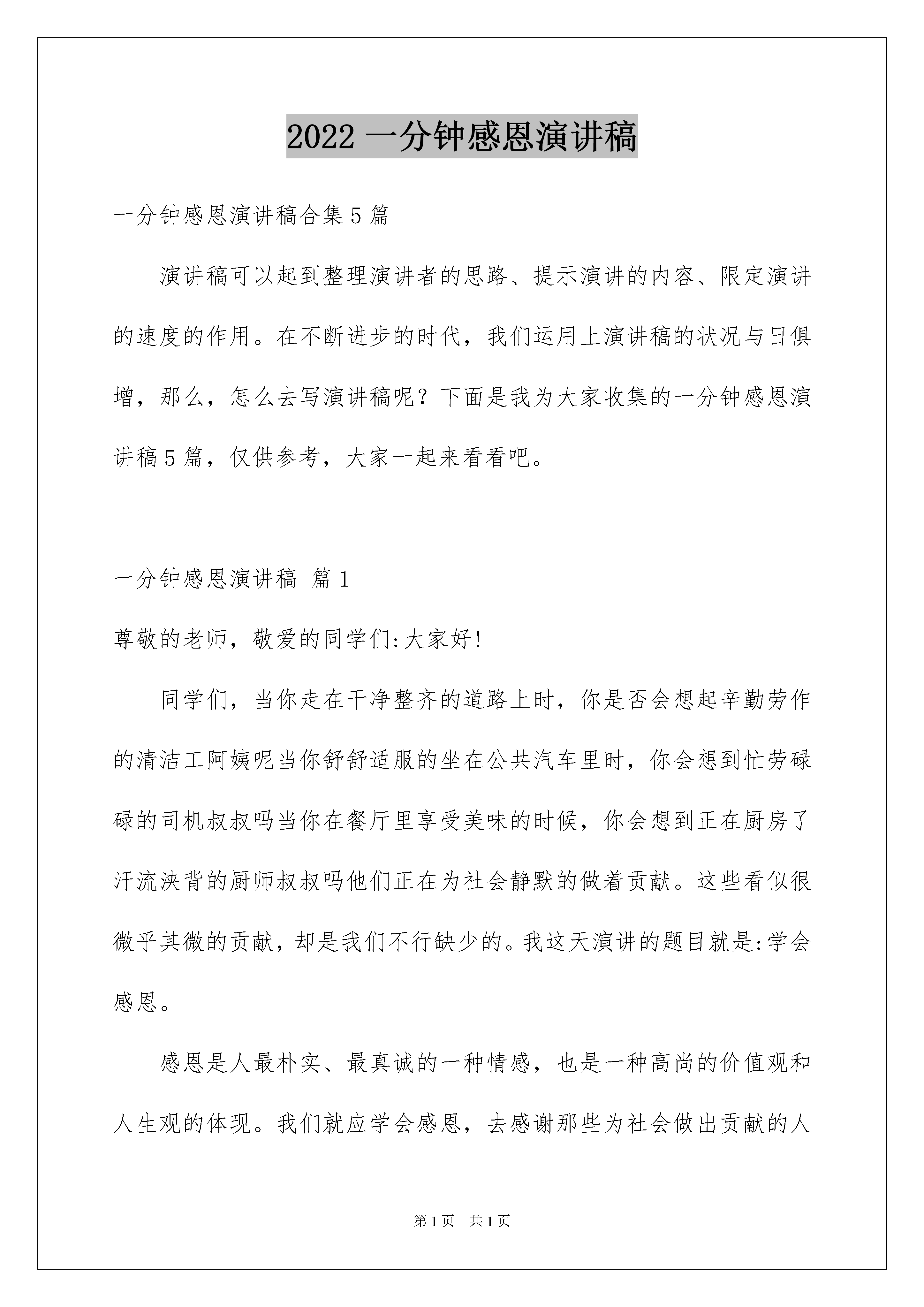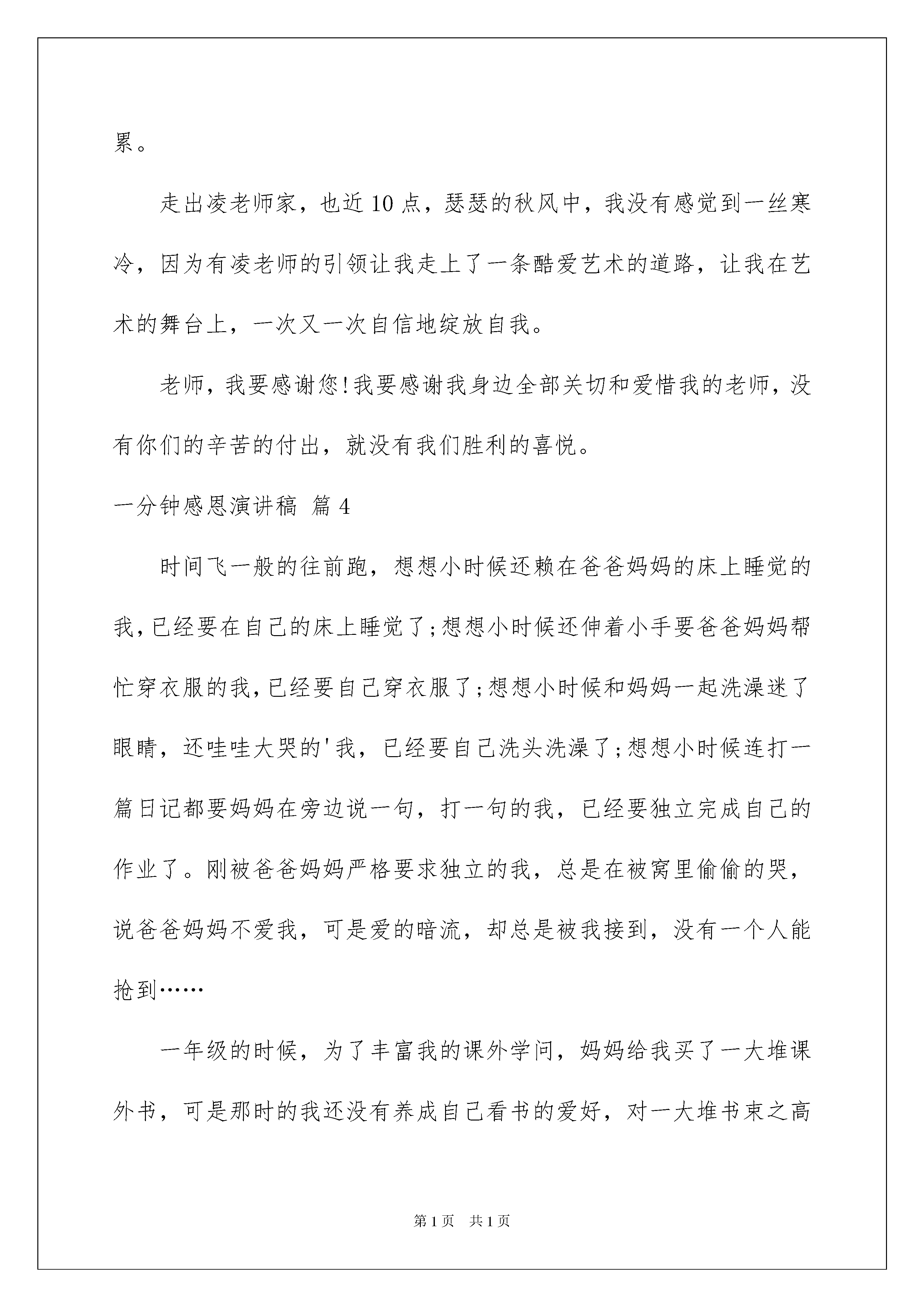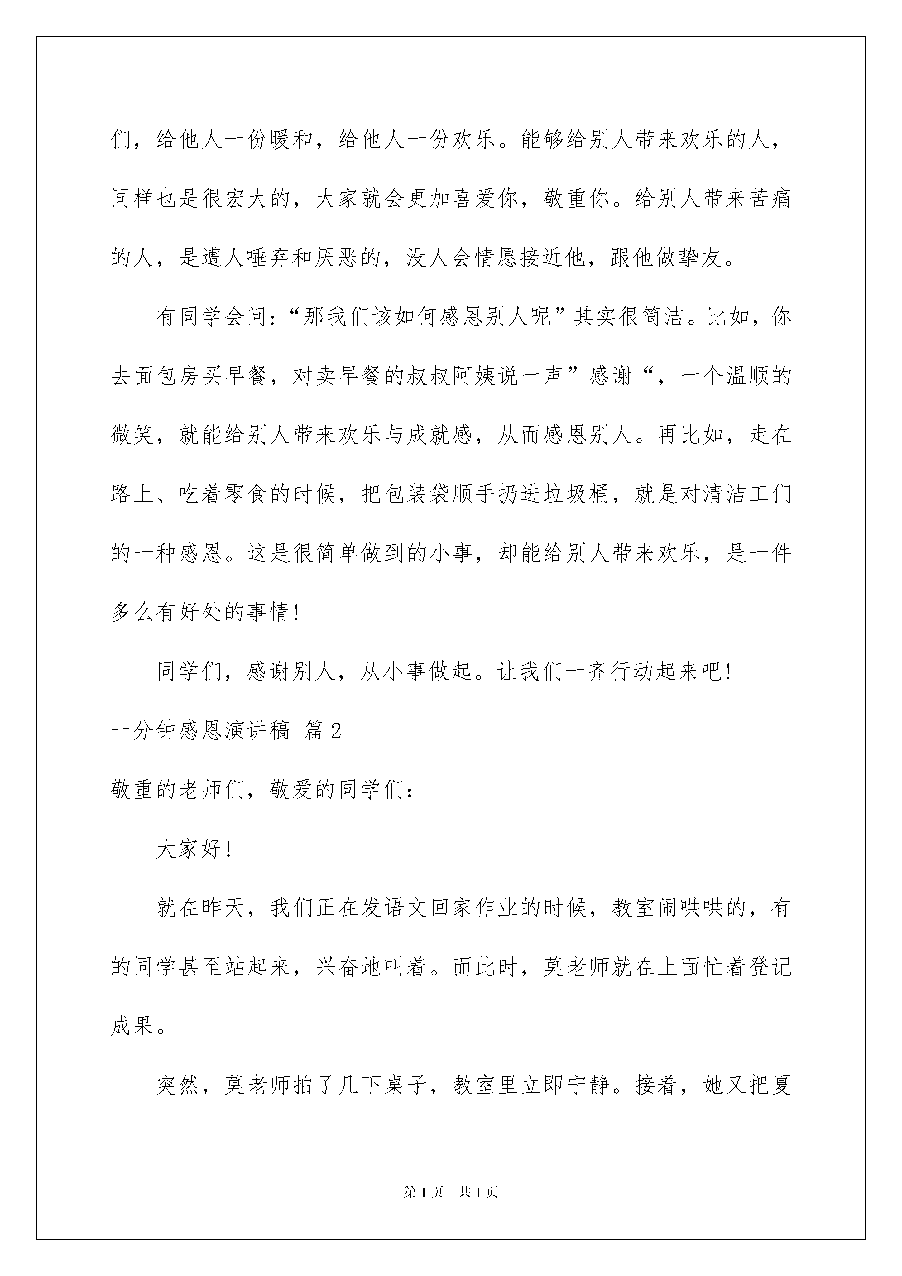 2022一分钟感恩演讲稿一分钟感恩演讲稿合集5篇演讲稿可以起到整理演讲者的思路、提示演讲的内容、限定演讲的速度的作用。在不断进步的时代,我们运用上演讲稿的状况与日俱增,那么,怎么去写演讲稿呢?下面是我为大家收集的一分钟感恩演讲稿5篇,仅供参考,大家一起来看看吧。一分钟感恩演讲稿篇1尊敬的老师,敬爱的同学们:大家好!同学们,当你走在干净整齐的道路上时,你是否会想起辛勤劳作的清洁工阿姨呢当你舒舒适服的坐在公共汽车里时,你会想到忙劳碌碌的司机叔叔吗当你在餐厅里享受美味的时候,你会想到正在厨房了汗流浃背的厨师叔叔吗他们正在为社会静默的做着贡献。这些看似很微乎其微的贡献,却是我们不行缺少的。我这天演讲的题目就是:学会感恩。感恩是人最朴实、最真诚的一种情感,也是一种高尚的价值观和人生观的体现。我们就应学会感恩,去感谢那些为社会做出贡献的人们,给他人一份暖和,给他人一份欢乐。能够给别人带来欢乐的人,同样也是很宏大的,大家就会更加喜爱你,敬重你。给别人带来苦痛的人,是遭人唾弃和厌恶的,没人会情愿接近他,跟他做挚友。有同学会问:“那我们该如何感恩别人呢”其实很简洁。比如,你去面包房买早餐,对卖早餐的叔叔阿姨说一声”感谢“,一个温顺的微笑,就能给别人带来欢乐与成就感,从而感恩别人。再比如,走在路上、吃着零食的时候,把包装袋顺手扔进垃圾桶,就是对清洁工们的一种感恩。这是很简单做到的小事,却能给别人带来欢乐,是一件多么有好处的事情!同学们,感谢别人,从小事做起。让我们一齐行动起来吧!一分钟感恩演讲稿篇2敬重的老师们,敬爱的同学们:大家好!就在昨天,我们正在发语文回家作业的时候,教室闹哄哄的,有的同学甚至站起来,兴奋地叫着。而此时,莫老师就在上面忙着登记成果。突然,莫老师拍了几下桌子,教室里立即宁静。接着,她又把夏天叫起来问:“你为什么那么兴奋?”夏天只好轻声地回答:“因为我们去过汤素兰的讲座,所以……”然后,莫老师举起手,清了清嗓子说:“刚才,我想喊你们宁静,可我今日去体检,医生说我咽喉炎,假如我再这样说下去就会成声带小结,要动手术!”教室里万籁俱寂。老师一脸肃穆,声音低沉下来,但语气比刚才更加剧烈:“虽然别人说你们很能干,发言很主动,有很多的优点。但是我知道,你们还有着很多的缺点。比如很浮躁……”教室里一片缄默。是呀,最近我们班同学好像过于沾沾自喜,尤其是公开课的胜利,好多同学都忘乎所以,得了几句表扬的话,以为都很了不得。假如刚才,我们听取老师的建议,在老师登记成果时,能看书或写作业,那么时间就不会白白奢侈。学习是须要一个宁静的环境的。小树成长,须要园丁修枝剪叶,才能更加强壮。而我们,也须要这样的老师规范我们,刚好指出我们身上的缺点,我们才能强壮地成长。一分钟感恩演讲稿篇3敬重的老师们,敬爱的同学们:大家好!大镜子里一大一小的两个身影在仔细地排练。下个月我们班的节目《读唐诗》合唱中,我是要跳一段舞蹈做点缀的,但是凌老师却有小宝宝,所以不能来上班,我们的节目怎么办呢?昨天,妈妈接到凌老师的电话,让我去她家,她亲自教我。凌老师和我一起坐在地上,只见凌老师渐渐地把手抬起,绕过头顶,向后延长、拉长。我跟着凌老师的动作,身体渐渐往后倾。当我的动作做得不到位时,凌老师站起来,拉着我的小手,一个动作一个动作地教我。镜子里,我看到凌老师乏累的样子,心里真难受:我怎么就这么笨呢?我怎么做起来不美呢?要让凌老师这么辛苦。我随着音乐舞动时,凌老师微皱眉头,手捧着肚子,坐到了墙角的椅子上。我看得出神了,竟忘了后面的动作,凌老师轻轻地说:“专注点,小家伙!”我不好意思地吐吐舌头,说:“知道了。”凌老师又说:“你们班这些小家伙就是不让我省心,不知道节目打算得怎么样。”我心想:凌老师真仔细啊,人在家里心却在学校里。还记得每次暑假,凌老师总是把我们合唱团的主力队员叫到学校,给我们辅导声乐。没有空调的音乐教室中,我们汗流浃背,但是看着凌老师仔细的模样,我们谁都不叫苦叫累。走出凌老师家,也近10点,瑟瑟的秋风中,我没有感觉到一丝寒冷,因为有凌老师的引领让我走上了一条酷爱艺术的道路,让我在艺术的舞台上,一次又一次自信地绽放自我。老师,我要感谢您!我要感谢我身边全部关切和爱惜我的老师,没有你们的辛苦的付出,就没有我们胜利的喜悦。一分钟感恩演讲稿篇4时间飞一般的往前跑,想想小时候还赖在爸爸妈妈的床上睡觉的我,已经要在自己的床上睡觉了;想想小时候还伸着小手要爸爸妈妈帮忙穿衣服的我,已经要自己穿衣服了;想想小时候和妈妈一起洗澡迷了眼睛,还哇哇大哭的'我,已经要自己洗头洗澡了;想想小时候连打一篇日记都要妈妈在旁边说一句,打一句的我,已经要独