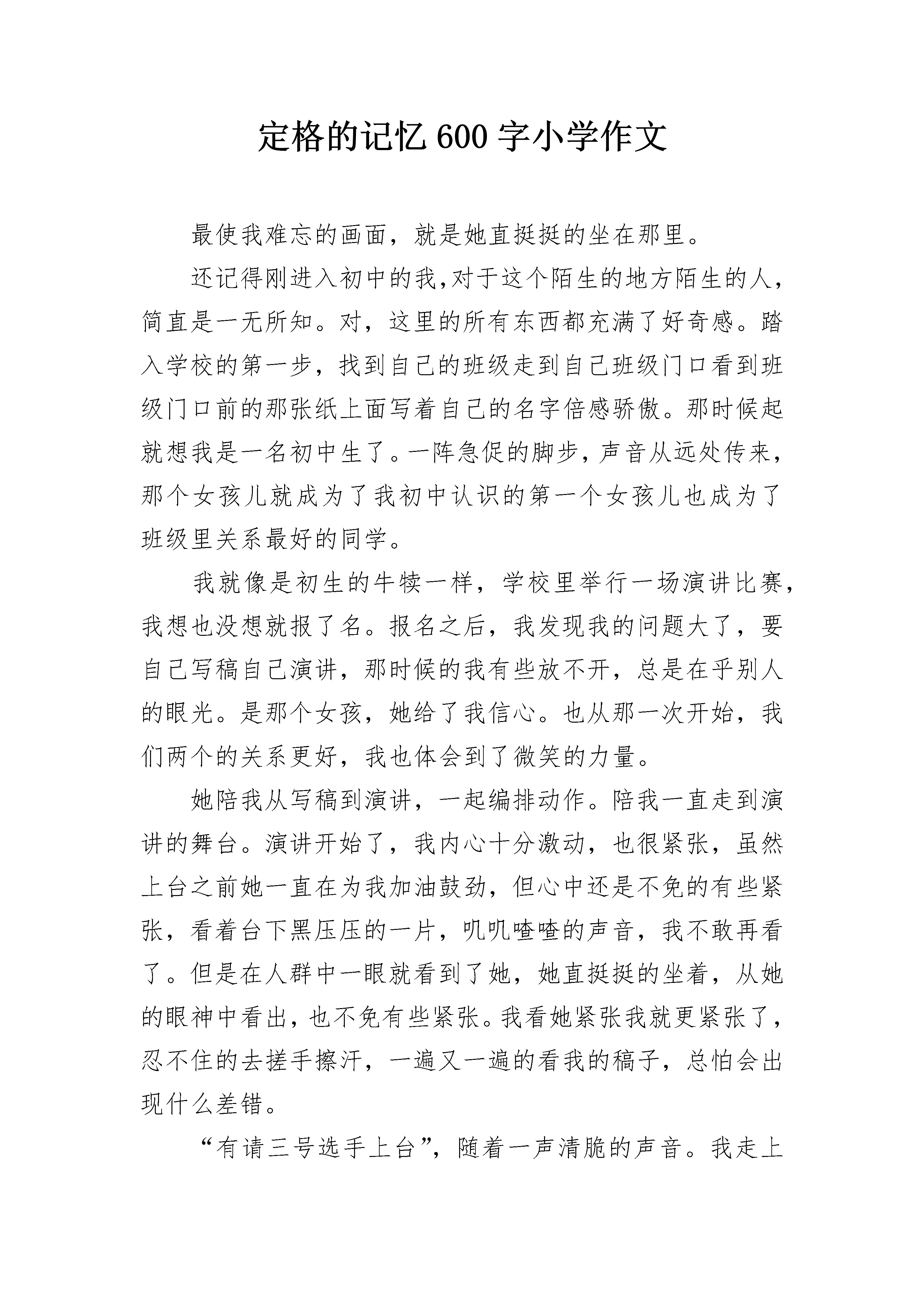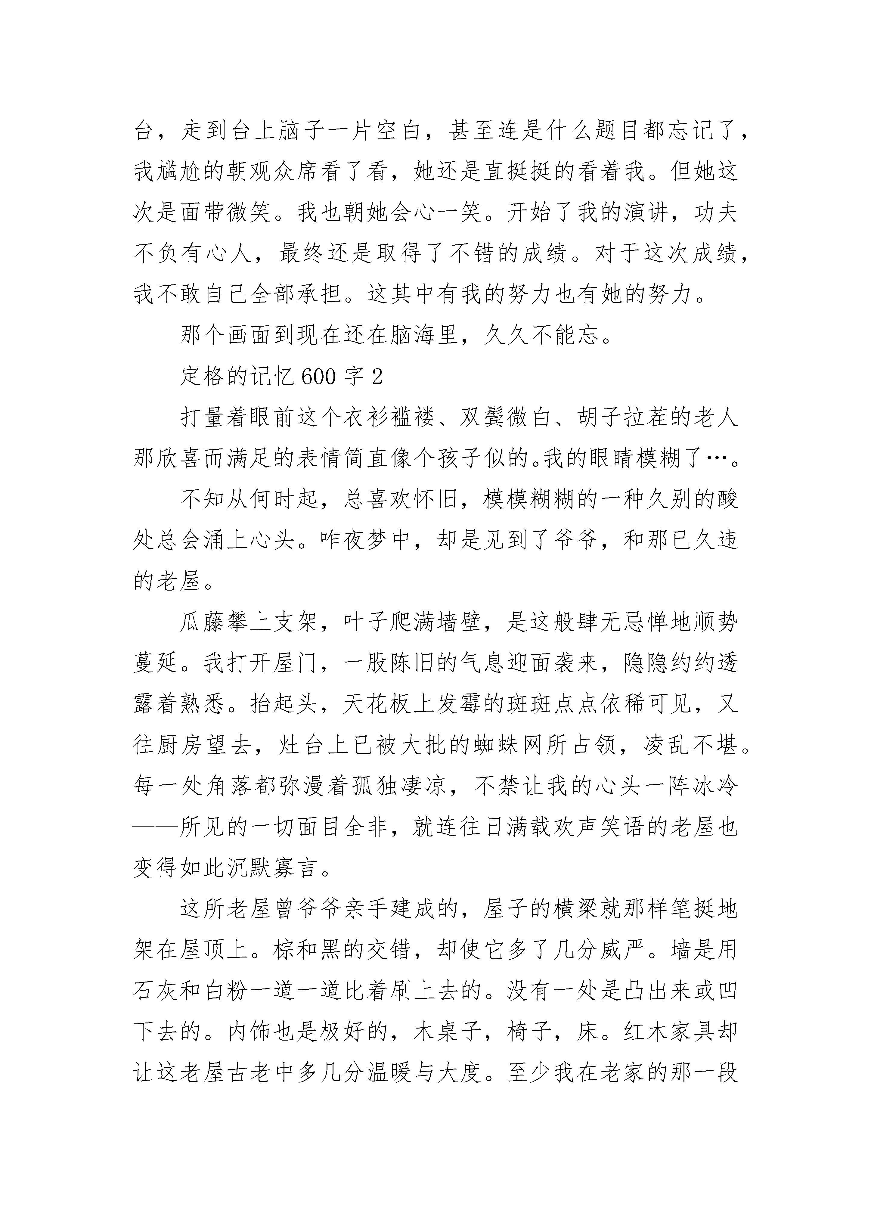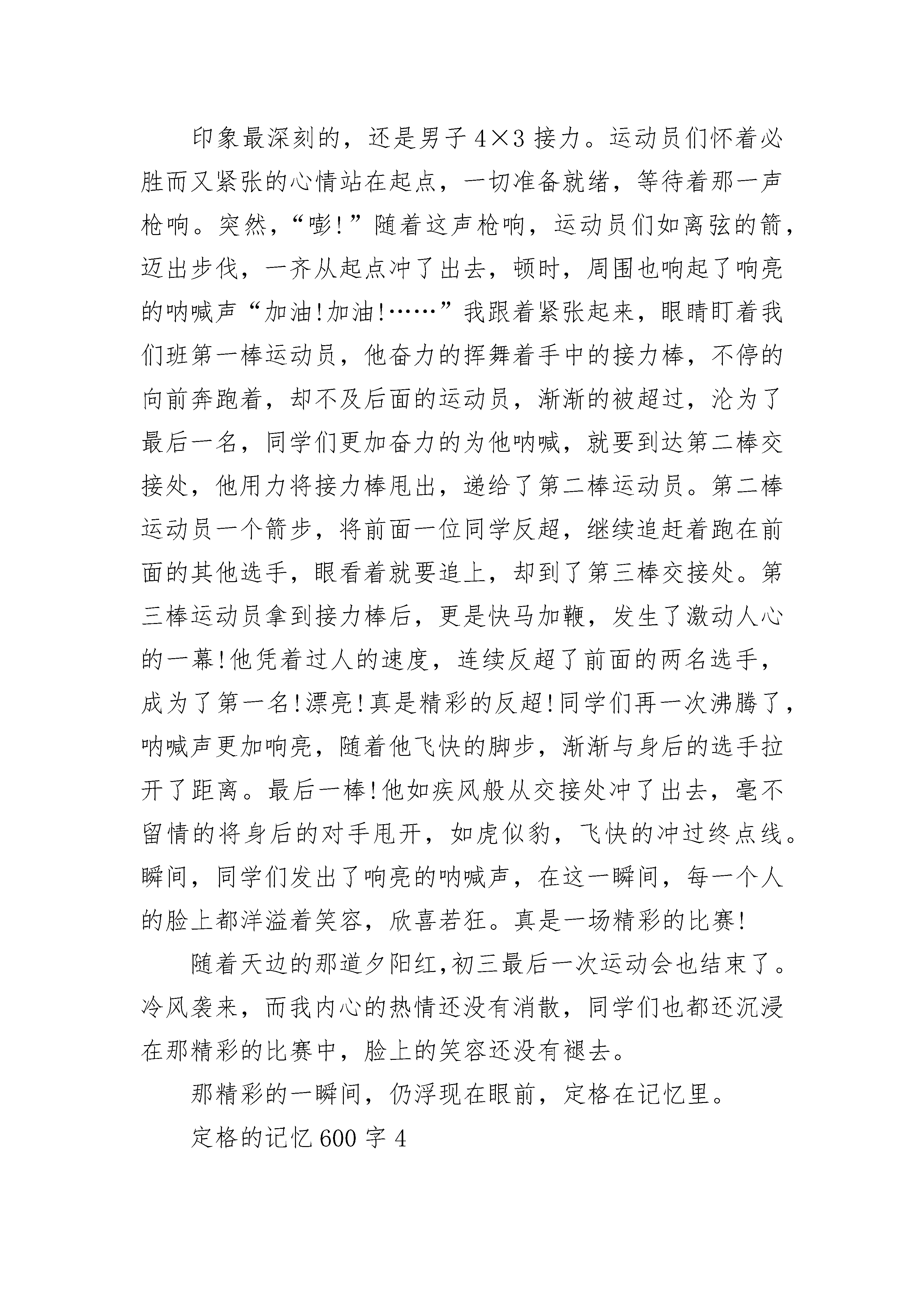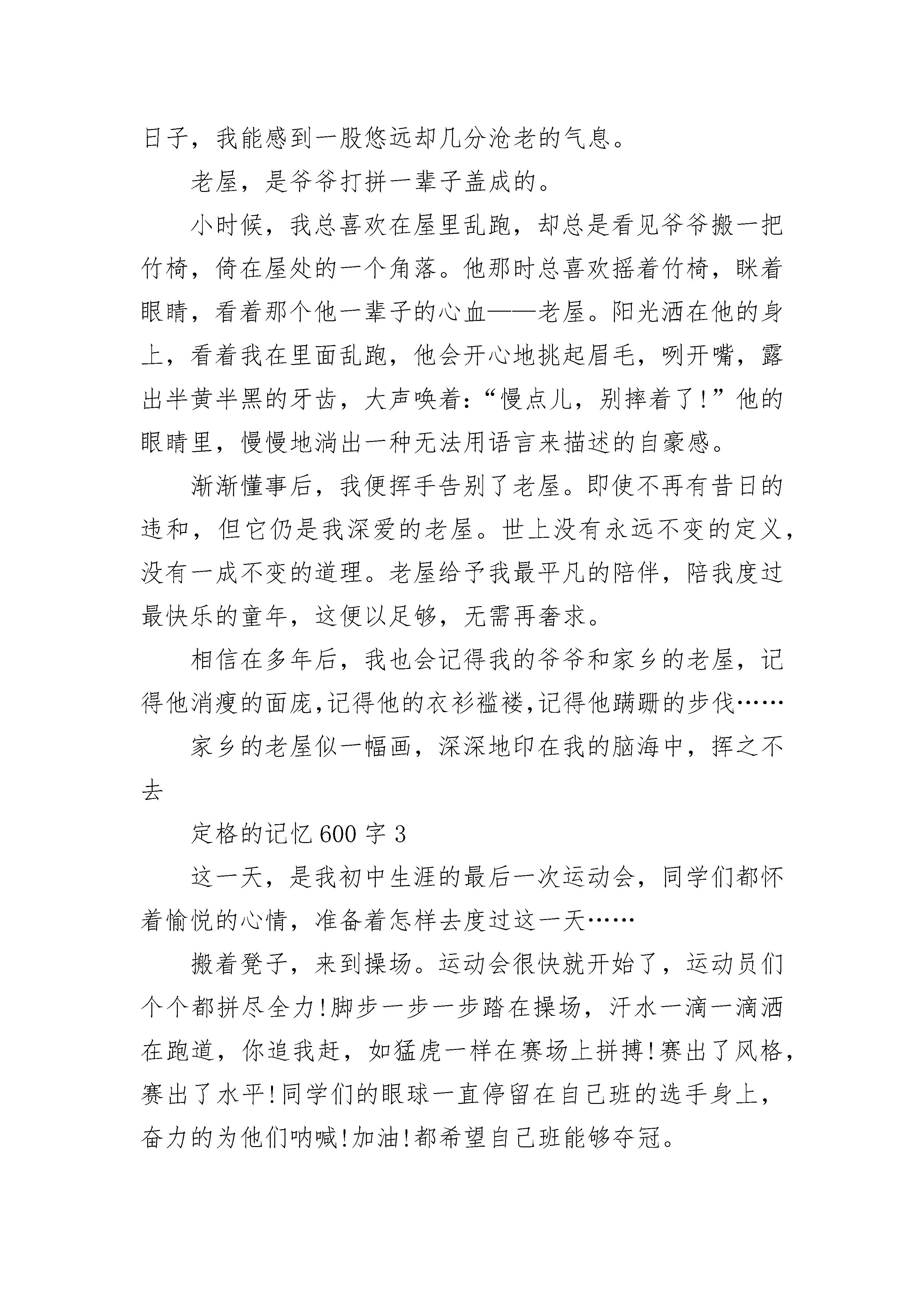 定格的记忆600字小学作文最使我难忘的画面,就是她直挺挺的坐在那里。还记得刚进入初中的我,对于这个陌生的地方陌生的人,简直是一无所知。对,这里的所有东西都充满了好奇感。踏入学校的第一步,找到自己的班级走到自己班级门口看到班级门口前的那张纸上面写着自己的名字倍感骄傲。那时候起就想我是一名初中生了。一阵急促的脚步,声音从远处传来,那个女孩儿就成为了我初中认识的第一个女孩儿也成为了班级里关系最好的同学。我就像是初生的牛犊一样,学校里举行一场演讲比赛,我想也没想就报了名。报名之后,我发现我的问题大了,要自己写稿自己演讲,那时候的我有些放不开,总是在乎别人的眼光。是那个女孩,她给了我信心。也从那一次开始,我们两个的关系更好,我也体会到了微笑的力量。她陪我从写稿到演讲,一起编排动作。陪我一直走到演讲的舞台。演讲开始了,我内心十分激动,也很紧张,虽然上台之前她一直在为我加油鼓劲,但心中还是不免的有些紧张,看着台下黑压压的一片,叽叽喳喳的声音,我不敢再看了。但是在人群中一眼就看到了她,她直挺挺的坐着,从她的眼神中看出,也不免有些紧张。我看她紧张我就更紧张了,忍不住的去搓手擦汗,一遍又一遍的看我的稿子,总怕会出现什么差错。“有请三号选手上台”,随着一声清脆的声音。我走上台,走到台上脑子一片空白,甚至连是什么题目都忘记了,我尴尬的朝观众席看了看,她还是直挺挺的看着我。但她这次是面带微笑。我也朝她会心一笑。开始了我的演讲,功夫不负有心人,最终还是取得了不错的成绩。对于这次成绩,我不敢自己全部承担。这其中有我的努力也有她的努力。那个画面到现在还在脑海里,久久不能忘。定格的记忆600字2打量着眼前这个衣衫褴褛、双鬓微白、胡子拉茬的老人那欣喜而满足的表情简直像个孩子似的。我的眼睛模糊了…。不知从何时起,总喜欢怀旧,模模糊糊的一种久别的酸处总会涌上心头。咋夜梦中,却是见到了爷爷,和那已久违的老屋。瓜藤攀上支架,叶子爬满墙壁,是这般肆无忌惮地顺势蔓延。我打开屋门,一股陈旧的气息迎面袭来,隐隐约约透露着熟悉。抬起头,天花板上发霉的斑斑点点依稀可见,又往厨房望去,灶台上已被大批的蜘蛛网所占领,凌乱不堪。每一处角落都弥漫着孤独凄凉,不禁让我的心头一阵冰冷——所见的一切面目全非,就连往日满载欢声笑语的老屋也变得如此沉默寡言。这所老屋曾爷爷亲手建成的,屋子的横梁就那样笔挺地架在屋顶上。棕和黑的交错,却使它多了几分威严。墙是用石灰和白粉一道一道比着刷上去的。没有一处是凸出来或凹下去的。内饰也是极好的,木桌子,椅子,床。红木家具却让这老屋古老中多几分温暖与大度。至少我在老家的那一段日子,我能感到一股悠远却几分沧老的气息。老屋,是爷爷打拼一辈子盖成的。小时候,我总喜欢在屋里乱跑,却总是看见爷爷搬一把竹椅,倚在屋处的一个角落。他那时总喜欢摇着竹椅,眯着眼睛,看着那个他一辈子的心血——老屋。阳光洒在他的身上,看着我在里面乱跑,他会开心地挑起眉毛,咧开嘴,露出半黄半黑的牙齿,大声唤着:“慢点儿,别摔着了!”他的眼睛里,慢慢地淌出一种无法用语言来描述的自豪感。渐渐懂事后,我便挥手告别了老屋。即使不再有昔日的违和,但它仍是我深爱的老屋。世上没有永远不变的定义,没有一成不变的道理。老屋给予我最平凡的陪伴,陪我度过最快乐的童年,这便以足够,无需再奢求。相信在多年后,我也会记得我的爷爷和家乡的老屋,记得他消瘦的面庞,记得他的衣衫褴褛,记得他蹒跚的步伐……家乡的老屋似一幅画,深深地印在我的脑海中,挥之不去定格的记忆600字3这一天,是我初中生涯的最后一次运动会,同学们都怀着愉悦的心情,准备着怎样去度过这一天……搬着凳子,来到操场。运动会很快就开始了,运动员们个个都拼尽全力!脚步一步一步踏在操场,汗水一滴一滴洒在跑道,你追我赶,如猛虎一样在赛场上拼搏!赛出了风格,赛出了水平!同学们的眼球一直停留在自己班的选手身上,奋力的为他们呐喊!加油!都希望自己班能够夺冠。印象最深刻的,还是男子4×3接力。运动员们怀着必胜而又紧张的心情站在起点,一切准备就绪,等待着那一声枪响。突然,“嘭!”随着这声枪响,运动员们如离弦的箭,迈出步伐,一齐从起点冲了出去,顿时,周围也响起了响亮的呐喊声“加油!加油!……”我跟着紧张起来,眼睛盯着我们班第一棒运动员,他奋力的挥舞着手中的接力棒,不停的向前奔跑着,却不及后面的运动员,渐渐的被超过,沦为了最后一名,同学们更加奋力的为他呐喊,就要到达第二棒交接处,他用力将接力棒甩出,递给了第二棒运动员。第二棒运动员一个箭步,将前面一位同学反超,继续追赶着跑在前面的其他选手,眼看着就要追上,却到了第三棒交接处。第三棒运动员拿到接力棒后,更是快马加鞭,发生了激动人心的一幕!他凭着过人的速度,连续反超了前面的两名选手,成为了第一名!漂亮!真是精彩的反超!同学们再一次沸腾了,呐喊声更加响