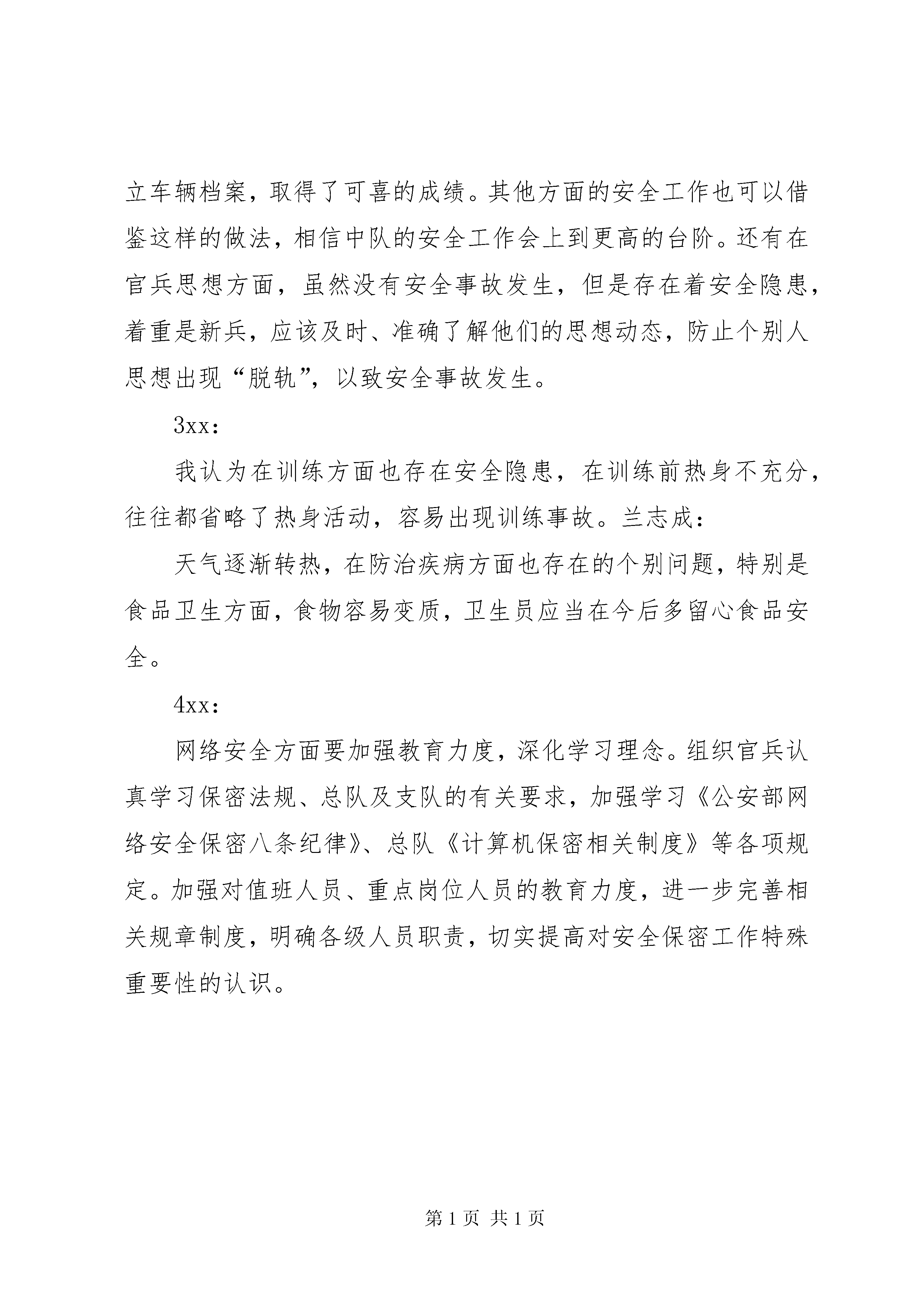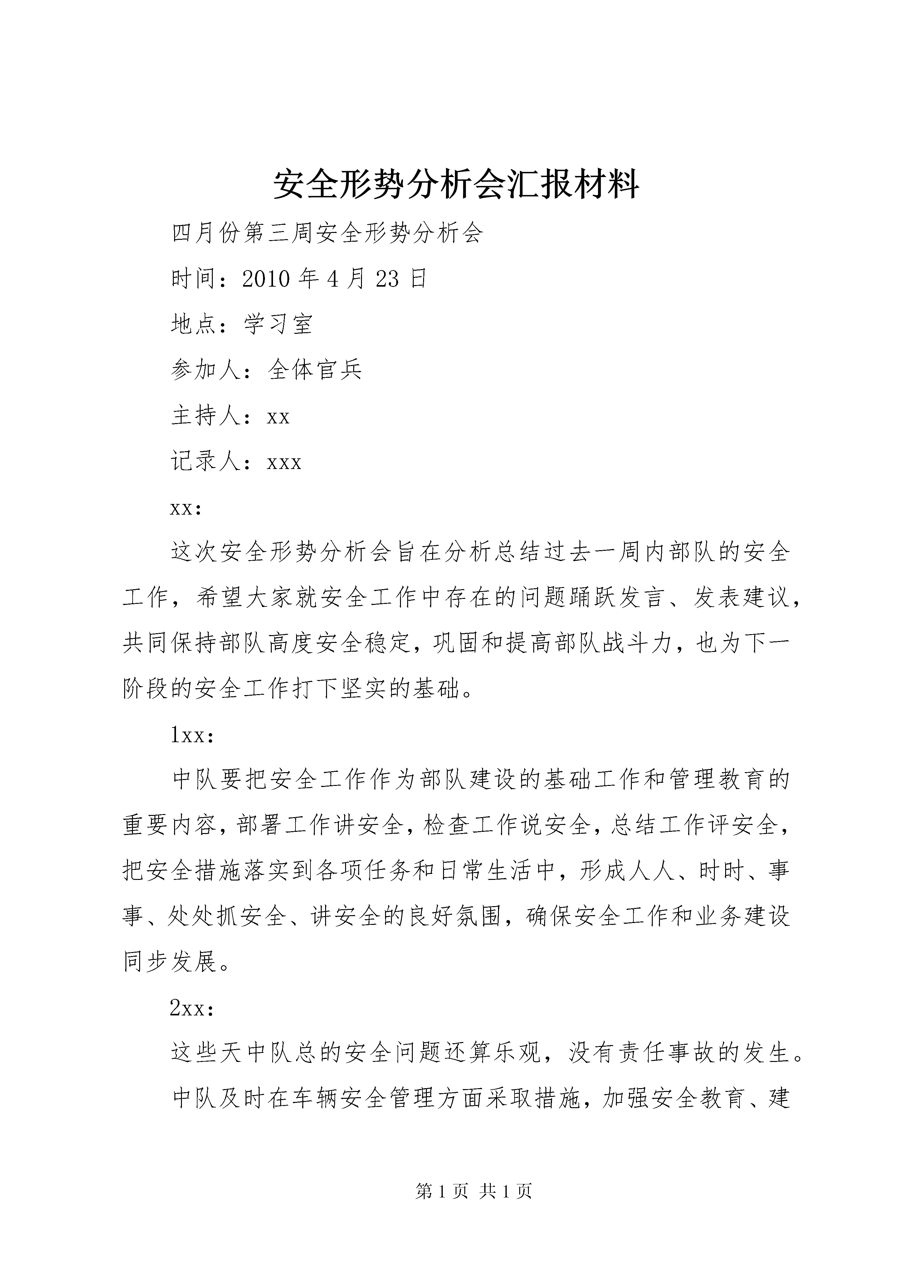安全形势分析会汇报材料四月份第三周安全形势分析会时间:2010年4月23日地点:学习室参加人:全体官兵主持人:xx记录人:xxxxx:这次安全形势分析会旨在分析总结过去一周内部队的安全工作,希望大家就安全工作中存在的问题踊跃发言、发表建议,共同保持部队高度安全稳定,巩固和提高部队战斗力,也为下一阶段的安全工作打下坚实的基础。1xx:中队要把安全工作作为部队建设的基础工作和管理教育的重要内容,部署工作讲安全,检查工作说安全,总结工作评安全,把安全措施落实到各项任务和日常生活中,形成人人、时时、事事、处处抓安全、讲安全的良好氛围,确保安全工作和业务建设同步发展。2xx:这些天中队总的安全问题还算乐观,没有责任事故的发生。中队及时在车辆安全管理方面采取措施,加强安全教育、建立车辆档案,取得了可喜的成绩。其他方面的安全工作也可以借鉴这样的做法,相信中队的安全工作会上到更高的台阶。还有在官兵思想方面,虽然没有安全事故发生,但是存在着安全隐患,着重是新兵,应该及时、准确了解他们的思想动态,防止个别人思想出现“脱轨”,以致安全事故发生。3xx:我认为在训练方面也存在安全隐患,在训练前热身不充分,往往都省略了热身活动,容易出现训练事故。兰志成:天气逐渐转热,在防治疾病方面也存在的个别问题,特别是食品卫生方面,食物容易变质,卫生员应当在今后多留心食品安全。4xx:网络安全方面要加强教育力度,深化学习理念。组织官兵认真学习保密法规、总队及支队的有关要求,加强学习《公安部网络安全保密八条纪律》、总队《计算机保密相关制度》等各项规定。加强对值班人员、重点岗位人员的教育力度,进一步完善相关规章制度,明确各级人员职责,切实提高对安全保密工作特殊重要性的认识。