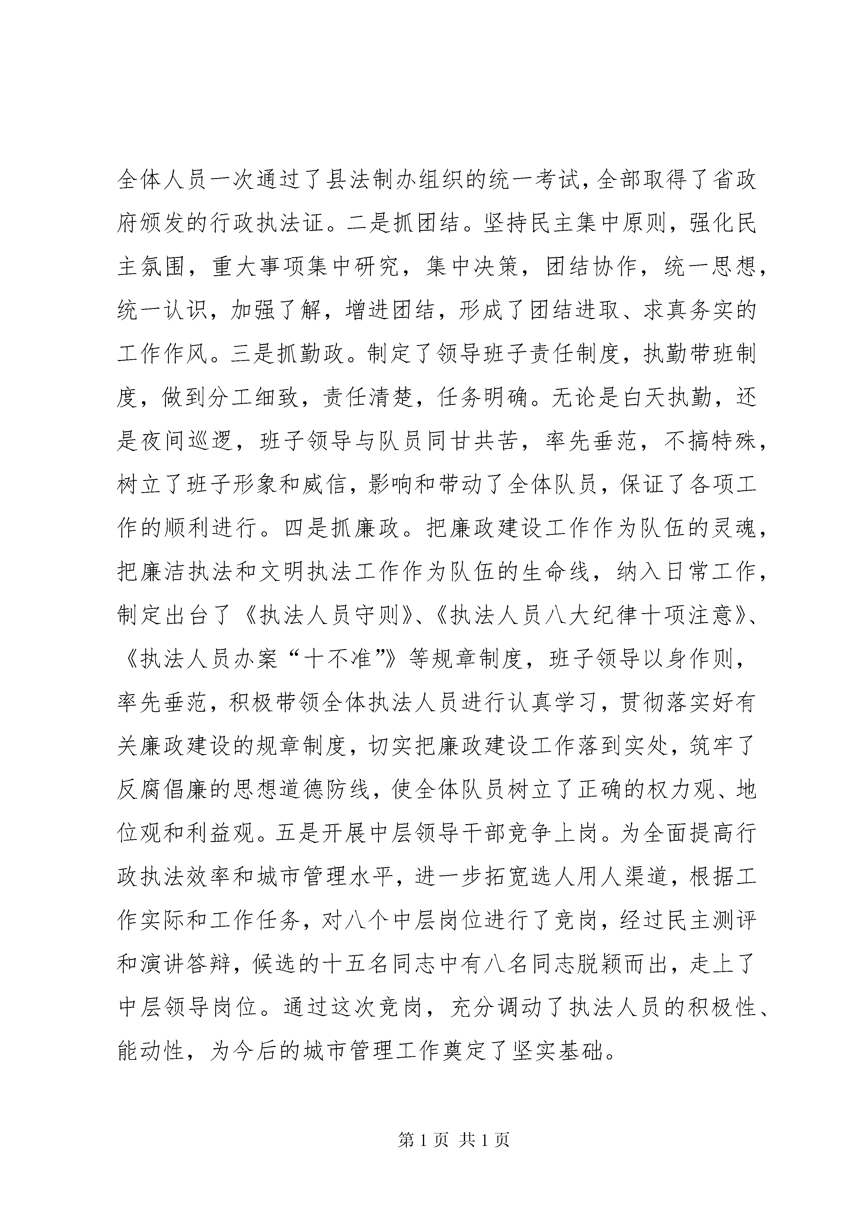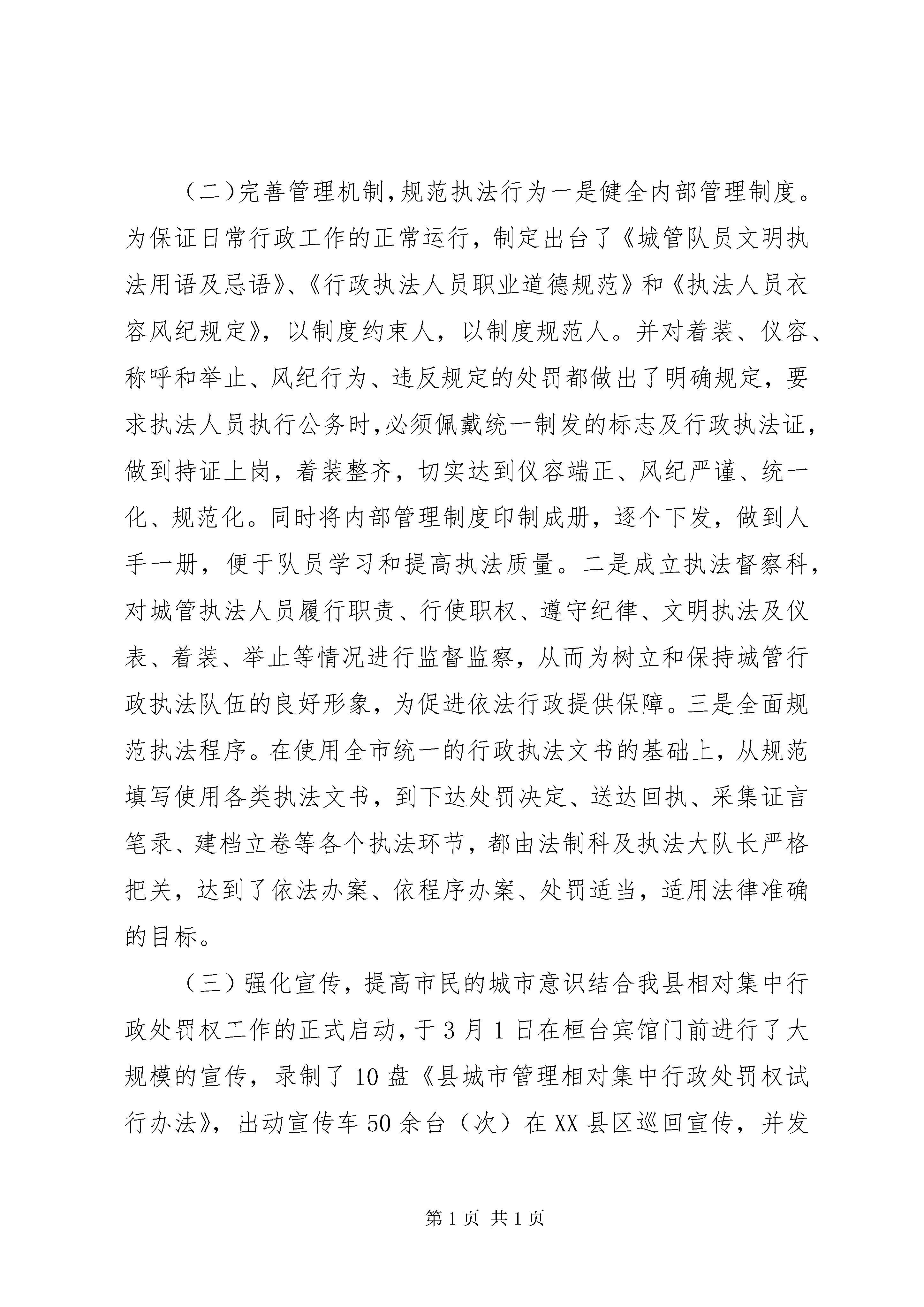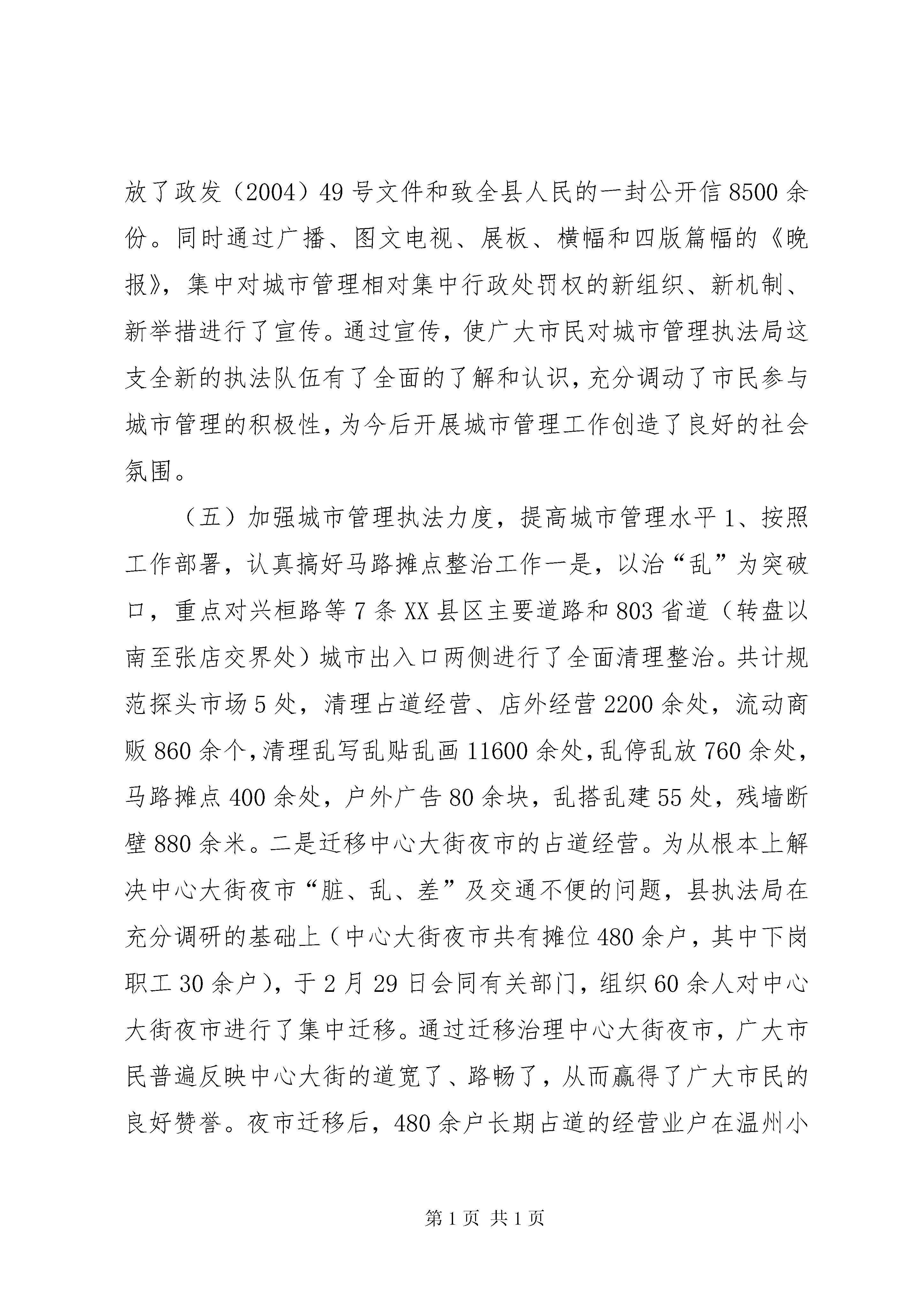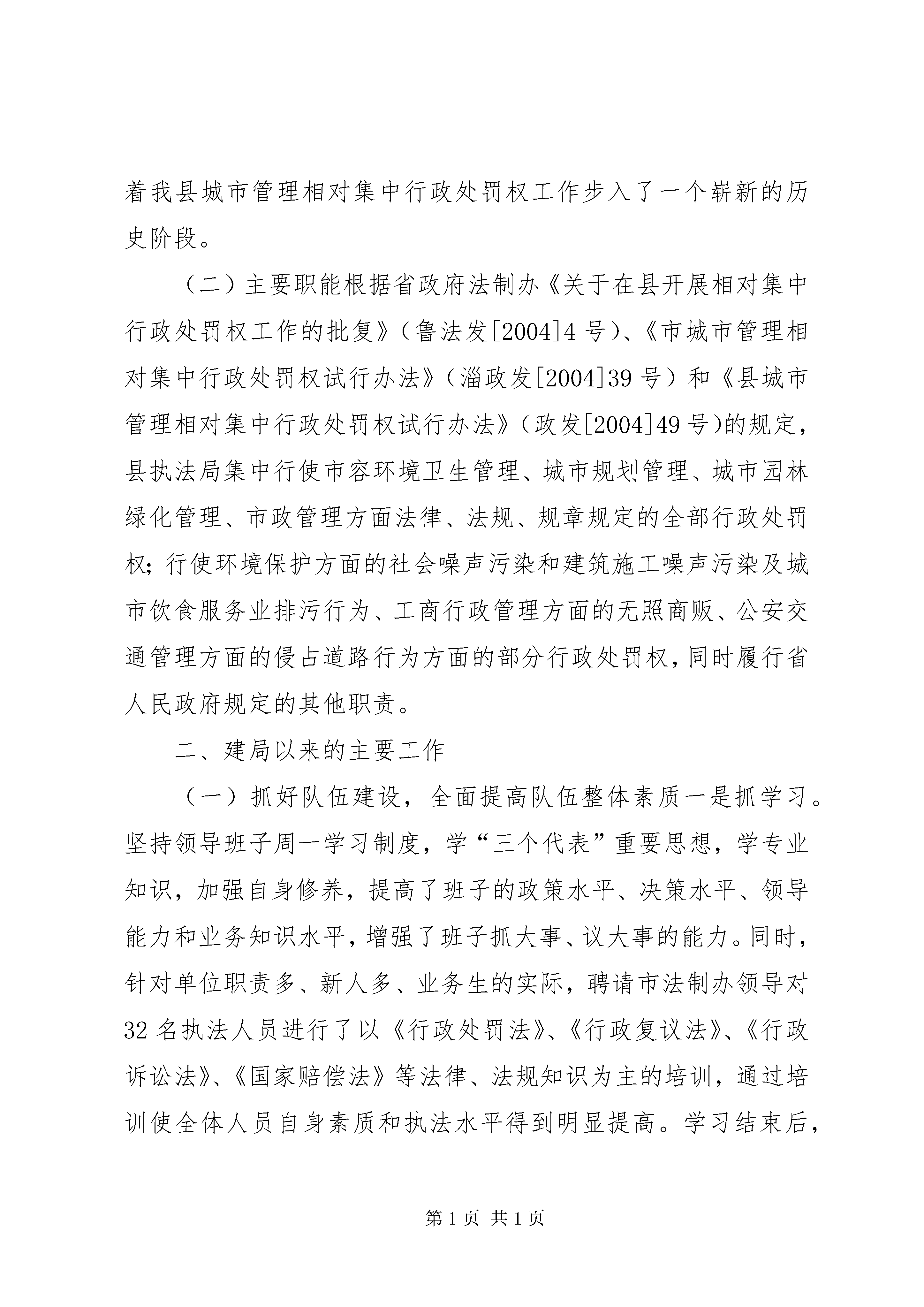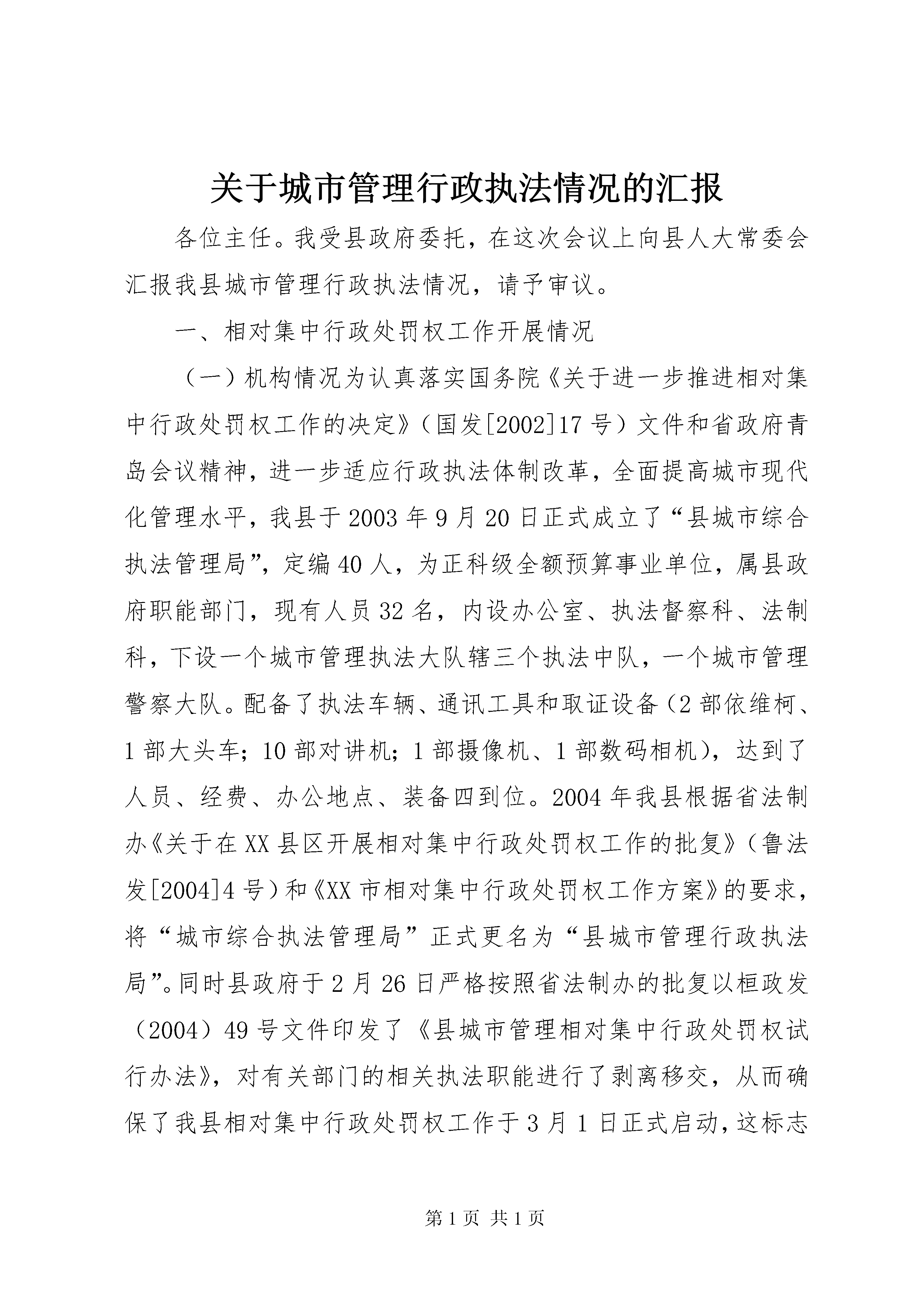 关于城市管理行政执法情况的汇报各位主任。我受县政府委托,在这次会议上向县人大常委会汇报我县城市管理行政执法情况,请予审议。一、相对集中行政处罚权工作开展情况(一)机构情况为认真落实国务院《关于进一步推进相对集中行政处罚权工作的决定》(国发[2002]17号)文件和省政府青岛会议精神,进一步适应行政执法体制改革,全面提高城市现代化管理水平,我县于2003年9月20日正式成立了“县城市综合执法管理局”,定编40人,为正科级全额预算事业单位,属县政府职能部门,现有人员32名,内设办公室、执法督察科、法制科,下设一个城市管理执法大队辖三个执法中队,一个城市管理警察大队。配备了执法车辆、通讯工具和取证设备(2部依维柯、1部大头车;10部对讲机;1部摄像机、1部数码相机),达到了人员、经费、办公地点、装备四到位。2004年我县根据省法制办《关于在XX县区开展相对集中行政处罚权工作的批复》(鲁法发[2004]4号)和《XX市相对集中行政处罚权工作方案》的要求,将“城市综合执法管理局”正式更名为“县城市管理行政执法局”。同时县政府于2月26日严格按照省法制办的批复以桓政发(2004)49号文件印发了《县城市管理相对集中行政处罚权试行办法》,对有关部门的相关执法职能进行了剥离移交,从而确保了我县相对集中行政处罚权工作于3月1日正式启动,这标志着我县城市管理相对集中行政处罚权工作步入了一个崭新的历史阶段。(二)主要职能根据省政府法制办《关于在县开展相对集中行政处罚权工作的批复》(鲁法发[2004]4号)、《市城市管理相对集中行政处罚权试行办法》(淄政发[2004]39号)和《县城市管理相对集中行政处罚权试行办法》(政发[2004]49号)的规定,县执法局集中行使市容环境卫生管理、城市规划管理、城市园林绿化管理、市政管理方面法律、法规、规章规定的全部行政处罚权;行使环境保护方面的社会噪声污染和建筑施工噪声污染及城市饮食服务业排污行为、工商行政管理方面的无照商贩、公安交通管理方面的侵占道路行为方面的部分行政处罚权,同时履行省人民政府规定的其他职责。二、建局以来的主要工作(一)抓好队伍建设,全面提高队伍整体素质一是抓学习。坚持领导班子周一学习制度,学“三个代表”重要思想,学专业知识,加强自身修养,提高了班子的政策水平、决策水平、领导能力和业务知识水平,增强了班子抓大事、议大事的能力。同时,针对单位职责多、新人多、业务生的实际,聘请市法制办领导对32名执法人员进行了以《行政处罚法》、《行政复议法》、《行政诉讼法》、《国家赔偿法》等法律、法规知识为主的培训,通过培训使全体人员自身素质和执法水平得到明显提高。学习结束后,全体人员一次通过了县法制办组织的统一考试,全部取得了省政府颁发的行政执法证。二是抓团结。坚持民主集中原则,强化民主氛围,重大事项集中研究,集中决策,团结协作,统一思想,统一认识,加强了解,增进团结,形成了团结进取、求真务实的工作作风。三是抓勤政。制定了领导班子责任制度,执勤带班制度,做到分工细致,责任清楚,任务明确。无论是白天执勤,还是夜间巡逻,班子领导与队员同甘共苦,率先垂范,不搞特殊,树立了班子形象和威信,影响和带动了全体队员,保证了各项工作的顺利进行。四是抓廉政。把廉政建设工作作为队伍的灵魂,把廉洁执法和文明执法工作作为队伍的生命线,纳入日常工作,制定出台了《执法人员守则》、《执法人员八大纪律十项注意》、《执法人员办案“十不准”》等规章制度,班子领导以身作则,率先垂范,积极带领全体执法人员进行认真学习,贯彻落实好有关廉政建设的规章制度,切实把廉政建设工作落到实处,筑牢了反腐倡廉的思想道德防线,使全体队员树立了正确的权力观、地位观和利益观。五是开展中层领导干部竞争上岗。为全面提高行政执法效率和城市管理水平,进一步拓宽选人用人渠道,根据工作实际和工作任务,对八个中层岗位进行了竞岗,经过民主测评和演讲答辩,候选的十五名同志中有八名同志脱颖而出,走上了中层领导岗位。通过这次竞岗,充分调动了执法人员的积极性、能动性,为今后的城市管理工作奠定了坚实基础。(二)完善管理机制,规范执法行为一是健全内部管理制度。为保证日常行政工作的正常运行,制定出台了《城管队员文明执法用语及忌语》、《行政执法人员职业道德规范》和《执法人员衣容风纪规定》,以制度约束人,以制度规范人。并对着装、仪容、称呼和举止、风纪行为、违反规定的处罚都做出了明确规定,要求执法人员执行公务时,必须佩戴统一制发的标志及行政执法证,做到持证上岗,着装整齐,切实达到仪容端正、风纪严谨、统一化、规范化。同时将内部管理制度印制成册,逐个下发,做到人手一册,便于队员学习和提高执法质量。二是成立执法督察科,对城管执法人员履行职责、行使职权、遵守纪律、文明执法及仪表、着装、举止等