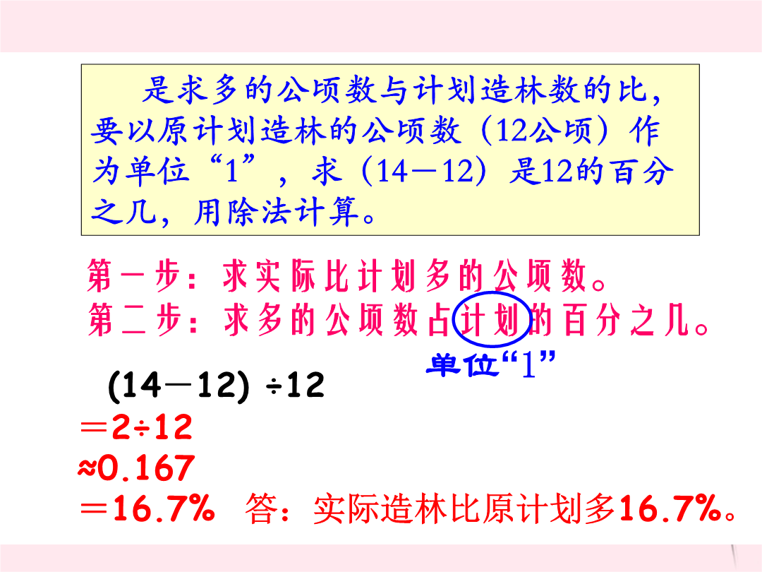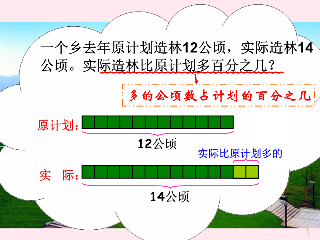 百分数的应用(二)植树造林造福后代一个乡去年原计划造林12公顷,实际造林14公顷。实际造林比原计划多百分之几?有一堆煤,第一次用去总数的,第二次用去总数的30%,哪次用去的多?多用了总数的百分之几?