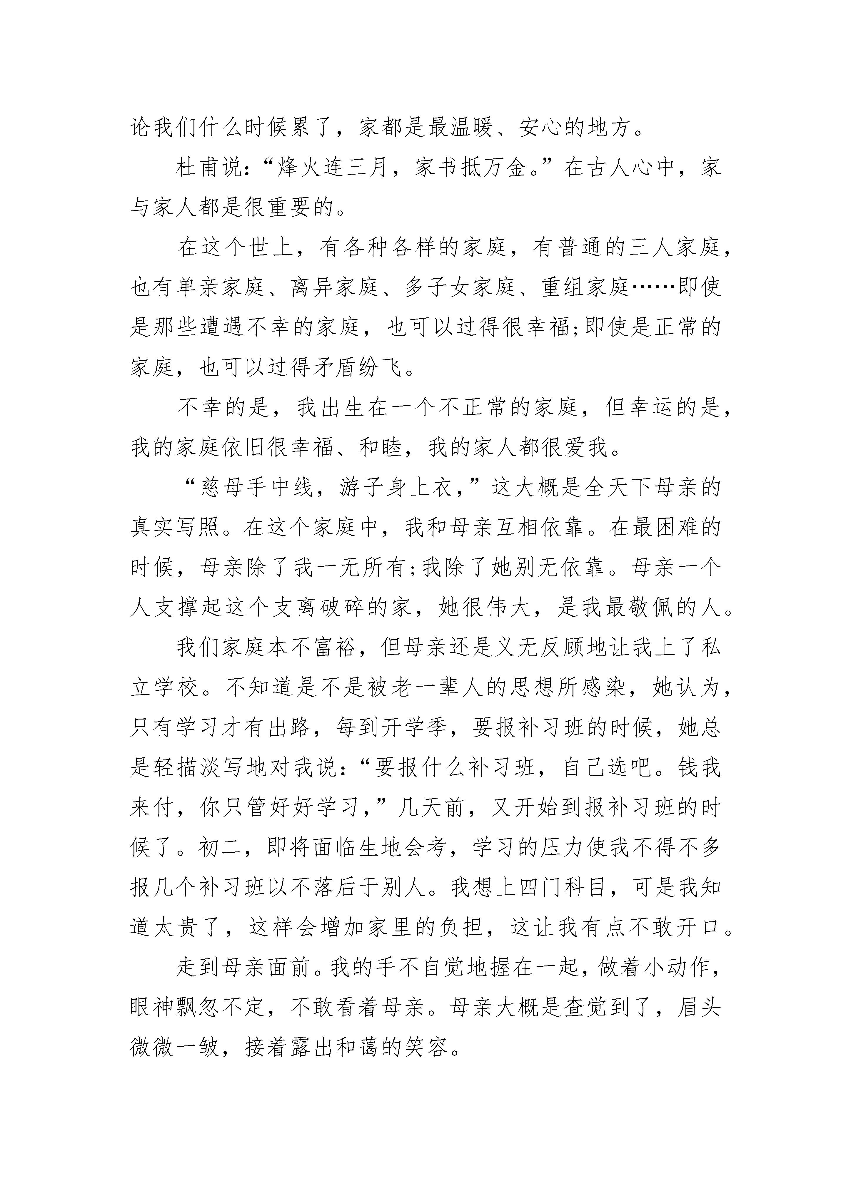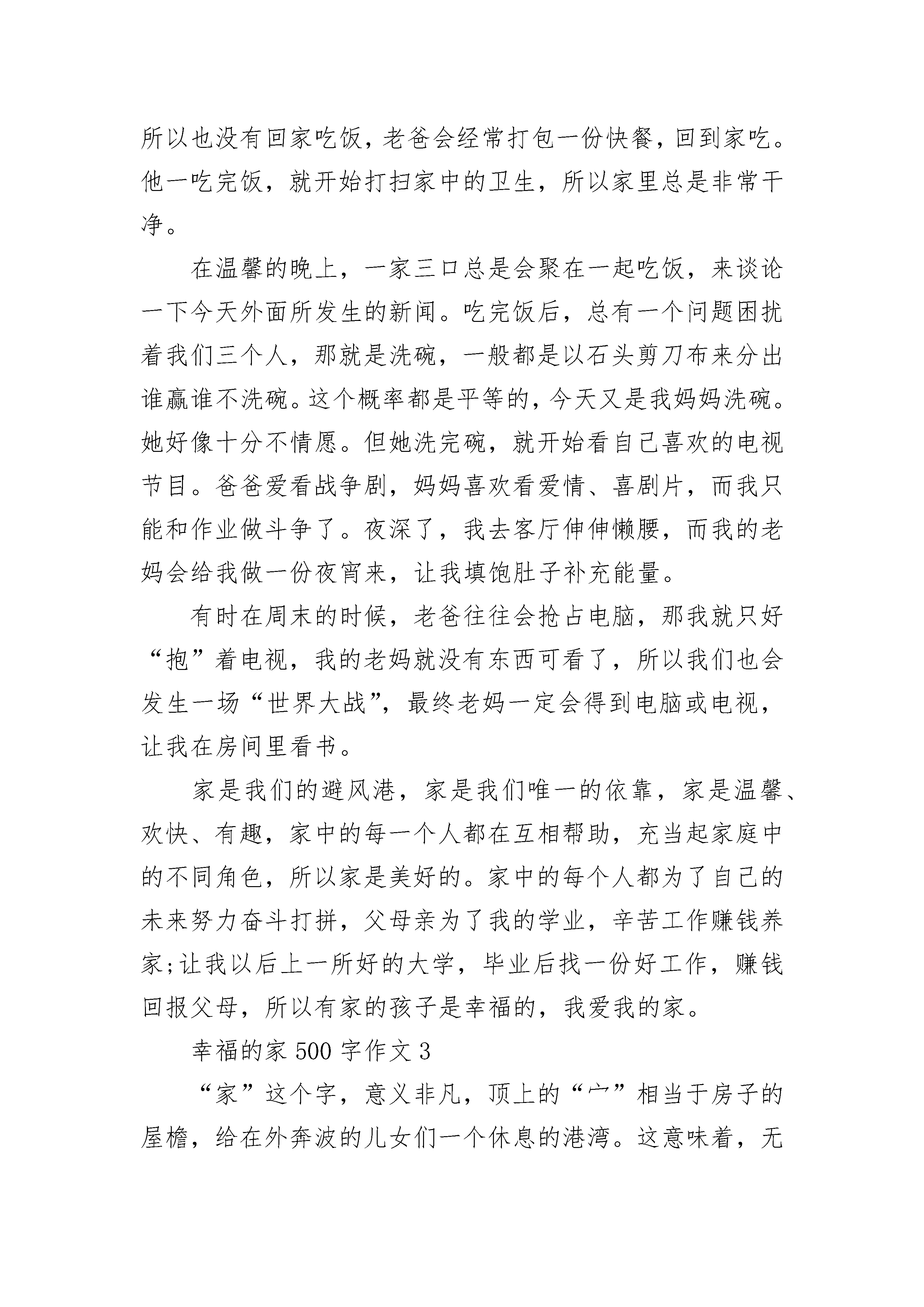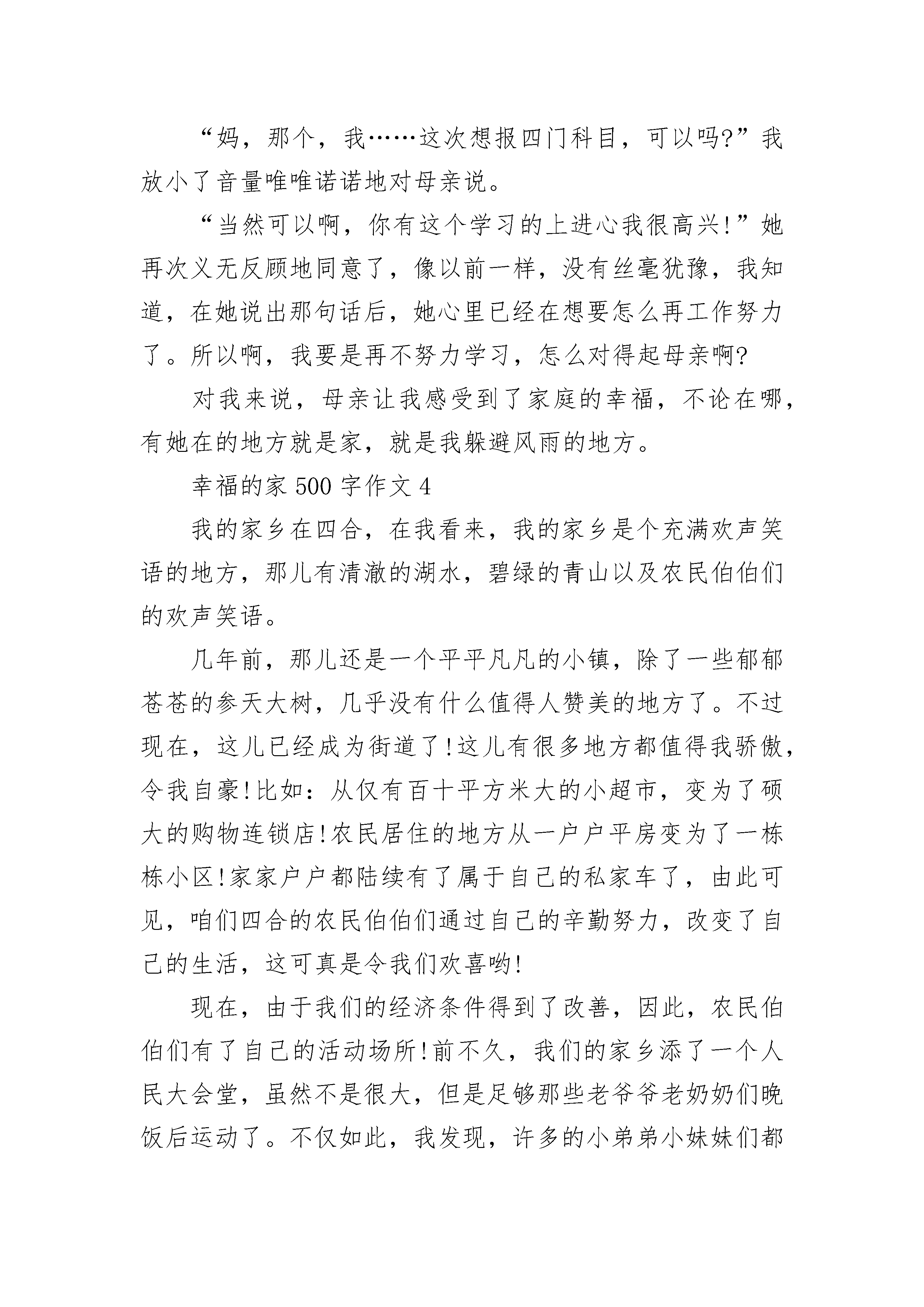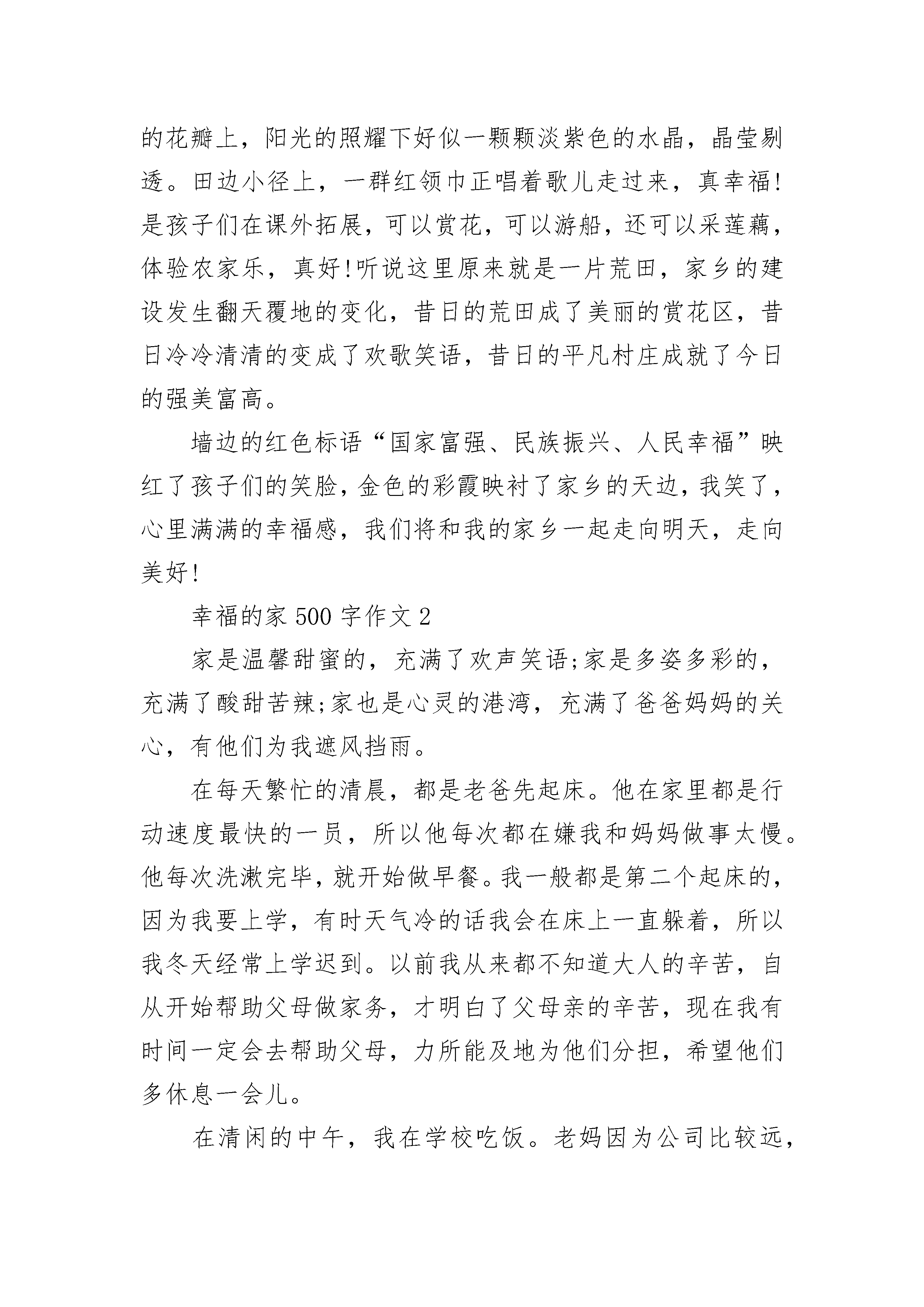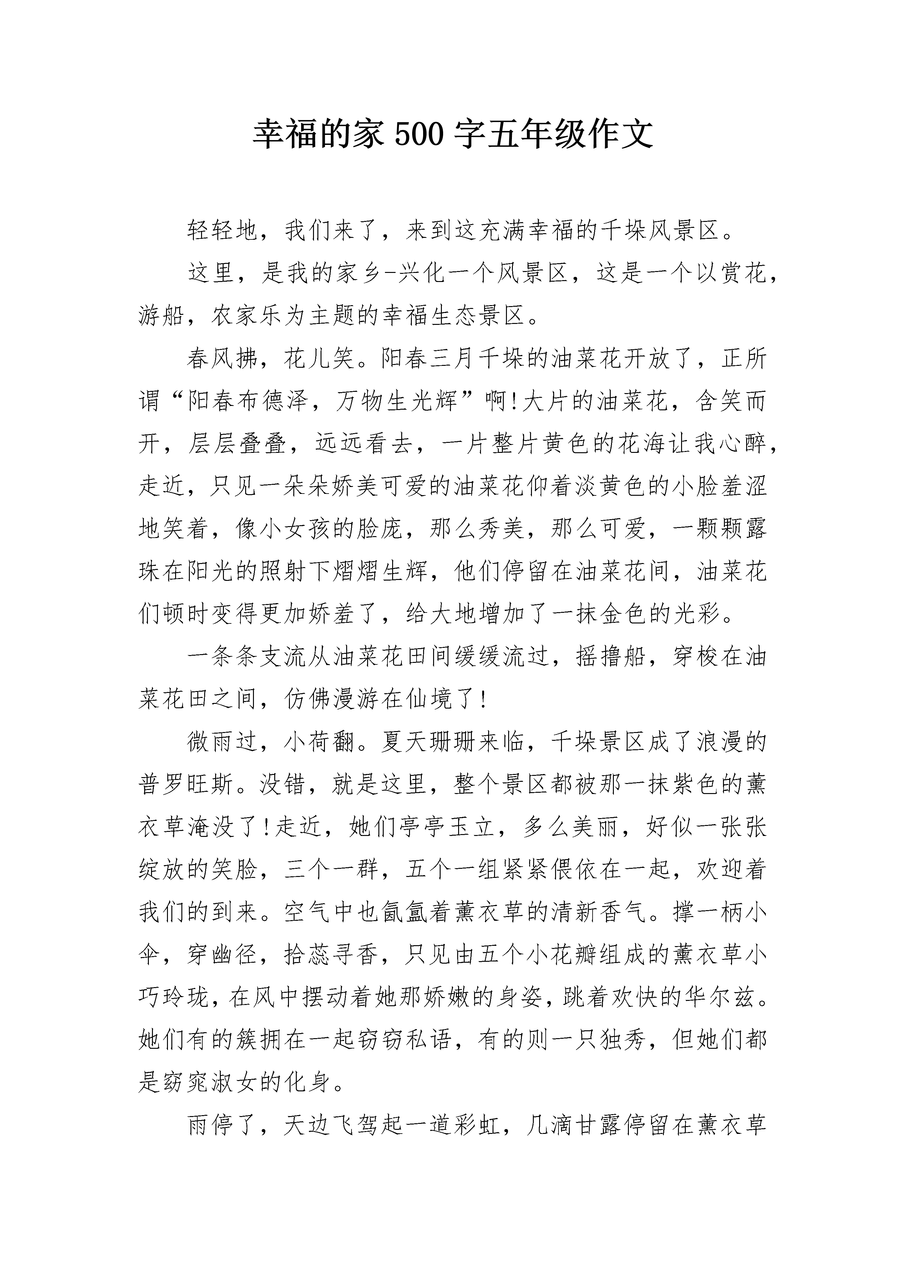 幸福的家500字五年级作文轻轻地,我们来了,来到这充满幸福的千垛风景区。这里,是我的家乡-兴化一个风景区,这是一个以赏花,游船,农家乐为主题的幸福生态景区。春风拂,花儿笑。阳春三月千垛的油菜花开放了,正所谓“阳春布德泽,万物生光辉”啊!大片的油菜花,含笑而开,层层叠叠,远远看去,一片整片黄色的花海让我心醉,走近,只见一朵朵娇美可爱的油菜花仰着淡黄色的小脸羞涩地笑着,像小女孩的脸庞,那么秀美,那么可爱,一颗颗露珠在阳光的照射下熠熠生辉,他们停留在油菜花间,油菜花们顿时变得更加娇羞了,给大地增加了一抹金色的光彩。一条条支流从油菜花田间缓缓流过,摇撸船,穿梭在油菜花田之间,仿佛漫游在仙境了!微雨过,小荷翻。夏天珊珊来临,千垛景区成了浪漫的普罗旺斯。没错,就是这里,整个景区都被那一抹紫色的薰衣草淹没了!走近,她们亭亭玉立,多么美丽,好似一张张绽放的笑脸,三个一群,五个一组紧紧偎依在一起,欢迎着我们的到来。空气中也氤氲着薰衣草的清新香气。撑一柄小伞,穿幽径,拾蕊寻香,只见由五个小花瓣组成的薰衣草小巧玲珑,在风中摆动着她那娇嫩的身姿,跳着欢快的华尔兹。她们有的簇拥在一起窃窃私语,有的则一只独秀,但她们都是窈窕淑女的化身。雨停了,天边飞驾起一道彩虹,几滴甘露停留在薰衣草的花瓣上,阳光的照耀下好似一颗颗淡紫色的水晶,晶莹剔透。田边小径上,一群红领巾正唱着歌儿走过来,真幸福!是孩子们在课外拓展,可以赏花,可以游船,还可以采莲藕,体验农家乐,真好!听说这里原来就是一片荒田,家乡的建设发生翻天覆地的变化,昔日的荒田成了美丽的赏花区,昔日冷冷清清的变成了欢歌笑语,昔日的平凡村庄成就了今日的强美富高。墙边的红色标语“国家富强、民族振兴、人民幸福”映红了孩子们的笑脸,金色的彩霞映衬了家乡的天边,我笑了,心里满满的幸福感,我们将和我的家乡一起走向明天,走向美好!幸福的家500字作文2家是温馨甜蜜的,充满了欢声笑语;家是多姿多彩的,充满了酸甜苦辣;家也是心灵的港湾,充满了爸爸妈妈的关心,有他们为我遮风挡雨。在每天繁忙的清晨,都是老爸先起床。他在家里都是行动速度最快的一员,所以他每次都在嫌我和妈妈做事太慢。他每次洗漱完毕,就开始做早餐。我一般都是第二个起床的,因为我要上学,有时天气冷的话我会在床上一直躲着,所以我冬天经常上学迟到。以前我从来都不知道大人的辛苦,自从开始帮助父母做家务,才明白了父母亲的辛苦,现在我有时间一定会去帮助父母,力所能及地为他们分担,希望他们多休息一会儿。在清闲的中午,我在学校吃饭。老妈因为公司比较远,所以也没有回家吃饭,老爸会经常打包一份快餐,回到家吃。他一吃完饭,就开始打扫家中的卫生,所以家里总是非常干净。在温馨的晚上,一家三口总是会聚在一起吃饭,来谈论一下今天外面所发生的新闻。吃完饭后,总有一个问题困扰着我们三个人,那就是洗碗,一般都是以石头剪刀布来分出谁赢谁不洗碗。这个概率都是平等的,今天又是我妈妈洗碗。她好像十分不情愿。但她洗完碗,就开始看自己喜欢的电视节目。爸爸爱看战争剧,妈妈喜欢看爱情、喜剧片,而我只能和作业做斗争了。夜深了,我去客厅伸伸懒腰,而我的老妈会给我做一份夜宵来,让我填饱肚子补充能量。有时在周末的时候,老爸往往会抢占电脑,那我就只好“抱”着电视,我的老妈就没有东西可看了,所以我们也会发生一场“世界大战”,最终老妈一定会得到电脑或电视,让我在房间里看书。家是我们的避风港,家是我们唯一的依靠,家是温馨、欢快、有趣,家中的每一个人都在互相帮助,充当起家庭中的不同角色,所以家是美好的。家中的每个人都为了自己的未来努力奋斗打拼,父母亲为了我的学业,辛苦工作赚钱养家;让我以后上一所好的大学,毕业后找一份好工作,赚钱回报父母,所以有家的孩子是幸福的,我爱我的家。幸福的家500字作文3“家”这个字,意义非凡,顶上的“宀”相当于房子的屋檐,给在外奔波的儿女们一个休息的港湾。这意味着,无论我们什么时候累了,家都是最温暖、安心的地方。杜甫说:“烽火连三月,家书抵万金。”在古人心中,家与家人都是很重要的。在这个世上,有各种各样的家庭,有普通的三人家庭,也有单亲家庭、离异家庭、多子女家庭、重组家庭……即使是那些遭遇不幸的家庭,也可以过得很幸福;即使是正常的家庭,也可以过得矛盾纷飞。不幸的是,我出生在一个不正常的家庭,但幸运的是,我的家庭依旧很幸福、和睦,我的家人都很爱我。“慈母手中线,游子身上衣,”这大概是全天下母亲的真实写照。在这个家庭中,我和母亲互相依靠。在最困难的时候,母亲除了我一无所有;我除了她别无依靠。母亲一个人支撑起这个支离破碎的家,她很伟大,是我最敬佩的人。我们家庭本不富裕,但母亲还是义无反顾地让我上了私立学校。不知道是不是被老一辈人的思想所感染,她认为,只有学习才有出路,每到开学季,要报补习班的时候,她总是轻描淡写地对我