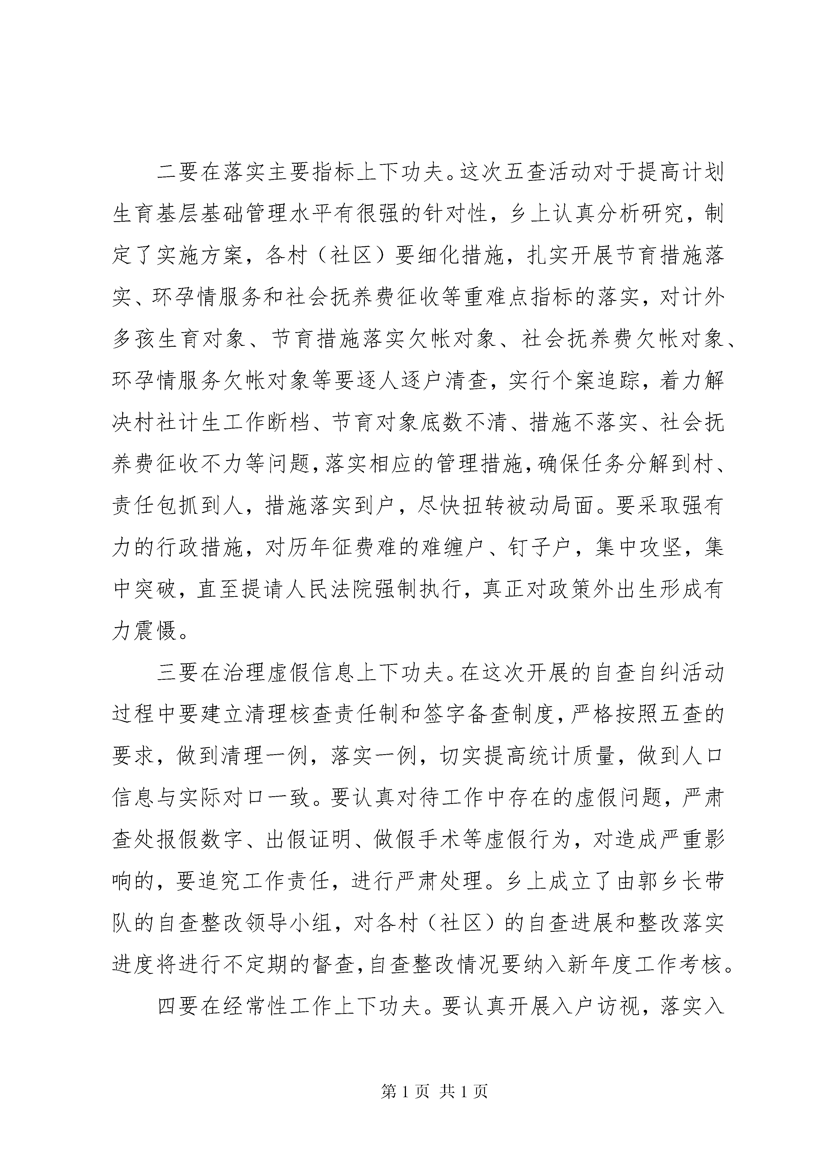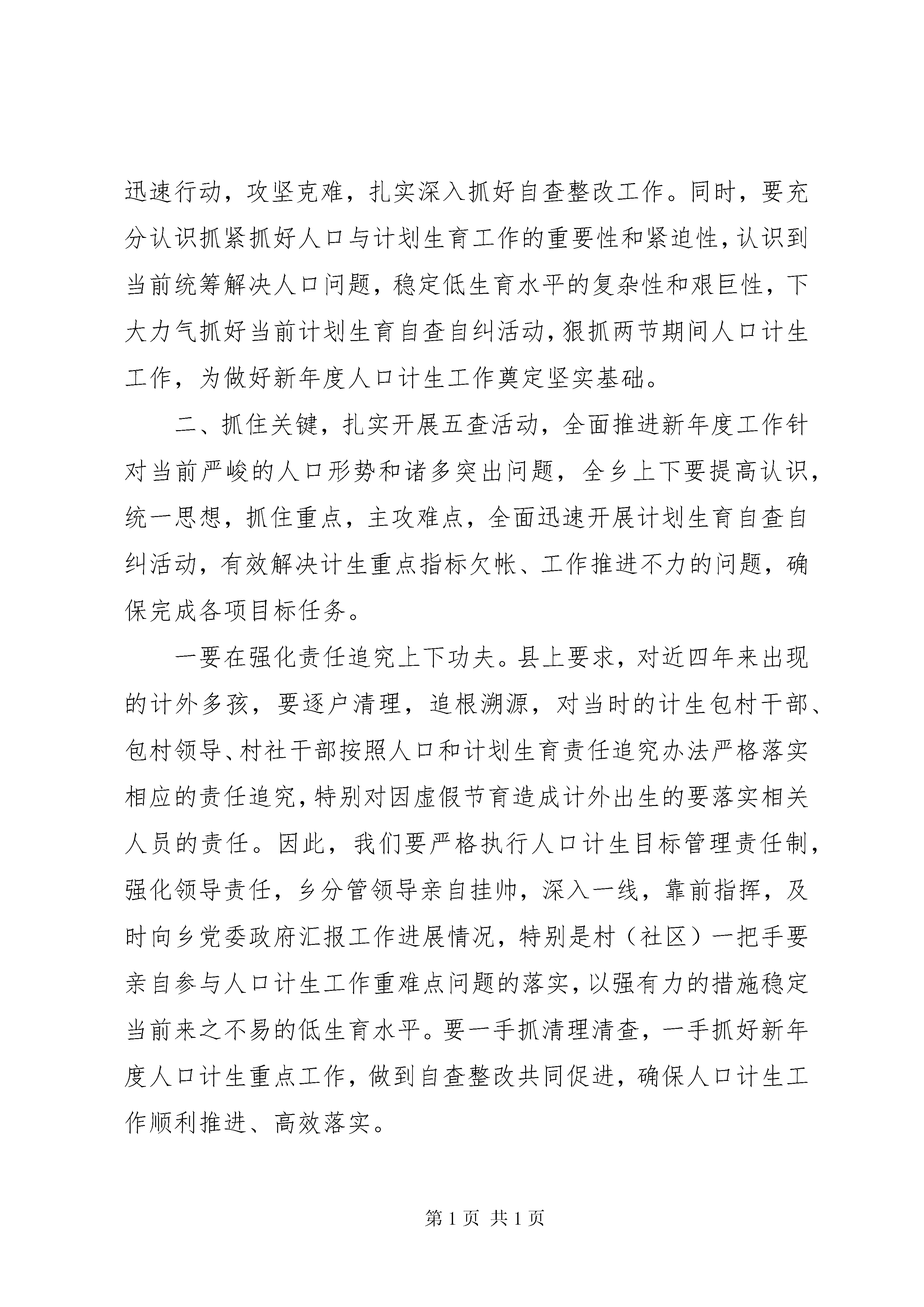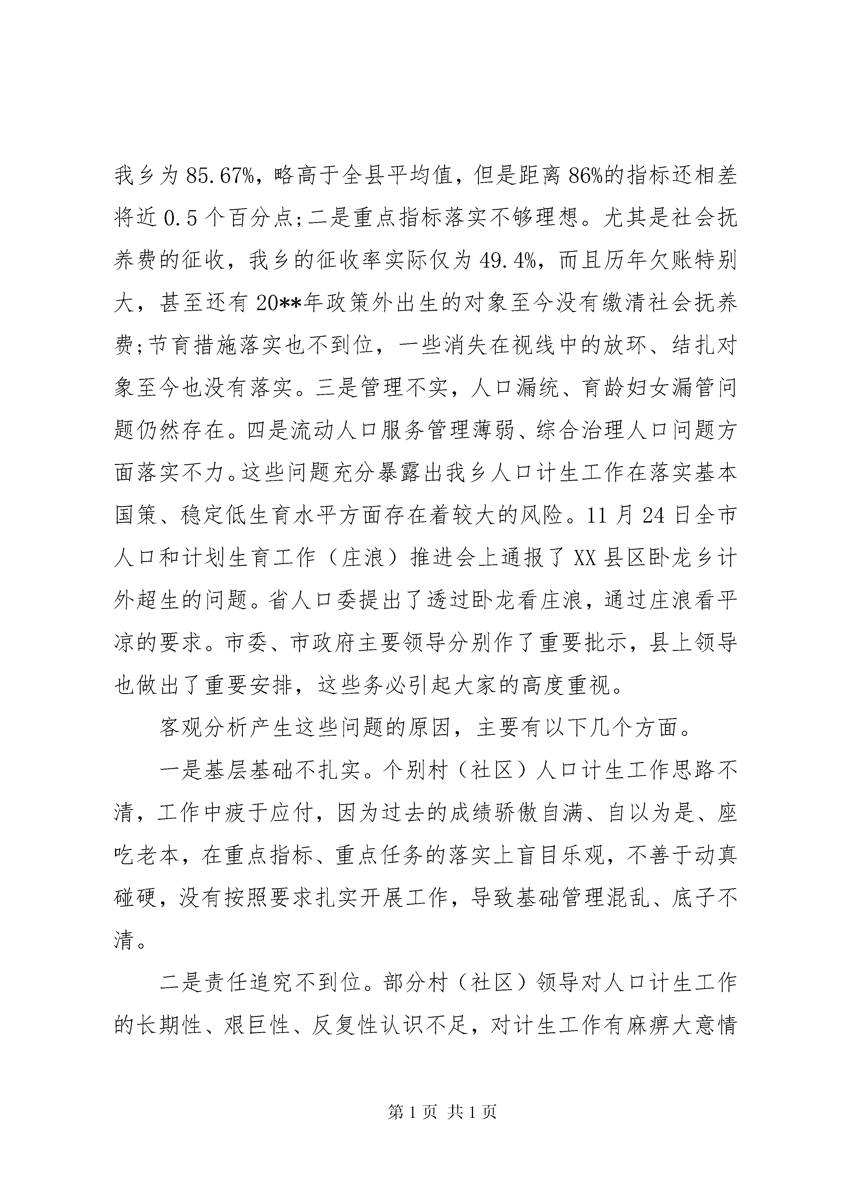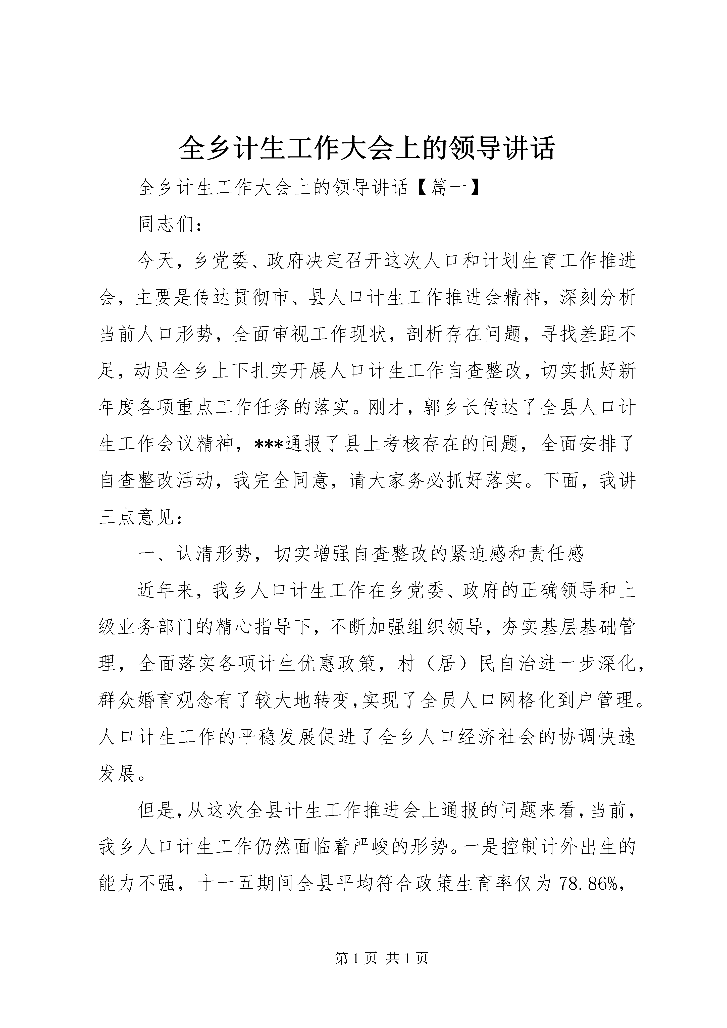 全乡计生工作大会上的领导讲话全乡计生工作大会上的领导讲话【篇一】同志们:今天,乡党委、政府决定召开这次人口和计划生育工作推进会,主要是传达贯彻市、县人口计生工作推进会精神,深刻分析当前人口形势,全面审视工作现状,剖析存在问题,寻找差距不足,动员全乡上下扎实开展人口计生工作自查整改,切实抓好新年度各项重点工作任务的落实。刚才,郭乡长传达了全县人口计生工作会议精神,***通报了县上考核存在的问题,全面安排了自查整改活动,我完全同意,请大家务必抓好落实。下面,我讲三点意见:一、认清形势,切实增强自查整改的紧迫感和责任感近年来,我乡人口计生工作在乡党委、政府的正确领导和上级业务部门的精心指导下,不断加强组织领导,夯实基层基础管理,全面落实各项计生优惠政策,村(居)民自治进一步深化,群众婚育观念有了较大地转变,实现了全员人口网格化到户管理。人口计生工作的平稳发展促进了全乡人口经济社会的协调快速发展。但是,从这次全县计生工作推进会上通报的问题来看,当前,我乡人口计生工作仍然面临着严峻的形势。一是控制计外出生的能力不强,十一五期间全县平均符合政策生育率仅为78.86%,我乡为85.67%,略高于全县平均值,但是距离86%的指标还相差将近0.5个百分点;二是重点指标落实不够理想。尤其是社会抚养费的征收,我乡的征收率实际仅为49.4%,而且历年欠账特别大,甚至还有20**年政策外出生的对象至今没有缴清社会抚养费;节育措施落实也不到位,一些消失在视线中的放环、结扎对象至今也没有落实。三是管理不实,人口漏统、育龄妇女漏管问题仍然存在。四是流动人口服务管理薄弱、综合治理人口问题方面落实不力。这些问题充分暴露出我乡人口计生工作在落实基本国策、稳定低生育水平方面存在着较大的风险。11月24日全市人口和计划生育工作(庄浪)推进会上通报了XX县区卧龙乡计外超生的问题。省人口委提出了透过卧龙看庄浪,通过庄浪看平凉的要求。市委、市政府主要领导分别作了重要批示,县上领导也做出了重要安排,这些务必引起大家的高度重视。客观分析产生这些问题的原因,主要有以下几个方面。一是基层基础不扎实。个别村(社区)人口计生工作思路不清,工作中疲于应付,因为过去的成绩骄傲自满、自以为是、座吃老本,在重点指标、重点任务的落实上盲目乐观,不善于动真碰硬,没有按照要求扎实开展工作,导致基础管理混乱、底子不清。二是责任追究不到位。部分村(社区)领导对人口计生工作的长期性、艰巨性、反复性认识不足,对计生工作有麻痹大意情绪,认为计生工作仅仅是计生干部的事,不能亲自参与、研究、督查计生工作任务的落实。责任追究措施落实不力,工作人员认识不到问题的严重性,致使工作水平长期徘徊不前,在重点工作任务的落实出现了欠帐。三是工作力度不够大。流动人口管理不到位,服务网络不健全,工作力量薄弱,协调配合程度不够,综合治理的责任意识不强,联席会议制度作用没有得到充分发挥,造成了流动人口政策外生育的隐患。打击两非行为和党员干部职工超生查处至今没有实质性突破。四是干部作风不务实。部分计生工作人员责任心、事业性不强,入户访视、环孕情服务、产术后随访等工作没有全面落实到户到人,不深入实际,用电话安排、调度、落实工作,使工作流于形式,质量不高。乡村计生专干业务知识不精,政策知晓率底,存在着混天度日、蛮天过海的思想,工作中缺乏主动性、创造性和积极性,在重难点工作任务落实上畏首畏尾,不善于深入群众去做宣传教育工作,导致节育措施落实、社会抚养费征收出现欠帐,尤其是在四项手术落实、社会抚养费的征收上,对一些钉子户、难缠户采取息事宁人、得过且过的态度,客观上助长了违法超生的势头,产生了严重的负面影响;甚至刻意隐瞒、包庇纵容,严重削弱了政策执行的公平性和严肃性。我们要深刻反省,认清形势,以强烈的危机意识和责任意识,迅速行动,攻坚克难,扎实深入抓好自查整改工作。同时,要充分认识抓紧抓好人口与计划生育工作的重要性和紧迫性,认识到当前统筹解决人口问题,稳定低生育水平的复杂性和艰巨性,下大力气抓好当前计划生育自查自纠活动,狠抓两节期间人口计生工作,为做好新年度人口计生工作奠定坚实基础。二、抓住关键,扎实开展五查活动,全面推进新年度工作针对当前严峻的人口形势和诸多突出问题,全乡上下要提高认识,统一思想,抓住重点,主攻难点,全面迅速开展计划生育自查自纠活动,有效解决计生重点指标欠帐、工作推进不力的问题,确保完成各项目标任务。一要在强化责任追究上下功夫。县上要求,对近四年来出现的计外多孩,要逐户清理,追根溯源,对当时的计生包村干部、包村领导、村社干部按照人口和计划生育责任追究办法严格落实相应的责任追究,特别对因虚假节育造成计外出生的要落实相关人员的责任。因此,我们要严格执行人口计生目标管理责任制,强化领导责任,乡分管领导亲自挂帅